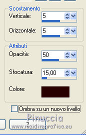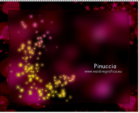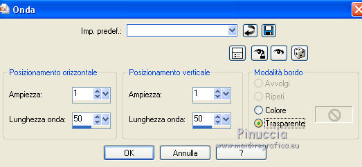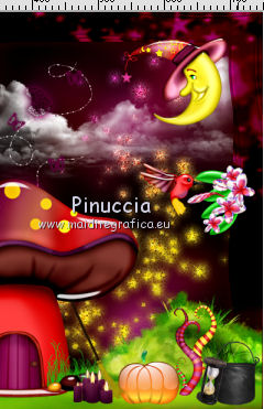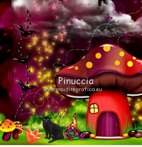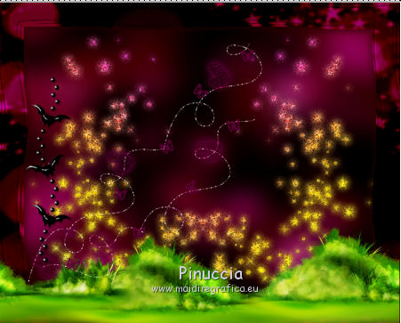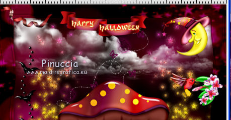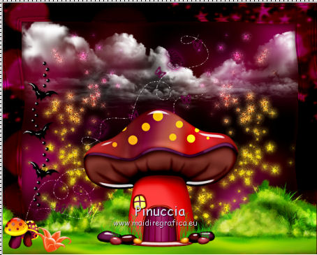 qui puoi trovare qualche risposta ai tuoi dubbi. Se l'argomento che ti interessa non è presente, ti prego di segnalarmelo. Questo tutorial è una creazione di ©Titoune e non può essere copiato su altri siti nè essere offerto per il download. Lo stesso vale per la mia traduzione. Il tutorial è stato creato con PSP X5, ma può essere eseguito anche con le altre versioni di PSP. Secondo la versione utilizzata (anteriore a PSP X) potresti ottenere dei risultati differenti. Vedi la mia scheda riguardante le funzioni Rifletti>Capovolgi nelle più recenti versioni qui Per tradure il tutorial ho usato PSP X. Occorrente: Un tube a scelta. Il resto del materiale qui Tube utilizzato Linmida - Kimberly - Sweet T Design Tubes Stell. Filtri: consulta, se necessario, la mia sezione filtri qui Simple - Left Right Wrap (bonus) qui Penta.com - Dot and Cross qui Graphics Plus - Cross Shadow qui ![]() 1. Apri una nuova immagine trasparente 750 x 600 pixels. Selezione>Seleziona tutto. 2. Apri l'elemento Paper7 e vai a Modifica>Copia. Torna al tuo lavoro e vai a Modifica>Incolla nella selezione. Selezione>Modifica>Contrai - 45 pixels. 3. Regola>Sfocatura>Sfocatura gaussiana - raggio 25. ![]() Selezione>Innalza selezione a livello. Selezione>Inverti. 4. Attiva il livello inferiore. Effetti>Effetti 3D>Smusso a incasso. ![]() Selezione>Innalza selezione a livello. 5. Effetti>Effetti di distorsione>Onda. ![]() Selezione>Deseleziona. Livelli>Disponi>Porta in alto. 6. Effetti>Effetti 3D>Sfalsa ombra, colore #290000. ![]() Ripeti l'Effetto Sfalsa ombra, cambiando verticale e orizzontale con -5. 7. Apri l'elemento Fairy Dust e vai a Modifica>Copia. Torna al tuo lavoro e vai a Modifica>Incolla come nuovo livello. Spostalo a sinistra.![]() Livelli>Disponi>Sposta giù. 8. Effetti>Effetti di riflesso>Specchio rotante. ![]() 9. Attiva il livello superiore. Apri l'elemento Grass2 e vai a Modifica>Copia. Torna al tuo lavoro e vai a Modifica>Incolla come nuovo livello. Per il momento non spostarlo. Livelli>Duplica. Sul livello del duplicato: Effetti>Plugins>Simple - Left Right Wrap. Sposta l'immagine sul bordo inferiore.Attiva il livello originale e sposta anche questa immagine sul bordo.![]() 11. Apri l'elemento Clouds e vai a Modifica>Copia. Torna al tuo lavoro e vai a Modifica>Incolla come nuovo livello. Spostalo in alto.Vedi l'esempio finale. Porta questo livello sotto il livello del bordo. 12. Attiva nuovamente il livello superiore. Apri l'elemento Butterfly Trail 1 e vai a Modifica>Copia. Torna al tuo lavoro e vai a Modifica>Incolla come nuovo livello. Spostalo a sinistra.Vedi l'esempio finale. 13. Apri l'elemento bats e vai a Modifica>Copia. Torna al tuo lavoro e vai a Modifica>Incolla come nuovo livello. Sposta anche questo elemento a sinistra.![]() Effetti>Effetti 3D>Sfalsa ombra, colore #290000. ![]() 14. Apri l'elemento Mushroom Home 2 e vai a Modifica>Copia. Torna al tuo lavoro e vai a Modifica>Incolla come nuovo livello. Spostalo al centro.Vedi l'esempio finale. Effetti>Effetti 3D>Sfalsa ombra, con i settaggi precedenti. 15. Apri l'elemento Mushroom 1 e vai a Modifica>Copia. Torna al tuo lavoro e vai a Modifica>Incolla come nuovo livello. Spostalo in basso a sinistra.Vedi l'esempio finale. Effetti>Effetti 3D>Sfalsa ombra, con i settaggi precedenti. 16. Apri l'elemento Flower 4 e vai a Modifica>Copia. Torna al tuo lavoro e vai a Modifica>Incolla come nuovo livello. Spostalo accanto ai funghi.![]() Effetti>Effetti 3D>Sfalsa ombra, con i settaggi precedenti. 17. Apri l'elemento Cat 2 e vai a Modifica>Copia. Torna al tuo lavoro e vai a Modifica>Incolla come nuovo livello. Spostalo in basso a sinistra.Vedi l'esempio finale. Effetti>Effetti 3D>Sfalsa ombra, con i settaggi precedenti. 18. Apri l'elemento Frog e vai a Modifica>Copia. Torna al tuo lavoro e vai a Modifica>Incolla come nuovo livello. Sposta anche questo elemento in basso a sinistra.![]() Effetti>Effetti 3D>Sfalsa ombra, con i settaggi precedenti. 19. Apri l'elemento Cauldron e vai a Modifica>Copia. Torna al tuo lavoro e vai a Modifica>Incolla come nuovo livello. Spostalo in basso a destra.Vedi l'esempio finale. Effetti>Effetti 3D>Sfalsa ombra, con i settaggi precedenti. 20. Apri l'elemento Hourglass e vai a Modifica>Copia. Torna al tuo lavoro e vai a Modifica>Incolla come nuovo livello. Spostalo in basso a destra.Vedi l'esempio finale. Effetti>Effetti 3D>Sfalsa ombra, con i settaggi precedenti. 21. Apri l'elemento Tree 1 e vai a Modifica>Copia. Torna al tuo lavoro e vai a Modifica>Incolla come nuovo livello. Sposta anche questo elemento in basso a destra.Vedi l'esempio finale. Effetti>Effetti 3D>Sfalsa ombra, con i settaggi precedenti. 22. Apri l'elemento pumpkin e vai a Modifica>Copia. Torna al tuo lavoro e vai a Modifica>Incolla come nuovo livello. Spostalo in basso a destra, accanto all'albero.![]() Effetti>Effetti 3D>Sfalsa ombra, con i settaggi precedenti. 23. Apri l'elemento Candles e vai a Modifica>Copia. Torna al tuo lavoro e vai a Modifica>Incolla come nuovo livello. Spostalo in basso, accanto alla zucca.Vedi l'esempio finale. Effetti>Effetti 3D>Sfalsa ombra, con i settaggi precedenti. 24. Apri l'elemento Broom e vai a Modifica>Copia. Torna al tuo lavoro e vai a Modifica>Incolla come nuovo livello. Spostalo nella parte inferiore.Vedi l'esempio finale. Effetti>Effetti 3D>Sfalsa ombra, con i settaggi precedenti. 25. Apri l'elemento Hummingbird 2 e vai a Modifica>Copia. Torna al tuo lavoro e vai a Modifica>Incolla come nuovo livello. Spostalo a destra.Vedi l'esempio finale. Effetti>Effetti 3D>Sfalsa ombra, con i settaggi precedenti. 26. Apri l'elemento Moon 1 e vai a Modifica>Copia. Torna al tuo lavoro e vai a Modifica>Incolla come nuovo livello. Spostalo in alto a destra.![]() Effetti>Effetti 3D>Sfalsa ombra, con i settaggi precedenti. 27. Apri l'elemento Banner e vai a Modifica>Copia. Torna al tuo lavoro e vai a Modifica>Incolla come nuovo livello. Spostalo in alto al centro.Vedi l'esempio finale. Effetti>Effetti 3D>Sfalsa ombra, con i settagg