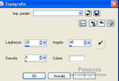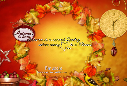 qui puoi trovare qualche risposta ai tuoi dubbi. Se l'argomento che ti interessa non è presente, ti prego di segnalarmelo. Questo tutorial è una creazione di ©Titoune e non può essere copiato su altri siti nè essere offerto per il download. Lo stesso vale per la mia traduzione. Il tutorial è stato creato con PSP X5, ma può essere eseguito anche con le altre versioni di PSP. Secondo la versione utilizzata (anteriore a PSP X) potresti ottenere dei risultati differenti. Vedi la mia scheda riguardante le funzioni Rifletti>Capovolgi in X4 e X5 qui Per tradure il tutorial ho usato PSP X. Occorrente: Un tube a scelta. Il resto del materiale qui Tube utilizzato "sexy le petit chaperon rouge" di Ming Yue Filtri: consulta, se necessario, la mia sezione filtri qui Simple - Left Right Wrap (bonus) qui ![]() 1. Apri una nuova immagine trasparente 750 x 600 pixels. Selezione>Seleziona tutto. 2. Apri l'elemento DBV Fall paper (13) e vai a Modifica>Copia. Torna al tuo lavoro e vai a Modifica>Incolla nella selezione. Selezione>Deseleziona. 3. Apri l'elemento DBV Fall element (24) e vai a Modifica>Copia. Torna al tuo lavoro e vai a Modifica>Incolla come nuovo livello. Lascialo come sta. Rinomina questo livello "cornice". 4. Effetti>Effetti 3D>Sfalsa ombra, colore #3f0506. ![]() Ripeti l'Effetto Sfalsa ombra, cambiando verticale e orizzontale con -3. 5. Apri l'elemento DBV Fall element (22) e vai a Modifica>Copia. Torna al tuo lavoro e vai a Modifica>Incolla come nuovo livello. Spostalo in basso.Vedi l'esempio finale. Effetti>Effetti 3D>Sfalsa ombra, colore #3f0506. ![]() Porta questo livello sotto il livello della cornice. ![]() 6. Attiva nuovamente il livello superiore. Apri l'elemento DBV Fall element (46) e vai a Modifica>Copia. Torna al tuo lavoro e vai a Modifica>Incolla come nuovo livello. Effetti>Plugins>Simple - Left Right Wrap. Spostalo in basso.Vedi l'esempio finale. Effetti>Effetti 3D>Sfalsa ombra, con i settaggi precedenti. 7. Apri l'elemento DBV Fall element (60) e vai a Modifica>Copia. Torna al tuo lavoro e vai a Modifica>Incolla come nuovo livello. Spostalo in basso.Effetti>Effetti 3D>Sfalsa ombra, con i settaggi precedenti. Porta il livello sotto il livello della cornice. ![]() 8. Attiva nuovamente il livello superiore. Apri l'elemento DBV Fall element (2) e vai a Modifica>Copia. Torna al tuo lavoro e vai a Modifica>Incolla come nuovo livello. Spostalo nell'angolo in basso a sinistra.Vedi l'esempio finale. Effetti>Effetti 3D>Sfalsa ombra, con i settaggi precedenti. 9. Apri l'elemento DBV Fall element (49) e vai a Modifica>Copia. Torna al tuo lavoro e vai a Modifica>Incolla come nuovo livello. Spostalo a sinistra della cornice.Vedi l'esempio finale. Effetti>Effetti 3D>Sfalsa ombra, con i settaggi precedenti. 10. Apri l'elemento DBV Fall element (5) e vai a Modifica>Copia. Torna al tuo lavoro e vai a Modifica>Incolla come nuovo livello. Spostalo a sinistra, sul bordo della cornice.Vedi l'esempio finale. Effetti>Effetti 3D>Sfalsa ombra, con i settaggi precedenti. 11. Apri l'elemento DBV Fall element (57) e vai a Modifica>Copia. Torna al tuo lavoro e vai a Modifica>Incolla come nuovo livello. Spostalo nell'angolo in alto a sinistra.![]() Effetti>Effetti 3D>Sfalsa ombra, con i settaggi precedenti. 12. Apri l'elemento DBV Fall element (44) e vai a Modifica>Copia. Torna al tuo lavoro e vai a Modifica>Incolla come nuovo livello. Spostalo in alto a destra.Vedi l'esempio finale. Effetti>Effetti 3D>Sfalsa ombra, con i settaggi precedenti. 13. Apri l'elemento DBV Fall element e vai a Modifica>Copia. Torna al tuo lavoro e vai a Modifica>Incolla come nuovo livello. Spostalo in alto a destra.Vedi l'esempio finale. Effetti>Effetti 3D>Sfalsa ombra, con i settaggi precedenti. 14. Apri l'elemento DBV Fall element (43) e vai a Modifica>Copia. Torna al tuo lavoro e vai a Modifica>Incolla come nuovo livello. Spostalo sotto l'orologio.Effetti>Effetti 3D>Sfalsa ombra, con i settaggi precedenti. Porta questo livello sotto il livello del pendolo. ![]() Attiva nuovamente il livello superiore. 15. Apri l'elemento DBV Fall element (38) e vai a Modifica>Copia. Torna al tuo lavoro e vai a Modifica>Incolla come nuovo livello. Spostalo in basso a destra.Vedi l'esempio finale. Effetti>Effetti 3D>Sfalsa ombra, con i settaggi precedenti. 16. Apri l'elemento DBV Fall element (13) e vai a Modifica>Copia. Torna al tuo lavoro e vai a Modifica>Incolla come nuovo livello. Spostalo in basso.Vedi l'esempio finale. Effetti>Effetti 3D>Sfalsa ombra, con i settaggi precedenti. 17. Apri l'elemento DBV Fall element (58) e vai a Modifica>Copia. Torna al tuo lavoro e vai a Modifica>Incolla come nuovo livello. Spostalo in basso.![]() Effetti>Effetti 3D>Sfalsa ombra, con i settaggi precedenti. 18. Apri l'elemento DBV Fall element (59) e vai a Modifica>Copia. Torna al tuo lavoro e vai a Modifica>Incolla come nuovo livello. Spostalo in basso.Vedi l'esempio finale. Effetti>Effetti 3D>Sfalsa ombra, con i settaggi precedenti. 19 Apri l'elemento DBV Fall element (54) e vai a Modifica>Copia. Torna al tuo lavoro e vai a Modifica>Incolla come nuovo livello. Per il momento lascialo come sta ![]() Selezione>Seleziona tutto. Selezione>Mobile. Selezione>Modifica>Contrai - 1 pixel. Attiva il livello inferiore - Raster 1. Selezione>Innalza selezione a livello. Livelli>Disponi>Porta in alto e avrai questo. ![]() Livelli>Unisci>Unisci giù. Effetti>Effetti 3D>Sfalsa ombra, con i settaggi precedenti. Selezione>Deseleziona. Sposta l'elemento in alto al centro.Vedi l'esempio finale. 20. Apri il tuo tube e vai a Modifica>Copia. Torna al tuo lavoro e vai a Modifica>Incolla come nuovo livello. Immagine>Ridimensiona, se e quanto necessario, tutti i livelli non selezionato. Spostalo dove preferisci,o vedi il mio esempio. Effetti>Effetti 3D>Sfalsa ombra, con i settaggi precedenti. 21. Attiva il livello Raster 1. Modifica>Copia. Selezione>Seleziona tutto. Immagine>Ritaglia la selezione. 22. Immagine>Dimensioni tela - 800 x 650 pixels. ![]() Rimani sul livello Ra