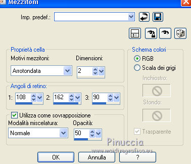qui puoi trovare qualche risposta ai tuoi dubbi. Se l'argomento che ti interessa non è presente, ti prego di segnalarmelo. Questo tutorial è una creazione di ©Titoune e non può essere copiato su altri siti nè essere offerto per il download. Lo stesso vale per la mia traduzione. Il tutorial è stato creato con PSP X5, ma può essere eseguito anche con le altre versioni di PSP. Secondo la versione utilizzata (anteriore a PSP X) potresti ottenere dei risultati differenti. Vedi la mia scheda riguardante le funzioni Rifletti>Capovolgi in X4 e X5 qui Per tradure il tutorial ho usato PSP X. Occorrente: Un tube a scelta. Il resto del materiale qui Tube utilizzato "SeattleRainPinup~chronoperates~Sassydeb" di Sassydeb. ![]() 1. Apri una nuova immagine trasparente 750 x 600 pixels. Selezione>Seleziona tutto. Apri l'immagine am-Danny_Flynn_Camberwell_Beauty-s, e vai a Modifica>Copia. non chiuderlo perchè ti servirà ancora Torna al tuo lavoro e vai a Modifica>Incolla nella selezione. Selezione>Deseleziona. 2. Selezione>Carica/Salva selezione>Carica selezione da disco. Cerca e carica la selezione "selection_scrap_autumn_rain". ![]() 3. Livelli>Nuovo livello raster. Apri l'immagine fall-rain e vai a Modifica>Copia. Torna al tuo lavoro e vai a Modifica>Incolla nella selezione. Selezione>Deseleziona. 4. Apri l'elemento Paper3 e vai a Modifica>Copia. Torna al tuo lavoro e vai a Modifica>Incolla come nuovo livello. Non spostarlo. 5. Selezione>Seleziona tutto. Selezione>Mobile. Selezione>Immobilizza. Selezione>Modifica>Contrai - 25 pixels. Selezione>Modifica>Sfuma - 25 pixels. 6. Livelli>Nuovo livello raster. Attiva nuovamente l'immagine am-Danny_Flynn_Camberwell_Beauty-s e vai a Modifica>Copia. Torna al tuo lavoro e vai a Modifica>Incolla nella selezione. Selezione>Deseleziona. 7. Apri l'elementi feuilles e vai a Modifica>Copia. Torna al tuo lavoro e vai a Modifica>Incolla come nuovo livello. Immagine>Ridimensiona, al 70%, tutti i livelli non selezionato. Regola>Messa a fuoco>Metti a fuoco. Regola>Tonalità e saturazione>Viraggio. ![]() Sposta l'elemento in alto a sinistra.8. Effetti>Effetti 3D>Sfalsa ombra, colore #1c2434. ![]() 9. Apri l'elemento rain_store e vai a Modifica>Copia. Torna al tuo lavoro e vai a Modifica>Incolla come nuovo livello. Sposta l'elemento in alto.Vedi l'esempio finale. Effetti>Effetti 3D>Sfalsa ombra, con i settaggi precedenti. 10. Apri l'elemento Peter Cross-17_BW nm2tinytube e vai a Modifica>Copia. Torna al tuo lavoro e vai a Modifica>Incolla come nuovo livello. Spostalo in basso a sinistra.![]() Effetti>Effetti 3D>Sfalsa ombra, con i settaggi precedenti. 11. Apri l'elemento Riem e vai a Modifica>Copia. Torna al tuo lavoro e vai a Modifica>Incolla come nuovo livello. Spostalo in basso.Vedi l'esempio finale. Regola>Tonalità e saturazione>Viraggio, con i settaggi precedenti. Effetti>Effetti 3D>Sfalsa ombra, con i settaggi precedenti. 12. Apri l'elemento Label2 e vai a Modifica>Copia. Torna al tuo lavoro e vai a Modifica>Incolla come nuovo livello. Spostalo in basso a destra.![]() Regola>Tonalità e saturazione>Viraggio, con i settaggi precedenti. Effetti>Effetti 3D>Sfalsa ombra, con i settaggi precedenti. 13. Apri l'elemento Rain e vai a Modifica>Copia. Torna al tuo lavoro e vai a Modifica>Incolla come nuovo livello. Sposta il testo sull'etichetta.Vedi l'esempio finale. Regola>Tonalità e saturazione>Viraggio, con i settaggi precedenti. Effetti>Effetti 3D>Sfalsa ombra, con i settaggi precedenti. 14. Apri l'elemento Pin e vai a Modifica>Copia. Torna al tuo lavoro e vai a Modifica>Incolla come nuovo livello. Spostalo sull'etichetta.![]() Regola>Tonalità e saturazione>Viraggio, con i settaggi precedenti. Effetti>Effetti 3D>Sfalsa ombra, con i settaggi precedenti. 15. Apri il tuo tube e vai a Modifica>Copia. Torna al tuo lavoro e vai a Modifica>Incolla come nuovo livello. Immagine>Ridimensiona, se e quanto necessario, tutti i livelli non selezionato. Spostalo dove preferisci,o vedi il mio esempio. Effetti>Effetti 3D>Sfalsa ombra, con i settaggi precedenti. 16. Attiva il livello inferiore. Selezione>Seleziona tutto. Selezione>Modifica>Contrai - 3 pixels. Selezione>Inverti. Selezione>Innalza selezione a livello. Livelli>Disponi>Porta in alto. 17. Effetti>Effetti artistici>Mezzitoni. ![]() 18. Effetti>Effetti 3D>Smusso a incasso. ![]() Selezione>Deseleziona. Effetti>Effetti 3D>Sfalsa ombra, con i settaggi precedenti. Firma il tuo lavoro. Livelli>Unisci>Unisci tutto e salva in formato jpg. ![]() Se hai problemi o dubbi, o trovi un link non funzionante, scrivimi. 24 Novembre 2013 |