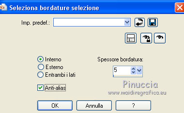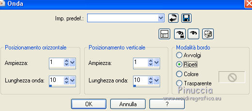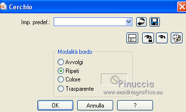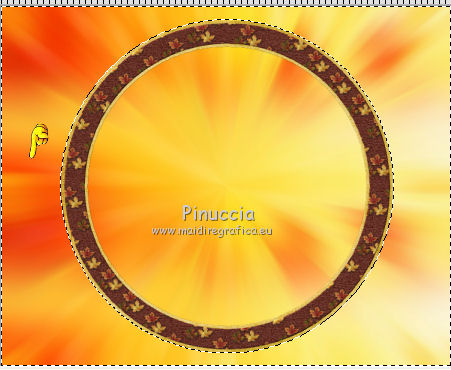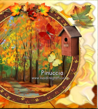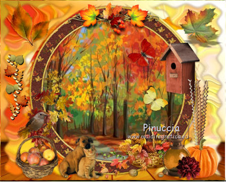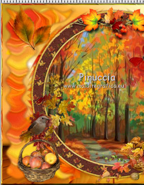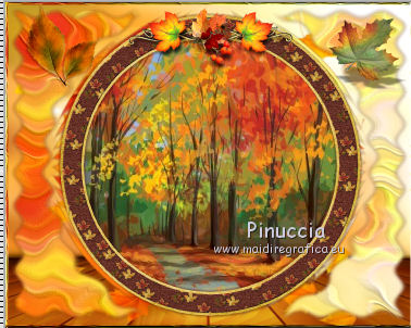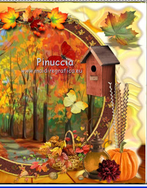 qui puoi trovare qualche risposta ai tuoi dubbi. Se l'argomento che ti interessa non è presente, ti prego di segnalarmelo. Questo tutorial è una creazione di ©Titoune e non può essere copiato su altri siti nè essere offerto per il download. Lo stesso vale per la mia traduzione. Il tutorial è stato creato con Corel17, ma può essere eseguito anche con le altre versioni di PSP. Secondo la versione utilizzata (anteriore a PSP X) potresti ottenere dei risultati differenti. Dalla versione X4, il comando Immagine>Rifletti è stato sostituito con Immagine>Capovolgi in orizzontale, e il comando Immagine>Capovolgi con Immagine>Capovolgi in verticale. Nelle versioni X5 e X6, le funzioni sono state migliorate rendendo disponibile il menu Oggetti. Con il nuovo X7 sono tornati i comandi Rifletti/Capovolgi, ma con nuove differenze. Vedi la scheda sull'argomento qui Per tradurre il tutorial ho usato PSP X. Occorrente: Un tube a scelta. Il resto del materiale qui ![]() Metti la selezione nella cartella Selezioni. 1. Apri una nuova immagine trasparente 750 x 600 pixels. 2. Selezione>Carica/Salva selezione>Carica selezione da disco. Cerca e carica la selezione "selection_scrap_autumn_season". ![]() 3. Apri l'elemento a-paper1, e vai a Modifica>Copia. Torna al tuo lavoro e vai a Modifica>Incolla nella selezione. 4. Selezione>Modifica>Seleziona bordature selezione. ![]() 5. Livelli>Nuovo livello raster. Apri l'elemento a-paper2, e vai a Modifica>Copia. Torna al tuo lavoro e vai a Modifica>Incolla nella selezione Selezione>Deseleziona. 6. Attiva il livello inferiore. Effetti>Effetti 3D>Smusso a incasso. ![]() 7. Attiva il livello superiore. Livelli>Unisci>Unisci giù. 8. Immagine>Ridimensiona, al 95%, tutti i livelli non selezionato. Regola>Messa a fuoco>Metti a fuoco. 9. Livelli>Nuovo livello raster. Livelli>Disponi>Sposta giù. Selezione>Seleziona tutto. 10. Apri l'elemento beautiful_autumn_leaves_background_vector_536511, e vai a Modifica>Copia. Torna al tuo lavoro e vai a Modifica>Incolla nella selezione Selezione>Deseleziona. 11. Effetti>Effetti di immagine>Motivo unico. ![]() 12. Regola>Sfocatura>Sfocatura radiale. ![]() 13. Attiva il livello della cornice. Attiva lo strumento Bacchetta magica ![]() e clicca nella parte esterna alla cornice per selezionarla. ![]() Selezione>Modifica>Contrai - 25 pixels. 14. Attiva il livello inferiore. Selezione>Innalza selezione a livello. Selezione>Deseleziona. 15. Effetti>Effetti di trama>Plastica morbida. ![]() 16. Effetti>Effetti 3D>Sfalsa ombra, colore #410500. ![]() Ripeti l'Effetto Sfalsa ombra, cambiando verticale e orizzontale con -3. 17. Effetti>Effetti di distorsione>Onda. ![]() 18. Livelli>Duplica. Attiva il livello sottostante dell'originale. 19. Effetti>Effetti geometrici>Cerchio. ![]() 20. Attiva il livello inferiore. Livelli>Nuovo livello raster. 21. Apri l'elemento beautiful_autumn_leaves_background_vector_536512, e vai a Modifica>Copia. Torna al tuo lavoro e vai a Modifica>Incolla nella selezione. 22. Selezione>Modifica> Contrai - 5 pixels. Selezione>Inverti. Premi sulla tastiera il tasto CANC. 23. Attiva il livello sottostante. Effetti>Effetti 3D>Smusso a incasso, con i settaggi precedenti. Effetti>Effetti di trama>Plastica morbida, con i settaggi precedenti. Effetti>Effetti 3D>Sfalsa ombra, con i settaggi precedenti. Selezione>Deseleziona. 25. Attiva il livello della cornice. Clicca al centro della cornice con la bacchetta magica ![]() Selezione>Modifica>Espandi - 5 pixels. Livelli>Nuovo livello raster. Livelli>Disponi>Sposta giù. Attiva l'elemento 13790910-vector-of-autumn-landscape-pathway-in-park, e vai a Modifica>Copia. Torna al tuo lavoro e vai a Modifica>Incolla nella selezione. Selezione>Deseleziona. 26. Attiva nuovamente il livello della cornice. Effetti>Effetti 3D>Sfalsa ombra, con i settaggi precedenti. 27. Apri l'elemento 0_7019f_f7ce16c5_L, e vai a Modifica>Copia. Torna al tuo lavoro e vai a Modifica>Incolla come nuovo livello. Spostalo in alto a sinistra.Vedi l'esempio finale. Effetti>Effetti 3D>Sfalsa ombra, colore #410500. ![]() 28. Apri l'elemento 0_701c8_55cefd2e_L, e vai a Modifica>Copia. Torna al tuo lavoro e vai a Modifica>Incolla come nuovo livello. Spostalo in alto a destra.Vedi l'esempio finale. Niente Sfalsa ombra. 29. Apri l'elemento 9c643fcb, e vai a Modifica>Copia. Torna al tuo lavoro e vai a Modifica>Incolla come nuovo livello. Spostalo nella parte superiore della cornice.Vedi l'esempio finale. Niente Sfalsa ombra. ![]() 30. Apri l'elemento birdhouse 2, e vai a Modifica>Copia. Torna al tuo lavoro e vai a Modifica>Incolla come nuovo livello. Spostalo nella parte destra della corncie.Vedi l'esempio finale. Effetti>Effetti 3D>Sfalsa ombra, con i settaggi precedenti. 31. Copia e incolla sul tuo lavoro gli elementi butterfly1 et butterfly2. Posizionali nel paesaggio.![]() Effetti>Effetti 3D>Sfalsa ombra, con i settaggi precedenti. 32. Apri l'elemento curly grass, e vai a Modifica>Copia. Torna al tuo lavoro e vai a Modifica>Incolla come nuovo livello. Spostalo in basso a destra.Vedi l'esempio finale. Effetti>Effetti 3D>Sfalsa ombra, con i settaggi precedenti. 33. Apri l'elemento pumpkin2, e vai a Modifica>Copia. Torna al tuo lavoro e vai a Modifica>Incolla come nuovo livello. Spostalo in basso a destra.Vedi l'esempio finale. Effetti>Effetti 3D>Sfalsa ombra, con i settaggi precedenti. 34. Apri l'elemento 0_bb876_3d36ad90_L (paniere), e vai a Modifica>Copia. Torna al tuo lavoro e vai a Modifica>Incolla come nuovo livello. Spostalo in basso a destra.Vedi l'esempio finale. Effetti>Effetti 3D>Sfalsa ombra, con i settaggi precedenti. 35. Apri l'elemento lantern, e vai a Modifica>Copia. Torna al tuo lavoro e vai a Modifica>Incolla come nuovo livello. Spostalo in basso a destra.Vedi l'esempio finale. Effetti>Effetti 3D>Sfalsa ombra, con i settaggi precedenti. 36. Apri l'elemento flower1, e vai a Modifica>Copia. Torna al tuo lavoro e vai a Modifica>Incolla come nuovo livello. Spostalo in basso a destra.![]() Effetti>Effetti 3D>S