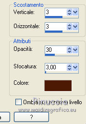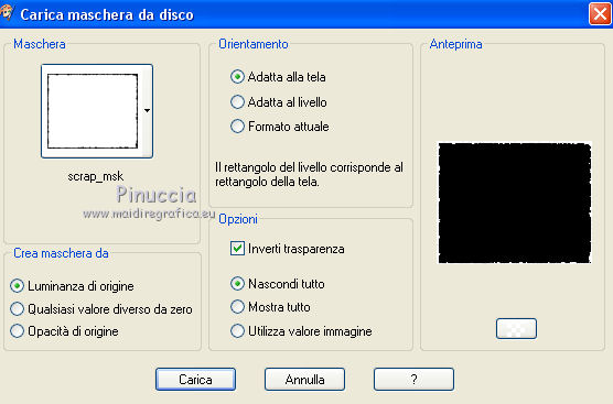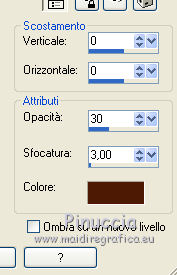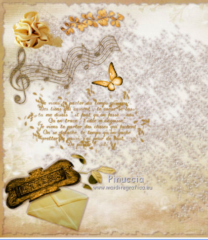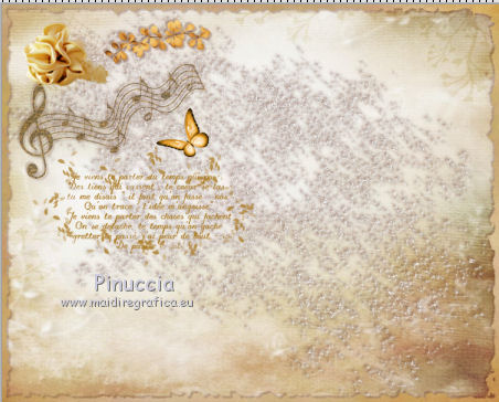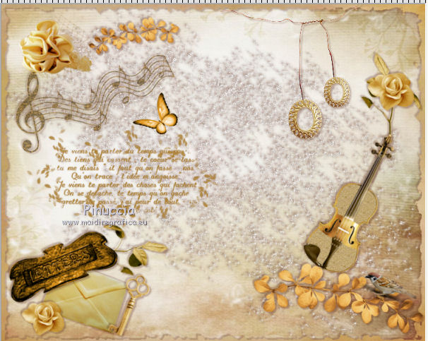 qui puoi trovare qualche risposta ai tuoi dubbi. Se l'argomento che ti interessa non è presente, ti prego di segnalarmelo. Questo tutorial è una creazione di ©Titoune e non può essere copiato su altri siti nè essere offerto per il download. Lo stesso vale per la mia traduzione. Il tutorial è stato creato con PSP X5, ma può essere eseguito anche con le altre versioni di PSP. Secondo la versione utilizzata (anteriore a PSP X) potresti ottenere dei risultati differenti. Vedi la mia scheda riguardante le funzioni Rifletti>Capovolgi in X4 e X5 qui Per tradure il tutorial ho usato PSP X. Occorrente: Un tube a scelta. Il resto del materiale qui Il tube utilizzato è di Fafa ![]() Metti la maschera nella cartella Maschere. 1. Apri una nuova immagine trasparente 750 x 600 pixels. Selezione>Seleziona tutto. 2. Apri la carta paprika_lettertoasymphony(1) e vai a Modifica>Copia. Torna al tuo lavoro e vai a Modifica>Incolla nella selezione. Selezione>Deseleziona. 3. Livelli>Nuovo livello raster. Apri la carta paprika_lettertoasymphony(6) e vai a Modifica>Copia. Torna al tuo lavoro e vai a Modifica>Incolla nella selezione. Selezione>Deseleziona. 4. Livelli>Carica/Salva maschera>Carica maschera da disco. Cerca e carica la maschera "scrap_msk". ![]() Livelli>Unisci>Unisci gruppo. 5. Effetti>Effetti 3D>Sfalsa ombra, colore #4f1906. ![]() Ripeti l'Effetto Sfalsa ombra, cambiando verticale e orizzontale con -3. 6. Apri l'elemento paprika_lettertoasymphony (31) e vai a Modifica>Copia. Torna al tuo lavoro e vai a Modifica>Incolla come nuovo livello. Effetti>Effetti 3D>Sfalsa ombra, con i settaggi precedenti. Livelli>Disponi>Sposta giù. 7. Attiva il livello superiore. Apri l'elemento paprika_lettertoasymphony (1) e vai a Modifica>Copia. Torna al tuo lavoro e vai a Modifica>Incolla come nuovo livello. Spostalo in alto a sinistra.![]() Effetti>Effetti 3D>Sfalsa ombra, con i settaggi precedenti. 8. Apri l'elemento paprika_lettertoasymphony (14_2) Questo elemento è stato creato dall'elemento 14 non si trova nello scrap originale. Modifica>Copia. Torna al tuo lavoro e vai a Modifica>Incolla come nuovo livello. Spostalo in alto a sinistra.Vedi l'esempio finale. Effetti>Effetti 3D>Sfalsa ombra, con i settaggi precedenti. 9. Apri l'elemento paprika_lettertoasymphony (26) e vai a Modifica>Copia. Torna al tuo lavoro e vai a Modifica>Incolla come nuovo livello. Sposta anche questo elemento in alto a sinistra.![]() Effetti>Effetti 3D>Sfalsa ombra, con i settaggi precedenti. Abbassa l'opacità di questo livello al 70%. 10. Apri l'elemento butterfly e vai a Modifica>Copia. Torna al tuo lavoro e vai a Modifica>Incolla come nuovo livello. Spostalo in alto a sinistra.Vedi l'esempio finale. Effetti>Effetti 3D>Sfalsa ombra, con i settaggi precedenti. 11. Apri l'elemento paprika_lettertoasymphony (29) e vai a Modifica>Copia. Torna al tuo lavoro e vai a Modifica>Incolla come nuovo livello. Spostalo a sinistra, sotto gli elementi precedenti.![]() Effetti>Effetti 3D>Sfalsa ombra, colore #4f1906. ![]() 12. Apri l'elemento paprika_lettertoasymphony(6) e vai a Modifica>Copia. Torna al tuo lavoro e vai a Modifica>Incolla come nuovo livello. Spostalo in basso a sinistra.Vedi l'esempio finale. Effetti>Effetti 3D>Sfalsa ombra, colore #4f1906. ![]() Ripeti l'Effetto Sfalsa ombra, cambiando verticale e orizzontale con -3. 13. Apri l'elemento paprika_lettertoasymphony (19) e vai a Modifica>Copia. Torna al tuo lavoro e vai a Modifica>Incolla come nuovo livello. Spostalo sopra l'elemento precedente.![]() 14. Apri l'elemento paprika_lettertoasymphony (10) e vai a Modifica>Copia. Torna al tuo lavoro e vai a Modifica>Incolla come nuovo livello. Sposta anche questo elemento in basso a sinistra.![]() Effetti>Effetti 3D>Sfalsa ombra, con i settaggi precedenti. 15. Apri l'elemento paprika_lettertoasymphony (3) e vai a Modifica>Copia. Torna al tuo lavoro e vai a Modifica>Incolla come nuovo livello. Spostalo in basso a sinistra.Vedi l'esempio finale. Effetti>Effetti 3D>Sfalsa ombra, con i settaggi precedenti. 16. Apri l'elemento paprika_lettertoasymphony (2) e vai a Modifica>Copia. Torna al tuo lavoro e vai a Modifica>Incolla come nuovo livello. Sposta anche questo elemento in basso a sinistra.![]() Effetti>Effetti 3D>Sfalsa ombra, con i settaggi precedenti. 17. Apri l'elemento paprika_lettertoasymphony (14) e vai a Modifica>Copia. Torna al tuo lavoro e vai a Modifica>Incolla come nuovo livello. Spostalo in basso a destra.Vedi l'esempio finale. Effetti>Effetti 3D>Sfalsa ombra, con i settaggi precedenti. 18. Apri l'elemento bird e vai a Modifica>Copia. Torna al tuo lavoro e vai a Modifica>Incolla come nuovo livello. Sposta anche questo elemento in basso a destra.![]() Niente Sfalsa ombra. 19. Apri l'elemento paprika_lettertoasymphony (15) e vai a Modifica>Copia. Torna al tuo lavoro e vai a Modifica>Incolla come nuovo livello. Spostalo a destra.Vedi l'esempio finale. Effetti>Effetti 3D>Sfalsa ombra, con i settaggi precedenti. 19. Apri l'elemento paprika_lettertoasymphony (4) e vai a Modifica>Copia. Torna al tuo lavoro e vai a Modifica>Incolla come nuovo livello. Spostalo a destra.Vedi l'esempio finale. Effetti>Effetti 3D>Sfalsa ombra, con i settaggi precedenti. Porta questo livello quello del violino. ![]() 20. Attiva nuovamente il livello superiore. Apri l'elemento paprika_lettertoasymphony (32) e vai a Modifica>Copia. Torna al tuo lavoro e vai a Modifica>Incolla come nuovo livello. Spostalo in alto, vedi il mio esempio.Effetti>Effetti 3D>Sfalsa ombra, con i settaggi precedenti. ![]() 21. Apri l'elemento titoune_bordure_autumn_symphony e vai a Modifica>Copia. Torna al tuo lavoro e vai a Modifica>Incolla come nuovo livello. 22. Apri il tuo tube e vai a Modifica>Copia. Torna al tuo lavoro e vai a Modifica>Incolla come nuovo livello. Immagine>Ridimensiona, se e quanto necessario, tutti i livelli non selezionato. Spostalo dove preferisci,o vedi il mio esempio. Effetti>Effetti 3D>Sfalsa ombra, con i settaggi precedenti. Firma il tuo lavoro. Livelli>U