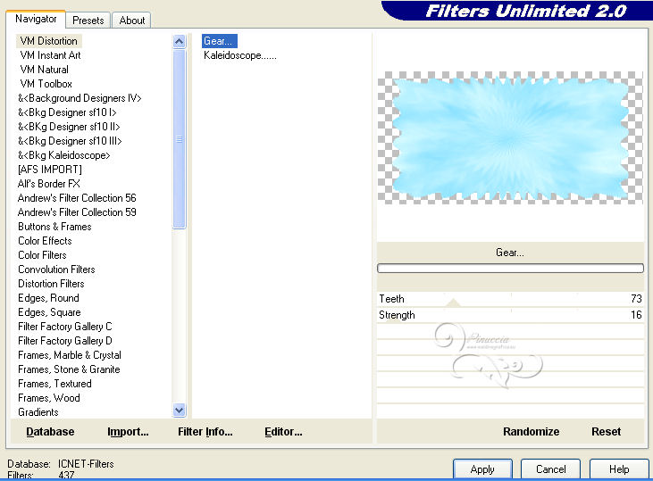 4. Effetti>Plugins>Filters Unlimited 2.0 - VM Distortion - Gear, con i settaggi standard.