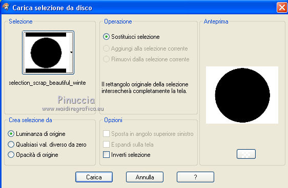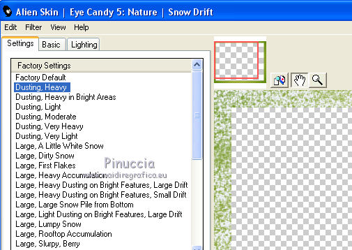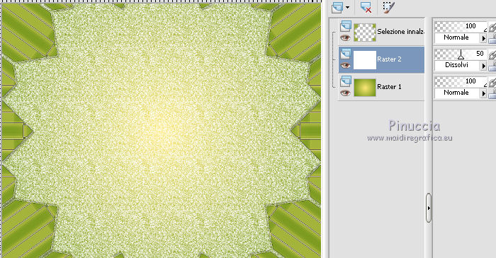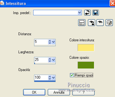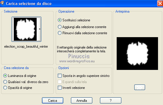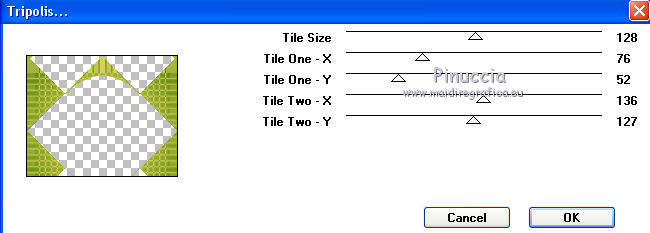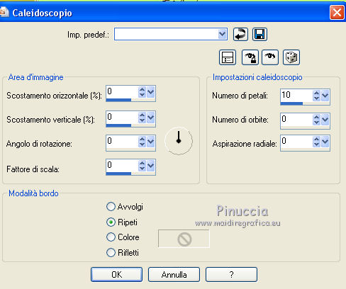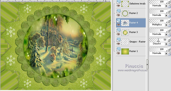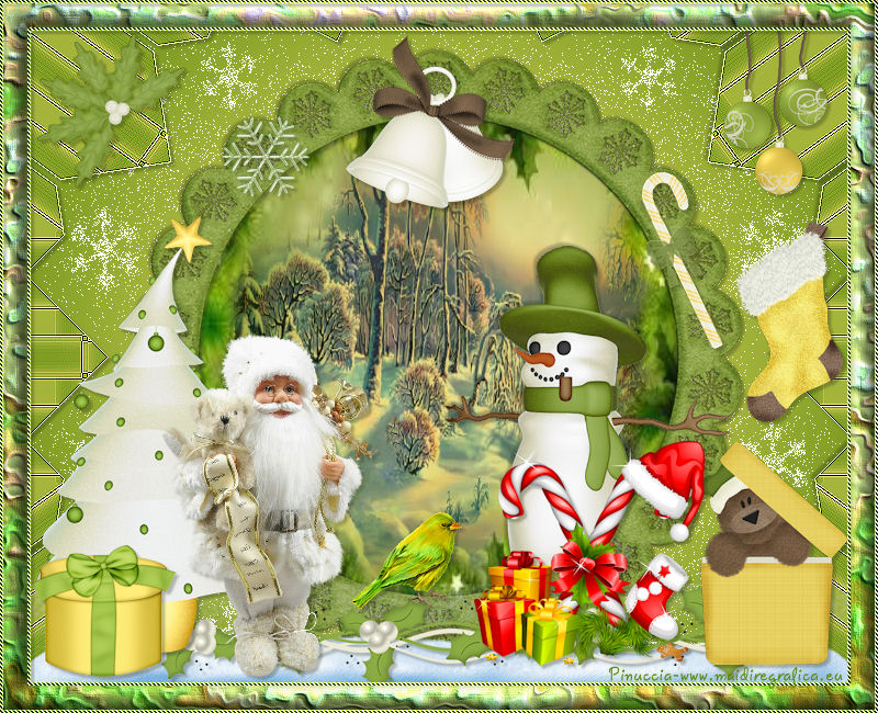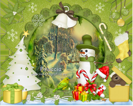 qui puoi trovare qualche risposta ai tuoi dubbi. Se l'argomento che ti interessa non è presente, ti prego di segnalarmelo. Questo tutorial è una creazione di ©Titoune e non può essere copiato su altri siti nè essere offerto per il download. Lo stesso vale per la mia traduzione. Il tutorial è stato creato con PSP X5, ma può essere eseguito anche con le altre versioni di PSP. Secondo la versione utilizzata (anteriore a PSP X) potresti ottenere dei risultati differenti. Dalla versione X4, il comando Immagine>Rifletti è stato sostituito con Immagine>Capovolgi in orizzontale, e il comando Immagine>Capovolgi con Immagine>Capovolgi in verticale. Nelle versioni X5 e X6, le funzioni sono state migliorate rendendo disponibile il menu Oggetti. Con il nuovo X7 sono tornati i comandi Rifletti/Capovolgi, ma con nuove differenze. Vedi la scheda sull'argomento qui Per tradure il tutorial ho usato PSP X. Occorrente: Un tube a scelta. Il resto del materiale qui Il tube utilizzato è di Kris. Filtri in caso di dubbi, ricorda di consultare la mia sezione filtri qui Penta.com - Jeans qui VM Instant Art - Tripolis qui Alien Skin Eye Candy 5 Nature - Snow Drift qui ![]() Metti la maschera nella cartella Maschere. Metti le selezioni nella cartella Selezioni. 1. Imposta il colore di primo piano con #fde974, e il colore di sfondo con #5e890e. Passa il colore di primo piano a Gradiente di primo piano/sfondo, stile Sprazzo di luce. ![]() 2. Apri una nuova immagine trasparente 750 x 600 pixels, e riempila con il gradiente.3. Selezione>Carica/Salva selezione>Carica selezione da disco. Cerca e carica la selezione "sélection_scrap_beautiful_winter". ![]() Selezione>Trasforma la selezione a livello. Selezione>Deseleziona. 4. Effetti>Effetti di trama>Intessitura. Colore intessitura: colore di primo piano #fde975 - colore spazio: colore di sfondo #5e890e. ![]() Effetti>Plugins>VM Instant Art - Tripolis, con i settaggi standard. ![]() 5. Effetti>Effetti di riflesso>Caleidoscopio. ![]() Effetti>Effetti di bordo>Aumenta. 6. Effetti>Effetti 3D>Sfalsa ombra, colore #21250f. ![]() Ripeti l'Effetto Sfalsa ombra, cambiando verticale e orizzontale con -3. 7. Attiva il livello Raster 1. Imposta il colore di primo piano con il colore bianco. Livelli>Nuovo livello raster. Riempi il livello con il colore bianco.Cambia la modalità di miscelatura di questo livello in Dissolvi e abbassa l'opacità al 50%. ![]() 8. Livelli>Carica/Salva maschera>Carica maschera da disco. Cerca e carica la maschera "sdtMask_XMas14_2". ![]() 9. Apri l'elemento Sweet Christmas_Frame_Scrap and Tubes, e vai a Modifica>Copia. Torna al tuo lavoro e vai a Modifica>Incolla come nuovo livello. Non spostarlo. 10. Attiva lo strumento Bacchetta magica ![]() e clicca al centro della cornice per selezionarla. Selezione>Modifica>Espandi - 5 pixels. 11. Livelli>Nuovo livello raster. Livelli>Disponi>Sposta giù. Apri l'immagine imagesCAPQ74ZP, e vai a Modifica>Copia. Torna al tuo lavoro e vai a Modifica>Incolla nella selezione. 12. Selezione>Carica/Salva selezione>Carica selezione da disco. Cerca e carica la selezione "selection_scrap_beautiful_winter2". ![]() 13. Livelli>Nuovo livello raster. Apri l'immagine deer 6a9b0ca5, e vai a Modifica>Copia. Torna al tuo lavoro e vai a Modifica>Incolla nella selezione. Selezione>Deseleziona. Cambia la modalità di miscelatura di questo livello in Moltiplica. ![]() 14. Attiva il livello superiore. Apri l'elemento Sweet Christmas_Snowman_Scrap and Tubes, e vai a Modifica>Copia. Torna al tuo lavoro e vai a Modifica>Incolla come nuovo livello. Spostalo nella parte inferiore destra della cornice.Vedi l'esempio finale. Porta questo livello sotto il livello della cornice. Livelli>Duplica. Porta questo livello sopra il livello della cornice. 15. Attiva lo strumento Gomma ![]() e cancella la parte inferiore del tube sotto il bordo della cornice. ![]() 16. Attiva il livello originale. Effetti>Effetti 3D>Sfalsa ombra, con i settaggi precedenti. 16. Attiva il livello della cornice. Effetti>Effetti 3D>Sfalsa ombra, colore #21250f. ![]() Ripeti l'Effetto Sfalsa ombra, cambiando verticale e orizzontale con -3. 17. Attiva nuovamente il livello superiore. Apri l'elemento snow, e vai a Modifica>Copia. Torna al tuo lavoro e vai a Modifica>Incolla come nuovo livello. Spostalo in basso.Vedi l'esempio finale. Effetti>Effetti 3D>Sfalsa ombra, colore #21250f. ![]() 18. Apri l'elemento Sweet Christmas_Decorative Border_Scrap and Tubes, e vai a Modifica>Copia. Torna al tuo lavoro e vai a Modifica>Incolla come nuovo livello. Spostalo sotto la cornice.Vedi l'esempio finale. Effetti>Effetti 3D>Sfalsa ombra, con i settaggi precedenti. 19. Apri l'elemento Sweet Christmas_Christmas Tree_Scrap and Tubes, e vai a Modifica>Copia. Torna al tuo lavoro e vai a Modifica>Incolla come nuovo livello. Spostalo in basso a sinistra.![]() Effetti>Effetti 3D>Sfalsa ombra, con i settaggi precedenti. 20. Apri l'elemento Sweet Christmas_Gift Box_Scrap and Tubes, e vai a Modifica>Copia. Torna al tuo lavoro e vai a Modifica>Incolla come nuovo livello. Spostalo in basso a sinistra.Vedi l'esempio finale. Effetti>Effetti 3D>Sfalsa ombra, con i settaggi precedenti. 21. Apri l'elemento Sweet Christmas_Poinsettia_Scrap and Tubes, e vai a Modifica>Copia. Torna al tuo lavoro e vai a Modifica>Incolla come nuovo livello. Spostalo in alto a sinistra.Vedi l'esempio finale. Effetti>Effetti 3D>Sfalsa ombra, con i settaggi precedenti. 22. Apri l'elemento Sweet Christmas_Snowflake_Scrap and Tubes, e vai a Modifica>Copia. Torna al tuo lavoro e vai a Modifica>Incolla come nuovo livello. Spostalo nella parte superiore sinistra della cornice.Vedi l'esempio finale. Effetti>Effetti 3D>Sfalsa ombra, con i settaggi precedenti. 23. Apri l'elemento Sweet Christmas_Bells_Scrap and Tubes, e vai a Modifica>Copia. Torna al tuo lavoro e vai a Modifica>Incolla come nuovo livello. Spostalo nella parte superiore della cornice.![]() Effetti>Effetti 3D>Sfalsa ombra, con i settaggi precedenti. 24. Apri l'element