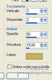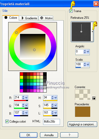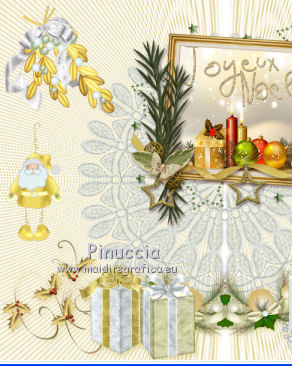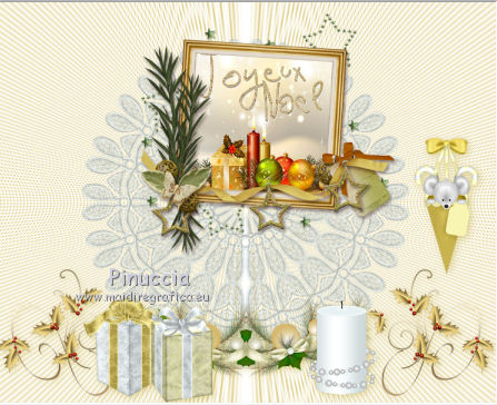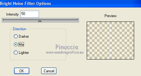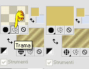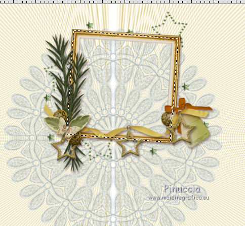 qui puoi trovare qualche risposta ai tuoi dubbi. Se l'argomento che ti interessa non è presente, ti prego di segnalarmelo. Questo tutorial è una creazione di ©Titoune e non può essere copiato su altri siti nè essere offerto per il download. Lo stesso vale per la mia traduzione. Il tutorial è stato creato con PSP X5, ma può essere eseguito anche con le altre versioni di PSP. Secondo la versione utilizzata (anteriore a PSP X) potresti ottenere dei risultati differenti. Vedi la mia scheda riguardante le funzioni Rifletti>Capovolgi in X4 e X5 qui Per tradure il tutorial ho usato PSP X. Occorrente: Un tube a scelta. Il resto del materiale qui Il tube utilizzato è di Nicky. Filtri in caso di dubbi, ricorda di consultare la mia sezione filtri qui Penta.com - Jeans qui DSB Flux - Bright Noise qui Animation Shop qui ![]() La trama Corel_15_002 è standard nelle versioni più recenti di PSP, e corrisponde alla trama standard delle versioni precedenti Retinatura 25%. Se non la trovi nel tuo PSP, metti quella fornita nella cartella trame. 1. Imposta il colore di primo piano con #d6c26b, seleziona Trama e imposta la trama Retinatura 25% (o Corel_15_002), con i seguenti settaggi. ![]() 2. Apri una nuova immagine BIANCA 750 x 600 pixels. Livelli>Nuovo livello raster. Riempi il livello con il colore+trama.3. Effetti>Effetti di distorsione>Coordinate polari. ![]() Rinomina questo livello "animazione". 4. Apri l'elemento pdc_doilie2 e vai a Modifica>Copia. Torna al tuo lavoro e vai a Modifica>Incolla come nuovo livello. Non spostarlo. Abbassa l'opacità di questo livello al 60%. 5. Apri l'elemento 91bba783 e vai a Modifica>Copia. Torna al tuo lavoro e vai a Modifica>Incolla come nuovo livello. 6. Effetti>Effetti di immagine>Scostamento. ![]() 7. Attiva lo strumento Selezione a mano libera ![]() e traccia una selezione intorno alla cornice. ![]() 8. Livelli>Nuovo livello raster. Livelli>Disponi>Sposta giù. 9. Apri l'immagine di sfondo e vai a Modifica>Copia. Torna al tuo lavoro e vai a Modifica>Incolla nella selezione. Selezione>Deseleziona. 10. Apri l'elemento pdc_elem4 e vai a Modifica>Copia. Torna al tuo lavoro e vai a Modifica>Incolla come nuovo livello. Livelli>Disponi>Porta in alto. 11. Effetti>Effetti di immagine>Scostamento. ![]() 12. Effetti>Effetti di riflesso>Specchio rotante. ![]() 13. Effetti>Effetti 3D>Sfalsa ombra, colore #c9b34e. ![]() 14. Apri l'elemento pdc_doodle3 e vai a Modifica>Copia. Torna al tuo lavoro e vai a Modifica>Incolla come nuovo livello. 15. Effetti>Effetti di immagine>Scostamento. ![]() Effetti>Effetti di riflesso>Specchio rotante, con i settaggi precedenti. Effetti>Effetti 3D>Sfalsa ombra, con i settaggi precedenti. 16. Apri l'elemento pdc_elem19 e vai a Modifica>Copia. Torna al tuo lavoro e vai a Modifica>Incolla come nuovo livello. Spostalo in basso.Vedi l'esempio finale. Effetti>Effetti 3D>Sfalsa ombra, con i settaggi precedenti. 17. Apri l'elemento pdc_elem18 e vai a Modifica>Copia. Torna al tuo lavoro e vai a Modifica>Incolla come nuovo livello. Sposta anche questo elemento nella parte inferiore.Vedi l'esempio finale. Effetti>Effetti 3D>Sfalsa ombra, con i settaggi precedenti. 18. Apri l'elemento pdc_elem12 e vai a Modifica>Copia. Torna al tuo lavoro e vai a Modifica>Incolla come nuovo livello. Spostalo in basso.Vedi l'esempio finale. Effetti>Effetti 3D>Sfalsa ombra, con i settaggi precedenti. 19. Apri l'elemento pdc_elem14 e vai a Modifica>Copia. Torna al tuo lavoro e vai a Modifica>Incolla come nuovo livello. Spostalo a destra.![]() 20. Apri l'elemento pdc_elem13 e vai a Modifica>Copia. Torna al tuo lavoro e vai a Modifica>Incolla come nuovo livello. Spostalo a sinistra.Vedi l'esempio finale. Effetti>Effetti 3D>Sfalsa ombra, con i settaggi precedenti. 21.Apri l'elemento pdc_elem7 e vai a Modifica>Copia. Torna al tuo lavoro e vai a Modifica>Incolla come nuovo livello. Spostalo in alto a sinistra.![]() Effetti>Effetti 3D>Sfalsa ombra, con i settaggi precedenti. 22. Apri l'elemento pdc_elem5 e vai a Modifica>Copia. Torna al tuo lavoro e vai a Modifica>Incolla come nuovo livello. Spostalo in alto a destra.![]() Effetti>Effetti 3D>Sfalsa ombra, con i settaggi precedenti. 23. Apri il tuo tube e vai a Modifica>Copia. Torna al tuo lavoro e vai a Modifica>Incolla come nuovo livello. Immagine>Ridimensiona, se e quanto necessario, tutti i livelli non selezionato. Spostalo dove preferisci,o vedi il mio esempio. Effetti>Effetti 3D>Sfalsa ombra, con i settaggi precedenti. 24. Assicurati di essere posizionato sul livello superiore. Livelli>Nuovo livello raster. Riempi con il colore di primo piano,dopo aver deselezionato la trama. per deselezionare la trama non occorre aprire la paletta dei materiali, sarà sufficiente cliccare sull'iconcina al centro della paletta. ![]() 25. Selezione>Seleziona tutto. Selezione>Modifica>Contrai - 2 pixels. Premi sulla tastiera il tasto CANC ![]() Selezione>Inverti. Effetti>Plugins>Penta.com - Jeans, con i settaggi standard. ![]() Effetti>Effetti 3D>Sfalsa ombra, con i settaggi precedenti. Effetti>Effetti di bordo>Aumenta. Selezione>Deseleziona. Firma il tuo lavoro. 26. Animazione. Attiva il livello "animazione". Livelli>Duplica, e rimani posizionato sul livello della seconda copia. Effetti>Plugins>DSB Flux - Bright Noise. ![]() Chiudi questo livello e attiva il livello della prima copia. 27. Effetti>Plugins>DSB Flux - Bright Noise clicca sul puntino di Mix per cambiare l'aspetto del disturbo e ok. Chiudi questo livello e attiva il livello "animazione". 28. Effetti>Plugins>DSB Flux - Bright Noise, clicca sul puntino di Mix e ok. Lascia il livello visibile. Modifica>Copia Unione. Apri Animation Shop e vai a Modifica>Incolla>Incolla come nuova animazione. 29. Torna in PSP. Chiudi il livello "animazione" e apri il livello della prima copia. Modifica>Copia Unione. Torna in Animation Shop e vai a Modifica>Incolla>Incolla dopo il fotogramma corrente. 30. Di nuovo in PSP. Chiudi il livello della prima copia e apri il livello della seconda copia.