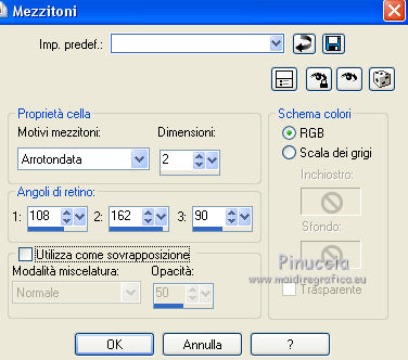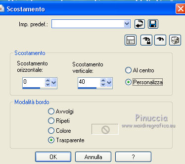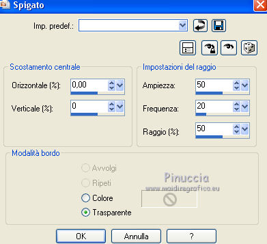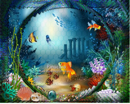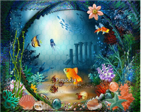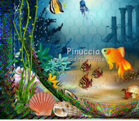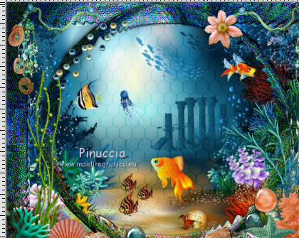 qui puoi trovare qualche risposta ai tuoi dubbi. Se l'argomento che ti interessa non è presente, ti prego di segnalarmelo. Questo tutorial è una creazione di ©Titoune e non può essere copiato su altri siti nè essere offerto per il download. Lo stesso vale per la mia traduzione. Il tutorial è stato creato con PSP X5, ma può essere eseguito anche con le altre versioni di PSP. Secondo la versione utilizzata (anteriore a PSP X) potresti ottenere dei risultati differenti. Vedi la mia scheda riguardante le funzioni Rifletti>Capovolgi in X4 e X5 qui Per tradure il tutorial ho usato PSP X. Occorrente: Un tube a scelta. Il resto del materiale qui Il tube utilizzato è di Kitty. Filtri: Penta.com - Jeans qui Animation Shop qui ![]() 1. Apri una nuova immagine trasparente 750 x 600 pixels. Selezione>Seleziona tutto. 2. Apri l'elemento 2003078 e vai a Modifica>Copia. Torna al tuo lavoro e vai a Modifica>Incolla nella selezione. Selezione>Deseleziona. Selezione>Modifica>Contrai - 55 pixels. Selezione>Inverti. 3. Regola>Sfocatura>Sfocatura gaussiana - raggio 15. ![]() 4. Effetti>Effetti di trama>Plastica morbida. ![]() Selezione>Modifica>Contrai - 5 pixels. 5. Effetti>Effetti artistici>Mezzitoni. ![]() 6. Effetti>Effetti di distorsione>Spigato. ![]() Selezione>Innalza selezione a livello. Selezione>Deseleziona. 7. Effetti>Effetti 3D>Smusso a incasso. ![]() Livelli>Duplica. 8. Effetti>Effetti geometrici>Cerchio. ![]() 9. Su entrambi i livelli del cerchio e del rettangolo: Effetti>Effetti 3D>Sfalsa ombra - colore #041417. ![]() Ripeti l'Effetto Sfalsa ombra, cambiando verticale e orizzontale con -3. 10. Attiva il livello Raster 1. Apri l'elemento Sky_BK_Wire e vai a Modifica>Copia. Torna al tuo lavoro e vai a Modifica>Incolla come nuovo livello. 11. Effetti>Effetti di immagine>Scostamento. ![]() Cambia la modalità di miscelatura di questo livello in Luce diffusa. 12. Attiva il livello superiore. Apri l'elemento element87_ks ALGUES e vai a Modifica>Copia. Torna al tuo lavoro e vai a Modifica>Incolla come nuovo livello. Spostalo in basso a sinistra.![]() 13. Effetti>Effetti 3D>Sfalsa ombra, con il colore #041417. ![]() 14. Apri l'elemento Sky_BK_Shell3 e vai a Modifica>Copia. Torna al tuo lavoro e vai a Modifica>Incolla come nuovo livello. Spostalo in basso a sinistra.Vedi l'esempio finale. Effetti>Effetti 3D>Sfalsa ombra, con i settaggi precedenti. 15. Apri l'elemento Sky_BK_Shell2 e vai a Modifica>Copia. Torna al tuo lavoro e vai a Modifica>Incolla come nuovo livello. Sposta anche questo elemento in basso a sinistra.![]() Effetti>Effetti 3D>Sfalsa ombra, con i settaggi precedenti. 16. Apri l'elemento Sky_BK_Coral e vai a Modifica>Copia. Torna al tuo lavoro e vai a Modifica>Incolla come nuovo livello. Spostalo in basso a sinistra.Vedi l'esempio finale. Effetti>Effetti 3D>Sfalsa ombra, con i settaggi precedenti. 17. Apri l'elemento Sky_BK_Gem Spill1 e vai a Modifica>Copia. Torna al tuo lavoro e vai a Modifica>Incolla come nuovo livello. Spostalo contro il bordo inferiore.Vedi l'esempio finale. Effetti>Effetti 3D>Sfalsa ombra, con i settaggi precedenti. 18. Apri l'elemento Sky_BK_Stone3 e vai a Modifica>Copia. Torna al tuo lavoro e vai a Modifica>Incolla come nuovo livello. Sposta anche questo elemento contro il bordo inferiore.Vedi l'esempio finale. Effetti>Effetti 3D>Sfalsa ombra, con i settaggi precedenti. 19. Apri l'elemento Sky_BK_Sea Grass e vai a Modifica>Copia. Torna al tuo lavoro e vai a Modifica>Incolla come nuovo livello. Spostalo in basso a destra.![]() Effetti>Effetti 3D>Sfalsa ombra, con i settaggi precedenti. 20. Apri l'elemento Sky_BK_Coral2 e vai a Modifica>Copia. Torna al tuo lavoro e vai a Modifica>Incolla come nuovo livello. Spostalo nell'angolo in basso a destra.![]() Effetti>Effetti 3D>Sfalsa ombra, con i settaggi precedenti. 21. Apri l'elemento Sky_BK_Stone2 e vai a Modifica>Copia. Torna al tuo lavoro e vai a Modifica>Incolla come nuovo livello. Spostalo in basso a destra.Vedi l'esempio finale. Effetti>Effetti 3D>Sfalsa ombra, con i settaggi precedenti. 22. Apri l'elemento Sky_BK_Stone4 e vai a Modifica>Copia. Torna al tuo lavoro e vai a Modifica>Incolla come nuovo livello. Spostalo in basso a destra.Vedi l'esempio finale. Effetti>Effetti 3D>Sfalsa ombra, con i settaggi precedenti. 23. Apri l'elemento Sky_BK_Shell1 e vai a Modifica>Copia. Torna al tuo lavoro e vai a Modifica>Incolla come nuovo livello. Sposta anche questo elemento in basso a destra.![]() Effetti>Effetti 3D>Sfalsa ombra, con i settaggi precedenti. 24. Apri l'elemento Sky_BK_Starfish e vai a Modifica>Copia. Torna al tuo lavoro e vai a Modifica>Incolla come nuovo livello. Spostalo in basso a destra.Vedi l'esempio finale. Effetti>Effetti 3D>Sfalsa ombra, con i settaggi precedenti. 25. Apri l'elemento Sky_BK_Flower2 e vai a Modifica>Copia. Torna al tuo lavoro e vai a Modifica>Incolla come nuovo livello. Spostalo in alto a destra.![]() Effetti>Effetti 3D>Sfalsa ombra, con i settaggi precedenti. 26. Apri l'elemento Sky_BK_Bead Dangle e vai a Modifica>Copia. Torna al tuo lavoro e vai a Modifica>Incolla come nuovo livello. Spostalo in alto a sinistra.Vedi l'esempio finale. Effetti>Effetti 3D>Sfalsa ombra, con i settaggi precedenti. Livelli>Duplica. Immagine>Rifletti. 27. Activer l'élément Sky_BK_Gem Spill2 e vai a Modifica>Copia. Torna al tuo lavoro e vai a Modifica>Incolla come nuovo livello. Spostalo in alto a sinistra.![]() Effetti>Effetti 3D>Sfalsa ombra, con i settaggi precedenti. 28. Apri il tuo tube e vai a Modifica>Copia. Torna al tuo lavoro e vai a Modifica>Incolla come nuovo livello. Immagine>Ridimensiona, se e quanto necessario, tutti i livelli non selezionato. Posiziona il tube come preferisci,o vedi il mio esempio. Effetti>Effetti 3D>Sfalsa ombra, con i settaggi precedenti. 29. Attiva il livello Raster 1. Selezione>Seleziona tutto. Selezione>Modifica>Contrai - 2 pixels. Selezione>Inverti. Selezione>Innalza selezione a livello. Livelli>Disponi>Porta in alto. 30. Effetti>Plugins>Penta.com - Jeans, con i s
