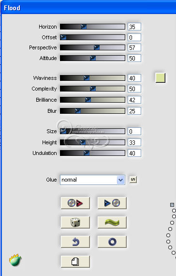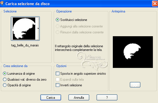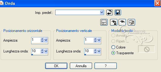 qui puoi trovare qualche risposta ai tuoi dubbi. Se l'argomento che ti interessa non è presente, ti prego di segnalarmelo. Questo tutorial è una creazione di ©Titoune e non può essere copiato su altri siti nè essere offerto per il download. Lo stesso vale per la mia traduzione. Il tutorial è stato creato con PSP X5, ma può essere eseguito anche con le altre versioni di PSP. Secondo la versione utilizzata (anteriore a PSP X) potresti ottenere dei risultati differenti. Per tradurlo, ho usato PSP X. Grazie ai creatori dei tubes che mettono a disposizione il loro lavoro in vari gruppi di condivisione. Rispetta il lavoro degli autori, non cambiare il nome del file e non cancellare il watermark. Occorrente: Un tube a scelta. Il resto del materiale qui Filtri: Flaming Pear - Flood qui Penta.com - Jeans qui Animation Shop qui ![]() Metti la selezione nella cartella Selezioni. 1. Apri una nuova immagine trasparente 750 x 600 pixels, e riempila con un colore a tua scelta(questa scelta ha poca importanza). 2. Apri l'elemento "13" e vai a Modifica>Copia. Torna al tuo lavoro e vai a Modifica>Incolla come nuovo livello. Non spostarlo. Rinomina questo livello "cornice". 3. Attiva lo strumento Bacchetta magica ![]() e clicca al centro della cornice per selezionarla. Selezione>Modifica>Espandi - 5 pixels. ![]() Livelli>Nuovo livello raster. Livelli>Disponi>Sposta giù. 4. Apri l'immagine Vector-Art-Flowers-020 e vai a Modifica>Copia. Torna al tuo lavoro e vai a Modifica>Incolla nella selezione. Rinomina questo livello "animazione". Selezione>Inverti. 5. Livelli>Nuovo livello raster. Livelli>Disponi>Sposta giù. Modifica>Incolla nella selezione (l'immagine è ancora in memoria). 6. Selezione>Seleziona tutto. Selezione>Modifica>Contrai - 15 pixels. Selezione>Inverti. Selezione>Innalza selezione a livello. 7. Effetti>Effetti 3D>Smusso a incasso. ![]() 8. Effetti>Effetti di trama>Plastica morbida. ![]() 9. Effetti>Effetti di distorsione>Onda. ![]() Selezione>Deseleziona. 10. Effetti>Effetti 3D>Sfalsa ombra, con il colore #4e6200. ![]() Ripeti l'Effetto Sfalsa ombra, cambiando verticale e orizzontale con -3. Rinomina questo livello "bordo". Livelli>Disponi>Porta in alto. 11. Attiva il livello della cornice. Effetti>Effetti 3D>Sfalsa ombra, con i settaggi precedenti. 12. Attiva nuovamente il livello superiore. Apri l'elemento "4" e vai a Modifica>Copia. Torna al tuo lavoro e vai a Modifica>Incolla come nuovo livello. 13. Effetti>Effetti di immagine>Scostamento. ![]() 14. Effetti>Effetti di riflesso>Specchio rotante. ![]() Effetti>Effetti 3D>Sfalsa ombra, con i settaggi precedenti. 15. Apri l'elemento "22" e vai a Modifica>Copia. Torna al tuo lavoro e vai a Modifica>Incolla come nuovo livello. Spostalo in alto a destra.Vedi l'esempio finale. Effetti>Effetti 3D>Sfalsa ombra, con i settaggi precedenti. 16. Apri l'elemento "24" e vai a Modifica>Copia. Torna al tuo lavoro e vai a Modifica>Incolla come nuovo livello. Spostalo in alto a sinistra.![]() Effetti>Effetti 3D>Sfalsa ombra, con i settaggi precedenti. Nella paletta dei livelli porta questo livello sotto quello del bordo. 17. Apri l'elemento "5cc7ea20" e vai a Modifica>Copia. Torna al tuo lavoro e vai a Modifica>Incolla come nuovo livello. Spostalo in basso a sinistra.Vedi l'esempio finale. Effetti>Effetti 3D>Sfalsa ombra, con i settaggi precedenti. 18. Attiva nuovamente il livello superiore. Apri l'elemento MFS Cluster 3 e vai a Modifica>Copia. Torna al tuo lavoro e vai a Modifica>Incolla come nuovo livello. Spostalo in basso a destra.Vedi l'esempio finale. Effetti>Effetti 3D>Sfalsa ombra, con i settaggi precedenti. 19. Apri l'elemento MHS Cluster2 e vai a Modifica>Copia. Torna al tuo lavoro e vai a Modifica>Incolla come nuovo livello. Spostalo in basso.![]() Effetti>Effetti 3D>Sfalsa ombra, con i settaggi precedenti. 20. Imposta il colore di primo piano con #697e08. Livelli>Nuovo livello raster. Riempi il livello con il colore di primo piano.22. Selezione>Seleziona tutto. Selezione>Modifica>Contrai - 2 pixels. Premi sulla tastiera il tasto CANC ![]() Selezione>Inverti. Effetti>Plugins>Penta.com - Jeans, con i settaggi standard. ![]() Effetti>Effetti 3D>Sfalsa ombra, con i settaggi precedenti. 23. Apri il tuo tube e vai a Modifica>Copia. Torna al tuo lavoro e vai a Modifica>Incolla come nuovo livello. Immagine>Ridimensiona, se e quanto necessario, tutti i livelli non selezionato. Spostalo dove preferisci o vedi il mio esempio.Firma il tuo lavoro. 24. Animazione. Attiva il livello "animazione". Selezione>Carica/Salva selezione>Carica selezione da disco. Cerca e carica la selezione "tag_belle_du_marais". ![]() Livelli>Duplica - 2 volte, e rimani posizionato sul livello della prima copia. 25. Effetti>Plugins>Flaming Pear - Flood - colore #dce5a0. ![]() Chiudi questo livello e attiva il livello della prima copia. 26. Effetti>Plugins>Flaming Pear, con i settaggi precedenti, clicca sull'icona dell'onda verde per cambiare l'aspetto delle onde. ![]() Chiudi questo livello e attiva il livello "animazione". 27. Effetti>Plugins>Flaming Pear - Flood, clicca sull'icona dell'onda verde e ok. Lascia il livello visibile. Selezione>Deseleziona. 28. Modifica>Copia Unione. Apri Animation Shop e vai a Modifica>Incolla>Incolla come nuova animazione. 29. Torna in PSP. Chiudi il livello "animazione" e apri il livello della prima copia. Modifica>Copia Unione. Torna in Animation Shop e vai a Modifica>Incolla>Incolla dopo il fotogramma corrente. 30. Di nuovo in PSP. Chiudi il livello della prima copia e apri il livello della seconda copia. Modifica>Copia Unione. In Animation Shop: Modifica>Incolla>Incolla dopo il fotogramma corrente. 31. Modifica>Seleziona tutto. Animazione>Proprietà fotogramma e imposta la velocità a 55. ![]() Controlla il risultato cliccando su Visualizza e salva in formato gif.![]() Se hai problemi o dubbi, o trovi un link non funzionante, scrivimi. 14 Aprile 2013 |