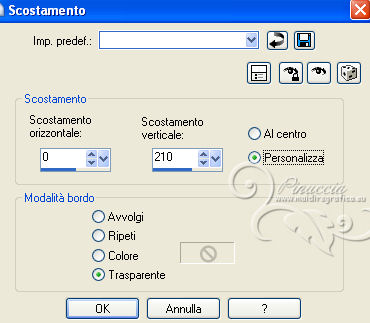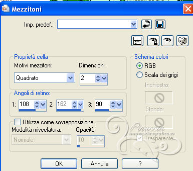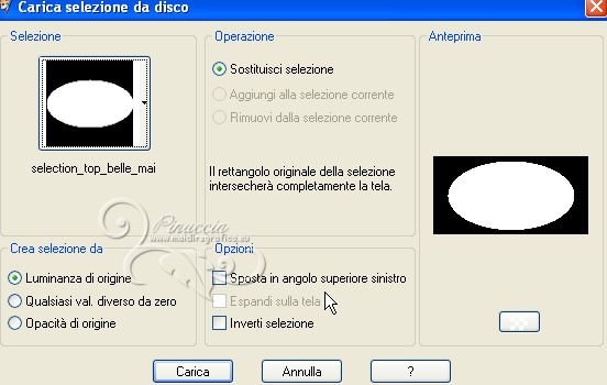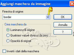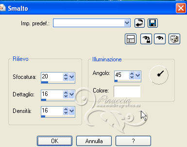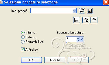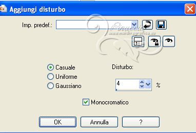 qui puoi trovare qualche risposta ai tuoi dubbi. Se l'argomento che ti interessa non è presente, ti prego di segnalarmelo. Questo tutorial è una creazione di ©Titoune e non può essere copiato su altri siti nè essere offerto per il download. Lo stesso vale per la mia traduzione. Il tutorial è stato creato con PSP X5, ma può essere eseguito anche con le altre versioni di PSP. Secondo la versione utilizzata (anteriore a PSP X) potresti ottenere dei risultati differenti. Per tradurlo, ho usato PSP X. Grazie ai creatori dei tubes che mettono a disposizione il loro lavoro in vari gruppi di condivisione. Rispetta il lavoro degli autori, non cambiare il nome del file e non cancellare il watermark. Occorrente: Un tube a scelta. Il resto del materiale qui Tubes ed elementi di Zezette2 Filtri: Tramages - Tow the line qui ![]() Metti la selezione nella cartella Selezioni. Apri la maschera in PSP e minimizzala con il resto del materiale. 1. Imposta il colore di primo piano con #567d7d, e il colore di sfondo con #2d3531. 2. Apri una nuova immagine trasparente 1280 x 650 pixels. Selezione>Seleziona tutto. 3. Apri l'immagine Lily%20of%20the%20Valley%20Shine%20Wallpaper__yvt2, e vai a Modifica>Copia. Torna al tuo lavoro e vai a Modifica>Incolla nella selezione. Selezione>Deseleziona. 4. Livelli>Duplica. Immagine>Ridimensiona, al 90%, tutti i livelli non selezionato. Selezione>Seleziona tutto. Selezione>Mobile. Selezione>Immobilizza. Selezione>Inverti. 5. Attiva il livello Raster 1. Regola>Sfocatura>Sfocatura gaussiana - raggio 45. ![]() Selezione>Innalza selezione a livello. 6. Effetti>Effetti artistici>Smalto. ![]() Selezione>Deseleziona. 7. Attiva nuovamente il livello superiore. Selezione>Seleziona tutto. Selezione>Mobile. Selezione>Immobilizza. 8. Selezione>Modifica>Seleziona bordature selezione. ![]() 9. Effetti>Effetti artistici>Mezzitoni. ![]() Selezione>Innalza selezione a livello. Selezione>Deseleziona. 10. Effetti>Effetti 3D>Smusso a incasso. ![]() 11. Ritorna al livello sottostante. Selezione>Seleziona tutto. Selezione>Mobile. Selezione>Immobilizza. Regola>Sfocatura>Sfocatura gaussiana, con i settaggi precedenti. Selezione>Modifica>Contrai - 55 pixels. Selezione>Inverti. 12. Effetti>Plugins>Tramages - Tow the line, con i settaggi standard. ![]() Selezione>Innalza selezione a livello. 13. Effetti>Effetti di riflesso>Specchio rotante. ![]() Effetti>Effetti 3D>Smusso a incasso, con i settaggi precedenti. Selezione>Deseleziona. 15. Effetti>Effetti 3D>Sfalsa ombra, con il colore #193b30. ![]() Ripeti l'Effetto Sfalsa ombra, cambiando verticale e orizzontale con -3. 16. Attiva il livello superiore. Selezione>Carica/Salva selezione>Carica selezione da disco. Cerca e carica la selezione "top_belle_de_mai". ![]() Livelli>Nuovo livello raster. 17. Attiva nuovamente l'immagine Lily%20of%20the%20Valley%20Shine%20Wallpaper__yvt2 e vai a Modifica>Copia. Torna al tuo lavoro e vai a Modifica>Incolla nella selezione. 18. Selezione>Modifica>Seleziona bordature selezione, con i settaggi precedenti. Effetti>Effetti artistici>Mezzitoni, con i settaggi precedenti. Selezione>Innalza selezione a livello. Selezione>Deseleziona. Effetti>Effetti 3D>Smusso a incasso, con i settaggi precedenti. Effetti>Effetti 3D>Sfalsa ombra, con i settaggi precedenti. 19. Apri l'elemento "leaf" e vai a Modifica>Copia. Torna al tuo lavoro e vai a Modifica>Incolla come nuovo livello. Spostalo in alto a sinistra.Vedi l'esempio finale. Effetti>Effetti 3D>Sfalsa ombra, con i settaggi precedenti. Livelli>Duplica. Immagine>Rifletti. Immagine>Capovolgi. Posiziona l'elemento in basso a destra.![]() 20. Apri l'elemento CNRIVYCNP (edera) e vai a Modifica>Copia. Torna al tuo lavoro e vai a Modifica>Incolla come nuovo livello. Spostalo in alto a destra.Vedi l'esempio finale. Effetti>Effetti 3D>Sfalsa ombra, con i settaggi precedenti. 21. Apri l'elemento 244d6676 (goccia-mughetto) e vai a Modifica>Copia. Torna al tuo lavoro e vai a Modifica>Incolla come nuovo livello. Spostalo in basso a sinistra.![]() Effetti>Effetti 3D>Sfalsa ombra, con i settaggi precedenti. 22. Apri l'elemento "wordart_belle_de_mai" e vai a Modifica>Copia. Torna al tuo lavoro e vai a Modifica>Incolla come nuovo livello. Spostalo dove preferisci o vedi il mio esempio.Effetti>Effetti 3D>Sfalsa ombra, con i settaggi precedenti. 23. Apri il tuo tube e vai a Modifica>Copia. Torna al tuo lavoro e vai a Modifica>Incolla come nuovo livello. Immagine>Ridimensiona, se e quanto necessario, tutti i livelli non selezionato. Spostalo dove preferisci o vedi il mio esempio.Effetti>Effetti 3D>Sfalsa ombra, con i settaggi precedenti. 24. Attiva il livello inferiore. Selezione>Seleziona tutto. Immagine>Ritaglia la selezione. Immagine>Dimensioni tela - 1280 x 1500 pixels. ![]() 25. Livelli>Nuovo livello raster. Livelli>Disponi>Sposta giù. Riempi con il colore di primo piano.26. Apri una nuova immagine trasparente 1280 x 350 pixels, e riempila con il colore di sfondo.27. Regola>Aggiungi/Rimuovi disturbo>Aggiungi disturbo. ![]() 28. Livelli>Nuovo livello maschera>Da immagine. Apri il menu sotto la finestra di origine e vedrai la lista dei files aperti. Seleziona la maschera "border", con i seguenti settaggi: ![]() Livelli>Unisci>Unisci gruppo. Modifica>Copia. Torna al tuo top e vai a Modifica>Incolla come nuovo livello. 28. Effetti>Effetti di immagine>Scostamento. ![]() Effetti>Effetti 3D>Sfalsa ombra, con i settaggi precedenti. Firma il tuo lavoro. Livelli>Unisci>Unisci tutto e salva in formato jpg. ![]() Se hai problemi o dubbi, o trovi un link non funzionante, scrivimi. 27 Aprile 2013 |