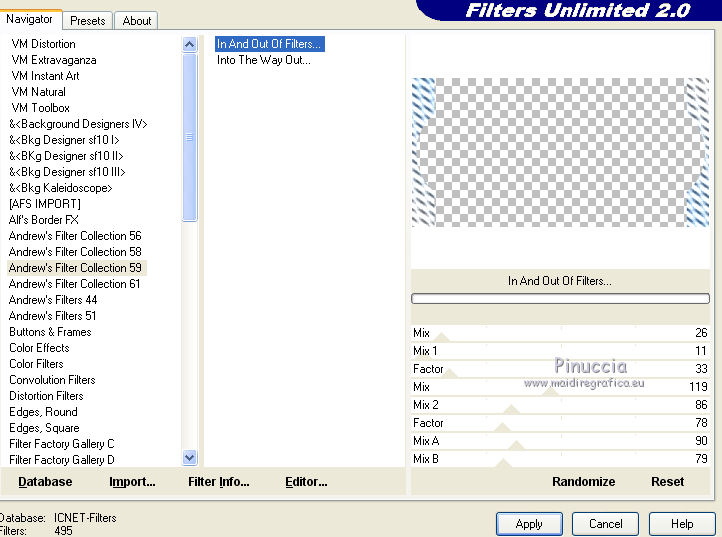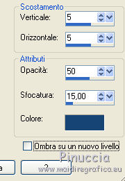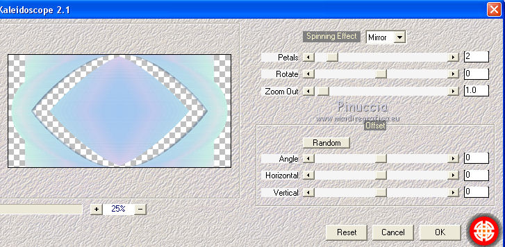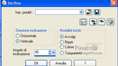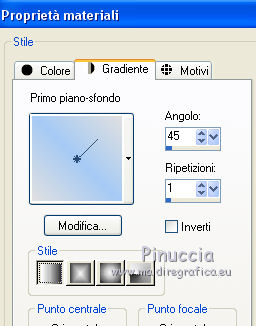 qui puoi trovare qualche risposta ai tuoi dubbi. Se l'argomento che ti interessa non è presente, ti prego di segnalarmelo. Questo tutorial è una creazione di ©Titoune e non può essere copiato su altri siti nè essere offerto per il download. Lo stesso vale per la mia traduzione. Il tutorial è stato creato con PSP X5, ma può essere eseguito anche con le altre versioni di PSP. Secondo la versione utilizzata (anteriore a PSP X) potresti ottenere dei risultati differenti. Vedi la mia scheda riguardante le funzioni Rifletti>Capovolgi in X4 e X5 qui Per tradure il tutorial ho usato PSP X. Occorrente: Un tube a scelta. Il resto del materiale qui Il tube è di Nara Pamplona Filtri: Filters Unlimited 2.0 qui Andrew's Filter - In and out of Filters qui Mehdi - Kaleidoscope 2.1 qui I filtri Andrews si possono usare da soli o importati in Filters Unlimited. (come fare vedi qui). Se un filtro fornito appare con questa icona ![]() Metti le selezioni nella cartella Selezioni. 1. Imposta il colore di primo piano con il colore #e0e0e0, e il colore di sfondo con #a5caf4. Passa il colore di primo piano a Gradiente, stile Lineare. ![]() 2. Apri una nuova immagine trasparente 1280 x 650 pixels, e riempila con il gradiente.3. Effetti>Effetti di trama>Plastica Morbida. ![]() 4. Livelli>Duplica. Immagine>Rifletti. Abbassa l'opacità di questo livello al 50%. Livelli>Unisci>Unisci giù. Effetti>Effetti di bordo>Aumenta. 5. Livelli>Duplica. Immagine>Ridimensiona, all'85%, tutti i livelli non selezionato. 6. Effetti>Effetti geometrici>Inclina. ![]() 7. Effetti>Effetti 3D>Sfalsa ombra, con il colore #174475. ![]() 8. Effetti>Effetti geometrici>Sfera. ![]() 9. Effetti>Plugins>Mehdi - Kaleidoscope 2.1. ![]() 10. Selezione>Carica/Salva selezione>Carica selezione da disco. Cerca e carica la selezione "selection_top_blue_dream". ![]() 11. Effetti>Effetti artistici>Mezzitoni. ![]() Effetti>Effetti di bordo>Aumenta. 12. Effetti>Effetti 3D>sfals aombra, colore #174475. ![]() Ripeti l'Effetto Sfalsa ombra, cambiando verticale e orizzontale con -5. Selezione>Deseleziona. 13. Attiva lo strumento Selezione a mano libera ,e seleziona il motivo centrale (la losanga), eventualmente per vedere meglio, chiudi momentaneamente il livello inferiore. ![]() Modifica>Taglia (questo comando oltre a tagliare tiene anche in memoria). Selezione>Deseleziona. Modifica>Incolla come nuovo livello. 14. Rinomina questo livello "losanga". Livelli>Disponi>Sposta giù. 15. Livelli>Duplica. Effetti>Effetti di distorsione>Coordinate polari. ![]() 16. Effetti>Effetti di immagine>Scostamento. ![]() Livelli>Disponi>Porta in alto. 17. Attiva il livello copia di Raster 1 (il secondo dall'alto). ![]() Selezione>Carica/Salva selezione>Carica selezione da disco. Cerca e carica la selezione "selection_top_blue_dream2". ![]() 18. Livelli>Nuovo livello raster. Riempi con il gradiente.19. Selezione>Modifica>Contrai - 2 pixel. Selezione>Inverti. Effetti>Plugins>Filters Unlimited 2.0 - Andrew's Filter Collection 59 - In And Out Of Filters, con i settaggi standard. ![]() Selezione>Innalza selezione a livello. Selezione>Deseleziona. Effetti>Effetti 3D>Sfalsa ombra, con i settaggi precedenti. 20. Attiva il livello "losanga". Attiva lo strumento Selezione a mano libera ![]() e traccia una selezione intorno all'immagine centrale (anche in questo caso puoi facilitare il lavoro chiudendo il livello che disturba la visibilità) ![]() 21. Livelli>Nuovo livello raster. Apri l'immagine di sfondo e vai a Modifica>Copia. Torna al tuo lavoro e vai a Modifica>Incolla nella selezione. Selezione>Deseleziona. 22. Attiva il livello superiore. Apri l'elemento bluestars e vai a Modifica>Copia. Torna al tuo lavoro e vai a Modifica>Incolla come nuovo livello. Spostalo a sinistra,vedi l'esempio finale. 23. Effetti>Effetti 3D>Sfalsa ombra, colore #174475. ![]() 24. Apri l'elemento Blue_Flowers e vai a Modifica>Copia. Torna al tuo lavoro e vai a Modifica>Incolla come nuovo livello. Spostalo in alto a sinistra,vedi l'esempio finale. Effetti>Effetti 3D>Sfalsa ombra, con i settaggi precedenti. 25. Apri l'elemento bluedoodles e vai a Modifica>Copia. Torna al tuo lavoro e vai a Modifica>Incolla come nuovo livello. Spostalo a destra,vedi l'esempio finale. Nessun Effetto Sfalsa ombra. 26. Apri l'elemento bluecorner e vai a Modifica>Copia. Torna al tuo lavoro e vai a Modifica>Incolla come nuovo livello. Spostalo in alto a destra,vedi l'esempio finale. Effetti>Effetti 3D>Sfalsa ombra, con i settaggi precedenti. 27. Apri l'elemento blue_rose e vai a Modifica>Copia. Torna al tuo lavoro e vai a Modifica>Incolla come nuovo livello. Sposta anche questo elemento in alto a destra.vedi l'esempio finale. Effetti>Effetti 3D>Sfalsa ombra, con i settaggi precedenti. 28. Apri l'elemento lampe25m1 e vai a Modifica>Copia. Torna al tuo lavoro e vai a Modifica>Incolla come nuovo livello. Spostalo in basso a destra,vedi l'esempio finale. Effetti>Effetti 3D>Sfalsa ombra, con i settaggi precedenti. 29. Attiva il livello inferiore. Modifica>Copia. Selezione>Seleziona tutto. Immagine>Ritaglia la selezione. 30. Immagine>Dimensioni tela - 1280 x 1500 pixels. ![]() Livelli>Nuovo livello raster. Livelli>Disponi>Porta sotto. Selezione>Seleziona tutto. Modifica>Incolla nella selezione. Selezione>Deseleziona. 31. Attiva il livello superiore. Apri l'elemento bluedoodlesborder e vai a Modifica>Copia. Torna al tuo lavoro e vai a Modifica>Incolla come nuovo livello. 32. Effetti>Effetti di immagine>Scostamento. ![]() 33. Apri il tuo tube e vai a Modifica>Copia. Torna al tuo lavoro e vai a Modifica>Incolla come nuovo livello. Immagine>Ridimensiona, se e quanto necessario, tutti i livelli non selezionato. Spostalo dove preferisci,o vedi il mio esempio. Effetti>Effetti 3D>Sfalsa ombra, con i settaggi precedenti. 35. Firma il tuo lavoro. Livelli>Unisci>Unisci tutto e salva in formato jpg. ![]() ![]() Se hai problemi o dubbi, o trovi un link non funzionante, scrivimi. 16 Agosto 2013 |