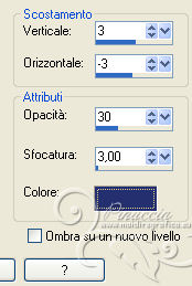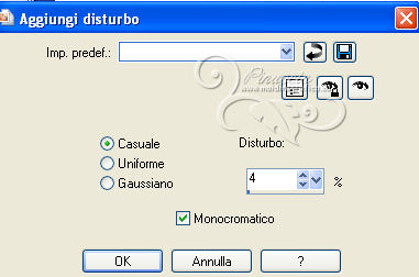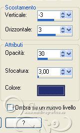 qui puoi trovare qualche risposta ai tuoi dubbi. Se l'argomento che ti interessa non è presente, ti prego di segnalarmelo. Questo tutorial è una creazione di ©Titoune e non può essere copiato su altri siti nè essere offerto per il download. Lo stesso vale per la mia traduzione. Il tutorial è stato creato con PSP X5, ma può essere eseguito anche con le altre versioni di PSP. Secondo la versione utilizzata (anteriore a PSP X) potresti ottenere dei risultati differenti. Per tradurlo, ho usato PSP X. Grazie ai creatori dei tubes che mettono a disposizione il loro lavoro in vari gruppi di condivisione. Rispetta il lavoro degli autori, non cambiare il nome del file e non cancellare il watermark. Occorrente: Un tube a scelta. Il resto del materiale qui Animation Shop qui ![]() 1. Apri una nuova immagine trasparente 750 x 600 pixels. Imposta il colore di primo piano con il colore bianco, e riempi l'immagine trasparente con il colore bianco.2. Apri BLUESLACE, che è composto da molti livelli, che dovrai colorizzare in base al tube utilizzato. Per l'esempio ho scelto il colore #4957c6. Prendi nota dei valori di Tonalità (H) e Saturazione (S) del tuo colore. Regola>Tonalità e saturazione>Viraggio, e trascrivi i valori annotati nelle rispettive caselle. ![]() Colorizza uno alla volta tutti gli elementi. 3. Una volta eseguita questa operazione: attiva il livello "Gruppo-Raster 6" (il secondo dal basso). Modifica>Copia. Torna al tuo lavoro. Livelli>Nuovo livello raster. Selezione>Seleziona tutto. Modifica>Incolla nella selezione. Selezione>Deseleziona. 4. Effetti>Effetti di trama>Motivo unico, con i settaggi standard. ![]() Rinomina questo livello "animazione". 5. Attiva nuovamente BLUESLACE. Attiva il livello Raster 2. Modifica>Copia. Torna al tuo lavoro e vai a Modifica>Incolla come nuovo livello. 6. Immagine>Ridimensiona, al 115%, tutti i livelli non selezionato. 7. Effetti>Effetti di immagine>Scostamento. ![]() 8. Attiva nuovamente BLUESLACE. Attiva il livello Merged. Modifica>Copia. Torna al tuo lavoro e vai a Modifica>Incolla come nuovo livello. 9. Immagine>Ridimensiona, al 115%, tutti i livelli non selezionato. Effetti>Effetti di immagine>Scostamento, con i settaggi precedenti. ![]() 10. Attiva lo strumento Bacchetta magica , tolleranza 45.Clicca al centro della cornice per selezionarla. Selezione>Modifica>Espandi - 20 pixels. 11. Livelli>Nuovo livello raster. Livelli>Disponi>Sposta giù. Imposta il colore di primo piano con un colore scelto dal paesaggio, per l'esempio #282e60. Riempi con il colore di primo piano.12. Regola>Aggiungi/Rimuovi disturbo>Aggiungi disturbo. ![]() 13. Apri il tube 16413e6e e vai a Modifica>Copia. Torna al tuo lavoro e vai a Modifica>Incolla nella selezione. Selezione>Deseleziona. 14. Attiva il livello della cornice. Effetti>Effetti 3D>Sfalsa ombra, con il colore #242f6f. ![]() Ripeti l'Effetto Sfalsa ombra, cambiando verticale e orizzontale con -3/3. ![]() 15. Attiva ancora BLUESLACE. Attiva il livello Raster 6. Modifica>Copia. Torna al tuo lavoro e vai a Modifica>Incolla come nuovo livello. Spostalo in basso a sinistra.Vedi l'esempio finale. Effetti>Effetti 3D>Sfalsa ombra, con i settaggi precedenti. 16. Ritorna all'immagine BLUESLACE. Attiva il livello Copy(2) of Raster 3. Modifica>Copia. Torna al tuo lavoro e vai a Modifica>Incolla come nuovo livello. Spostalo in alto a sinistra.Nella paletta dei livelli porta questo livello sopra il livello "animazione". Vedi l'esempio finale. Effetti>Effetti 3D>Sfalsa ombra, con i settaggi precedenti. 17. Ritorna all'immagine BLUESLACE. Attiva il livello Copy of Raster 3. Modifica>Copia. Torna al tuo lavoro e vai a Modifica>Incolla come nuovo livello. Spostalo in basso a destra.![]() Effetti>Effetti 3D>Sfalsa ombra, con i settaggi precedenti. 18. Attiva il livello superiore. Ritorna all'immagine BLUESLACE. Attiva il livello Raster 7. Modifica>Copia. Torna al tuo lavoro e vai a Modifica>Incolla come nuovo livello. Spostalo a sinistra.Vedi l'esempio finale. Effetti>Effetti 3D>Sfalsa ombra, con i settaggi precedenti. 19. Ritorna all'immagine BLUESLACE. Attiva il livello Raster 3. Modifica>Copia. Torna al tuo lavoro e vai a Modifica>Incolla come nuovo livello. 20. Immagine>Ridimensiona, all'85%, tutti i livelli non selezionato. Immagine>Ruota per gradi - 15 gradi a sinistra. ![]() Spostalo in alto a destra.![]() Effetti>Effetti 3D>Sfalsa ombra, con i settaggi precedenti. 21. Ritorna all'immagine BLUESLACE. Attiva il livello Raster 5. Modifica>Copia. Torna al tuo lavoro e vai a Modifica>Incolla come nuovo livello. Immagine>Ruota per gradi - 15 gradi a sinistra. ![]() Spostalo in alto a sinistra.Vedi l'esempio finale. Effetti>Effetti 3D>Sfalsa ombra, con i settaggi precedenti. 22. Ritorna all'immagine BLUESLACE. Attiva il livello Copy(3) of Raster 3. Modifica>Copia. Torna al tuo lavoro e vai a Modifica>Incolla come nuovo livello. Immagine>Ridimensiona, all'85%, tutti i livelli non selezionato. Spostalo in alto a sinistra.![]() Effetti>Effetti 3D>Sfalsa ombra, con i settaggi precedenti. 23. Ritorna all'immagine BLUESLACE. Attiva il livello Raster 4. Modifica>Copia. Torna al tuo lavoro e vai a Modifica>Incolla come nuovo livello. Immagine>Ridimensiona, al 75%, tutti i livelli non selezionato. Spostalo a destra.![]() Effetti>Effetti 3D>Sfalsa ombra, con i settaggi precedenti. 24. Apri il tuo tube e vai a Modifica>Copia. Torna al tuo lavoro e vai a Modifica>Incolla come nuovo livello. Immagine>Ridimensiona, se e quanto necessario, tutti i livelli non selezionato. Spostalo a sinistra.Vedi l'esempio finale. Effetti>Effetti 3D>Sfalsa ombra, con i settaggi precedenti. 25. Apri il tube blue_lace_wordart e vai a Modifica>Copia. Torna al tuo lavoro e vai a Modifica>Incolla come nuovo livello. Spostalo in basso a destra.Vedi l'esempio finale. Effetti>Effetti 3D>Sfalsa ombra, con i settaggi precedenti. 26. Apri il tube blue_lace_border e vai a Modifica>Copia. Torna al tuo lavoro e vai a Modifica>Incolla come nuovo livello. Firma il tuo la