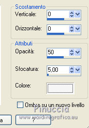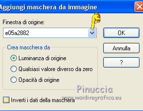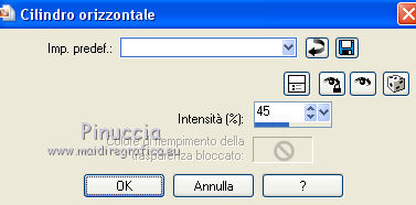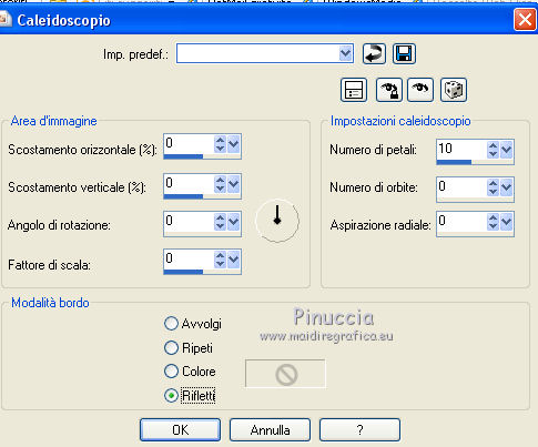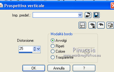 qui puoi trovare qualche risposta ai tuoi dubbi. Se l'argomento che ti interessa non è presente, ti prego di segnalarmelo. Questo tutorial è una creazione di ©Titoune e non può essere copiato su altri siti nè essere offerto per il download. Lo stesso vale per la mia traduzione. Il tutorial è stato creato con PSP X5, ma può essere eseguito anche con le altre versioni di PSP. Secondo la versione utilizzata (anteriore a PSP X) potresti ottenere dei risultati differenti. Vedi la mia scheda riguardante le funzioni Rifletti>Capovolgi in X4 e X5 qui Per tradurre il tutorial ho usato PSP X. Occorrente: Un tube a scelta. Il resto del materiale qui Il tube utilizzato è di Outlaw by design Filtri Simple - Left Right Wrap (bonus) qui Penta.com - Jeans qui ![]() Apri le maschere in PSP e minimizzale con il resto del materiale. 1. Imposta il colore di primo piano con #5052a9, e il colore di sfondo con #030e2c. Passa il colore di primo piano a Gradiente di primo piano/sfondo, stile Sprazzo di luce. ![]() 2. Apri una nuova immagine trasparente 1280 x 550 pixels, e riempila con il gradiente.Livelli>Duplica. 3. Livelli>Nuovo livello maschera>Da immagine. Apri il menu sotto la finestra di origine e vedrai la lista dei files aperti. Seleziona la maschera e05a2882, con i seguenti settaggi. ![]() non preoccuparti se ti sembrerà di non vedere nulla Livelli>Unisci>Unisci gruppo. 4. Effetti>Effetti 3D>Sfalsa ombra, colore #f6f6f6. ![]() Ripeti l'Effetto Sfalsa ombra, cambiando verticale e orizzontale con -3. 5. Effetti>Effetti di riflesso>Caleidoscopio. ![]() 6. Effetti>Effetti geometrici>Prospettiva verticale, Due volte con i seguenti settaggi. ![]() 7. Effetti>Effetti geometrici>Sfera. ![]() 8. Attiva il livello inferiore. Regola>Aggiungi/Rimuovi disturbo>Aggiungi disturbo. ![]() 9. Apri l'elemento cac99722 e vai a Modifica>Copia. Torna al tuo lavoro e vai a Modifica>Incolla come nuovo livello. Spostalo contro il bordo inferiore.10. Porta questo livello sotto il livello della maschera. Livelli>Duplica. Livelli>Disponi>Porta in alto. 11. Attiva lo strumento Gomma ![]() e cancella le parti laterali del tube ![]() Dovresti avere questo. ![]() 12. Attiva il livello originale. Effetti>Effetti 3D>Sfalsa ombra, con i settaggi precedenti. 13. Attiva il livello superiore. Apri l'elemento 0_961c5_3923bdc0_L e vai a Modifica>Copia. Torna al tuo lavoro e vai a Modifica>Incolla come nuovo livello. Effetti>Plugins>Simple - Left Right Wrap. 14. Effetti>Effetti di immagine>Scostamento. ![]() 15. Effetti>Effetti geometrici>Cilindro orizzontale. ![]() Effetti>Effetti 3D>Sfalsa ombra, con i settaggi precedenti. 16. Apri l'elemento 4b9f4038 e vai a Modifica>Copia. Torna al tuo lavoro e vai a Modifica>Incolla come nuovo livello. Spostalo in alto a sinistra.Vedi l'esempio finale. 17. Effetti>Effetti di riflesso>Specchio rotante. ![]() 18. Effetti>Effetti 3D>Sfalsa ombra, con i settaggi precedenti. 19. Apri l'elemento 0_afded_88e3ae73_L e vai a Modifica>Copia. Torna al tuo lavoro e vai a Modifica>Incolla come nuovo livello. Spostalo nella parte superiore.Vedi l'esempio finale. Effetti>Effetti 3D>Sfalsa ombra, con i settaggi precedenti. 20. Attiva il livello Raster 1. Selezione>Seleziona tutto. Immagine>Ritaglia la selezione. 21. Immagine>Dimensioni tela - 1280 x 1500 pixels. ![]() 22. Livelli>Nuovo livello raster. Livelli>Disponi>Sposta giù. Riempi con il gradiente di partenza.23. Apri una nuova immagine trasparente 1280 x 350 pixels, e riempila con il gradiente.24. Livelli>Nuovo livello maschera>Da immagine. Apri il menu sotto la finestra di origine e vedrai la lista dei files aperti. Seleziona la maschera "Mask040BrookeKroeger", con i seguenti settaggi. ![]() Livelli>Unisci>Unisci gruppo. Modifica>Copia. Torna al tuo top e vai a Modifica>Incolla come nuovo livello. 25. Effetti>Effetti di immagine>Scostamento. ![]() Effetti>Effetti 3D>sfalsa ombra, con i settaggi precedenti. 26. Attiva lo strumento Selezione ![]() clicca sull'icona Selezione personalizzata ![]() e imposta i seguenti settaggi. ![]() Selezione>Innalza selezione a livello. Livelli>Disponi>Porta in alto. Effetti>Plugins>Penta.com - Jeans, con i settaggi standard. ![]() Effetti>Effetti di bordo>Aumenta. 27. Effetti>Effetti 3D>Smusso a incasso. ![]() 28. Apri il tuo tube e vai a Modifica>Copia. Torna al tuo lavoro e vai a Modifica>Incolla come nuovo livello. Immagine>Ridimensiona, se e quanto necessario, tutti i livelli non selezionato. Spostalo sul bordo della maschera.Vedi l'esempio finale. Effetti>Effetti 3D>Sfalsa ombra, colore #f6f6f6. ![]() 29. Firma il tuo lavoro. Livelli>Unisci>Unisci tutto e salva in formato jpg. ![]() Se hai problemi o dubbi, o trovi un link non funzionante, scrivimi. 31 Dicembre 2013 |