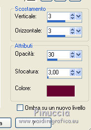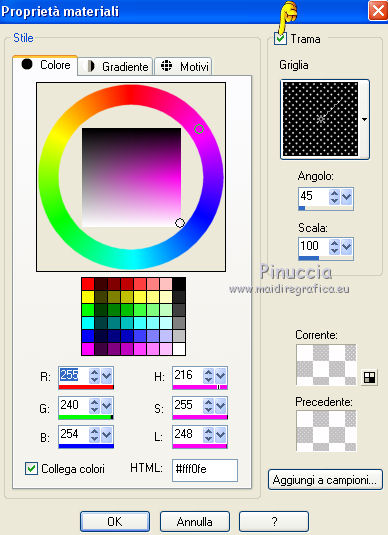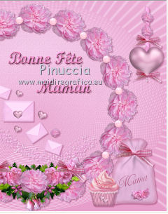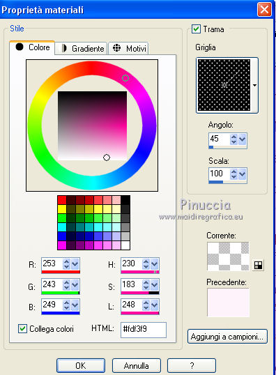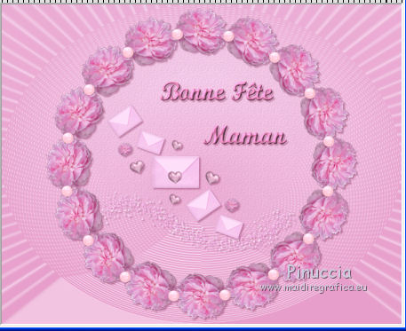 qui puoi trovare qualche risposta ai tuoi dubbi. Se l'argomento che ti interessa non è presente, ti prego di segnalarmelo. Questo tutorial è una creazione di ©Titoune e non può essere copiato su altri siti nè essere offerto per il download. Lo stesso vale per la mia traduzione. Il tutorial è stato creato con Corel17, ma può essere eseguito anche con le altre versioni di PSP. Secondo la versione utilizzata (anteriore a PSP X) potresti ottenere dei risultati differenti. Dalla versione X4, il comando Immagine>Rifletti è stato sostituito con Immagine>Capovolgi in orizzontale, e il comando Immagine>Capovolgi con Immagine>Capovolgi in verticale. Nelle versioni X5 e X6, le funzioni sono state migliorate rendendo disponibile il menu Oggetti. Con il nuovo X7 sono tornati i comandi Rifletti/Capovolgi, ma con nuove differenze. Vedi la scheda sull'argomento qui Per tradurre il tutorial ho usato PSP X. Occorrente: Un tube a scelta. Il resto del materiale qui Il tube utilizzato è di Krys. Filtri in caso di dubbi, ricorda di consultare la mia sezione filtri qui Graphics Plus - Cross Shadow qui Filters Unlimited 2.0 qui I filtri Graphics Plus si possono usare da soli o importati in Filters Unlimited (come fare vedi qui) Se un filtro fornito appare con questa icona ![]() Metti la trama nella cartella Trame. 1. Imposta il colore di primo piano con #f3c8e8, e il colore di sfondo con #e79eca. Passa il colore di primo piano a Gradiente di primo piano/sfondo, stile Sprazzo di luce. ![]() 2. Apri una nuova immagine trasparente 750 x 600 pixels, e riempila con il gradiente.3. Imposta il colore di primo piano con il colore #fff0fe, e a destra seleziona "Trama", imposta la trama Griglia con i seguenti settaggi. ![]() Riempi con questo colore+trama.4. Effetti>Effetti geometrici>Prospettiva verticale. ![]() 5. Effetti>Effetti di distorsione>Coordinate polari. ![]() 6. Immagine>Capovolgi. 7. Effetti>Effetti 3D>Sfalsa ombra, colore #680332. ![]() 8. Apri l'elemento frame_1 e vai a Modifica>Copia. Torna al tuo lavoro e vai a Modifica>Incolla come nuovo livello. Non spostarlo. 9. Attiva lo strumento Bacchetta magica ![]() e clicca al centro della cornice per selezionarla. Selezione>Modifica>Espandi - 3 pixels. 10. Attiva il livello inferiore. Selezione>Innalza selezione a livello. Regola>Sfocatura>Sfocatura gaussiana - raggio 15 ![]() Selezione>Deseleziona. 11. Effetti>Effetti di trama>Trama - seleziona la trama Tilerose, con i seguenti settaggi. ![]() 12. Apri l'elemento glitzer, e vai a Modifica>Copia. Torna al tuo lavoro e vai a Modifica>Incolla come nuovo livello. Spostalo nella parte inferiore interna della cornice.Effetti>Effetti 3D>Sfalsa ombra, con i settaggi precedenti. Porta questo livello sotto il livello della cornice. 13. Attiva lo strumento Gomma ![]() Attiva il livello sottostante della selezione innalzata, e cancella la parte sotto il "glitzer", ![]() dovresti avere questo ![]() 14. Apri l'elemento briefe, e vai a Modifica>Copia. Torna al tuo lavoro e vai a Modifica>Incolla come nuovo livello. Spostalo nella parte superiore interna della cornice.Vedi l'esempio finale. Effetti>Effetti 3D>Sfalsa ombra, con i settaggi precedenti. 15. Apri gli elementi wordart_1 e wordart 2. Modifica>Copia. Torna al tuo lavoro e vai a Modifica>Incolla come nuovo livello. Spostalo nella cornice, come nell'esempio.![]() Effetti>Effetti 3D>Sfalsa ombra, con i settaggi precedenti. 16. Attiva il livello della cornice. Effetti>Effetti 3D>Sfalsa ombra, con i settaggi precedenti. 17. Apri l'elemento deko_1, e vai a Modifica>Copia. Torna al tuo lavoro e vai a Modifica>Incolla come nuovo livello. Spostalo nella parte inferiore della cornice.Vedi l'esempio finale. Effetti>Effetti 3D>Sfalsa ombra, con i settaggi precedenti. 18. Apri l'elemento taschentuch, e vai a Modifica>Copia. Torna al tuo lavoro e vai a Modifica>Incolla come nuovo livello. Spostalo nella parte superiore sinistra della cornice.Vedi l'esempio finale. Effetti>Effetti 3D>Sfalsa ombra, con i settaggi precedenti. 19. Apri l'elemento sicherheitsnadel, e vai a Modifica>Copia. Torna al tuo lavoro e vai a Modifica>Incolla come nuovo livello. Spostalo sopra l'elemento precedente.![]() Effetti>Effetti 3D>Sfalsa ombra, con i settaggi precedenti. 20. Apri l'elemento anhaenger, e vai a Modifica>Copia. Torna al tuo lavoro e vai a Modifica>Incolla come nuovo livello. Spostalo in alto a destra.Vedi 'esempio finale. Effetti>Effetti 3D>Sfalsa ombra, con i settaggi precedenti. 21. Apri l'elemento kleines_geschenk, e vai a Modifica>Copia. Torna al tuo lavoro e vai a Modifica>Incolla come nuovo livello. Spostalo in basso a destra.Vedi l'esempio finale. Effetti>Effetti 3D>Sfalsa ombra, con i settaggi precedenti. 22. Apri l'elemento minikuchen, e vai a Modifica>Copia. Torna al tuo lavoro e vai a Modifica>Incolla come nuovo livello. Sposta anche questo elemento in basso a destra.![]() Effetti>Effetti 3D>Sfalsa ombra, con i settaggi precedenti. 23. Apri l'elemento luftballon, e vai a Modifica>Copia. Torna al tuo lavoro e vai a Modifica>Incolla come nuovo livello. Spostalo nella parte inferiore sinistra della cornice.Vedi l'esempio finale. Effetti>Effetti 3D>Sfalsa ombra, con i settaggi precedenti. 24. Apri l'elemento kaefer, e vai a Modifica>Copia. Torna al tuo lavoro e vai a Modifica>Incolla come nuovo livello. Spostalo nell'angolo in basso a sinistra.Vedi l'esempio finale. Effetti>Effetti 3D>Sfalsa ombra, con i settaggi precedenti. 25. Apri il tuo tube, e vai a Modifica>Copia. Torna al tuo lavoro e vai a Modifica>Incolla come nuovo livello. Immagine>Ridimensiona, se e quanto necessario, tutti i livelli non selezionato. Spostalo dove preferisci o vedi il mio esempio.Effetti>Effetti 3D>Sfalsa ombra, con i settaggi precedenti. 26. Assicurati di essere posizionato sul livello superiore. Imposta il colore di primo piano con #c05987. Livelli>Nuovo livello raster. Riempi con il colore di primo piano.27. Effetti>Plugins>Graphics Plus - Cross Shadow. ![]() Imposta il colore di primo piano 