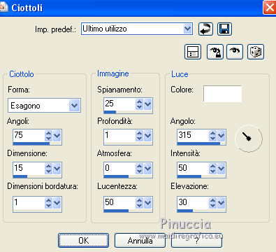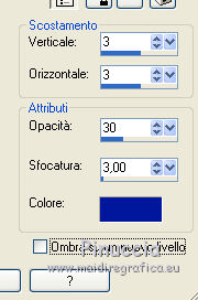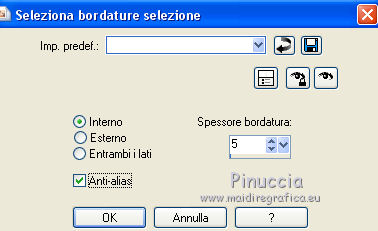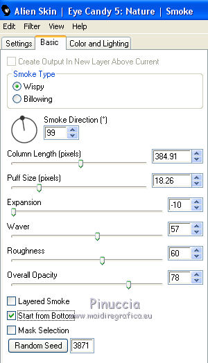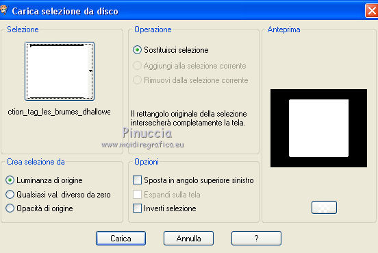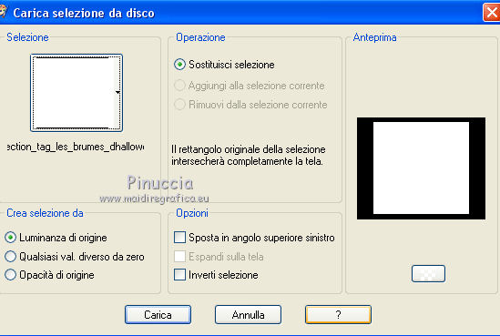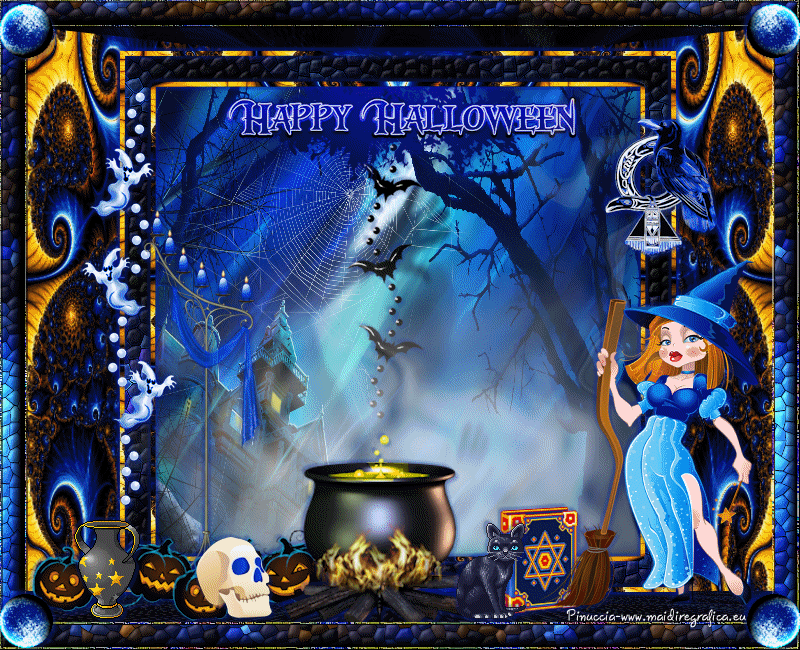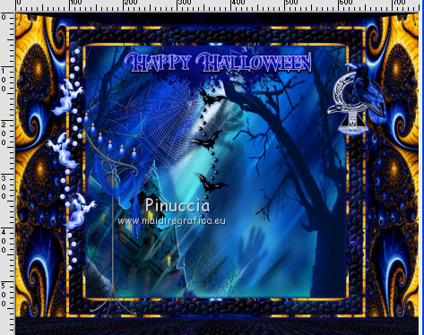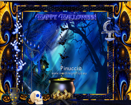 qui puoi trovare qualche risposta ai tuoi dubbi. Se l'argomento che ti interessa non è presente, ti prego di segnalarmelo. Questo tutorial è una creazione di ©Titoune e non può essere copiato su altri siti nè essere offerto per il download. Lo stesso vale per la mia traduzione. Il tutorial è stato creato con Corel17, ma può essere eseguito anche con le altre versioni di PSP. Secondo la versione utilizzata (anteriore a PSP X) potresti ottenere dei risultati differenti. Dalla versione X4, il comando Immagine>Rifletti è stato sostituito con Immagine>Capovolgi in orizzontale, e il comando Immagine>Capovolgi con Immagine>Capovolgi in verticale. Nelle versioni X5 e X6, le funzioni sono state migliorate rendendo disponibile il menu Oggetti. Con il nuovo X7 sono tornati i comandi Rifletti/Capovolgi, ma con nuove differenze. Vedi la scheda sull'argomento qui Per tradurre il tutorial ho usato PSP X. Occorrente: Un tube a scelta. Il resto del materiale qui Filtri in caso di dubbi, ricorda di consultare la mia sezione filtri qui Filters Unlimited 2.0 qui Simple - Top Left Mirror qui Alien Skin Eye Candy 5 Nature - Smoke qui Andromeda - Perspective qui I filtri Simple si possono usare da soli o importati in Filters Unlimited (come fare vedi qui) Se un filtro fornito appare con questa icona ![]() 1. Apri una nuova immagine trasparente 750 x 600 pixels. Selezione>Seleziona tutto. 2. Apri l'immagine "fractal_halloween", e vai a Modifica>Copia. Torna al tuo lavoro e vai a Modifica>Incolla nella selezione. Selezione>Deseleziona. 3. Livelli>Nuovo livello raster. Attiva lo strumento Selezione ![]() (non importa il tipo di selezione impostato, perchè con la selezione personalizzata si ottiene sempre un rettangolo) clicca sull'icona Selezione personalizzata ![]() e imposta i seguenti settaggi. ![]() 4. Livelli>Nuovo livello raster. Apri l'immagine "blue-fractals-swirls-pattern" e vai a Modifica>Copia. Torna al tuo lavoro e vai a Modifica>Incolla nella selezione. Selezione>Deseleziona. 5. Effetti>Plugins>Andromeda - Perspective. Clicca sull'icona Presets ![]() Imposta i seguenti settaggi e clicca sul segno di spunta in basso a destra per applicare ![]() Di nuovo clicca sul segno di spunta per chiudere. ![]() 6. Effetti>Effetti di riflesso>Specchio rotante. ![]() Rinomina questo livello "frattale". 7. Selezione>Carica/Salva selezione>Carica selezione da disco. Cerca e carica la selezione "selection_tag_les_brumes_dhalloween". ![]() 8. Selezione>Modifica>Seleziona bordature selezione. ![]() Attiva il livello inferiore. Selezione>Innalza selezione a livello. Livelli>Disponi>Porta in alto. 9. Effetti>Effetti di trama>Ciottoli. ![]() 10. Effetti>Effetti 3D>Smusso a incasso. ![]() Effetti>Effetti di bordo>Aumenta. Rinomina questo livello "cornice". 11. Selezione>Modifica>Seleziona bordature selezione. ![]() 12. Livelli>Nuovo livello raster. Apri l'immagine "blue-fractals-swirls-pattern", e vai a Modifica>Copia. Torna al tuo lavoro e vai a Modifica>Incolla nella selezione. Effetti>Plugins>Simple - Top Left Mirror. Rinomina questo livello "bordo". 13. Attiva il livello "frattale". Apri l'elemento floor, e vai a Modifica>Copia. Torna al tuo lavoro e vai a Modifica>Incolla come nuovo livello. Spostalo in basso.14. Attiva il livello "cornice". Attiva lo strumento Bacchetta magica ![]() e clicca all'interno della cornice per selezionarla. Selezione>Modifica>Espandi - 5 pixels. 15. Livelli>Nuovo livello raster. Livelli>Disponi>Sposta giù. Apri l'immagine "Halloween_Wallpapers31", e vai a Modifica>Copia. Torna al tuo lavoro e vai a Modifica>Incolla nella selezione. Selezione>Deseleziona. 16. Attiva il livello "cornice". Effetti>Effetti 3D>Sfalsa ombra, colore #01199d. ![]() Ripeti l'Effetto Sfalsa ombra cambiando verticale e orizzontale con -3. 17. Attiva il livello "bordo". Effetti>Effetti 3D>Sfalsa ombra, con i settaggi precedenti. 18. Apri l'elemento Wordart, e vai a Modifica>Copia. Torna al tuo lavoro e vai a Modifica>Incolla come nuovo livello. Spostalo nella parte superiore della cornice.Vedi l'esempio finale. Effetti>Effetti 3D>Sfalsa ombra, con i settaggi precedenti. Porta questo livello sotto il livello della cornice. 19. Apri l'elemento Bats, e vai a Modifica>Copia. Torna al tuo lavoro e vai a Modifica>Incolla come nuovo livello. Spostalo nel paesaggio, sotto il wordart.Vedi l'esempio finale. Effetti>Effetti 3D>Sfalsa ombra, con i settaggi precedenti. Porta questo livello sotto il livello del wordart. 20. Attiva il livello superiore. Apri l'elemento Raven_Spirit_LCT_10_07, e vai a Modifica>Copia. Torna al tuo lavoro e vai a Modifica>Incolla come nuovo livello. Spostalo nella parte superiore destra della cornice.Vedi l'esempio finale. Effetti>Effetti 3D>Sfalsa ombra, con i settaggi precedenti. 21. Apri l'elemento ghost, e vai a Modifica>Copia. Torna al tuo lavoro e vai a Modifica>Incolla come nuovo livello. Spostalo nella parte sinistra della cornice.Vedi l'esempio finale. Effetti>Effetti 3D>Sfalsa ombra, con i settaggi precedenti. 22. Apri l'elemento CandelabraW-3BellesGraphics, e vai a Modifica>Copia. Torna al tuo lavoro e vai a Modifica>Incolla come nuovo livello. Spostalo nella parte inferiore sinistra della cornice.![]() Effetti>Effetti 3D>Sfalsa ombra, con i settaggi precedenti. 23. Apri l'elemento 055eec4d, e vai a Modifica>Copia. Torna al tuo lavoro e vai a Modifica>Incolla come nuovo livello. Spostalo nella parte inferiore sinistra della cornice.Vedi l'esempio finale. Effetti>Effetti 3D>Sfalsa ombra, con i settaggi precedenti. 24. Apri l'elemento vase, e vai a Modifica>Copia. Torna al tuo lavoro e vai a Modifica>Incolla come nuovo livello. Spostalo nella parte inferiore della cornice.Vedi l'esempio finale. Effetti>Effetti 3D>Sfalsa ombra, con i settaggi precedenti. 25. Apri l'elemento skull, e vai a Modifica>Copia. Torna al tuo lavoro e vai a Modifica>Incolla come nuovo livello. Spostalo nella parte inferiore della cornice.Vedi l'esempio finale. Effetti>Effetti 3D>Sfalsa ombra, con i settaggi pre