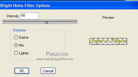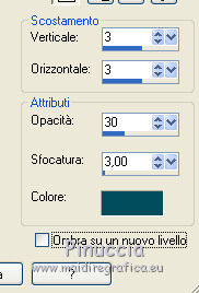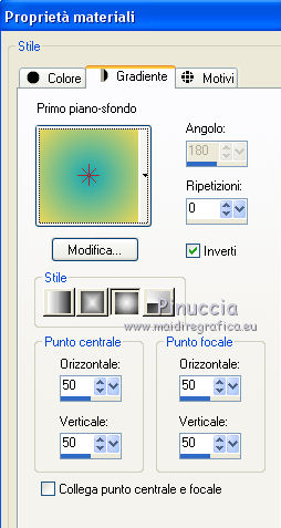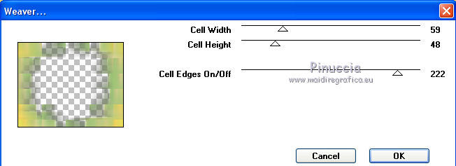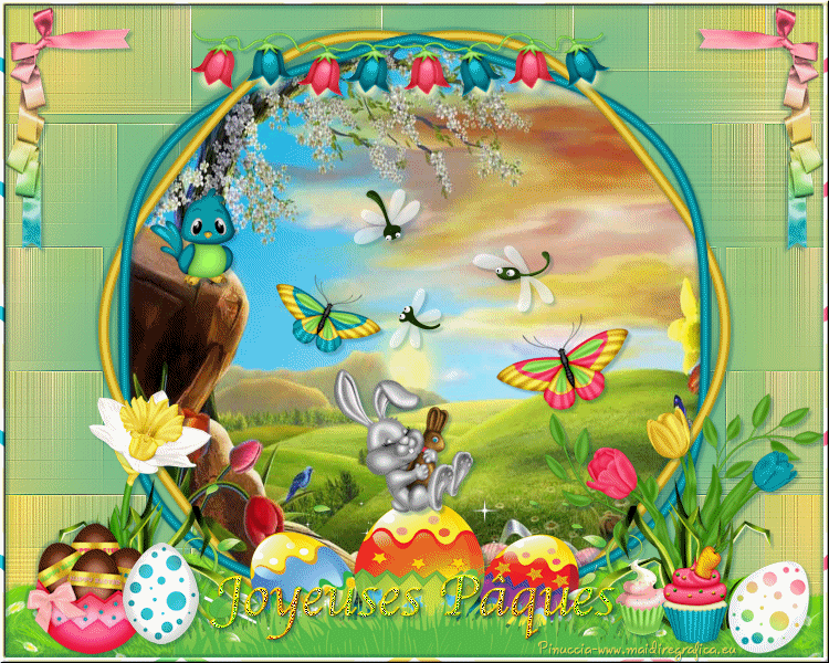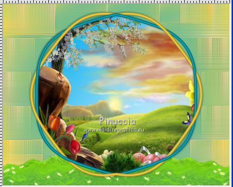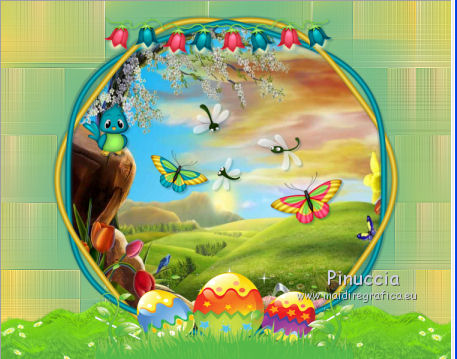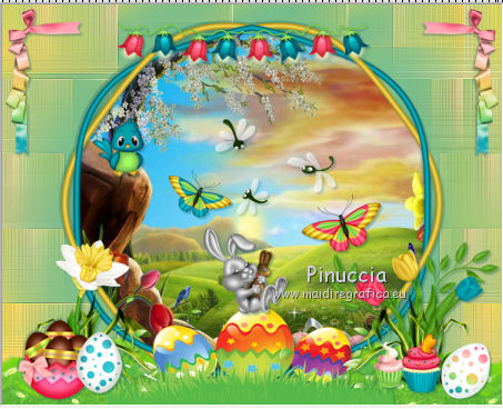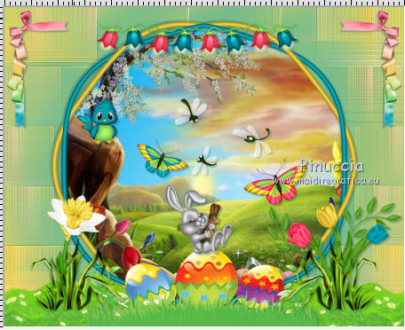 qui puoi trovare qualche risposta ai tuoi dubbi. Se l'argomento che ti interessa non è presente, ti prego di segnalarmelo. Questo tutorial è una creazione di ©Titoune e non può essere copiato su altri siti nè essere offerto per il download. Lo stesso vale per la mia traduzione. Il tutorial è stato creato con PSP X5, ma può essere eseguito anche con le altre versioni di PSP. Secondo la versione utilizzata (anteriore a PSP X) potresti ottenere dei risultati differenti. Dalla versione X4, il comando Immagine>Rifletti è stato sostituito con Immagine>Capovolgi in orizzontale, e il comando Immagine>Capovolgi con Immagine>Capovolgi in verticale. Nelle versioni X5 e X6, le funzioni sono state migliorate rendendo disponibile il menu Oggetti. Con il nuovo X7 sono tornati i comandi Rifletti/Capovolgi, ma con nuove differenze. Vedi la scheda sull'argomento qui Per tradurre il tutorial ho usato PSP X. Occorrente: Un tube a scelta. Il resto del materiale qui Filtri in caso di dubbi, ricorda di consultare la mia sezione filtri qui Filters Unlimited 2.0 qui Toadies - Weaver qui DSB Flux - Bright Noise qui I filtri Toadies si possono usare da soli o importati in Filters Unlimited (come fare vedi qui) Se un filtro fornito appare con questa icona Animation Shop qui ![]() Metti la selezione nella cartella Selezioni. 1. Imposta il colore di primo piano con #eed758 e il colore di sfondo con #12a8b5. Passa il colore di primo piano a Gradiente di primo piano/sfondo, stile Sprazzo di luce, ![]() Apri una nuova immagine trasparente 750 x 600 pixels, e riempila con il gradiente.2. Apri l'elemento MC_OS_Bunnies&Blooms_E23, e vai a Modifica>Copia. Torna al tuo lavoro e vai a Modifica>Incolla come nuovo livello. Non spostarlo. 3. Attiva lo strumento Bacchetta magica ![]() e clicca all'esterno della cornice per selezionarlo ![]() 4. Attiva il livello Raster 1. Selezione>Innalza selezione a livello. 5. Effetti>Effetti di trama>Plastica morbida. ![]() Selezione>Deseleziona. 6. Effetti>Plugins> Toadies, Weaver con i settaggi standard. ![]() 7. Attiva il livello della cornice. Clicca al centro della cornice per selezionarla con la bacchetta magica ![]() ![]() 8. Attiva il livello del filtro Toadies (selezione innalzata). Premi sulla tastiera il tasto CANC ![]() Selezione>Inverti. Effetti>Effetti di bordo>Aumenta. Di nuovo Selezione>Inverti. 9. Selezione>Modifica>Espandi - 3 pixels. Livelli>Nuovo livello raster. 10. Apri l'immagine free-easter-powerpoint-background-1, e vai a Modifica>Copia. Torna al tuo lavoro e vai a Modifica>Incolla nella selezione. Selezione>Deseleziona. 11. Attiva il livello della cornice. Effetti>Effetti 3D>Sfalsa ombra, colore #014c5d. ![]() Ripeti l'Effetto Sfalsa ombra, cambiando verticale e orizzontale con -3. 12. Apri l'elemento Grass, e vai a Modifica>Copia. Torna al tuo lavoro e vai a Modifica>Incolla come nuovo livello. Spostalo in basso.Effetti>Effetti 3D>Sfalsa ombra, colore #014c5d. ![]() Porta questo livello sotto il livello del paesaggio. ![]() 13. Attiva nuovamente il livello superiore. Apri l'elemento MC_OS_Bunnies&Blooms_E24, e vai a Modifica>Copia. Torna al tuo lavoro e vai a Modifica>Incolla come nuovo livello. Spostalo nella parte superiore della cornice.Vedi l'esempio finale. Effetti>Effetti 3D>Sfalsa ombra, con i settaggi precedenti. 14. Copia e incolla come nuovo livello gli elementi: MC_OS_Bunnies&Blooms_E03, MC_OS_Bunnies&Blooms_E04 et MC_OS_Bunnies&Blooms_E12. Posiziona gli elementi nel paeaggio.![]() Effetti>Effetti 3D>Sfalsa ombra, con i settaggi precedenti. 15. Apri l'elemento MC_OS_Bunnies&Blooms_E28, e vai a Modifica>Copia. Torna al tuo lavoro e vai a Modifica>Incolla come nuovo livello. Spostalo nella parte sinistra del paesaggio.Vedi l'esempio finale. Effetti>Effetti 3D>Sfalsa ombra, con i settaggi precedenti. 16. Apri l'elemento ob_3c4d3ds, e vai a Modifica>Copia. Torna al tuo lavoro e vai a Modifica>Incolla come nuovo livello. Spostalo in basso.![]() Effetti>Effetti 3D>Sfalsa ombra, con i settaggi precedenti. 17. Apri l'elemento MC_OS_Bunnies&Blooms_E27, e vai a Modifica>Copia. Torna al tuo lavoro e vai a Modifica>Incolla come nuovo livello. Spostalo in basso, sulle uova.Vedi l'esempio finale. Effetti>Effetti 3D>Sfalsa ombra, con i settaggi precedenti. 18. Apri l'elemento MC_OS_Bunnies&Blooms_E29, e vai a Modifica>Copia. Torna al tuo lavoro e vai a Modifica>Incolla come nuovo livello. Immagine>Ruota per gradi - 90 gradi a sinistra. ![]() Spostalo nella parte superiore sinistra della cornice.Vedi l'esempio finale. Effetti>Effetti 3D>Sfalsa ombra, con i settaggi precedenti. Livelli>Duplica. Immagine>Rifletti. 19. Apri l'elemento MC_OS_Bunnies&Blooms_E01, e vai a Modifica>Copia. Torna al tuo lavoro e vai a Modifica>Incolla come nuovo livello. Spostalo nella parte inferiore destra della cornice.Vedi l'esempio finale. Effetti>Effetti 3D>Sfalsa ombra, con i settaggi precedenti. 20. Apri l'elemento MC_OS_Bunnies&Blooms_E07, e vai a Modifica>Copia. Torna al tuo lavoro e vai a Modifica>Incolla come nuovo livello. Spostalo nella parte inferiore sinistra della cornice.Vedi l'esempio finale. Effetti>Effetti 3D>Sfalsa ombra, con i settaggi precedenti. 21. Apri l'elemento MC_OS_Bunnies&Blooms_E18, e vai a Modifica>Copia. Torna al tuo lavoro e vai a Modifica>Incolla come nuovo livello. Spostalo nella parte inferiore destra della cornice.Vedi l'esempio finale. Effetti>Effetti 3D>Sfalsa ombra, con i settaggi precedenti. Livelli>Duplica. Immagine>Rifletti. ![]() 22. Apri l'elemento MC_OS_Bunnies&Blooms_E17, e vai a Modifica>Copia. Torna al tuo lavoro e vai a Modifica>Incolla come nuovo livello. Spostalo nella parte inferiore destra della cornice.Vedi l'esempio finale. Effetti>Effetti 3D>Sfalsa ombra, con i settaggi precedenti. 23. Apri l'elemento MC_OS_Bunnies&Blooms_E14, e vai a Modifica>Copia. Torna al tuo lavoro e vai a Modifica>Incolla come nuovo livello. Spostalo nella parte inferiore destra della cornice.Vedi l'esempio finale. Effetti>Effetti 3D>Sfalsa ombra, con i setta