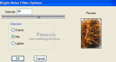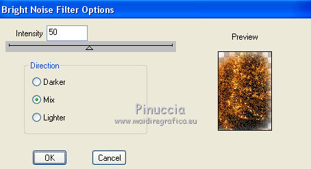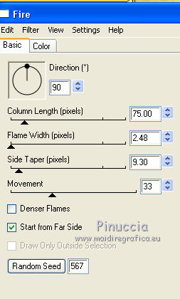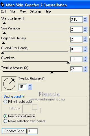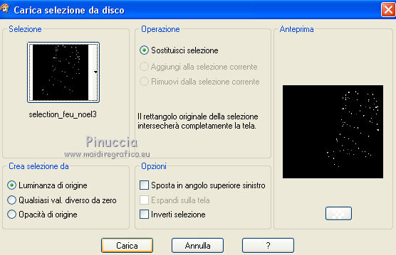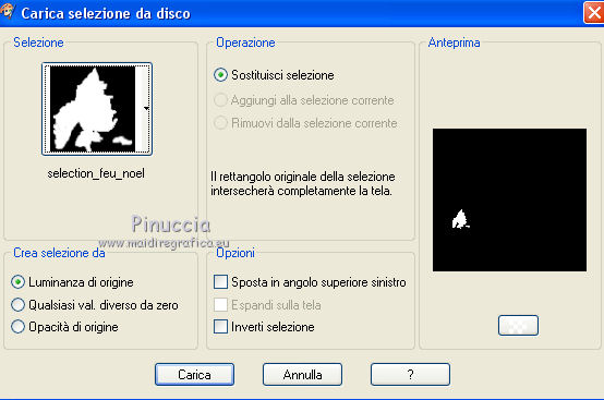 qui puoi trovare qualche risposta ai tuoi dubbi. Se l'argomento che ti interessa non è presente, ti prego di segnalarmelo. Per tradurre questo tutorial ho usato PSP X. Questo tutorial è una creazione di ©Titoune e non può essere copiato su altri siti nè essere offerto per il download. Lo stesso vale per la mia traduzione. Per tradurlo, ho usato PSP X, ma può essere eseguito anche con le altre versioni di PSP. Grazie ai creatori dei tubes che mettono a disposizione il loro lavoro in vari gruppi di condivisione. Rispetta il lavoro degli autori, non cambiare il nome del file e non cancellare il watermark. Occorrente: Materiale qui Filtri: DSB Flux - Bubbles qui Eye Candy 4000 - Fire qui Alien Skin Xenofex 2.0 - Burnt Edges qui Penta.com - Jeans qui Animation Shop qui ![]() Se stai usando le nuove versioni X14 X15 e X16 le funzioni Immagine>Rifletti/Capovolgi hanno cambiato denominazione e comportamento. Vedi la mia scheda sull'argomento qui Metti il gradiente nella cartella Gradienti. Metti le selezioni nella cartella Selezioni. 1. Imposta il colore di primo piano con #edee88, e il colore di sfondo con #c39c33. Passa il colore di primo piano a Gradiente di primo piano/sfondo, stile Sprazzo di luce. ![]() Apri una nuova immagine trasparente 750 x 650 pixels, e riempila con il gradiente.3. Effetti>Plugins>DSB Flux - Bubbles. ![]() Effetti>Effetti di bordo>Aumenta di più. 4. Livelli>Nuovo livello raster. Selezione>Seleziona tutto. 5. Apri il tube x-mas_tree-and_fireplace_Tbs. Immagine>Rifletti. Modifica>Copia. Torna al tuo lavoro e vai a Modifica>Incolla nella selezione. Selezione>Deseleziona. Livelli>Duplica. Livelli>Unisci>Unisci giù. Rinomina questo livello "fuoco". 6. Apri il tube Christmas_decor e vai a Modifica>Copia. Torna al tuo lavoro e vai a Modifica>Incolla come nuovo livello. 7. Immagine>Ridimensiona, al 30%, tutti i livelli non selezionato. Regola>Messa a fuoco>Metti a fuoco. Spostalo in alto a sinistra.8. Effetti>Effetti 3D>Sfalsa ombra, colore #4b2912. ![]() 9. Apri il tube kTs_XmasCollection e vai a Modifica>Copia. Torna al tuo lavoro e vai a Modifica>Incolla come nuovo livello. 10. Immagine>Ridimensiona, al 55%, tutti i livelli non selezionato. Regola>Messa a fuoco>Metti a fuoco. Spostalo in basso a sinistra.11. Effetti>Effetti 3D>Sfalsa ombra, con i settaggi precedenti. Livelli>Unisci>Unisci giù. Rinomina questo livello "palline". 12. Apri il tube Scarlett_GoldSexy e vai a Modifica>Copia. Torna al tuo lavoro e vai a Modifica>Incolla come nuovo livello. 13. Immagine>Ridimensiona, al 70%, tutti i livelli non selezionato. Regola>Messa a fuoco>Metti a fuoco. Spostalo a destra.14. Effetti>Effetti 3D>Sfalsa ombra, con i settaggi precedenti. 15. Attiva il livello Raster 1. Modifica>Copia. Selezione>Seleziona tutto. Immagine>Ritaglia la selezione. 16. Selezione>Seleziona tutto. Immagine>Dimensioni tela - 750 x 700. ![]() 17. Livelli>Nuovo livello raster. Livelli>Disponi>Porta in alto. 18. Selezione>Modifica>Seleziona bordature selezione. ![]() 19. Cambia i settaggi del gradiente: seleziona il gradiente mqc-Ribbon, stile Sprazzo di luce. ![]() Riempi la selezione con questo gradiente.20. Effetti>Plugins>Penta.com - Jeans, con i settaggi standard. ![]() 21. Effetti>Effetti 3D>Smusso a incasso. ![]() Selezione>Deseleziona. 22. Livelli>Nuovo livello raster. Livelli>Disponi>Porta sotto. Selezione>Seleziona tutto. Modifica>Incolla nella selezione. Selezione>Deseleziona. 23. Livelli>Nuovo livello raster. Livelli>Disponi>Porta in alto. Selezione>Seleziona tutto. Selezione>Modifica>Contrai - 4 pixels. Selezione>Inverti. 24. Riempi con il gradiente mqc-Ribbon.25. Effetti>Plugins>Penta.com - Jeans, con i settaggi standard. 26. Effetti>Effetti 3D>Smusso a incasso, con i settaggi precedenti. Selezione>Deseleziona. 27. Assicurati che i due bordi siano posizionati in cima alla paletyta dei livelli. Attiva il livello superiore. Livelli>Unisci>Unisci giù. 28. Effetti>Effetti 3D>Sfalsa ombra, con i settaggi precedenti. 29. Firma il tuo lavoro. 30. Attiva il livello "fuoco". 31. Selezione>Carica/Salva selezione>Carica selezione da disco. Cerca e carica la selezione "selection_feu_noel". ![]() 32. Effetti>Plugins>Eye Candy 4000 - Fire. ![]() Selezione>Deseleziona. 33. Attiva il livello "palline". Effetti>Plugins>Alien Skin Xenofex 2.0 - Constellation. ![]() Modifica>Copia Unione. Apri Animation Shop e vai a Modifica>Incolla>Incolla come nuova animazione. 34. Torna in PSP. Annulla gli ultimi quattro passaggi: Modifica>Annulla azione Constellation. Modifica>Annulla azione>Seleziona livello. Modifica>Annulla azione Deseleziona. Modifica>Annulla azione Fire. più velocemente, puoi cliccare quattro volte sull'icona Annulla ultimo comando, sulla barra superiore degli strumenti. ![]() E sei di nuovo posizionato sul livello "fuoco" con la selezione attiva. 35. Effetti>Plugins>Eye Candy 4000 - Fire, clicca su Random Seed e ok. Selezione>Deseleziona. Rimani sul livello "fuoco". 36. Selezione>Carica/Salva selezione>Carica selezione da disco. Cerca e carica la selezione "selection_feu_noel3". ![]() 37. Effetti>Plugins>DSB Flux - Bright Noise. ![]() Effetti>Effetti di bordo>Aumenta. Selezione>Deseleziona. 38. Attiva il livello "palline". Effetti>Plugins>Alien Skin Xenofex 2.0 - Constellation, clicca su Random Seed e ok. Modifica>Copia Unione. Torna in Animation Shop e vai a Modifica>Incolla>Incolla dopo il fotogramma corrente. 39. Di nuovo in PSP. Annulla gli ultimi 8 passaggi, finchè non sarai nuovamente posizionato sul livello "fuoco" con la selezione attiva. 40. Effetti>Plugins>Eye Candy 4000 - Fire, clicca su Random Seed e ok. Selezione>Deseleziona. Sempre sul livello "fuoco". 41. Selezione>Carica/Salva selezione>Carica selezione da disco. Carica nuovamente la selezione "selection_feu_noel3. 42. Effetti>Plugins>DSB Flux - Bright Noise - intensity 60. ![]() Effetti>Effetti di bordo>Aumenta. Selezione>Deseleziona. 43. Attiva il livello "boules". Effetti>Plugins>Alien Skin Xenofex 2.0 - Constellation, cl