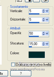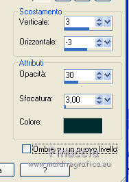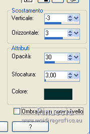 qui puoi trovare qualche risposta ai tuoi dubbi. Se l'argomento che ti interessa non è presente, ti prego di segnalarmelo. Questo tutorial è una creazione di ©Titoune e non può essere copiato su altri siti nè essere offerto per il download. Lo stesso vale per la mia traduzione. Il tutorial è stato creato con PSP X5, ma può essere eseguito anche con le altre versioni di PSP. Secondo la versione utilizzata (anteriore a PSP X) potresti ottenere dei risultati differenti. Dalla versione X4, il comando Immagine>Rifletti è stato sostituito con Immagine>Capovolgi in orizzontale, e il comando Immagine>Capovolgi con Immagine>Capovolgi in verticale. Nelle versioni X5 e X6, le funzioni sono state migliorate rendendo disponibile il menu Oggetti. Vedi la scheda sull'argomento qui Per tradure il tutorial ho usato PSP X. Un tube a scelta. Il resto del materiale qui ![]() 1. Apri una nuova immagine trasparente 650 x 650 pixels. 2. Selezione>Seleziona tutto. Apri l'elemento paper 5 e vai a Modifica>Copia. Torna al tuo lavoro e vai a Modifica>Incolla nella selezione. Selezione>Deseleziona. 3. Apri l'elemento frame 1 e vai a Modifica>Copia. Torna al tuo lavoro e vai a Modifica>Incolla come nuovo livello. Spostalo un po' più in alto.Vedi l'esempio finale. 4. Attiva lo strumento Bacchetta magica ![]() e clicca al centro della cornice per selezionarla. Selezione>Modifica>Espandi - 3 pixels. Livelli>Nuovo livello raster. Livelli>Disponi>Sposta giù. 5. Apri l'elemento paper 4 e vai a Modifica>Copia. Torna al tuo lavoro e vai a Modifica>Incolla nella selezione. Selezione>Deseleziona. 6. Attiva il livello della cornice. Effetti>Effetti 3D>Sfalsa ombra - colore #012d2e. ![]() Ripeti l'Effetto Sfalsa ombra, cambiando verticale e orizzontale con -3/3. ![]() 7. Apri l'elemento "element 14" e vai a Modifica>Copia. Torna al tuo lavoro e vai a Modifica>Incolla come nuovo livello. Spostalo nella cornice.Vedi l'esempio finale. Effetti>Effetti 3D>Sfalsa ombra, colore #012d2e. ![]() Porta questo livello sotto il livello della cornice. Livelli>Duplica, e sposta un po' più in basso e a destra.![]() 9. Attiva nuovamente il livello superiore. Apri l'elemento "element 18" e vai a Modifica>Copia. Torna al tuo lavoro e vai a Modifica>Incolla come nuovo livello. Spostalo nella parte superiore della cornice.Vedi l'esempio finale. Effetti>Effetti 3D>Sfalsa ombra, con i settaggi precedenti. 10. Apri l'elemento "element 10" e vai a Modifica>Copia. Torna al tuo lavoro e vai a Modifica>Incolla come nuovo livello. Spostalo nella parte superiore destra della cornice.![]() Effetti>Effetti 3D>Sfalsa ombra, con i settaggi precedenti. 11. Apri l'elemento "element 15" e vai a Modifica>Copia. Torna al tuo lavoro e vai a Modifica>Incolla come nuovo livello. Spostalo a destra dell'elemento precedente.![]() Effetti>Effetti 3D>Sfalsa ombra, con i settaggi precedenti. 12. Apri l'elemento "element 16" e vai a Modifica>Copia. Torna al tuo lavoro e vai a Modifica>Incolla come nuovo livello. Spostalo nella parte destra della cornice.Vedi l'esempio finale. Effetti>Effetti 3D>Sfalsa ombra, con i settaggi precedenti. 13. Apri l'elemento "element 8" e vai a Modifica>Copia. Torna al tuo lavoro e vai a Modifica>Incolla come nuovo livello. Spostalo nella parte inferiore della cornice.Vedi l'esempio finale. Effetti>Effetti 3D>Sfalsa ombra, con i settaggi precedenti. Livelli>Duplica. Immagine>Rifletti. 14. Apri l'elemento "MOAL Cluster 2", e vai a Modifica>Copia. Torna al tuo lavoro e vai a Modifica>Incolla come nuovo livello. Spostalo in basso a destra.![]() Effetti>Effetti 3D>Sfalsa ombra, con i settaggi precedenti. Apri l'elemento "element 9", e vai a Modifica>Copia. Torna al tuo lavoro e vai a Modifica>Incolla come nuovo livello. Spostalo sopra l'elemento precedente.Vedi l'esempio finale. Effetti>Effetti 3D>Sfalsa ombra, con i settaggi precedenti. 15. Apri l'elemento "element 11", e vai a Modifica>Copia. Torna al tuo lavoro e vai a Modifica>Incolla come nuovo livello. Spostalo nella parte inferiore destra della cornice.Vedi l'esempio finale. Effetti>Effetti 3D>Sfalsa ombra, con i settaggi precedenti. 16. Apri l'elemento "element 12", e vai a Modifica>Copia. Torna al tuo lavoro e vai a Modifica>Incolla come nuovo livello. Spostalo nella parte inferiore della cornice.Vedi l'esempio finale. Effetti>Effetti 3D>Sfalsa ombra, con i settaggi precedenti. 17. Apri l'elemento "element 19", e vai a Modifica>Copia. Torna al tuo lavoro e vai a Modifica>Incolla come nuovo livello. Spostalo in basso, accanto all'elemento precedente.![]() Vedi l'esempio finale. Effetti>Effetti 3D>Sfalsa ombra, con i settaggi precedenti. 18. Apri l'elemento "element 1", e vai a Modifica>Copia. Torna al tuo lavoro e vai a Modifica>Incolla come nuovo livello. Sposta l'elemento nella parte inferiore sinistra della cornice.Vedi l'esempio finale. Effetti>Effetti 3D>Sfalsa ombra, con i settaggi precedenti. 19. Apri l'elemento "element 3", e vai a Modifica>Copia. Torna al tuo lavoro e vai a Modifica>Incolla come nuovo livello. Spostalo nella parte inferiore della cornice.Vedi l'esempio finale. Effetti>Effetti 3D>Sfalsa ombra, con i settaggi precedenti. 20. Apri l'elemento "element 6", e vai a Modifica>Copia. Torna al tuo lavoro e vai a Modifica>Incolla come nuovo livello. Spostalo nella parte inferiore della cornice.![]() Effetti>Effetti 3D>Sfalsa ombra, con i settaggi precedenti. 21. Apri l'elemento "wordart_charmed", e vai a Modifica>Copia. Torna al tuo lavoro e vai a Modifica>Incolla come nuovo livello. Spostalo nella parte superiore della cornice.![]() Effetti>Effetti 3D>Sfalsa ombra, con i settaggi precedenti. 22. Apri il tuo tube e vai a Modifica>Copia. Torna al tuo lavoro e vai a Modifica>Incolla come nuovo livello. Immagine>Ridimensiona, se e quanto necessario, tutti i livelli non selezionato. Spostalo dove preferisci,o vedi il mio esempio. Porta il livello sotto il livello della cornice. Livelli>Duplica. Livelli>Disponi>Porta in alto. Attiva lo strumento Gomma ![]() e cancella la 