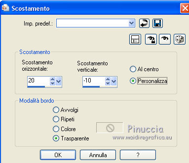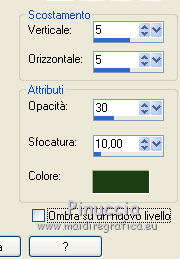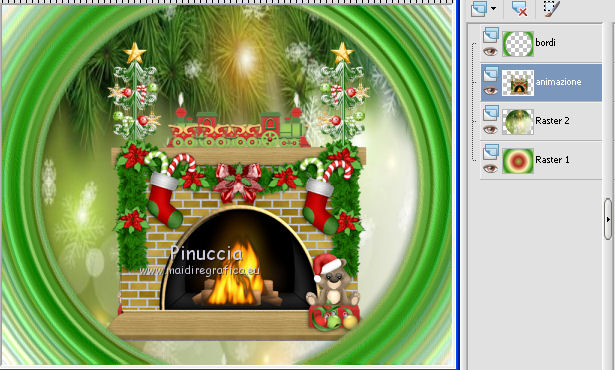 qui puoi trovare qualche risposta ai tuoi dubbi. Se l'argomento che ti interessa non è presente, ti prego di segnalarmelo. Questo tutorial è una creazione di ©Titoune e non può essere copiato su altri siti nè essere offerto per il download. Lo stesso vale per la mia traduzione. Il tutorial è stato creato con PSP X5, ma può essere eseguito anche con le altre versioni di PSP. Secondo la versione utilizzata (anteriore a PSP X) potresti ottenere dei risultati differenti. Dalla versione X4, il comando Immagine>Rifletti è stato sostituito con Immagine>Capovolgi in orizzontale, e il comando Immagine>Capovolgi con Immagine>Capovolgi in verticale. Nelle versioni X5 e X6, le funzioni sono state migliorate rendendo disponibile il menu Oggetti. Con il nuovo X7 sono tornati i comandi Rifletti/Capovolgi, ma con nuove differenze. Vedi la scheda sull'argomento qui Per tradure il tutorial ho usato PSP X. Occorrente: Un tube a scelta. Il resto del materiale qui Il tube utilizzato è di Danimage Filtri in caso di dubbi, ricorda di consultare la mia sezione filtri qui Penta.com - Jeans qui Eye Candy 4000 - Fire qui Animation Shop qui ![]() Metti il gradiente nella cartella Gradienti. Metti le selezioni nella cartella Selezioni. 1. Passa il colore di primo piano a Gradiente e seleziona il gradiente "christmas joy", stile Sprazzo di luce. ![]() 2. Apri una nuova immagine trasparente 750 x 600 pixels, e riempila con il gradiente.3. Selezione>Carica/Salva selezione>Carica selezione da disco. Cerca e carica la selezione "selection_scrap_christmas_enjoy". ![]() Selezione>Innalza selezione a livello. 4. Effetti>Effetti di trama>Plastica morbida. ![]() Rinomina questo livello "bordi". Selezione>Inverti. Selezione>Modifica>Espandi - 5 pixels. 5. Livelli>Nuovo livello raster. Livelli>Disponi>Sposta giù. Apri l'elemento 1608717-bigthumbnail e vai a Modifica>Copia. Torna al tuo lavoro e vai a Modifica>Incolla nella selezione. Selezione>Deseleziona. 6. Attiva il livello "bordi". Effetti>Effetti 3D>Sfalsa ombra, colore #1c3f12. ![]() Ripeti l'Effetto Sfalsa ombra, cambiando verticale e orizzontale con -5. 7. Apri l'elemento "element 39", e vai a Modifica>Copia. Torna al tuo lavoro e vai a Modifica>Incolla come nuovo livello. 8. Effetti>Effetti di immagine>Scostamento. ![]() Porta questo livello sotto il livello "bordi", e rinomina il livello "animazione". ![]() 9. Attiva il livello superiore. Apri l'elemento 0_9fcd6_d51e71f6_L, e vai a Modifica>Copia. Torna al tuo lavoro e vai a Modifica>Incolla come nuovo livello. Spostalo in alto a sinistra.Vedi l'esempio finale. Effetti>Effetti 3D>Sfalsa ombra, con i settaggi precedenti. 10. Apri l'elemento "element 21", e vai a Modifica>Copia. Torna al tuo lavoro e vai a Modifica>Incolla come nuovo livello. Spostalo a sinistra, sul bordo della cornice.![]() Effetti>Effetti 3D>Sfalsa ombra, con i settaggi precedenti. 11. Apri l'elemento "element 28", e vai a Modifica>Copia. Torna al tuo lavoro e vai a Modifica>Incolla come nuovo livello. Spostalo in alto al centro.Vedi l'esempio finale. Effetti>Effetti 3D>Sfalsa ombra, con i settaggi precedenti. 12. Apri l'elemento 0_9fcd8_b4271597_L, e vai a Modifica>Copia. Torna al tuo lavoro e vai a Modifica>Incolla come nuovo livello. Spostalo nell'angolo in alto a destra.Vedi l'esempio finale. Effetti>Effetti 3D>Sfalsa ombra, con i settaggi precedenti. 13. Apri l'elemento "259", e vai a Modifica>Copia. Torna al tuo lavoro e vai a Modifica>Incolla come nuovo livello. Spostalo in basso a destra.![]() Effetti>Effetti 3D>Sfalsa ombra, con i settaggi precedenti. 14. Apri l'elemento "element 34", e vai a Modifica>Copia. Torna al tuo lavoro e vai a Modifica>Incolla come nuovo livello. Spostalo a destra.Vedi l'esempio finale. Effetti>Effetti 3D>Sfalsa ombra, con i settaggi precedenti. 15. Apri l'elemento "element 30", e vai a Modifica>Copia. Torna al tuo lavoro e vai a Modifica>Incolla come nuovo livello. Spostalo in basso a destra.![]() Effetti>Effetti 3D>Sfalsa ombra, con i settaggi precedenti. 16. Apri l'elemento "element 12", e vai a Modifica>Copia. Torna al tuo lavoro e vai a Modifica>Incolla come nuovo livello. Spostalo a sinistra.Vedi l'esempio finale. Effetti>Effetti 3D>Sfalsa ombra, con i settaggi precedenti. 17. Apri l'elemento "element "35", e vai a Modifica>Copia. Torna al tuo lavoro e vai a Modifica>Incolla come nuovo livello. Spostalo in basso a sinistra.Vedi l'esempio finale. Effetti>Effetti 3D>Sfalsa ombra, con i settaggi precedenti. 18. Apri l'elemento "elemento 49", e vai a Modifica>Copia. Torna al tuo lavoro e vai a Modifica>Incolla come nuovo livello. Spostalo in basso a sinistra.Vedi l'esempio finale. Effetti>Effetti 3D>Sfalsa ombra, con i settaggi precedenti. 19. Apri l'elemento "element 50", e vai a Modifica>Copia. Torna al tuo lavoro e vai a Modifica>Incolla come nuovo livello. Spostalo in basso a sinistra.Vedi l'esempio finale. Effetti>Effetti 3D>Sfalsa ombra, con i settaggi precedenti. 20. Apri l'elemento "element "11", e vai a Modifica>Copia. Torna al tuo lavoro e vai a Modifica>Incolla come nuovo livello. Spostalo in basso a sinistra.![]() Effetti>Effetti 3D>Sfalsa ombra, con i settaggi precedenti. 21. Apri il tuo tube, e vai a Modifica>Copia. Torna al tuo lavoro e vai a Modifica>Incolla come nuovo livello. Immagine>Ridimensiona, se e quanto necessario, tutti i livelli non selezionato. Spostalo dove preferisci o vedi il mio esempio.Effetti>Effetti 3D>Sfalsa ombra, con i settaggi precedenti. 22. Attiva il livello Raster 1. Livelli>Duplica. Livelli>Disponi>Porta in alto. Effetti>Effetti di trama>Plastica morbida, con i settaggi precedenti. 23. Selezione>Seleziona tutto. Selezione>Modifica>Contrai - 3 pixels. Premi sulla tastiera il tasto CANC ![]() Selezione>Inverti. Effetti>Plugins>Penta.com - Jeans, con i settaggi standard. ![]() Effetti>Effetti di bordo>Aumenta. Selezione>Deseleziona. Effetti>Effetti 3D>Sfalsa ombra, con i settaggi precedenti. Firma il tuo lavoro. 24. Animazione. Attiva il livello "animazione". Livel