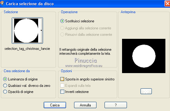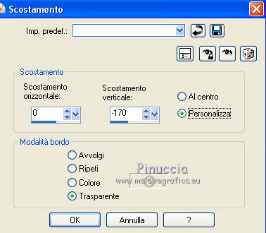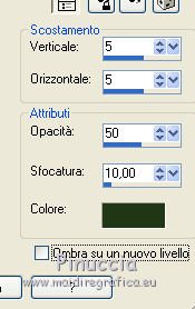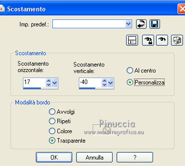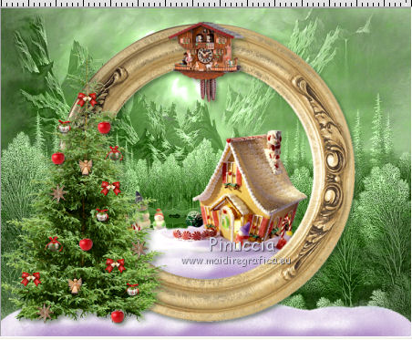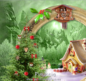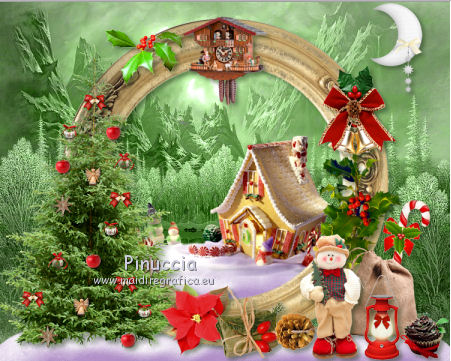 qui puoi trovare qualche risposta ai tuoi dubbi. Se l'argomento che ti interessa non è presente, ti prego di segnalarmelo. Questo tutorial è una creazione di ©Titoune e non può essere copiato su altri siti nè essere offerto per il download. Lo stesso vale per la mia traduzione. Il tutorial è stato creato con PSP X5, ma può essere eseguito anche con le altre versioni di PSP. Secondo la versione utilizzata (anteriore a PSP X) potresti ottenere dei risultati differenti. Vedi la mia scheda riguardante le funzioni Rifletti>Capovolgi in X4 e X5 qui Per tradure il tutorial ho usato PSP X. Occorrente: Un tube a scelta. Il resto del materiale qui Il tube utilizzato è di Gabry. Filtri in caso di dubbi, ricorda di consultare la mia sezione filtri qui Penta.com - Jeans qui Filters Unlimited 2.0 qui I filtri Penta.com si possono usare da soli o importati in Filters Unlimited (come fare vedi qui) Se un filtro fornito appare con questa icona Animation Shop qui ![]() Metti la selezione nella cartella Selezioni. 1. Apri una nuova immagine trasparente 750 x 600 pixels. Selezione>Seleziona tutto. 2. Apri l'elemento paper17 e vai a Modifica>Copia. Torna al tuo lavoro e vai a Modifica>Incolla nella selezione. 3. Livelli>Nuovo livello raster. Apri l'immagine OTB-JRA0000069_1 e vai a Modifica>Copia. Torna al tuo lavoro e vai a Modifica>Incolla nella selezione. Cambia la modalità di miscelatura di questo livello in Luminanza (Esistente). Selezione>Deseleziona. 4. Apri l'elemento frame1 e vai a Modifica>Copia. Torna al tuo lavoro e vai a Modifica>Incolla come nuovo livello. Non spostarlo. 5. Attiva lo strumento Bacchetta magica ![]() e clicca al centro della cornice per selezionarla. Selezione>Modifica>Espandi - 5 pixels. ![]() Livelli>Nuovo livello raster. Livelli>Disponi>Sposta giù. 6. Attiva nuovamente l'immagine OTB-JRA0000069_1 e vai a Modifica>Copia. Torna al tuo lavoro e vai a Modifica>Incolla nella selezione. Selezione>Deseleziona. Cambia la modalità di miscelatura di questo livello in Luminanza (esistente). 7. Attiva il livello della cornice. Effetti>Effetti 3D>Sfalsa ombra, colore #213717. ![]() Apri l'elemento snow e vai a Modifica>Copia. Torna al tuo lavoro e vai a Modifica>Incolla come nuovo livello. Spostalo in basso, sul bordo.Vedi l'esempio finale. Porta questo livello sotto il livello della cornice. 8. Apri l'elemento snow_inside e vai a Modifica>Copia. Torna al tuo lavoro e vai a Modifica>Incolla come nuovo livello. 9. Effetti>Effetti di immagine>Scostamento. ![]() 10. Apri l'elemento candy house e vai a Modifica>Copia. Torna al tuo lavoro e vai a Modifica>Incolla come nuovo livello. 11. Effetti>Effetti di immagine>Scostamento. ![]() 12. Attiva nuovamente il livello superiore della cornice. Apri l'elemento cuckoo house e vai a Modifica>Copia. Torna al tuo lavoro e vai a Modifica>Incolla come nuovo livello. Spostalo in alto, sul bordo della cornice.Vedi l'esempio finale. Effetti>Effetti 3D>Sfalsa ombra, con i settaggi precedenti. 13. Apri l'elemento noel tree e vai a Modifica>Copia. Torna al tuo lavoro e vai a Modifica>Incolla come nuovo livello. Spostalo a sinistra.![]() Effetti>Effetti 3D>Sfalsa ombra, con i settaggi precedenti. 14. Apri l'elemento holly1 e vai a Modifica>Copia. Torna al tuo lavoro e vai a Modifica>Incolla come nuovo livello. Spostalo in alto, nella parte inferiore della cornice.Vedi l'esempio finale. Effetti>Effetti 3D>Sfalsa ombra, con i settaggi precedenti. 15. Apri l'elemento gift box e vai a Modifica>Copia. Torna al tuo lavoro e vai a Modifica>Incolla come nuovo livello. Sposta anche questo elemento sotto la cornice.Vedi l'esempio finale. Effetti>Effetti 3D>Sfalsa ombra, con i settaggi precedenti. 16. Apri l'elemento cone e vai a Modifica>Copia. Torna al tuo lavoro e vai a Modifica>Incolla come nuovo livello. Spostalo in basso a destra.Vedi l'esempio finale. Effetti>Effetti 3D>Sfalsa ombra, con i settaggi precedenti. 17. Apri l'elemento sack e vai a Modifica>Copia. Torna al tuo lavoro e vai a Modifica>Incolla come nuovo livello. Spostalo in basso a destra.![]() Effetti>Effetti 3D>Sfalsa ombra, con i settaggi precedenti. 18. Apri l'elemento christmas element e vai a Modifica>Copia. Torna al tuo lavoro e vai a Modifica>Incolla come nuovo livello. Sposta anche questo elemento in basso a destra.Vedi l'esempio finale. Effetti>Effetti 3D>Sfalsa ombra, con i settaggi precedenti. Porta questo livello sotto il livello del sacco. 19. Apri l'elemento holly2 e vai a Modifica>Copia. Torna al tuo lavoro e vai a Modifica>Incolla come nuovo livello. Spostalo in basso a destra.Vedi l'esempio finale. Effetti>Effetti 3D>Sfalsa ombra, con i settaggi precedenti. Lascia anche questo livello sotto il livello del sacco. 20. Attiva il livello superiore. Apri l'elemento snowman e vai a Modifica>Copia. Torna al tuo lavoro e vai a Modifica>Incolla come nuovo livello. Spostalo in basso a destra.Vedi l'esempio finale. Effetti>Effetti 3D>Sfalsa ombra, con i settaggi precedenti. 21. Apri l'elemento lamp e vai a Modifica>Copia. Torna al tuo lavoro e vai a Modifica>Incolla come nuovo livello. Spostalo accanto al pupazzo di neve.![]() Effetti>Effetti 3D>Sfalsa ombra, con i settaggi precedenti. 22. Apri l'elemento christmas cake e vai a Modifica>Copia. Torna al tuo lavoro e vai a Modifica>Incolla come nuovo livello. Spostalo nell'angolo in basso a destra.Vedi l'esempio finale. Effetti>Effetti 3D>Sfalsa ombra, con i settaggi precedenti. 23. Apri l'elemento bells e vai a Modifica>Copia. Torna al tuo lavoro e vai a Modifica>Incolla come nuovo livello. Spostalo in alto a destra.Vedi l'esempio finale. Effetti>Effetti 3D>Sfalsa ombra, con i settaggi precedenti. 24. Apri l'elemento holly 3 e vai a Modifica>Copia. Torna al tuo lavoro e vai a Modifica>Incolla come nuovo livello. Spostalo sulla cornice, in alto a sinistra.![]() Effetti>Effetti 3D>Sfalsa ombra, con i settaggi precedenti. 25. halfmoon with stars e vai a Modifica>Copia. Torna al tuo lavoro e vai a Modifica>Incolla come nuovo livello. Spostalo