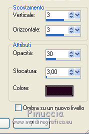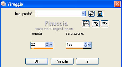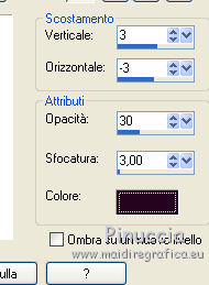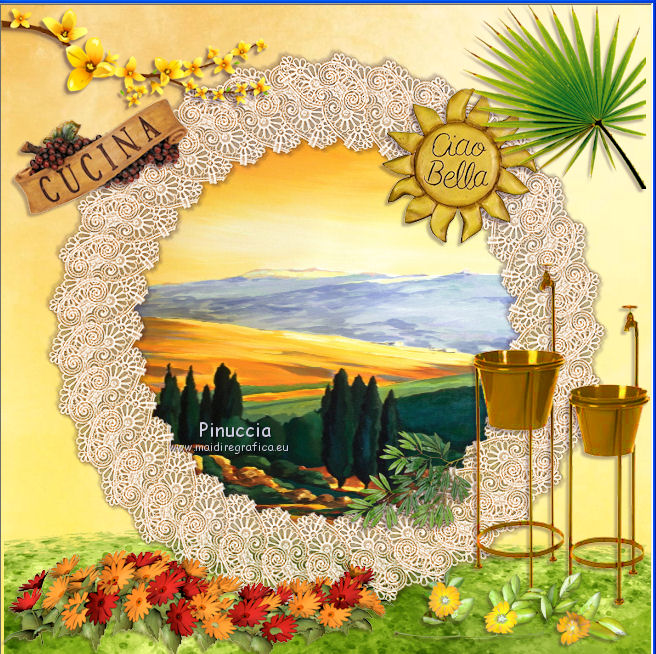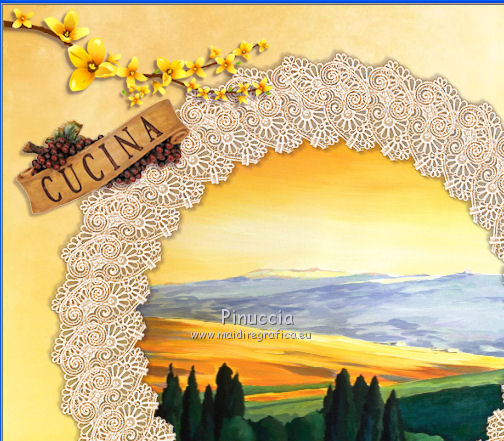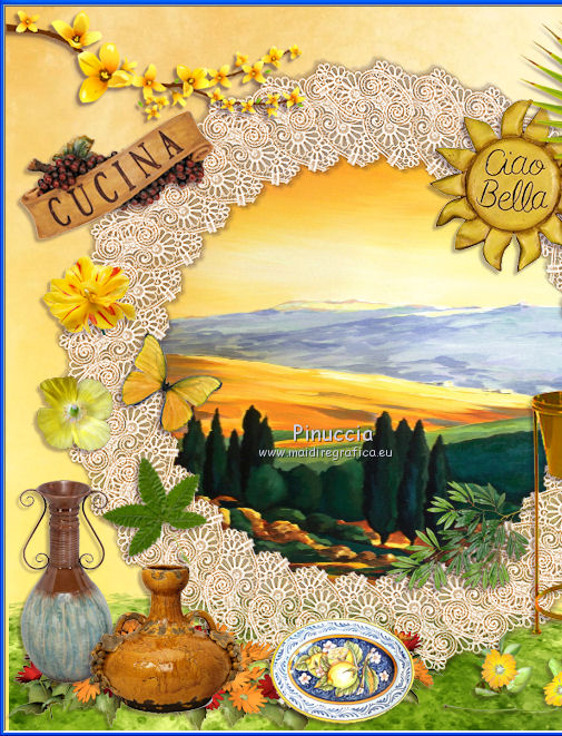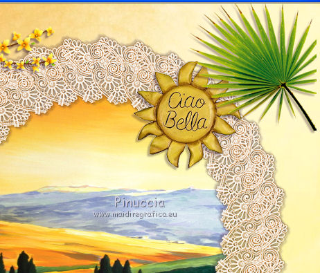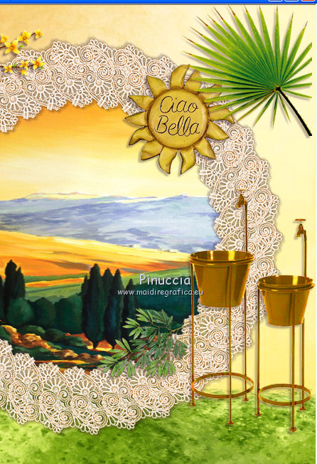 qui puoi trovare qualche risposta ai tuoi dubbi. Se l'argomento che ti interessa non è presente, ti prego di segnalarmelo. Questo tutorial è una creazione di ©Titoune e non può essere copiato su altri siti nè essere offerto per il download. Lo stesso vale per la mia traduzione. Il tutorial è stato creato con PSP X5, ma può essere eseguito anche con le altre versioni di PSP. Secondo la versione utilizzata (anteriore a PSP X) potresti ottenere dei risultati differenti. Vedi la mia scheda riguardante le funzioni Rifletti>Capovolgi in X4 e X5 qui Per tradure il tutorial ho usato PSP X. Occorrente: Un tube a scelta. Il resto del materiale qui Il tube utilizzato è di Radyga ![]() 1. Apri una nuova immagine trasparente 650 x 650 pixels. Selezione>Seleziona tutto. 2. Apri l'elemento paper 10 e vai a Modifica>Copia. Torna al tuo lavoro e vai a Modifica>Incolla nella selezione. Selezione>Deseleziona. 3. Apri l'elemento grass e vai a Modifica>Copia. Torna al tuo lavoro e vai a Modifica>Incolla come nuovo livello. Spostalo in basso.Vedi l'esempio finale. 4. Apri l'elemento "lacefrm" e vai a Modifica>Copia. Torna al tuo lavoro e vai a Modifica>Incolla come nuovo livello. 5. Immagine>Ridimensiona, all'85%, tutti i livelli non selezionato. Regola>Messa a fuoco>Metti a fuoco. 6. Regola>Tonalità e saturazione>Viraggio. ![]() Non spostarlo. 7. Attiva lo strumento Bacchetta magica ![]() e clicca al centro della cornice per selezionarla. Selezione>Modifica>Espandi - 3 pixels. ![]() Livelli>Nuovo livello raster. Livelli>Disponi>Sposta giù. 8. Apri l'immagine fornita e vai a Modifica>Copia. Torna al tuo lavoro e vai a Modifica>Incolla nella selezione. Selezione>Deseleziona. Attiva il livello della cornice. 9. Effetti>Effetti 3D>Sfalsa ombra, colore #260420. ![]() Ripeti l'Effetto Sfalsa ombra, cambiando verticale e orizzontale con -3. 10. Apri l'elemento "element 2" e vai a Modifica>Copia. Torna al tuo lavoro e vai a Modifica>Incolla come nuovo livello. Spostalo in alto a sinistra.Vedi l'esempio finale. 11. EffettiEffetti 3D>Sfalsa ombra, colore #260420. ![]() 12. Apri l'elemento "element 12" e vai a Modifica>Copia. Torna al tuo lavoro e vai a Modifica>Incolla come nuovo livello. Sposta anche questo elemento in alto a sinistra.![]() Effetti>Effetti 3D>Sfalsa ombra, con i settaggi precedenti. 13. Apri l'elemento "element 14" e vai a Modifica>Copia. Torna al tuo lavoro e vai a Modifica>Incolla come nuovo livello. Spostalo in alto a destra.Vedi l'esempio finale. Effetti>Effetti 3D>Sfalsa ombra, con i settaggi precedenti. 14. Apri l'elemento "element 9" e vai a Modifica>Copia. Torna al tuo lavoro e vai a Modifica>Incolla come nuovo livello. Sposta anche questo elemento in alto a destra.![]() Effetti>Effetti 3D>Sfalsa ombra, con i settaggi precedenti. 15. Apri l'elemento "element 10" e vai a Modifica>Copia. Torna al tuo lavoro e vai a Modifica>Incolla come nuovo livello. Spostalo in basso a destra.Vedi l'esempio finale. Effetti>Effetti 3D>Sfalsa ombra, con i settaggi precedenti. 16. Apri l'elemento "element 16" e vai a Modifica>Copia. Torna al tuo lavoro e vai a Modifica>Incolla come nuovo livello. Sposta anche questo elemento in basso a destra.![]() Effetti>Effetti 3D>Sfalsa ombra, con i settaggi precedenti. 17. Apri l'elemento "element 8" e vai a Modifica>Copia. Torna al tuo lavoro e vai a Modifica>Incolla come nuovo livello. Spostalo in basso a destra.Vedi l'esempio finale. Effetti>Effetti 3D>Sfalsa ombra, con i settaggi precedenti. 18. Apri l'elemento "element 3" e vai a Modifica>Copia. Torna al tuo lavoro e vai a Modifica>Incolla come nuovo livello. Spostalo in basso a sinistra.![]() Effetti>Effetti 3D>Sfalsa ombra, con i settaggi precedenti. 19. Apri l'elemento "element 17" e vai a Modifica>Copia. Torna al tuo lavoro e vai a Modifica>Incolla come nuovo livello. Spostalo in basso.Vedi l'esempio finale. Effetti>Effetti 3D>Sfalsa ombra, con i settaggi precedenti. 20. Apri l'elemento "element 13" e vai a Modifica>Copia. Torna al tuo lavoro e vai a Modifica>Incolla come nuovo livello. Spostalo in basso a sinistra.Vedi l'esempio finale. Effetti>Effetti 3D>Sfalsa ombra, con i settaggi precedenti. 21. Apri l'elemento "element 14" e vai a Modifica>Copia. Torna al tuo lavoro e vai a Modifica>Incolla come nuovo livello. Sposta anche questo elemento in basso a sinistra.![]() Effetti>Effetti 3D>Sfalsa ombra, con i settaggi precedenti. 22. Apri l'elemento "element 11" e vai a Modifica>Copia. Torna al tuo lavoro e vai a Modifica>Incolla come nuovo livello. Spostalo a sinistra della cornice.Vedi l'esempio finale. Effetti>Effetti 3D>Sfalsa ombra, con i settaggi precedenti. 23. Apri l'elemento "element 5" e vai a Modifica>Copia. Torna al tuo lavoro e vai a Modifica>Incolla come nuovo livello. Sposta anche questo elemento sulla cornice a sinistra.Vedi l'esempio finale. Effetti>Effetti 3D>Sfalsa ombra, con i settaggi precedenti. 24. Apri l'elemento "element 4" e vai a Modifica>Copia. Torna al tuo lavoro e vai a Modifica>Incolla come nuovo livello. Spostalo sulla cornice a sinistra.Vedi l'esempio finale. Effetti>Effetti 3D>Sfalsa ombra, con i settaggi precedenti. 25. Apri l'elemento "element 22" e vai a Modifica>Copia. Torna al tuo lavoro e vai a Modifica>Incolla come nuovo livello. Sposta anche questo elemento a sinistra della cornice.![]() Effetti>Effetti 3D>Sfalsa ombra, con i settaggi precedenti. 26. Apri il tuo tube e vai a Modifica>Copia. Torna al tuo lavoro e vai a Modifica>Incolla come nuovo livello. Immagine>Ridimensiona, se e quanto necessario, tutti i livelli non selezionato. Spostalo dove preferisci,o vedi il mio esempio. Effetti>Effetti 3D>Sfalsa ombra, con i settaggi precedenti. 27. Apri l'elemento "titoune_bordure_ciao_bella" e vai a Modifica>Copia. Torna al tuo lavoro e vai a Modifica>Incolla come nuovo livello. Effetti>Effetti 3D>Sfalsa ombra, con i settaggi precedenti. Firma il tuo lavoro. Livelli>Unisci>Unisci tutto e salva in formato jpg. ![]() Se hai problemi o dubbi, o trovi un link non funzionant
