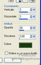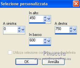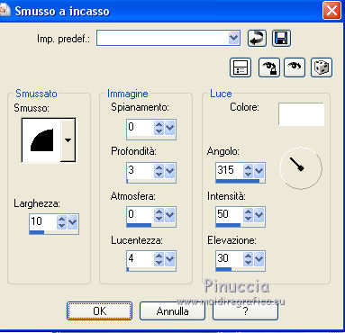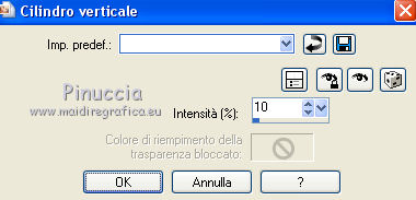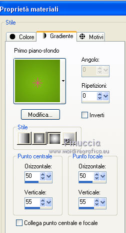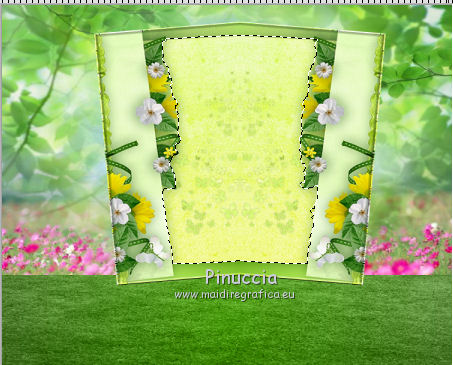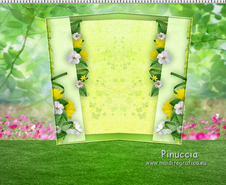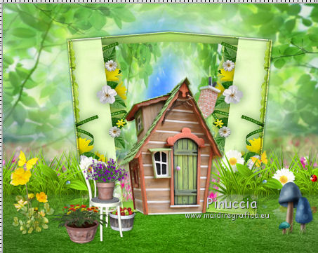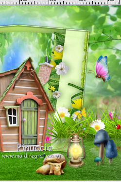 qui puoi trovare qualche risposta ai tuoi dubbi. Se l'argomento che ti interessa non è presente, ti prego di segnalarmelo. Questo tutorial è una creazione di ©Titoune e non può essere copiato su altri siti nè essere offerto per il download. Lo stesso vale per la mia traduzione. Il tutorial è stato creato con PSP X5, ma può essere eseguito anche con le altre versioni di PSP. Secondo la versione utilizzata (anteriore a PSP X) potresti ottenere dei risultati differenti. Vedi la mia scheda riguardante le funzioni Rifletti>Capovolgi in X4 e X5 qui Per tradure il tutorial ho usato PSP X. Occorrente: Un tube a scelta. Il resto del materiale qui Il tube utilizzato è di kTs. Filtri Alien Skin Xenofex 2.0 - Burnt Edges qui ![]() 1. Imposta il colore di primo piano con #7cbe12 e il colore di sfondo con #5b8d0b. Passa il colore di primo piano a Gradiente, stile Sprazzo di luce. ![]() 2. Apri una nuova immagine trasparente 750 x 600 pixels. Attiva lo strumento Selezione ,clicca sull'icona Selezione personalizzata ![]() e imposta i seguenti settaggi: ![]() Riempi la selezione con il gradiente.Livelli>Duplica. Cambia la modalità di miscelatura di questo livello in Moltiplica. 3. Livelli>Nuovo livello raster. Apri l'immagine 1423094-texture-herbe-verte e vai a Modifica>Copia. Torna al tuo lavoro e vai a Modifica>Incolla nella selezione. Cambia la modalità di miscelatura di questo livello in Luminanza (Esistente). Selezione>Inverti. 4. Livelli>Nuovo livello raster. Livelli>Disponi>Porta sotto. 5. Apri l'immagine 1594246_1dddd4b6 e vai a Modifica>Copia. Torna al tuo lavoro e vai a Modifica>Incolla nella selezione. Selezione>Deseleziona. 6. Attiva il livello superiore. Apri l'elemento 971694bd e lavora su questo. Selezione>Seleziona tutto. Selezione>Modifica>Contrai - 5 pixels. Selezione>Inverti. Selezione>Innalza selezione a livello. 7. Effetti>Effetti di trama>Plastica morbida. ![]() 8. Effetti>Effetti 3D>Smusso a incasso. ![]() Effetti>Effetti di bordo>Aumenta. 9. Effetti>Effetti 3D>Sfalsa ombra, colore #163a0a. ![]() Selezione>Deseleziona. Livelli>Unisci>Unisci giù. Modifica>Copia. Torna al tuo lavoro e vai a Modifica>Incolla come nuovo livello. 10. Immagine>Ridimensiona, al 70%, tutti i livelli non selezionato. Regola>Messa a fuoco>Metti a fuoco. Immagine>Ruota per gradi - 5 gradi a sinistra. ![]() 11. Effetti>Effetti di riflesso>Specchio rotante. ![]() 12. Effetti>Effetti geometrici>Cilindro verticale. ![]() Posiziona l'elemento come nell'esempio.![]() 13. Attiva lo strumento Bacchetta magica , tolleranza 30,e clicca al centro più volte per selezionare completamente l'area. ![]() 14. Livelli>Nuovo livello raster. Attiva nuovamente l'immagine 1594246_1dddd4b6 e vai a Modifica>Copia. Torna al tuo lavoro e vai a Modifica>Incolla nella selezione. Selezione>Deseleziona. Livelli>Unisci>Unisci giù. Effetti>Effetti 3D>Sfalsa ombra, con i settaggi precedenti. ![]() Ripeti l'Effetto Sfalsa ombra, cambiando verticale e orizzontale con -3. 15. Apri l'elemento 0_53973_f5cd2448_L e vai a Modifica>Copia. Torna al tuo lavoro e vai a Modifica>Incolla come nuovo livello. 16. Effetti>Effetti di immagine>Scostamento. ![]() Effetti>Effetti 3D>Sfalsa ombra - colore #163a0a. ![]() 17. Apri c403773d (casa) e vai a Modifica>Copia. Torna al tuo lavoro e vai a Modifica>Incolla come nuovo livello. Sposta l'elemento al centro.Vedi l'esempio finale. Effetti>Effetti 3D>Sfalsa ombra, con i settaggi precedenti. 18. Apri l'elemento c5f8aea8 (fiori gialli) e vai a Modifica>Copia. Torna al tuo lavoro e vai a Modifica>Incolla come nuovo livello. Sposta l'elemento a sinistra.Vedi l'esempio finale. Effetti>Effetti 3D>Sfalsa ombra, con i settaggi precedenti. 19. Apri l'elemento ad4111ce (sedia e fiori) e vai a Modifica>Copia. Torna al tuo lavoro e vai a Modifica>Incolla come nuovo livello. Sposta l'elemento a sinistra.Vedi l'esempio finale. Effetti>Effetti 3D>Sfalsa ombra, con i settaggi precedenti. 20. Apri l'elemento 8400ea55 (funghi blu) e vai a Modifica>Copia. Torna al tuo lavoro e vai a Modifica>Incolla come nuovo livello. Sposta l'elemento a destra.![]() Effetti>Effetti 3D>Sfalsa ombra, con i settaggi precedenti. 21. Apri l'elemento d7688c25 (lanterna) e vai a Modifica>Copia. Torna al tuo lavoro e vai a Modifica>Incolla come nuovo livello. Sposta l'elemento a destra.Vedi l'esempio finale. Effetti>Effetti 3D>Sfalsa ombra, 22. Apri l'elemento 59a77072 (lumaca) e vai a Modifica>Copia. Torna al tuo lavoro e vai a Modifica>Incolla come nuovo livello. Sposta l'elemento in basso.Vedi l'esempio finale. Effetti>Effetti 3D>Sfalsa ombra, con i settaggi precedenti. 23. Apri l'elemento d7688c25 (farfalla) e vai a Modifica>Copia. Torna al tuo lavoro e vai a Modifica>Incolla come nuovo livello. Sposta l'elemento a destra.![]() Effetti>Effetti 3D>Sfalsa ombra, con i settaggi precedenti. 24. Apri l'elemento ded109ea (uccelli) e vai a Modifica>Copia. Torna al tuo lavoro e vai a Modifica>Incolla come nuovo livello. Sposta l'elemento in alto a sinistra.Vedi l'esempio finale. Effetti>Effetti 3D>Sfalsa ombra, con i settaggi precedenti. 25. Apri l'elemento cf87938a (striscione) e vai a Modifica>Copia. Torna al tuo lavoro e vai a Modifica>Incolla come nuovo livello. Sposta l'elemento in alto.Vedi l'esempio finale. Effetti>Effetti 3D>Sfalsa ombra, con i settaggi precedenti. 26. Apri l'elemento "wordart_clairiere_enchantee" e vai a Modifica>Copia. Torna al tuo lavoro e vai a Modifica>Incolla come nuovo livello. Sposta il testo sullo striscione.Vedi l'esempio finale. Effetti>Effetti 3D>Sfalsa ombra, con i settaggi precedenti. Nota. Per un testo personalizzato puoi fare riferimento a questa traduzione 27. Apri l'elemento d88869bc (frutta) e vai a Modifica>Copia. Torna al tuo lavoro e vai a Modifica>Incolla come nuovo livello. Sposta l'elemento in basso.Vedi l'esempio finale. Effetti>Effetti 3D>Sfalsa ombra, con i settaggi precedenti. 28. Apri il tuo tube e vai a Modifica>Copia. Torna al tuo lavoro e vai a Modifica>Incolla come nuovo livello. Immagi