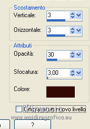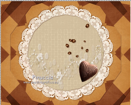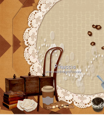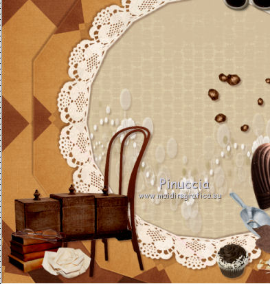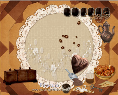qui puoi trovare qualche risposta ai tuoi dubbi. Se l'argomento che ti interessa non è presente, ti prego di segnalarmelo. Questo tutorial è una creazione di ©Titoune e non può essere copiato su altri siti nè essere offerto per il download. Lo stesso vale per la mia traduzione. Il tutorial è stato creato con PSP X5, ma può essere eseguito anche con le altre versioni di PSP. Secondo la versione utilizzata (anteriore a PSP X) potresti ottenere dei risultati differenti. Dalla versione X4, il comando Immagine>Rifletti è stato sostituito con Immagine>Capovolgi in orizzontale, e il comando Immagine>Capovolgi con Immagine>Capovolgi in verticale. Nelle versioni X5 e X6, le funzioni sono state migliorate rendendo disponibile il menu Oggetti. Con il nuovo X7 sono tornati i comandi Rifletti/Capovolgi, ma con nuove differenze. Vedi la scheda sull'argomento qui Per tradure il tutorial ho usato PSP X. Occorrente: Un tube a scelta. Il resto del materiale qui Il tube utilizzato è di Angel Keeper ![]() 1. Apri una nuova immagine trasparente 750 x 600 pixels. Selezione>Seleziona tutto. 2. Apri l'elemento Paper7 e vai a Modifica>Copia. Torna al tuo lavoro e vai a Modifica>Incolla nella selezione. Selezione>Deseleziona. 3. Livelli>Duplica. Immagine>Ridimensiona, all'85%, tutti i livelli non selezionato. 4. Effetti>Effetti di riflesso>Caleidoscopio. ![]() 5. Effetti>Effetti 3D>Sfalsa ombra, colore #360a04. ![]() Ripeti l'Effetto Sfalsa ombra, cambiando verticale e orizzontale con -3. 6. Apri l'elemento Frame6, e vai a Modifica>Copia. Torna al tuo lavoro e vai a Modifica>Incolla come nuovo livello. 7. Attiva lo strumento Bacchetta magica , tolleranza 10,e clicca al centro della cornice per selezionarla. Selezione>Modifica>Espandi - 3 pixels. 8. Livelli>Nuovo livello raster. Livelli>Disponi>Sposta giù. 9. Apri l'elemento Paper3 e vai a Modifica>Copia. Torna al tuo lavoro e vai a Modifica>Incolla nella selezione. Mantieni selezionato. 10. Livelli>Nuovo livello raster. Apri l'elemento Scatter 1 e vai a Modifica>Copia. Torna al tuo lavoro e vai a Modifica>Incolla nella selezione. Selezione>Deseleziona. Effetti>Effetti 3D>Sfalsa ombra, colore #360a04. ![]() 11. Apri l'elemento Scatter2, e vai a Modifica>Copia. Torna al tuo lavoro e vai a Modifica>Incolla come nuovo livello. Spostalo nella cornice, in alto a destra.![]() Effetti>Effetti 3D>Sfalsa ombra, con i settaggi precedenti. 12. Attiva il livello della cornice. Effetti>Effetti 3D>Sfalsa ombra, colore #360a04. ![]() Ripeti l'Effetto Sfalsa ombra, cambiando verticale e orizzontale con -3. 13. Apri l'elemento heart2, e vai a Modifica>Copia. Torna al tuo lavoro e vai a Modifica>Incolla come nuovo livello. Spostalo nella cornice, in basso a destra.![]() Effetti>Effetti 3D>Sfalsa ombra, colore #360a04. ![]() 14. Apri l'elemento VA, e vai a Modifica>Copia. Torna al tuo lavoro e vai a Modifica>Incolla come nuovo livello. Spostalo in alto a destra.Vedi l'esempio finale. Niente Sfalsa ombra. 15. Apri l'elemento Clock, e vai a Modifica>Copia. Torna al tuo lavoro e vai a Modifica>Incolla come nuovo livello. Spostalo a destra.Vedi l'esempio finale. Effetti>Effetti 3D>Sfalsa ombra, con i settaggi precedenti. 16. Apri l'elemento Bread, e vai a Modifica>Copia. Torna al tuo lavoro e vai a Modifica>Incolla come nuovo livello. Spostalo in basso a destra.Vedi l'esempio finale. Effetti>Effetti 3D>Sfalsa ombra, con i settaggi precedenti. 17. Apri l'elemento Cookie2, e vai a Modifica>Copia. Torna al tuo lavoro e vai a Modifica>Incolla come nuovo livello. Spostalo in basso a destra.![]() Effetti>Effetti 3D>Sfalsa ombra, con i settaggi precedenti. 18. Apri l'elemento Coffee1, e vai a Modifica>Copia. Torna al tuo lavoro e vai a Modifica>Incolla come nuovo livello. Spostalo in basso a destra.Vedi l'esempio finale. Effetti>Effetti 3D>Sfalsa ombra, con i settaggi precedenti. 19. Apri l'elemento Key, e vai a Modifica>Copia. Torna al tuo lavoro e vai a Modifica>Incolla come nuovo livello. Spostalo nella parte inferiore.Vedi l'esempio finale. Effetti>Effetti 3D>Sfalsa ombra, con i settaggi precedenti. 20. Apri l'elemento Cookie1, e vai a Modifica>Copia. Torna al tuo lavoro e vai a Modifica>Incolla come nuovo livello. Sposta anche questo elemento in basso.![]() Effetti>Effetti 3D>Sfalsa ombra, con i settaggi precedenti. 21. Apri l'elemento Coffee Grounds, e vai a Modifica>Copia. Torna al tuo lavoro e vai a Modifica>Incolla come nuovo livello. Spostalo in basso.Vedi l'esempio finale. Effetti>Effetti 3D>Sfalsa ombra, con i settaggi precedenti. 22. Apri l'elemento Cupcake, e vai a Modifica>Copia. Torna al tuo lavoro e vai a Modifica>Incolla come nuovo livello. Sposta in basso.Vedi l'esempio finale. Effetti>Effetti 3D>Sfalsa ombra, con i settaggi precedenti. 23. Apri l'elemento Canisters, e vai a Modifica>Copia. Torna al tuo lavoro e vai a Modifica>Incolla come nuovo livello. Spostalo in basso a sinistra.![]() Effetti>Effetti 3D>Sfalsa ombra, con i settaggi precedenti. 24. Apri l'elemento Book, e vai a Modifica>Copia. Torna al tuo lavoro e vai a Modifica>Incolla come nuovo livello. Spostalo in basso a sinistra.Vedi l'esempio finale. Effetti>Effetti 3D>Sfalsa ombra, con i settaggi precedenti. 25. Apri l'elemento Glasses, e vai a Modifica>Copia. Torna al tuo lavoro e vai a Modifica>Incolla come nuovo livello. Spostalo in basso a sinistra.Vedi l'esempio finale. Effetti>Effetti 3D>Sfalsa ombra, con i settaggi precedenti. 26. Apri l'elemento Flower3, e vai a Modifica>Copia. Torna al tuo lavoro e vai a Modifica>Incolla come nuovo livello. Spostalo in basso.Vedi l'esempio finale. Effetti>Effetti 3D>Sfalsa ombra, con i settaggi precedenti. 27. Apri l'elemento Chair, e vai a Modifica>Copia. Torna al tuo lavoro e vai a Modifica>Incolla come nuovo livello. Spostalo in basso s sinistra.Porta questo livello sotto il livello del mobile. ![]() Effetti>Effetti 3D>Sfalsa ombra, con i settaggi precedenti. 28. Attiva nuovamente il livello superiore. Apri l'elemento Coffee2, e vai a Modifica>Copia. Torna a