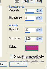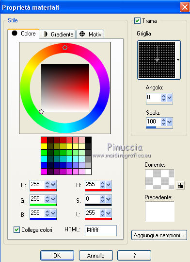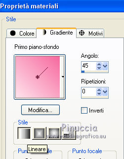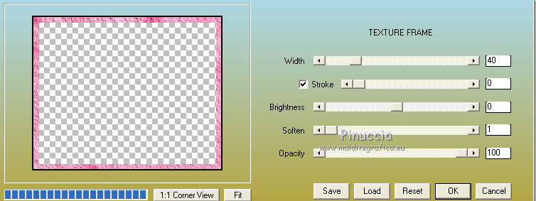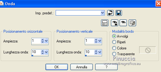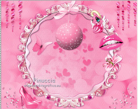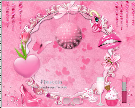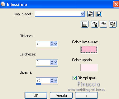qui puoi trovare qualche risposta ai tuoi dubbi. Se l'argomento che ti interessa non è presente, ti prego di segnalarmelo. Questo tutorial è una creazione di ©Titoune e non può essere copiato su altri siti nè essere offerto per il download. Lo stesso vale per la mia traduzione. Il tutorial è stato creato con PSP X5, ma può essere eseguito anche con le altre versioni di PSP. Secondo la versione utilizzata (anteriore a PSP X) potresti ottenere dei risultati differenti. Dalla versione X4, il comando Immagine>Rifletti è stato sostituito con Immagine>Capovolgi in orizzontale, e il comando Immagine>Capovolgi con Immagine>Capovolgi in verticale. Nelle versioni X5 e X6, le funzioni sono state migliorate rendendo disponibile il menu Oggetti. Vedi la scheda sull'argomento qui Per tradure il tutorial ho usato PSP X. Occorrente: Un tube a scelta. Il resto del materiale qui Il tube utilizzato è di Kts. Filtri in caso di dubbi, ricorda di consultare la mia sezione filtri qui Graphics Plus - Cross Shadow qui AAA Frames - Texture Frame qui Penta.com - Jeans qui Simple - Left Right Wrap qui I filtri Penta.com, Simple e Graphics Plus si possono usare da soli o importati in Filters Unlimited (come fare vedi qui) Se un filtro fornito appare con questa icona ![]() Metti la trama nella cartella Trame. Metti la selezione nella cartella Selezioni. 1. Imposta il colore di primo piano con #fee3ec, e il colore di sfondo con #f5689d. Passa il colore di primo piano a Gradiente di primo piano/sfondo, stile Lineare. ![]() 2. Apri una nuova immagine trasparente 750 x 600 pixels. Selezione>Carica/Salva selezione>Carica selezione da disco. Cerca e carica la selezione "selection_scrap_pinkplotion". ![]() 3. Apri l'elemento MC_Pinksplotion_E07, e vai a Modifica>Copia. Torna al tuo lavoro e vai a Modifica>Incolla nella selezione. Selezione>Deseleziona. 4. Attiva lo strumento Bacchetta magica ![]() e clicca al centro della cornice per selezionarla. Selezione>Modifica>Seleziona bordature selezione. ![]() 5. Livelli>Nuovo livello raster. Livelli>Disponi>Sposta giù. Riempi con il gradiente.6. Effetti>Plugins>Graphics Plus - Cross Shadow. ![]() 7. Effetti>Effetti di trama>Intessitura. Colore intessitura #fcbed4 - colore spazio #feecf3. ![]() Selezione>Deseleziona. 8. Effetti>Effetti di distorsione>Onda. ![]() 9. Effetti>Effetti 3D>Smusso a incasso. ![]() 10. Immagine>Ridimensiona, al 102%, tutti i livelli non selezionato. Attiva il livello superiore. Effetti>Effetti 3D>Smusso a incasso, con i settaggi precedenti. Livelli>Unisci>Unisci giù. 11. Effetti>Effetti di riflesso>Specchio rotante. ![]() 12. Clicca al centro della cornice con la bacchetta magica per selezionarla.Selezione>Modifica>Espandi - 5 pixels. 13. Livelli>Nuovo livello raster. Livelli>Disponi>Sposta giù. Riempi con il gradiente.14. Effetti>Effetti di trama>Trama - seleziona la trama "tilerose". ![]() Bassa l'opacità di questo livello al 60%. 15. Livelli>Nuovo livello raster. Livelli>Disponi>Sposta giù. 16. Apri l'elemento MC_Pinksplotion_P06 e vai a Modifica>Copia. Torna al tuo lavoro e vai a Modifica>Incolla nella selezione. Modifica>Incolla nella selezione. Selezione>Deseleziona. Effetti>Effetti di bordo>Aumenta. 17. Livelli>Nuovo livello raster. Livelli>Disponi>Sposta giù. Selezione>Seleziona tutto. Modifica>Incolla nella selezione (l'elemento è ancora in memoria). Selezione>Deseleziona. Imposta il colore di primo piano con il colore bianco e seleziona Trama. Imposta la trama Griglia con i seguenti settaggi. ![]() Livelli>Nuovo livello raster. Riempi il livello con questo colore+trama.18. Effetti>Effetti di distorsione>Onda, con i settaggi precedenti. Cambia la modalità di miscelatura di questo livello in Luminanza (esistente) e abbassa l'opacità al 54%. 19. Attiva il livello della cornice. Effetti>Effetti 3D>Sfalsa ombra, colore #ba2c7d. ![]() Ripeti l'Effetto Sfalsa ombra, cambiando verticale e orizzontale con -3. 20. Apri l'elemento MC_Pinksplotion_E45, e vai a Modifica>Copia. Torna al tuo lavoro e vai a Modifica>Incolla come nuovo livello. Effetti>Plugins>Simple - Left Right Wrap. Spostalo in alto, contro il bordo.Con X5 e X6: Oggetti>Allinea>Superiore Effetti>Effetti 3D>sfalsa ombra, con i settaggi precedenti. 21. Apri l'elemento MC_Pinksplotion_E02, e vai a Modifica>Copia. Torna al tuo lavoro e vai a Modifica>Incolla come nuovo livello. Spostalo nella cornice.Vedi l'esempio finale. 22. Effetti>Effetti 3D>Sfalsa ombra, colore #ba2c7d. 23. Apri l'elemento MC_Pinksplotion_E08, e vai a Modifica>Copia. Torna al tuo lavoro e vai a Modifica>Incolla come nuovo livello. Spostalo nella cornice, a sinistra.Vedi l'esempio finale. Effetti>Effetti 3D>Sfalsa ombra, con i settaggi precedenti. 24. Apri l'elemento MC_Pinksplotion_E17, e vai a Modifica>Copia. Torna al tuo lavoro e vai a Modifica>Incolla come nuovo livello. Spostalo in basso a sinistra.Vedi l'esempio finale. Effetti>Effetti 3D>Sfalsa ombra, con i settaggi precedenti. Livelli>Duplica. Immagine>Rifletti. 25. Apri l'elemento MC_Pinksplotion_E10, e vai a Modifica>Copia. Torna al tuo lavoro e vai a Modifica>Incolla come nuovo livello. Spostalo nella parte superiore della cornice.Vedi l'esempio finale. Effetti>Effetti 3D>Sfalsa ombra, con i settaggi precedenti. 26. Apri l'elemento MC_Pinksplotion_E42, e vai a Modifica>Copia. Torna al tuo lavoro e vai a Modifica>Incolla come nuovo livello. Spostalo nella parte superiore della cornice.![]() Effetti>Effetti 3D>Sfalsa ombra, con i settaggi precedenti. 27. Apri l'elemento MC_Pinksplotion_E35, e vai a Modifica>Copia. Torna al tuo lavoro e vai a Modifica>Incolla come nuovo livello. Spostalo nella parte inferiore sinistra della cornice.Vedi l'esempio finale. Effetti>Effetti 3D>Sfalsa ombra, con i settaggi precedenti. 28. Apri l'elemento MC_Pinksplotion_E09, e vai a Modifica>Copia. Torna al tuo lavoro e vai a Modifica>Incolla come nuovo livello. Spostalo nella parte superiore destra della cornice.Vedi l'esempio finale. Effetti>Effetti 3D>Sfalsa ombra, con 
