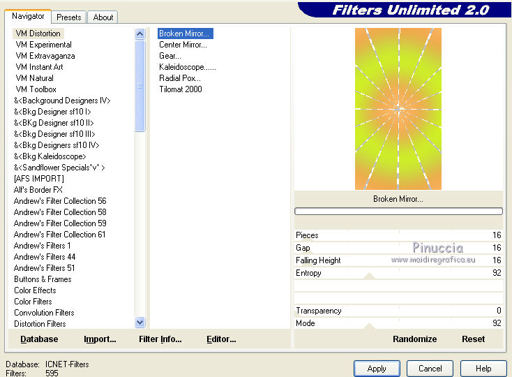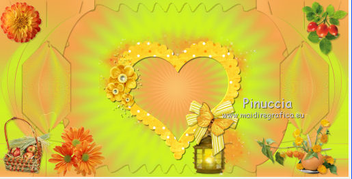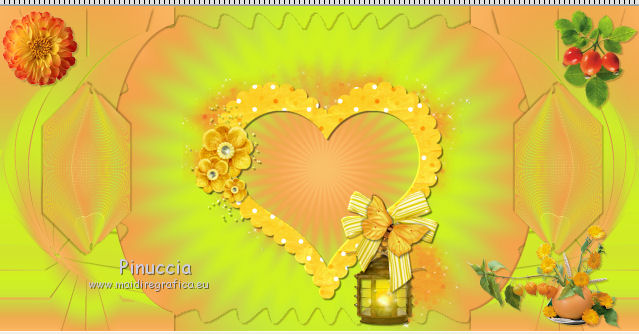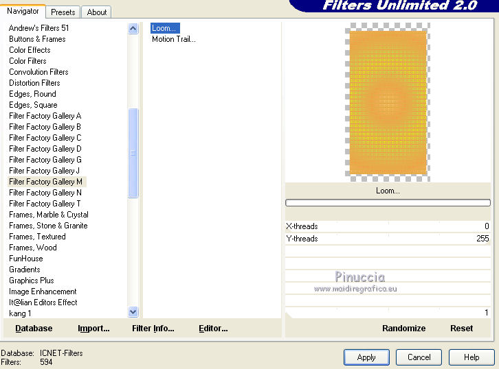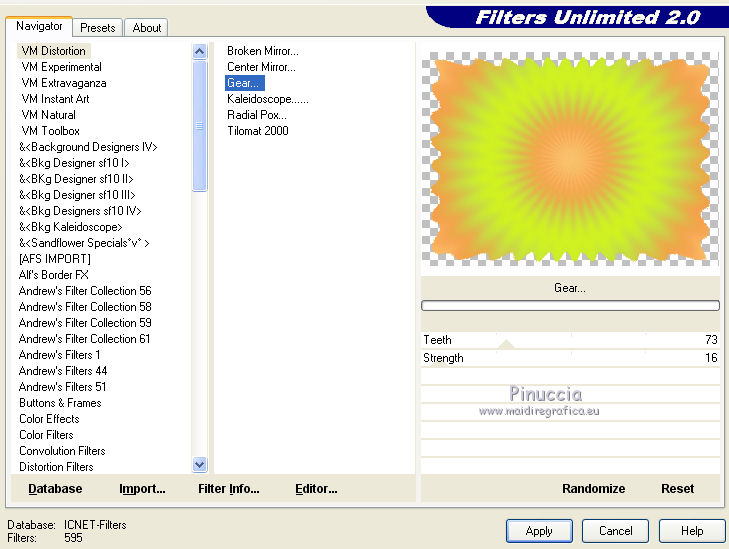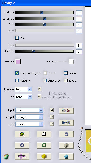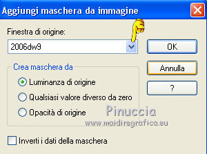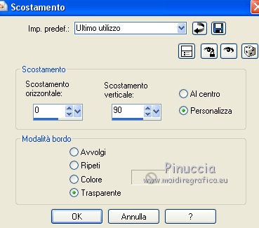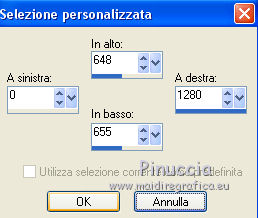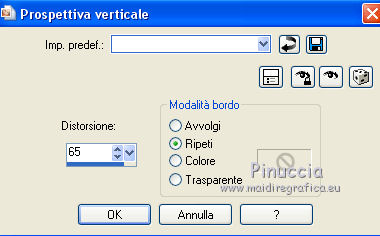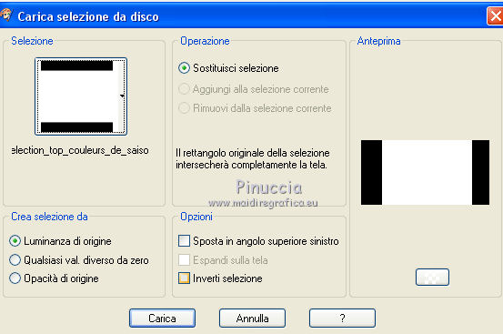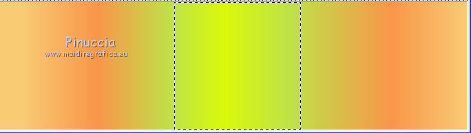 qui puoi trovare qualche risposta ai tuoi dubbi. Se l'argomento che ti interessa non è presente, ti prego di segnalarmelo. Questo tutorial è una creazione di ©Titoune e non può essere copiato su altri siti nè essere offerto per il download. Lo stesso vale per la mia traduzione. Il tutorial è stato creato con PSP X5, ma può essere eseguito anche con le altre versioni di PSP. Secondo la versione utilizzata (anteriore a PSP X) potresti ottenere dei risultati differenti. Vedi la mia scheda riguardante le funzioni Rifletti>Capovolgi in X4 e X5 qui Per tradure il tutorial ho usato PSP X. Occorrente: Un tube a scelta. Il resto del materiale qui Filtri Filters Unlimited 2.0 qui Filter Factory Gallery M - Loom qui Flaming Pear - Flexify 2 qui VM Distortion - Gear qui I filtri Factory Gallery e VM Distortion si possono usare da soli o importati in Filters Unlimited. (come fare vedi qui) Se un filtro fornito appare con questa icona ![]() Metti il gradiente nella cartella Gradienti. Metti la selezione nella cartella Selezioni. Apri la maschera in PSP e minimizzala con il resto del materiale. 1. Passa il colore di primo piano a Gradiente e seleziona il gradiente "raffaele18" con i seguenti settaggi. ![]() Imposta il colore di sfondo con #e5ac49. 2. Apri una nuova immagine trasparente 350 x 650 pixels, e riempila con il gradiente.Livelli>Duplica. Immagine>Ridimensiona, al 90%, tutti i livelli non selezionato. Effetti>Effetti di bordo>Aumenta. 3. Effetti>Plugins>Filter Factory Gallery M - Loom, con i settaggi standard. ![]() Effetti>Plugins>Flaming Pear - Flexify 2. ![]() 4. Effetti>Effetti 3D>Sfalsa ombra, colore #57360f. ![]() Ripeti l'Effetto Sfalsa ombra, cambiando verticale e orizzontale con -3. 5. Immagine>Ruota per gradi - 90 gradi a sinistra. ![]() 6. Attiva il livello inferiore. Regola>Sfocatura>Sfocatura gaussiana - raggio 35. ![]() Livelli>Duplica. 7. Effetti>Plugins>Filters Unlimited 2.0 - VM Distortion - Broken Mirror, con i settaggi standard. ![]() 8. Effetti>Effetti 3D>Sfalsa ombra, colore #57360f. ![]() 9. Effetti>Effetti geometrici>Prospettiva verticale. ![]() Livelli>Unisci>Unisci giù. 10. Immagine>Dimensioni tela - 1280 x 650. ![]() 11. Effetti>Effetti di riflesso>Specchio rotante. ![]() 12. Effetti>Effetti geometrici>Sfera. ![]() 13. Effetti>Effetti 3D>Sfalsa ombra, #57360f. ![]() Ripeti l'Effetto Sfalsa ombra, cambiando verticale e orizzontale con -3. 14. Attiva il livello superiore della losanga. Effetti>Effetti di riflesso>Specchio rotante, con i settaggi precedenti. 15. Attiva il livello inferiore. Livelli>Nuovo livello raster. Livelli>Disponi>Porta sotto. 16. Selezione>Carica/Salva selezione>Carica selezione da disco. Cerca e carica la selezione "selection_top_couleurs_de_saison". ![]() Riempi la selezione con il gradiente.Regola>Sfocatura>Sfocatura gaussiana, con i settaggi precedenti. 17. Livelli>Duplica. Immagine>Ridimensiona, al 90%, tutti i livelli non selezionato. 18. Effetti>Plugins>Filters Unlimited 2.0 - VM Distortion - Gear, con i settaggi standard. ![]() Selezione>Deseleziona. Rinomina questo livello "stella". 19. Effetti>Effetti 3D>Sfalsa ombra, colore #57360f. ![]() Ripeti l'Effetto Sfalsa ombra, cambiando verticale e orizzontale con -3. 20. Apri l'elemento MSYellowDottedFrameA e vai a Modifica>Copia. Torna al tuo lavoro e vai a Modifica>Incolla come nuovo livello. Spostalo al centro della stella.Niente Sfalsa ombra. 21. Attiva il livello superiore. Apri l'elemento 005 e vai a Modifica>Copia. Torna al tuo lavoro e vai a Modifica>Incolla come nuovo livello. Sposta l'elemento in alto a sinistra.Vedi l'esempio finale. Effetti>Effetti 3D>Sfalsa ombra, colore #57360f. ![]() 22. Apri l'elemento 003 e vai a Modifica>Copia. Torna al tuo lavoro e vai a Modifica>Incolla come nuovo livello. Spostalo in alto a destra.Vedi l'esempio finale. Effetti>Effetti 3D>Sfalsa ombra, con i settaggi precedenti. 23. Apri l'elemento 0010 e vai a Modifica>Copia. Torna al tuo lavoro e vai a Modifica>Incolla come nuovo livello. Spostalo in basso a destra.![]() Effetti>Effetti 3D>Sfalsa ombra, con i settaggi precedenti. 24. Apri l'elemento e08 e vai a Modifica>Copia. Torna al tuo lavoro e vai a Modifica>Incolla come nuovo livello. Spostalo in basso.Vedi l'esempio finale. Effetti>Effetti 3D>Sfalsa ombra, con i settaggi precedenti. 25. Apri l'elemento 006 e vai a Modifica>Copia. Torna al tuo lavoro e vai a Modifica>Incolla come nuovo livello. Spostalo in basso a sinistra.![]() Effetti>Effetti 3D>Sfalsa ombra, con i settaggi precedenti. 26. Attiva il livello inferiore. Selezione>Seleziona tutto. Immagine>Ritaglia la selezione. 27. Immagine>Dimensioni tela - 1280 x 1500 pixels. ![]() 28. Livelli>Nuovo livello raster. Livelli>Disponi>Sposta giù. 29. Cambia i settaggi del gradiente. ![]() Riempi la selezione con il gradiente.30. Apri una nuova immagine trasparente 1280 x 350 pixels, e riempila con lo stesso gradiente.31. Attiva lo strumento Bacchetta magica ![]() e clicca nella parte indicata per selezionarla. ![]() Effetti>Effetti artistici>Mezzitoni. ![]() Selezione>Innalza selezione a livello. Selezione>Deseleziona. 32. Effetti>Effetti 3D>Sfalsa ombra, colore #57360f. ![]() Ripeti l'Effetto Sfalsa ombra, cambiando verticale e orizzontale con -3. Livelli>Unisci>Unisci giù. 33. Livelli>Nuovo livello maschera>Da immagine. Apri il menu sotto la finestra di origine e vedrai la lista dei files aperti. Seleziona la maschera "2006dw9", con i seguenti settaggi. ![]() Livelli>Unisci>Unisci gruppo. Modifica>Copia. Torna al tuo top e vai a Modifica>Incolla come nuovo livello. 34. Effetti>Effetti di immagine>Scostamento. ![]() Effetti>Effetti 3D>Sfalsa ombra, con i settaggi precedenti. 35. Attiva lo strumento Selezione ,clicca sull'icona Selezione personalizzata ![]() e imposta i seguenti settaggi: ![]() Selezione>Innalza selezione a livello. Livelli>Disponi>Porta in alto. Effetti>Effetti artistici>Mezzitoni, con i settaggi precedenti. Selezione>Deseleziona. Effetti>Effetti 3D>Sfalsa ombra, con i sett