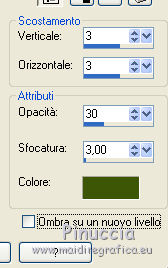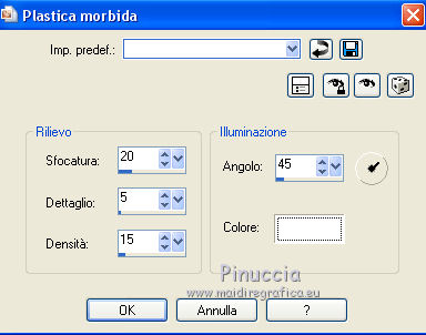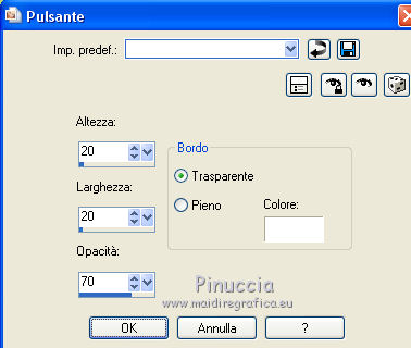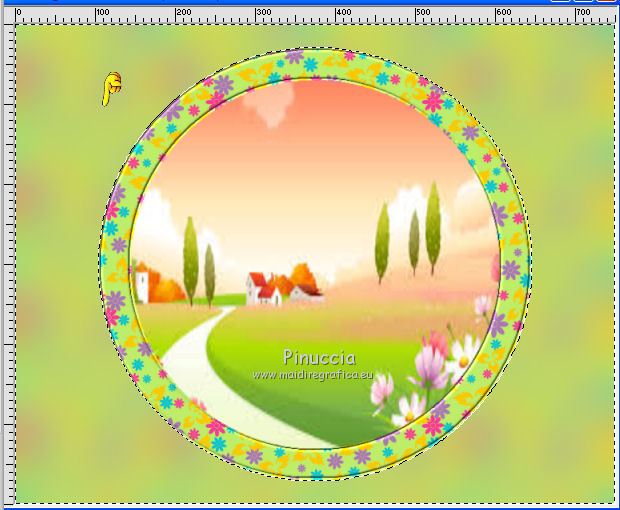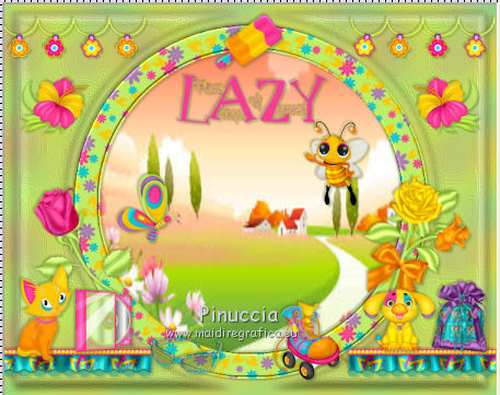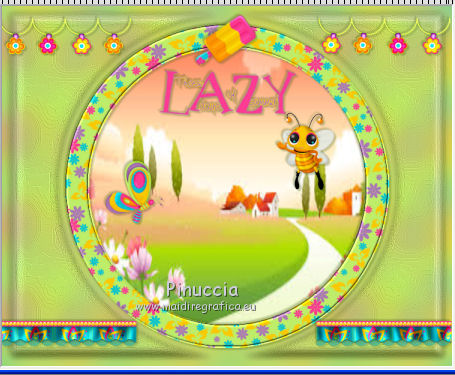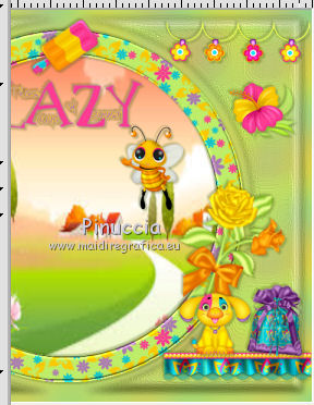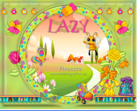 qui puoi trovare qualche risposta ai tuoi dubbi. Se l'argomento che ti interessa non è presente, ti prego di segnalarmelo. Questo tutorial è una creazione di ©Titoune e non può essere copiato su altri siti nè essere offerto per il download. Lo stesso vale per la mia traduzione. Il tutorial è stato creato con PSP X5, ma può essere eseguito anche con le altre versioni di PSP. Secondo la versione utilizzata (anteriore a PSP X) potresti ottenere dei risultati differenti. Dalla versione X4, il comando Immagine>Rifletti è stato sostituito con Immagine>Capovolgi in orizzontale, e il comando Immagine>Capovolgi con Immagine>Capovolgi in verticale. Nelle versioni X5 e X6, le funzioni sono state migliorate rendendo disponibile il menu Oggetti. Vedi la scheda sull'argomento qui Per tradure il tutorial ho usato PSP X. Occorrente: Un tube a scelta. Il resto del materiale qui Filtri in caso di dubbi, ricorda di consultare la mia sezione filtri qui Penta.com - Jeans qui Simple - Left Right Wrap (bonus) qui ![]() 1. Apri una nuova immagine trasparente 750 x 600 pixels. Selezione>Seleziona tutto. 2. Apri l'elemento Paper5, e vai a Modifica>Copia. Torna al tuo lavoro e vai a Modifica>Incolla nella selezione. Selezione>Deseleziona. 3. Regola>Sfocatura>Sfocatura gaussiana - raggio 25. ![]() 4. Livelli>Nuovo livello raster. Selezione>Carica/Salva selezione>Carica selezione da disco. Cerca e carica la selezione "Selection_scrap_couleurs_estivales". ![]() Modifica>Incolla nella selezione (l'elemento Paper5 è ancora in memoria). Selezione>Deseleziona. 5. Effetti>Effetti 3D>Smusso a incasso. ![]() 6. Attiva lo strumento Bacchetta magica ![]() e clicca al centro della cornice per selezionarla. Selezione>Modifica>Espandi - 15 pixels. 7. Livelli>Nuovo livello raster. Livelli>Disponi>Sposta giù. 8. Apri l'immagine landscape2. Immagine>Rifletti. Modifica>Copia. Torna al tuo lavoro e vai a Modifica>Incolla nella selezione. Selezione>Deseleziona. 9. Attiva il livello della cornice. Attiva nuovamente lo strumento bacchetta magica ![]() e clicca nella parte esterna per selezionarla. ![]() Attiva il livello inferiore. 10. Selezione>Carica/Salva selezione>Carica selezione da disco. Cerca e carica la selezione "Selection_scrap_couleurs_estivales2". ![]() Selezione>Innalza selezione a livello. 11. Effetti>Effetti 3D>Pulsante. ![]() Selezione>Deseleziona. 12. Effetti>Effetti di trama>Plastica morbida. ![]() 13. Effetti>Effetti di bordo>Aumenta. 14. Effetti>Effetti 3D>Sfalsa ombra, colore #3d5608. ![]() Ripeti l'Effetto Sfalsa ombra, cambiando verticale e orizzontale con -3. 15. Attiva il livello della cornice. Effetti>Effetti 3D>Sfalsa ombra, con i settaggi precedenti. 16. Apri l'elemento WA1, e vai a Modifica>Copia. Torna al tuo lavoro e vai a Modifica>Incolla come nuovo livello. Spostalo nella cornice, in alto.Vedi l'esempio finale. Effetti>Effetti 3D>Sfalsa ombra, con i settaggi precedenti. 17. Apri l'elemento Bee, e vai a Modifica>Copia. Torna al tuo lavoro e vai a Modifica>Incolla come nuovo livello. Spostalo nella parte superiore destra della cornice.Vedi l'esempio finale. Effetti>Effetti 3D>Sfalsa ombra, con i settaggi precedenti. 18. Apri l'elemento BFly1, e vai a Modifica>Copia. Torna al tuo lavoro e vai a Modifica>Incolla come nuovo livello. Spostalo nella parte inferiore sinistra della cornice.![]() Effetti>Effetti 3D>Sfalsa ombra, con i settaggi precedenti. 19. Apri l'elemento Iced Lolli, e vai a Modifica>Copia. Torna al tuo lavoro e vai a Modifica>Incolla come nuovo livello. Spostalo nella parte superiore della cornice.Vedi l'esempio finale. Effetti>Effetti 3D>Sfalsa ombra, con i settaggi precedenti. 20. Apri l'elemento Light, e vai a Modifica>Copia. Torna al tuo lavoro e vai a Modifica>Incolla come nuovo livello. Effetti>Plugins>Simple - Left Right Wrap. Spostalo nella parte superiore della cornice.Vedi l'esempio finale. Effetti>Effetti 3D>Sfalsa ombra, con i settaggi precedenti. 21. Apri l'elemento Ribbon, e vai a Modifica>Copia. Torna al tuo lavoro e vai a Modifica>Incolla come nuovo livello. Effetti>Plugins>Simple - Left Right Wrap. Spostalo nella parte inferiore della cornice.![]() Effetti>Effetti 3D>Sfalsa ombra, con i settaggi precedenti. 22. Apri l'elemento flower4 , e vai a Modifica>Copia. Torna al tuo lavoro e vai a Modifica>Incolla come nuovo livello. Spostalo in alto a destra.Vedi l'esempio finale. Effetti>Effetti 3D>Sfalsa ombra, con i settaggi precedenti. Livelli>Duplica. Immagine>Rifletti. 23. Apri l'elemento Flower2, e vai a Modifica>Copia. Torna al tuo lavoro e vai a Modifica>Incolla come nuovo livello. Spostalo in basso a destra.Vedi l'esempio finale. Effetti>Effetti 3D>Sfalsa ombra, con i settaggi precedenti. 24. Apri l'elemento Bag, e vai a Modifica>Copia. Torna al tuo lavoro e vai a Modifica>Incolla come nuovo livello. Spostalo in basso a destra.Vedi l'esempio finale. Effetti>Effetti 3D>Sfalsa ombra, con i settaggi precedenti. 25. Apri l'elemento Puppy1, e vai a Modifica>Copia. Torna al tuo lavoro e vai a Modifica>Incolla come nuovo livello. Spostalo in basso a destra.![]() Effetti>Effetti 3D>Sfalsa ombra, con i settaggi precedenti. 26. Apri l'elemento Skate, e vai a Modifica>Copia. Torna al tuo lavoro e vai a Modifica>Incolla come nuovo livello. Spostalo nella parte inferiore.Vedi l'esempio finale. Effetti>Effetti 3D>Sfalsa ombra, con i settaggi precedenti. 27. Apri l'elemento Glasses, e vai a Modifica>Copia. Torna al tuo lavoro e vai a Modifica>Incolla come nuovo livello. Spostalo nella parte inferiore.Vedi l'esempio finale. Effetti>Effetti 3D>Sfalsa ombra, con i settaggi precedenti. 28. Apri l'elemento Flower1, e vai a Modifica>Copia. Torna al tuo lavoro e vai a Modifica>Incolla come nuovo livello. Spostalo in basso a sinistra.![]() Effetti>Effetti 3D>Sfalsa ombra, con i settaggi precedenti. 29. Apri l'elemento CD, e vai a Modifica>Copia. Torna al tuo lavoro e vai a Modifica>Incolla come nuovo livello. Spostalo in basso a sinistra.Vedi l'esempio finale. Effetti>Effetti 3D>Sfalsa o