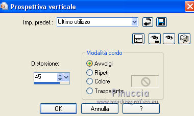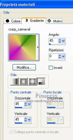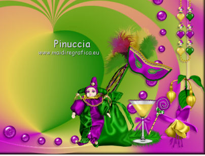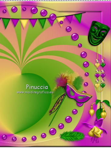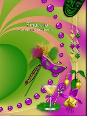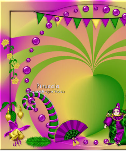 qui puoi trovare qualche risposta ai tuoi dubbi. Se l'argomento che ti interessa non è presente, ti prego di segnalarmelo. Questo tutorial è una creazione di ©Titoune e non può essere copiato su altri siti nè essere offerto per il download. Lo stesso vale per la mia traduzione. Il tutorial è stato creato con PSP X5, ma può essere eseguito anche con le altre versioni di PSP. Secondo la versione utilizzata (anteriore a PSP X) potresti ottenere dei risultati differenti. Vedi la mia scheda riguardante le funzioni Rifletti>Capovolgi in X4 e X5 qui Per tradure il tutorial ho usato PSP X. Occorrente: Un tube a scelta. Il resto del materiale qui Il tube utilizzato è di Gabry. ![]() Metti il gradiente nella cartella gradienti. 1. Passa il colore di primo piano a Gradiente, e seleziona il gradiente crazy_carnaval, stile Radiale. ![]() Apri una nuova immagine trasparente 750 x 600 pixels, e riempila con il gradiente.2. Effetti>Effetti geometrici>Prospettiva - 3 volte con i seguenti settaggi. ![]() 3. Effetti>Effetti di distorsione>Coordinate polari. ![]() 4. Selezione>Seleziona tutto. Selezione>Modifica>Contrai - 45 pixels. Selezione>Inverti. Selezione>Innalza selezione a livello. 5. Regola>Sfocatura>Sfocatura gaussiana - raggio 20. ![]() Selezione>Deseleziona. Effetti>Effetti di bordo>Aumenta. 6. Effetti>Effetti 3D>Smusso a incasso. ![]() 7. Effetti>Effetti geometrici>Sfera. ![]() 8. Effetti>Effetti 3D>Sfalsa ombra, colore #6f0070. ![]() 9. Apri l'elemento WP_LLBTR_FLAGS e vai a Modifica>Copia. Torna al tuo lavoro e vai a Modifica>Incolla come nuovo livello. Spostalo in alto contro il bordo superiore.Vedi l'esempio finale. Effetti>Effetti 3D>Sfalsa ombra, con i settaggi precedenti. 10. Apri l'elemento WP_LLBTR_PEARLBUTTONFRAME e vai a Modifica>Copia. Torna al tuo lavoro e vai a Modifica>Incolla come nuovo livello. Lascialo come sta. Effetti>Effetti 3D>Sfalsa ombra, con i settaggi precedenti. 11. Apri l'elemento WP_LLBTR_COMEDYMASK e vai a Modifica>Copia. Torna al tuo lavoro e vai a Modifica>Incolla come nuovo livello. Spostalo in alto a destra.Vedi l'esempio finale. Effetti>Effetti 3D>Sfalsa ombra, con i settaggi precedenti. 12. Apri l'elemento WP_LLBTR_JESTERNECKLACE e vai a Modifica>Copia. Torna al tuo lavoro e vai a Modifica>Incolla come nuovo livello. Spostalo a destra.Vedi l'esempio finale. Effetti>Effetti 3D>Sfalsa ombra, con i settaggi precedenti. Porta questo livello sotto il livello della maschera. 13. Attiva nuovamente il livello superiore. Apri l'elemento WP_LLBTR_FUSCIA e vai a Modifica>Copia. Torna al tuo lavoro e vai a Modifica>Incolla come nuovo livello. Spostalo in basso a destra.Vedi l'esempio finale. Effetti>Effetti 3D>Sfalsa ombra, con i settaggi precedenti. Livelli>Duplica. Immagine>Rifletti. 14. Apri l'elemento WP_LLBTR_FEATHER e vai a Modifica>Copia. Torna al tuo lavoro e vai a Modifica>Incolla come nuovo livello. Spostalo in basso a destra.Vedi l'esempio finale. Effetti>Effetti 3D>Sfalsa ombra, con i settaggi precedenti. Livelli>Duplica. Immagine>Rifletti. 15. Apri l'elemento WP_LLBTR_FEATHEREDMASK e vai a Modifica>Copia. Torna al tuo lavoro e vai a Modifica>Incolla come nuovo livello. Spostalo in basso a destra.![]() Effetti>Effetti 3D>Sfalsa ombra, con i settaggi precedenti. 16. Apri l'elemento WP_LLBTR_LOLLIPOP e vai a Modifica>Copia. Torna al tuo lavoro e vai a Modifica>Incolla come nuovo livello. Spostalo sulla piuma in basso a destra.Vedi l'esempio finale. Effetti>Effetti 3D>Sfalsa ombra, con i settaggi precedenti. 17. Apri l'elemento WP_LLBTR_MARTINIGLASS e vai a Modifica>Copia. Torna al tuo lavoro e vai a Modifica>Incolla come nuovo livello. Sposta anche questo elemento sulla piuma.![]() Effetti>Effetti 3D>Sfalsa ombra, con i settaggi precedenti. 18. Apri l'elemento WP_LLBTR_SACHETBAG e vai a Modifica>Copia. Torna al tuo lavoro e vai a Modifica>Incolla come nuovo livello. Spostalo in basso.Vedi l'esempio finale. Effetti>Effetti 3D>Sfalsa ombra, con i settaggi precedenti. 19. Apri l'elemento WP_LLBTR_MARDIGRASDOLL e vai a Modifica>Copia. Torna al tuo lavoro e vai a Modifica>Incolla come nuovo livello. Spostalo in basso.![]() Effetti>Effetti 3D>Sfalsa ombra, con i settaggi precedenti. 20. Apri l'elemento WP_LLBTR_CANE e vai a Modifica>Copia. Torna al tuo lavoro e vai a Modifica>Incolla come nuovo livello. Spostalo in basso.Vedi l'esempio finale. Effetti>Effetti 3D>Sfalsa ombra, con i settaggi precedenti. 21. Apri l'elemento WP_LLBTR_FAN e vai a Modifica>Copia. Torna al tuo lavoro e vai a Modifica>Incolla come nuovo livello. Spostalo in basso.Vedi l'esempio finale. Effetti>Effetti 3D>Sfalsa ombra, con i settaggi precedenti. 22. Apri l'elemento WP_LLBTR_ROSEVINE e vai a Modifica>Copia. Torna al tuo lavoro e vai a Modifica>Incolla come nuovo livello. Spostalo in alto a sinistra.![]() Effetti>Effetti 3D>Sfalsa ombra, con i settaggi precedenti. 23. Apri l'elemento WP_LLBTR_BUTTERFLYBOW e vai a Modifica>Copia. Torna al tuo lavoro e vai a Modifica>Incolla come nuovo livello. Spostalo in alto a sinistra.Vedi l'esempio finale. Effetti>Effetti 3D>Sfalsa ombra, con i settaggi precedenti. 24. Apri l'elemento WP_LLBTR_PAINTEDROSE e vai a Modifica>Copia. Torna al tuo lavoro e vai a Modifica>Incolla come nuovo livello. Spostalo nell'angolo in alto a sinistra.Vedi l'esempio finale. Effetti>Effetti 3D>Sfalsa ombra, con i settaggi precedenti. Livelli>Duplica. Immagine>Rifletti. 25. Attiva il livello inferiore. Apri l'elemento Carnaval 3 e vai a Modifica>Copia. Torna al tuo lavoro e vai a Modifica>Incolla come nuovo livello. Spostalo al centro.Vedi l'esempio finale. Cambia la modalità di miscelatura di questo livello in Luce diffusa, e abbassa l'opacità al 70%. 26. Attiva nuovamente il livello superiore. Apri l'elemento Texte e vai a Modifica>Copia. Torna al tuo lavoro e vai a Modifica>Incolla come nuovo livello. Spostalo al centro, o dove preferisci.Effetti>Effetti 3D>Sfalsa ombra, con i settaggi precedenti. 27. Apri il tuo tube e vai a Modifica>Copia. Torna al tuo lavoro e va