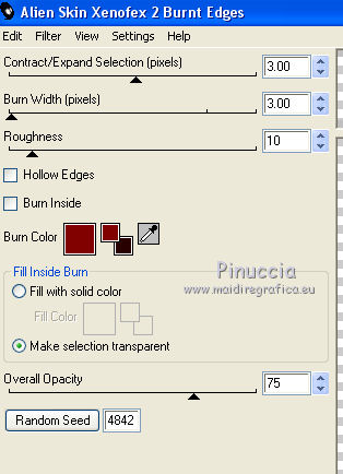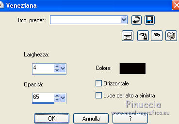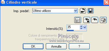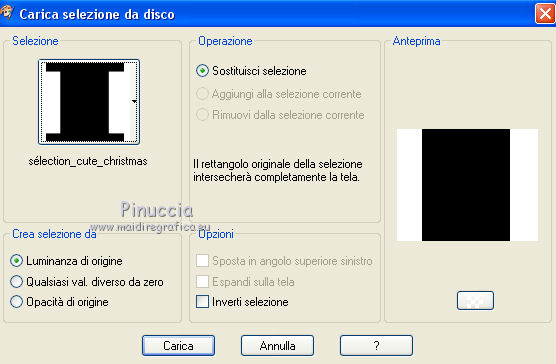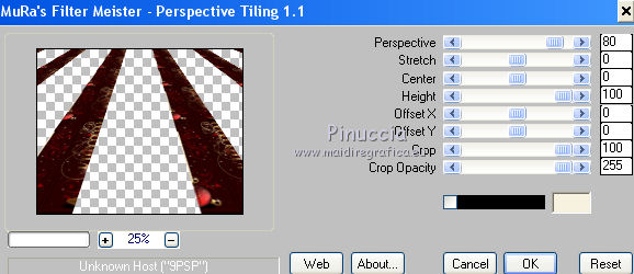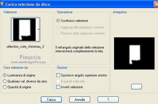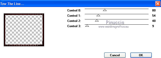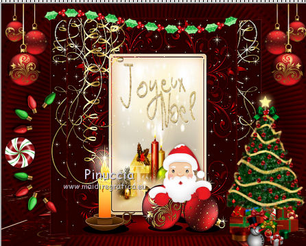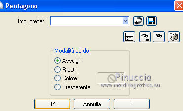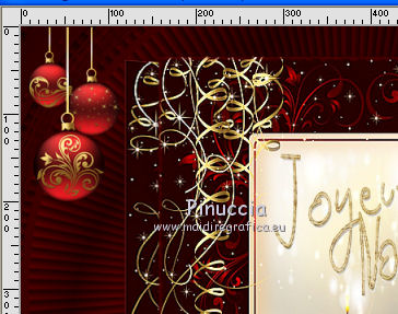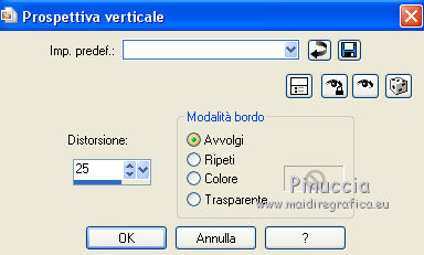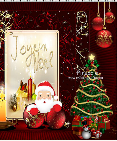 qui puoi trovare qualche risposta ai tuoi dubbi. Se l'argomento che ti interessa non è presente, ti prego di segnalarmelo. Questo tutorial è una creazione di ©Titoune e non può essere copiato su altri siti nè essere offerto per il download. Lo stesso vale per la mia traduzione. Il tutorial è stato creato con PSP X5, ma può essere eseguito anche con le altre versioni di PSP. Secondo la versione utilizzata (anteriore a PSP X) potresti ottenere dei risultati differenti. Vedi la mia scheda riguardante le funzioni Rifletti>Capovolgi in X4 e X5 qui Per tradure il tutorial ho usato PSP X. Occorrente: Un tube a scelta. Il resto del materiale qui Filtri in caso di dubbi, ricorda di consultare la mia sezione filtri qui Filters Unlimited 2.0 qui Tramages - Tow the line qui Penta.com - Jeans qui Adjust - Variations qui Mura's Meister - Perspective Tiling qui I filtri Penta e Tramages si possono usare da soli o importati in Filters Unlimited (come fare vedi qui) Se un filtro fornito appare con questa icona Animation Shop qui ![]() Metti le selezioni nella cartella Selezioni. 1. Imposta il colore di primo piano con #810000, e il colore di sfondo con #280000. Passa il colore di primo piano a Gradiente di primo piano/sfondo, stile Sprazzo di luce, ![]() 2. Apri una nuova immagine trasparente 750 x 600 pixels, e riempila con il gradiente.Livelli>Duplica> Immagine>Ruota per gradi - 90 gradi a sinistra. ![]() 3. Effetti>Effetti geometrici>Prospettiva verticale. ![]() Effetti>Effetti di bordo>Aumenta. 4. Effetti>Effetti di distorsione>Coordinate polari. ![]() 5. Effetti>Effetti geometrici>Pentagono. ![]() 6. Effetti>Effetti di trama>Veneziana - colore #080000. ![]() 7. Effetti>Effetti di distorsione>Coordinate polari, con i settaggi precedenti. Rinomina questo livello "animazione". 8. Selezione>Carica/Salva selezione>Carica selezione da disco. Cerca e carica la selezione "sélection_cute_christmas". ![]() 9. Livelli>Nuovo livello raster. Apri l'elemento cd414819 e vai a Modifica>Copia. Torna al tuo lavoro e vai a Modifica>Incolla nella selezione. Selezione>Modifica>Contrai - 10 pixels. Selezione>Innalza selezione a livello. Selezione>Inverti. 10. Attiva il livello sottostante. Effetti>Effetti 3D>Smusso a incasso. ![]() 11. Ritorna al livello superiore. Effetti>Effetti di bordo>Aumenta. Livelli>Unisci>Unisci giù. Selezione>Deseleziona. 12. Effetti>Plugins>Mura's Meister - Perspective Tiling. ![]() 13. Premi il tasto K per attivare lo strumento Puntatore ![]() se stai usando PSP 9 il tasto D per attivare lo strumento Deformazione ![]() in modalità Scala, spingi il nodo superiore centrale verso il basso fino a 450 pixels. (se non visualizzi i Righelli, vai a Visualizza>Righelli) ![]() 14. Effetti>Effetti 3D>Sfalsa ombra, colore #280000. ![]() Ripeti l'Effetto Sfalsa ombra, cambiando verticale e orizzontale con -3. 15. Apri nuovamente l'elemento cd414819 e vai a Modifica>Copia. Torna al tuo lavoro e vai a Modifica>Incolla come nuovo livello. 16. Effetti>Effetti di immagine>Scostamento. ![]() Effetti>Effetti di bordo>Aumenta. Livelli>Duplica. 17. Effetti>Plugins>Alien Skin Xenofex 2.0 - Burnt Edges - colore #810000. ![]() 18. Attiva il livello sottostante dell'originale. Effetti>Effetti geometrici>Cilindro verticale. ![]() 19. Effetti>Effetti geometrici>Prospettiva orizzontale. ![]() 20. Effetti>Effetti di riflesso>Specchio rotante. ![]() 21. Sui due livelli: Effetti>Effetti 3D>Sfalsa ombra, con i settaggi precedenti. 22. Attiva il livello superiore. Selezione>Carica/Salva selezione>Carica selezione da disco. Cerca e carica la selezione "selection_cute_christmas2". ![]() 23. Livelli>Nuovo livello raster. Apri l'elemento 6dbec99a e vai a Modifica>Copia. Torna al tuo lavoro e vai a Modifica>Incolla nella selezione. Selezione>Deseleziona. Livelli>Duplica e cambia la modalità di miscelatura di questo livello in Luce diffusa. 24. Apri l'elemento eiskristalle e vai a Modifica>Copia. Torna al tuo lavoro e vai a Modifica>Incolla come nuovo livello. Spostalo in alto a sinistra.![]() Effetti>Effetti di riflesso>Specchio rotante, con i settaggi precedenti. Effetti>Effetti 3D>Sfalsa ombra, con i settaggi precedenti. 25. Apri l'elemento DBS_Tree01 e vai a Modifica>Copia. Torna al tuo lavoro e vai a Modifica>Incolla come nuovo livello. Spostalo in basso a destra.Vedi l'esempio finale. Effetti>Effetti 3D>Sfalsa ombra, con i settaggi precedenti. 26, Apri l'elemento 2e60adab e vai a Modifica>Copia. Torna al tuo lavoro e vai a Modifica>Incolla come nuovo livello. Spostalo dove preferisci,o vedi il mio esempio. ![]() 27. Effetti>Effetti 3D>Sfalsa ombra, colore #280000. ![]() 28. Apri l'elemento lights candy beads clc e vai a Modifica>Copia. Torna al tuo lavoro e vai a Modifica>Incolla come nuovo livello. Spostalo a sinistra.Vedi l'esempio finale. Niente Sfalsa ombra. 29. Apri l'elemento Christmas Border Accents~SLH e vai a Modifica>Copia. Torna al tuo lavoro e vai a Modifica>Incolla come nuovo livello. Spostalo in alto.![]() Effetti>Effetti 3D>Sfalsa ombra, colore #280000. ![]() Ripeti l'Effetto Sfalsa ombra, cambiando verticale e orizzontale con -3. 30. Apri l'elemento ©GiordanoStudios_ChristmasYorkie e vai a Modifica>Copia. Torna al tuo lavoro e vai a Modifica>Incolla come nuovo livello. Spostalo in basso a sinistra.Vedi l'esempio finale. Effetti>Effetti 3D>Sfalsa ombra, con i settaggi precedenti. 31. Assicurati di essere posizionato sul livello superiore. Livelli>Nuovo livello raster. Imposta il colore di primo piano con #fbf79c, e riempi il livello con questo colore.32. Selezione>Seleziona tutto. Selezione>Modifica>Contrai - 2 pixels. Premi sulla tastiera il tasto CANC ![]() Selezione>Inverti. Effetti>Plugins>Penta.com - Jeans, con i settaggi standard. ![]() 33. Effetti>Effetti 3D>Smusso a incasso, con i settaggi precedenti. Selezione>Deseleziona. 34. Attiva il livello Raster 1. Modifica>Copia. 35. Selezione>Seleziona tutto. Immagine>Ritaglia la selezione. 36. Selezione>Seleziona tutto. Immagine>Dimensioni tela - 80