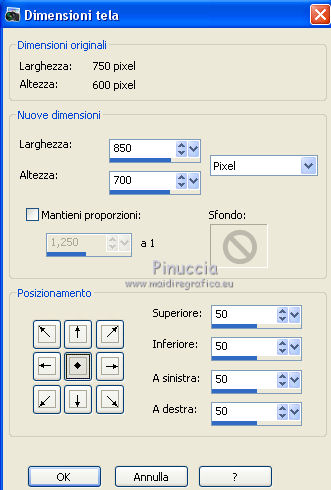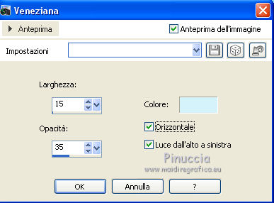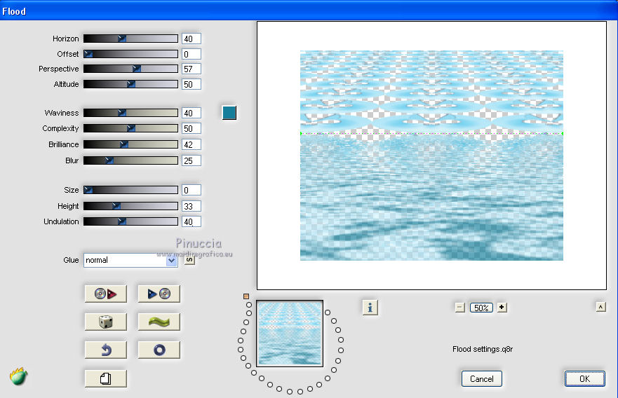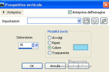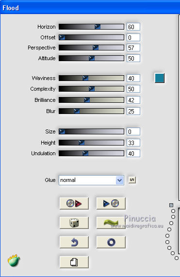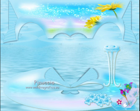 qui puoi trovare qualche risposta ai tuoi dubbi. Se l'argomento che ti interessa non è presente, ti prego di segnalarmelo. Questo tutorial è una creazione di ©Titoune e non può essere copiato su altri siti nè essere offerto per il download. Lo stesso vale per la mia traduzione. Il tutorial è stato creato con PSP X5, e non può essere eseguito con le altre versioni per ottenere lo stesso risultato. Occorrente: Un tube a scelta. Il resto del materiale qui Filtri: Penta.com - Jeans qui Mura's Meister - Perspective Tiling qui Flaming Pear - Flood qui ![]() Questo tutorial può essere realizzato soltanto con PSPX5. 1. Apri l'elemento "image_depart". Duplicalo usando la combinazione di tasti maiuscola+D e chiudi l'originale. La copia sarà la base del tuo lavoro. Livelli>Innalza livello di sfondo. 2. Regola>Sfocatura>Sfocatura gaussiana - raggio 25. ![]() 3. Apri element_perspective1ok e vai a Modifica>Copia. Torna al tuo lavoro e vai a Modifica>Incolla come nuovo livello. Effetti>Effetti 3D>Sfalsa ombra, con il colore #264c68. ![]() 4. Effetti>Effetti di riflesso>Specchio rotante. ![]() Oggetti>Allinea>Superiore. Oggetti>Allinea>A sinistra. 5. Effetti>Effetti di distorsione>Coordinate polari. ![]() Oggetti>Allinea>Centro orizzontale. 6. Effetti>Effetti geometrici>Prospettiva verticale - colore #8bd9f2. ![]() 7. Attiva lo strumento Bacchetta magica , tolleranza 0,e seleziona le parti indicate. ![]() 8. Effetti>Effetti di trama>Veneziana - colore #d5f2fb. ![]() Effetti>Effetti di bordo>Aumenta. 9. Effetti>Effetti 3D>Sfalsa ombra - colore #264c68. ![]() Ripeti l'Effetto Sfalsa ombra, cambiando verticale e orizzontale con -3. Selezione>Deseleziona. 10. Effetti>Effetti geometrici>Sfera. ![]() 11. Effetti>Effetti 3D>Sfalsa ombra - colore #264c68. ![]() Rinomina questo livello "motivo 1". Livelli>Duplica. Immagine>Capovolgi in verticale. Immagine>Allinea>Inferiore. 12. Effetti>Effetti di distorsione>Coordinate polari. ![]() Livelli>Disponi>Sposta giù. 13. Livelli>Duplica, e attiva il livello sottostante dell'originale. Effetti>Plugnis>Mura's Meister - Perspective Tiling. ![]() Abbassa l'opacità di questo livello al 50%. 14. Effetti>Plugins>Flaming Pear - Flood - colore #157f9b. ![]() nel mio esempio ho impostato Horizon a 40, per aumentare la "portata" delle onde. ![]() 15. Attiva il livello della copia. Effetti>Effetti 3D>Sfalsa ombra - colore #755d1d. ![]() Rinomina questo livello "motivo 2". 16. Attiva il livello "motivo 1". Seleziona la parte centrale con la bacchetta magica ,tolleranza tra 5 e 10 ![]() Selezione>Modifica>Contrai - 25 pixels. Selezione>Modifica>Sfuma - 30 pixels. 17. Livelli>Nuovo livello raster. Apri l'immagine "psds208" e vai a Modifica>Copia. Torna al tuo lavoro e vai a Modifica>Incolla nella selezione. Selezione>Deseleziona. Livelli>Duplica. Cambia la modalità di miscelatura di questo livello in luce diffusa. 18. Attiva il livello "motivo 2". Seleziona la parte centrale con la bacchetta magica , con la stessa tolleranza.![]() Selezione>Modifica>Contrai - 25 pixels. Selezione>Modifica>Sfuma - 30 pixels. 19. Livelli>Nuovo livello raster. Apri l'immagine "tuile_spring" e vai a Modifica>Copia. non chiuderlo perchè ti servirà ancora Torna al tuo lavoro e vai a Modifica>Incolla nella selezione. Selezione>Deseleziona. Livelli>Duplica. Cambia la modalità d miscelatura di questo livello in luce diffusa. 20. Attiva il livello superiore. Apri l'elemento graphsabine_design123 e vai a Modifica>Copia. Torna al tuo lavoro e vai a Modifica>Incolla come nuovo livello. Spostalo in basso a destra.Vedi l'esempio finale. Effetti>Effetti 3D>Sfalsa ombra, con i settaggi precedenti. 21. Apri l'elemento stool e vai a Modifica>Copia. Torna al tuo lavoro e vai a Modifica>Incolla come nuovo livello. Spostalo in basso a destra.Vedi l'esempio finale. Effetti>Effetti 3D>Sfalsa ombra, con i settaggi precedenti. 22. Apri l'elemento flowers_blue e vai a Modifica>Copia. Torna al tuo lavoro e vai a Modifica>Incolla come nuovo livello. Sposta anche questo elemento in basso a destra.![]() Effetti>Effetti 3D>Sfalsa ombra, con i settaggi precedenti. 23. Apri l'elemento blue_flowers e vai a Modifica>Copia. Torna al tuo lavoro e vai a Modifica>Incolla come nuovo livello. Immagine>Rifletti. Spostalo a sinistra.Vedi l'esempio finale. Effetti>Effetti 3D>Sfalsa ombra, con i settaggi precedenti. 24. Apri blue_dolfin e vai a Modifica>Copia. Torna al tuo lavoro e vai a Modifica>Incolla come nuovo livello. Spostalo al centro,come nel mio esempio. Effetti>Effetti 3D>Sfalsa ombra, con i settaggi precedenti. 25. Nella paletta dei livelli porta questo livello sotto "motivo 1". ![]() Rimani su questo livello. Apri l'elemento titoune_splash e vai a Modifica>Copia. Torna al tuo lavoro e vai a Modifica>Incolla come nuovo livello. Spostalo sul delfino,come nel mio esempio. ![]() Effetti>Effetti 3D>Sfalsa ombra, con i settaggi precedenti. Livelli>Disponi>Sposta giù (sotto il livello del delfino). 26. Attiva il livello superiore. Apri l'elemento sun and star Shades! St e vai a Modifica>Copia. Torna al tuo lavoro e vai a Modifica>Incolla come nuovo livello. Spostalo in alto a sinistra.Vedi l'esempio finale. Effetti>Effetti 3D>Sfalsa ombra, con i settaggi precedenti. 27. Apri il tuo tube e vai a Modifica>Copia. Torna al tuo lavoro e vai a Modifica>Incolla come nuovo livello. Immagine>Ridimensiona, se e quanto necessario, tutti i livelli non selezionato. Spostalo dove preferisci,o vedi il mio esempio. Effetti>Effetti 3D>Sfalsa ombra, con i settaggi precedenti. 28. Livelli>Nuovo livello raster. Imposta il colore di primo piano con #45aec9, e riempi il livello con questo colore.Selezione>Seleziona tutto. Selezione>Modifica>Contrai - 2 pixels. Premi sulla tastiera il tasto CANC ![]() Selezione>Inverti. Effetti>Plugins>Penta.com - Jeans, con i settaggi standard. ![]() Selezione>Deseleziona. 29. Attiva il livello inferiore. Selezione>Seleziona tutto. Immagine>Ritaglia la selezione. 30. Immagine>Dimensioni tela - 850 x 700 pixels.