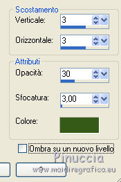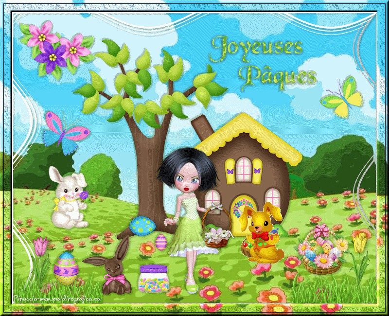 qui puoi trovare qualche risposta ai tuoi dubbi. Se l'argomento che ti interessa non è presente, ti prego di segnalarmelo. Questo tutorial è una creazione di ©Titoune e non può essere copiato su altri siti nè essere offerto per il download. Lo stesso vale per la mia traduzione. Il tutorial è stato creato con PSP X5, ma può essere eseguito anche con le altre versioni di PSP. Secondo la versione utilizzata (anteriore a PSP X) potresti ottenere dei risultati differenti. Dalla versione X4, il comando Immagine>Rifletti è stato sostituito con Immagine>Capovolgi in orizzontale, e il comando Immagine>Capovolgi con Immagine>Capovolgi in verticale. Nelle versioni X5 e X6, le funzioni sono state migliorate rendendo disponibile il menu Oggetti. Con il nuovo X7 sono tornati i comandi Rifletti/Capovolgi, ma con nuove differenze. Vedi la scheda sull'argomento qui Per tradurre il tutorial ho usato PSP X. Occorrente: Un tube a scelta. Il resto del materiale qui Filtri in caso di dubbi, ricorda di consultare la mia sezione filtri qui AAA Frames - Texture Frame qui Animation Shop qui ![]() 1. Apri una nuova immagine trasparente 750 x 600 pixels. Selezione>Seleziona tutto. 2. Apri l'immagine landscape e vai a Modifica>Copia. Torna al tuo lavoro e vai a Modifica>Incolla nella selezione. Selezione>Deseleziona. 3. Apri l'elemento Delicious Easter_FS Element_S and T (1), e vai a Modifica>Copia. Torna al tuo lavoro e vai a Modifica>incolla come nuovo livello. 4. Effetti>Effetti di immagine>Scostamento. ![]() 5. Effetti>Effetti 3D>Sfalsa ombra, colore #365919. ![]() Ripeti l'effetto Sfalsa ombra, cambiando verticale e orizzontale con -3. 6. Apri l'elemento Delicious Easter_FS Element_S and T (4), e vai a Modifica>Copia. Torna al tuo lavoro e vai a Modifica>incolla come nuovo livello. 7. Effetti>Effetti di immagine>Scostamento. ![]() Effetti>Effetti 3D>Sfalsa ombra, con i settaggi precedenti. 8. Apri l'elemento Delicious Easter_FS Element_S and T (6), e vai a Modifica>Copia. Torna al tuo lavoro e vai a Modifica>incolla come nuovo livello. Spostalo in basso.Vedi l'esempio finale. Effetti>Effetti 3D>Sfalsa ombra, con i settaggi precedenti. 9. Apri l'elemento Delicious Easter_FS Element_S and T (9), e vai a Modifica>Copia. Torna al tuo lavoro e vai a Modifica>incolla come nuovo livello. Spostalo a sinistra.Vedi l'esempio finale. Effetti>Effetti 3D>Sfalsa ombra, con i settaggi precedenti. 10. Apri l'elemento Delicious Easter_FS Element_S and T (10), e vai a Modifica>Copia. Torna al tuo lavoro e vai a Modifica>incolla come nuovo livello. Spostalo a destra.Vedi l'esempio finale. Effetti>Effetti 3D>Sfalsa ombra, con i settaggi precedenti. 11. Apri l'elemento 4051887b (paniere uova), e vai a Modifica>Copia. Torna al tuo lavoro e vai a Modifica>incolla come nuovo livello. Spostalo in basso a destra.Vedi l'esempio finale. Effetti>Effetti 3D>Sfalsa ombra, con i settaggi precedenti. Apri l'elemento Delicious Easter_FS Element_S and T (27), e vai a Modifica>Copia. Torna al tuo lavoro e vai a Modifica>incolla come nuovo livello. Spostalo in basso a destra.![]() Effetti>Effetti 3D>Sfalsa ombra, con i settaggi precedenti. 12. Apri l'elemento Delicious Easter_FS Element_S and T (11), e vai a Modifica>Copia. Torna al tuo lavoro e vai a Modifica>incolla come nuovo livello. Spostalo in basso.Vedi l'esempio finale. Effetti>Effetti 3D>Sfalsa ombra, con i settaggi precedenti. 13. Apri l'elemento Delicious Easter_FS Element_S and T (16), e vai a Modifica>Copia. Torna al tuo lavoro e vai a Modifica>incolla come nuovo livello. Spostalo nella parte inferiore.Vedi l'esempio finale. Effetti>Effetti 3D>Sfalsa ombra, con i settaggi precedenti. 14. Apri l'elemento Delicious Easter_FS Element_S and T (28), e vai a Modifica>Copia. Torna al tuo lavoro e vai a Modifica>incolla come nuovo livello. Spostalo in basso a sinistra.![]() Effetti>Effetti 3D>Sfalsa ombra, con i settaggi precedenti. 15. Apri l'elemento Delicious Easter_FS Element_S and T (18), e vai a Modifica>Copia. Torna al tuo lavoro e vai a Modifica>incolla come nuovo livello. Spostalo in basso a sinistra.Vedi l'esempio finale. Effetti>Effetti 3D>Sfalsa ombra, con i settaggi precedenti. 16. Apri l'elemento Delicious Easter_FS Element_S and T (20), e vai a Modifica>Copia. Torna al tuo lavoro e vai a Modifica>incolla come nuovo livello. Spostalo ai piedi dell'albero.Vedi l'esempio finale. Effetti>Effetti 3D>Sfalsa ombra, con i settaggi precedenti. 17. Apri l'elemento Delicious Easter_FS Element_S and T (19), e vai a Modifica>Copia. Torna al tuo lavoro e vai a Modifica>incolla come nuovo livello. Sposta anche questo elemento ai piedi dell'albero.Vedi l'esempio finale. Effetti>Effetti 3D>Sfalsa ombra, con i settaggi precedenti. Apri l'elemento Delicious Easter_FS Element_S and T (7), e vai a Modifica>Copia. Torna al tuo lavoro e vai a Modifica>incolla come nuovo livello. Spostalo a sinistra.![]() Effetti>Effetti 3D>Sfalsa ombra, con i settaggi precedenti. 18. Apri l'elemento Delicious Easter_FS Element_S and T (24), e vai a Modifica>Copia. Torna al tuo lavoro e vai a Modifica>incolla come nuovo livello. Spostalo in alto a sinistra.Vedi l'esempio finale. Effetti>Effetti 3D>Sfalsa ombra, con i settaggi precedenti. 19. Apri l'elemento wordart, e vai a Modifica>Copia. Torna al tuo lavoro e vai a Modifica>incolla come nuovo livello. Spostalo in alto a destra.Vedi l'esempio finale. Effetti>Effetti 3D>Sfalsa ombra, con i settaggi precedenti. 20. Attiva il livello del paesaggio. Apri l'elemento titoune_bordure, e vai a Modifica>Copia. Torna al tuo lavoro e vai a Modifica>incolla come nuovo livello. Effetti>Effetti 3D>Sfalsa ombra, con i settaggi precedenti. 21. Apri il tuo tube, e vai a Modifica>Copia. Torna al tuo lavoro e vai a Modifica>incolla come nuovo livello. Immagine>Ridimensiona, se e quanto necessario, tutti i livelli non selezionato. Spostalo dove preferisci o vedi il mio esempio.Effetti>Effetti 3D>Sfalsa ombra, con i settaggi precedenti. 22. Apri l'elemento bc2a51ae (paniere), e v