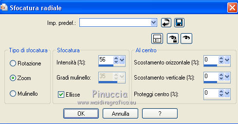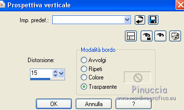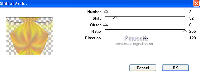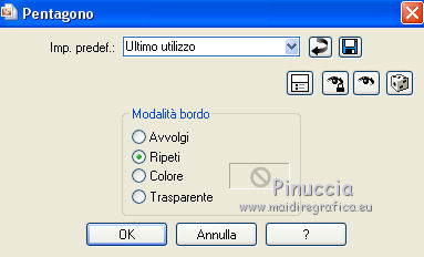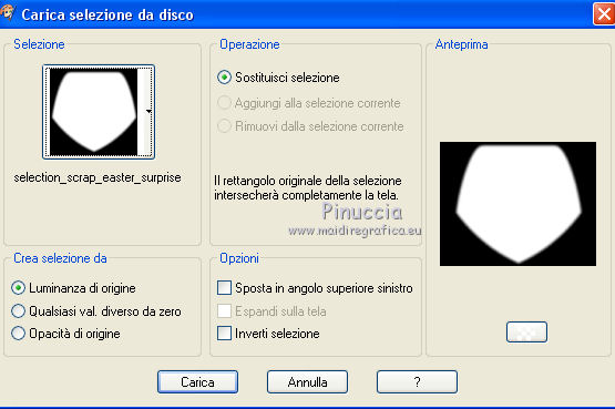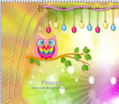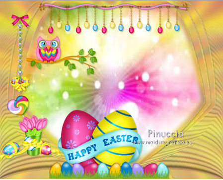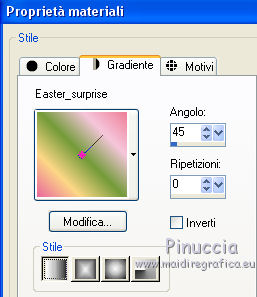 qui puoi trovare qualche risposta ai tuoi dubbi. Se l'argomento che ti interessa non è presente, ti prego di segnalarmelo. Questo tutorial è una creazione di ©Titoune e non può essere copiato su altri siti nè essere offerto per il download. Lo stesso vale per la mia traduzione. Il tutorial è stato creato con PSP X5, ma può essere eseguito anche con le altre versioni di PSP. Secondo la versione utilizzata (anteriore a PSP X) potresti ottenere dei risultati differenti. Vedi la mia scheda riguardante le funzioni Rifletti>Capovolgi in X4 e X5 qui Per tradure il tutorial ho usato PSP X. Occorrente: Un tube a scelta. Il resto del materiale qui Filtri Penta.com - Jeans qui Mura's Seamless - Shift at Arch qui ![]() Metti la selezione nella cartella Selezioni. Metti il gradiente nella cartella Gradienti. 1. Apri una nuova immagine trasparente 750 x 600 pixels. Selezione>Seleziona tutto. 2. Apri l'elemento EP-P6 e vai a Modifica>Copia. Torna al tuo lavoro e vai a Modifica>Incolla nella selezione. Selezione>Deseleziona. 3. Effetti>Effetti di immagine>Motivo unico, con i settaggi standard. ![]() 4. Regola>Sfocatura>Sfocatura radiale. ![]() 5. Regola>Sfocatura>Sfocatura gaussiana - raggio 10. ![]() Livelli>Duplica. 6. Effetti>Effetti geometrici>Prospettiva verticale. ![]() Effetti>Effetti di bordo>Aumenta. 7. Di nuovo Effetti>Effetti geometrici>Prospettiva verticale - 3 volte Avvolgi selezionato. ![]() 8. Effetti>Effetti geometrici>Pentagono. ![]() 9. Effetti>Effetti geometrici>Sfera. ![]() 10. Effetti>Plugins>Mura's Seamless - Shift at Arch. ![]() Immagine>Capovolgi. 11. Effetti>Effetti geometrici>Cilindro orizzontale. ![]() 12. Effetti>Effetti 3D>Sfalsa ombra colore #4c700c. ![]() 13. Selezione>Carica/Salva selezione>Carica selezione da disco. Cerca e seleziona la selezione "scrap_easter_surprise". ![]() 14. Livelli>Nuovo livello raster. Apri l'immagine "imagesPF4FRA8G" e vai a Modifica>Copia. Torna al tuo lavoro e vai a Modifica>Incolla nella selezione. Selezione>Deseleziona. 15. Apri l'elemento EP-5 e vai a Modifica>Copia. Torna al tuo lavoro e vai a Modifica>Incolla come nuovo livello. Spostalo nella parte superiore.Vedi l'esempio finale. Effetti>Effetti 3D>Sfalsa ombra, con i settaggi precedenti. 16. Apri l'elemento EP-43 e vai a Modifica>Copia. Torna al tuo lavoro e vai a Modifica>Incolla come nuovo livello. Spostalo a sinistra.Vedi l'esempio finale. Effetti>Effetti 3D>Sfalsa ombra, con i settaggi precedenti. 17. Attiva lo strumento Gomma ![]() e cancella l'estremità del ramo. Vedi l'esempio finale. 18. Apri l'elemento EP-42 e vai a Modifica>Copia. Torna al tuo lavoro e vai a Modifica>Incolla come nuovo livello. Spostalo a sinistra, sul ramo.![]() Effetti>Effetti 3D>Sfalsa ombra, con i settaggi precedenti. 19. Apri l'elemento EP-44 e vai a Modifica>Copia. Torna al tuo lavoro e vai a Modifica>Incolla come nuovo livello. Spostalo in alto a sinistra.Vedi l'esempio finale. Effetti>Effetti 3D>Sfalsa ombra, con i settaggi precedenti. 20. Apri l'elemento EP-9 e vai a Modifica>Copia. Torna al tuo lavoro e vai a Modifica>Incolla come nuovo livello. Spostalo in basso a sinistra.![]() Effetti>Effetti 3D>Sfalsa ombra, con i settaggi precedenti. 21. Apri l'elemento EP-26 e vai a Modifica>Copia. Torna al tuo lavoro e vai a Modifica>Incolla come nuovo livello. Spostalo in basso a sinistra.Vedi l'esempio finale. Effetti>Effetti 3D>Sfalsa ombra, con i settaggi precedenti. 22. Apri l'elemento EP-3 e vai a Modifica>Copia. Torna al tuo lavoro e vai a Modifica>Incolla come nuovo livello. Spostalo in basso.Vedi l'esempio finale. Effetti>Effetti 3D>Sfalsa ombra, con i settaggi precedenti. 23. Apri l'elemento EP-11 e vai a Modifica>Copia. Torna al tuo lavoro e vai a Modifica>Incolla come nuovo livello. Spostalo in basso.Vedi l'esempio finale. Effetti>Effetti 3D>Sfalsa ombra, con i settaggi precedenti. Porta questo livello sotto il precedente. ![]() 24. Apri l'elemento EP-21 e vai a Modifica>Copia. Torna al tuo lavoro e vai a Modifica>Incolla come nuovo livello. Spostalo in basso.Porta il livello sotto il livello delle uova. ![]() Effetti>Effetti 3D>Sfalsa ombra, con i settaggi precedenti. 25. Attiva il livello superiore. Apri l'elemento EP-40 e vai a Modifica>Copia. Torna al tuo lavoro e vai a Modifica>Incolla come nuovo livello. Spostalo in basso a destra.Vedi l'esempio finale. Effetti>Effetti 3D>Sfalsa ombra, con i settaggi precedenti. 26. Apri l'elemento EP-47 e vai a Modifica>Copia. Torna al tuo lavoro e vai a Modifica>Incolla come nuovo livello. Spostalo in basso a destra.Vedi l'esempio finale. Effetti>Effetti 3D>Sfalsa ombra, con i settaggi precedenti. 27. Apri l'elemento EP-28 e vai a Modifica>Copia. Torna al tuo lavoro e vai a Modifica>Incolla come nuovo livello. Spostalo in basso a destra.Vedi l'esempio finale. Effetti>Effetti 3D>Sfalsa ombra, con i settaggi precedenti. 28. Apri l'elemento EP-4 e vai a Modifica>Copia. Torna al tuo lavoro e vai a Modifica>Incolla come nuovo livello. Spostalo in basso a destra.![]() Effetti>Effetti 3D>Sfalsa ombra, con i settaggi precedenti. 29. Apri l'elemento EP-8 e vai a Modifica>Copia. Torna al tuo lavoro e vai a Modifica>Incolla come nuovo livello. Spostalo in alto a destra.Vedi l'esempio finale. Effetti>Effetti 3D>Sfalsa ombra, con i settaggi precedenti. 30. Apri il tuo tube e vai a Modifica>Copia. Torna al tuo lavoro e vai a Modifica>Incolla come nuovo livello. Immagine>Ridimensiona, se e quanto necessario, tutti i livelli non selezionato. Spostalo dove preferisci,o vedi il mio esempio. Effetti>Effetti 3D>Sfalsa ombra, con i settaggi precedenti. 31. Assicurati di essere posizionato sul livello superiore. Livelli>Nuovo livello raster. Passa il colore di primo piano a Gradiente, e seleziona il gradiente "Easter_surprise". ![]() 32. Selezione>Seleziona tutto. Selezione>Modifica>Contrai - 3 pixels. Premi sulla tastiera il tasto CANC ![]() Selezione>Inverti. 33. Effetti>Plugins>Penta.com - Jeans, con i settaggi standard. ![]() Selezione>Deseleziona. Effetti>Effetti 3
