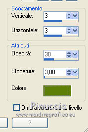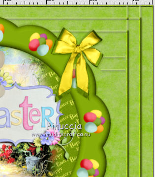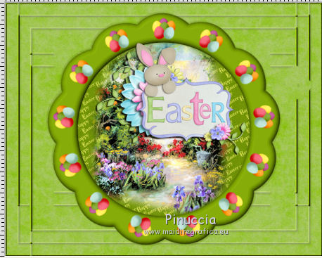 qui puoi trovare qualche risposta ai tuoi dubbi. Se l'argomento che ti interessa non è presente, ti prego di segnalarmelo. Questo tutorial è una creazione di ©Titoune e non può essere copiato su altri siti nè essere offerto per il download. Lo stesso vale per la mia traduzione. Il tutorial è stato creato con PSP X5, ma può essere eseguito anche con le altre versioni di PSP. Secondo la versione utilizzata (anteriore a PSP X) potresti ottenere dei risultati differenti. Vedi la mia scheda riguardante le funzioni Rifletti>Capovolgi in X4 e X5 qui Per tradure il tutorial ho usato PSP X. Occorrente: Un tube a scelta. Il resto del materiale qui ![]() 1. Apri una nuova immagine trasparente 750 x 600 pixels. Selezione>Seleziona tutto. 2. Apri l'elemento DBV Easter paper11 e vai a Modifica>Copia. Torna al tuo lavoro e vai a Modifica>Incolla nella selezione. Selezione>Deseleziona. 3. Apri l'elemento easter_border e vai a Modifica>Copia. Torna al tuo lavoro e vai a Modifica>Incolla come nuovo livello. Lascialo come sta. 4. Apri l'elemento DBV Easter frame12 e vai a Modifica>Copia. Torna al tuo lavoro e vai a Modifica>Incolla come nuovo livello. Lascialo come sta. 5. Attiva lo strumento Bacchetta magica ![]() e clicca al centro della cornice per selezionarla. Selezione>Modifica>Espandi - 5 pixels. Livelli>Nuovo livello raster. Livelli>Disponi>Sposta giù. Apri l'elemento DBV Easter paper5 e vai a Modifica>Copia. Torna al tuo lavoro e vai a Modifica>Incolla nella selezione. Selezione>Deseleziona. 6. Apri l'elemento Bougainville e vai a Modifica>Copia. Torna al tuo lavoro e vai a Modifica>Incolla come nuovo livello. Spostalo al centro.Vedi l'esempio finale. 7. Apri l'elemento KMILL_Eastertitle-shadowed e vai a Modifica>Copia. Torna al tuo lavoro e vai a Modifica>Incolla come nuovo livello. Immagine>Ridimensiona, all'80%, tutti i livelli non selezionato. Spostalo nella cornice.![]() Attiva il livello della cornice. Effetti>Effetti 3D>Sfalsa ombra, colore #5d7f07. ![]() Ripeti l'Effetto Sfalsa ombra, cambiando verticale e orizzontale con -3. 8. Apri l'elemento DBV Easter bow4 e vai a Modifica>Copia. Torna al tuo lavoro e vai a Modifica>Incolla come nuovo livello. Spostalo in alto a destra.Vedi l'esempio finale. Effetti>Effetti 3D>Sfalsa ombra, con i settaggi precedenti. 9. Apri l'elemento DBV Easter bow2 e vai a Modifica>Copia. Torna al tuo lavoro e vai a Modifica>Incolla come nuovo livello. Spostalo sopra l'elemento precedente.![]() Effetti>Effetti 3D>Sfalsa ombra, con i settaggi precedenti. 10. Apri l'elemento DBV Easter egghanger6 e vai a Modifica>Copia. Torna al tuo lavoro e vai a Modifica>Incolla come nuovo livello. Spostalo in alto a destra.Vedi l'esempio finale. Effetti>Effetti 3D>Sfalsa ombra, con i settaggi precedenti. 11. Attiva il livello easter_border (raster 2). Attiva lo strumento Gomma ![]() e cancella la parte dell'elemento che attraversa l'uovo ![]() 12. Apri l'elemento DBV Easter fan2 e vai a Modifica>Copia. Torna al tuo lavoro e vai a Modifica>Incolla come nuovo livello. Spostalo in basso a destra.![]() Effetti>Effetti 3D>Sfalsa ombra, con i settaggi precedenti. Livelli>Duplica. Immagine>Rifletti. Sposta il duplicato un po' più a destra.![]() 13. Apri l'elemento DBV Easter eggbasket1 e vai a Modifica>Copia. Torna al tuo lavoro e vai a Modifica>Incolla come nuovo livello. Spostalo in basso a destra.Vedi l'esempio finale. Effetti>Effetti 3D>Sfalsa ombra, con i settaggi precedenti. 14. Apri l'elemento t2603 e vai a Modifica>Copia. Torna al tuo lavoro e vai a Modifica>Incolla come nuovo livello. Spostalo nella parte inferiore.Vedi l'esempio finale. Effetti>Effetti 3D>Sfalsa ombra, con i settaggi precedenti. 15. Apri l'elemento DBV Easter flower8 e vai a Modifica>Copia. Torna al tuo lavoro e vai a Modifica>Incolla come nuovo livello. Spostalo in basso a sinistra.Vedi l'esempio finale. Effetti>Effetti 3D>Sfalsa ombra, con i settaggi precedenti. 16. Apri l'elemento DBV Easter DBV Easter tulips2 e vai a Modifica>Copia. Torna al tuo lavoro e vai a Modifica>Incolla come nuovo livello. Spostalo in basso a sinistra.![]() Effetti>Effetti 3D>Sfalsa ombra, con i settaggi precedenti. 17. Apri l'elemento DBV Easter butterfly3 e vai a Modifica>Copia. Torna al tuo lavoro e vai a Modifica>Incolla come nuovo livello. Spostalo in alto a sinistra.Vedi l'esempio finale. Effetti>Effetti 3D>Sfalsa ombra, con i settaggi precedenti. 18. Apri l'elemento DBV Easter tag1 e vai a Modifica>Copia. Torna al tuo lavoro e vai a Modifica>Incolla come nuovo livello. Spostalo in alto a sinistra.Vedi l'esempio finale. 19. Attiva lo strumento Gomma ![]() e cancella la parte superiore dell'anello per dare l'impressione che sia infilato nel bordo. ![]() ![]() Effetti>Effetti 3D>Sfalsa ombra, con i settaggi precedenti. 20. Apri il tuo tube e vai a Modifica>Copia. Torna al tuo lavoro e vai a Modifica>Incolla come nuovo livello. Immagine>Ridimensiona, se e quanto necessario, tutti i livelli non selezionato. Spostalo dove preferisci,o vedi il mio esempio. Effetti>Effetti 3D>Sfalsa ombra, con i settaggi precedenti. 21. Firma il tuo lavoro. Livelli>Unisci>Unisci tutto e salva in formato jpg. ![]() Se hai problemi o dubbi, o trovi un link non funzionante, scrivimi. 13 Aprile 2014 |