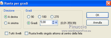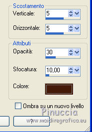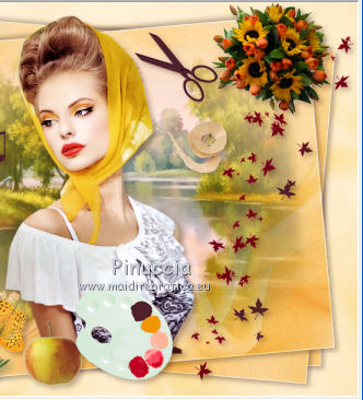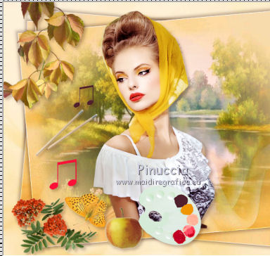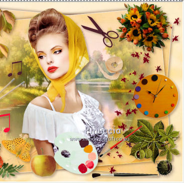 qui puoi trovare qualche risposta ai tuoi dubbi. Se l'argomento che ti interessa non è presente, ti prego di segnalarmelo. Questo tutorial è una creazione di ©Titoune e non può essere copiato su altri siti nè essere offerto per il download. Lo stesso vale per la mia traduzione. Il tutorial è stato creato con PSP X5, ma può essere eseguito anche con le altre versioni di PSP. Secondo la versione utilizzata (anteriore a PSP X) potresti ottenere dei risultati differenti. Vedi la mia scheda riguardante le funzioni Rifletti>Capovolgi in X4 e X5 qui Per tradure il tutorial ho usato PSP X. Occorrente: Un tube a scelta. Il resto del materiale qui I tubes utilizzati sono di Gabry. Filtri: Adjust - Variations qui Penta.com - Color dot qui ![]() 1. Apri una nuova immagine trasparente 750 x 600 pixels. Selezione>Seleziona tutto. 2. Apri l'elemento Papir3 e vai a Modifica>Copia. Torna al tuo lavoro e vai a Modifica>Incolla nella selezione. Selezione>Deseleziona. 3. Livelli>Duplica. Immagine>Ridimensiona, all'85%, tutti i livelli non selezionato. 4. Effetti>Plugins>Adjust - Variations Un clic su Original per annullare eventuali precedenti settaggi memorizzati dal filtro. Quattro clic su Darker e ok. Effetti>Effetti di bordo>Aumenta. 5. Livelli>Duplica. Immagine>Ruota per gradi - 5 gradi a destra. ![]() Di nuovo Livelli>Duplica. Immagine>Rifletti. 6. Selezione>Seleziona tutto. Selezione>Mobile. Selezione>Immobilizza. Selezione>Modifica>Contrai - 35 pixels. Selezione>Modifica>Sfuma - 20 pixels. 7. Livelli>Nuovo livello raster. Apri il tube del paesaggio Gabry-mist-34 e vai a Modifica>Copia. Torna al tuo lavoro e vai a Modifica>Incolla nella selezione. Selezione>Deseleziona. 8. Abbassa l'opacità di questo livello al 53%. Livelli>Duplica, e cambia la modalità di miscelatura di questo livello in Luce diffusa. 9. Sulle tre copie del livello Raster 1: Effetti>Effetti 3D>Sfalsa ombra, colore #451b09. ![]() Ripeti l'Effetto Sfalsa ombra, cambiando verticale e orizzontale con -5. 10. Attiva nuovamente il livello superiore. Apri il tuo tube e vai a Modifica>Copia. Torna al tuo lavoro e vai a Modifica>Incolla come nuovo livello. Immagine>Ridimensiona, se e quanto necessario, tutti i livelli non selezionato. Sposta il tube dove preferisci,o vedi il mio esempio. Livelli>Duplica, e cambia la modalità di miscelatura di questo livello in Luce diffusa. Attiva il livello originale. 11. Effetti>Effetti 3D>Sfalsa ombra, colore #451b09. ![]() Attiva nuovamente il livello superiore. Apri l'elemento listi2 e vai a Modifica>Copia. Torna al tuo lavoro e vai a Modifica>Incolla come nuovo livello. Spostalo in alto a sinistra.![]() Effetti>Effetti 3D>Sfalsa ombra, con i settaggi precedenti. 12. Apri l'elemento nota e vai a Modifica>Copia. Torna al tuo lavoro e vai a Modifica>Incolla come nuovo livello. Spostalo in alto a sinistra.Vedi l'esempio finale. Effetti>Effetti 3D>Sfalsa ombra, con i settaggi precedenti. 13. Apri l'elemento tuzky e vai a Modifica>Copia. Torna al tuo lavoro e vai a Modifica>Incolla come nuovo livello. Spostalo a sinistra, sotto la nota.Vedi l'esempio finale. Effetti>Effetti 3D>Sfalsa ombra, con i settaggi precedenti. 14. Apri l'elemento nota_fialova e vai a Modifica>Copia. Torna al tuo lavoro e vai a Modifica>Incolla come nuovo livello. Spostalo in basso a sinistra.![]() Effetti>Effetti 3D>Sfalsa ombra, con i settaggi precedenti. 15. Apri l'elemento jerabina1 e vai a Modifica>Copia. Torna al tuo lavoro e vai a Modifica>Incolla come nuovo livello. Spostalo nell'angolo in basso a sinistra.Vedi l'esempio finale. Effetti>Effetti 3D>Sfalsa ombra, con i settaggi precedenti. 16. Apri l'elemento motyl e vai a Modifica>Copia. Torna al tuo lavoro e vai a Modifica>Incolla come nuovo livello. Spostalo in basso a sinistra.Vedi l'esempio finale. Effetti>Effetti 3D>Sfalsa ombra, con i settaggi precedenti. 17. Apri l'elemento jablko e vai a Modifica>Copia. Torna al tuo lavoro e vai a Modifica>Incolla come nuovo livello. Spostalo in basso.Vedi l'esempio finale. Effetti>Effetti 3D>Sfalsa ombra, con i settaggi precedenti. 18. Apri l'elemento paleta e vai a Modifica>Copia. Torna al tuo lavoro e vai a Modifica>Incolla come nuovo livello. Spostalo in basso.![]() Effetti>Effetti 3D>Sfalsa ombra, con i settaggi precedenti. 19. Apri l'elemento listi e vai a Modifica>Copia. Torna al tuo lavoro e vai a Modifica>Incolla come nuovo livello. Spostalo nell'angolo in alto a destra.Vedi l'esempio finale. Effetti>Effetti 3D>Sfalsa ombra, con i settaggi precedenti. 20. Apri l'elemento nuzky e vai a Modifica>Copia. Torna al tuo lavoro e vai a Modifica>Incolla come nuovo livello. Spostalo in alto a destra.Vedi l'esempio finale. Effetti>Effetti 3D>Sfalsa ombra, con i settaggi precedenti. 21. Apri l'elemento kytice e vai a Modifica>Copia. Torna al tuo lavoro e vai a Modifica>Incolla come nuovo livello. Spostalo nell'angolo in alto a destra.Vedi l'esempio finale. Effetti>Effetti 3D>Sfalsa ombra, con i settaggi precedenti. 22. Apri l'elemento hoblinky e vai a Modifica>Copia. Torna al tuo lavoro e vai a Modifica>Incolla come nuovo livello. Spostalo in alto a destra, sotto le forbici.![]() Effetti>Effetti 3D>Sfalsa ombra, con i settaggi precedenti. 23. Apri l'elemento hodiny e vai a Modifica>Copia. Torna al tuo lavoro e vai a Modifica>Incolla come nuovo livello. Spostalo in alto a destra.Vedi l'esempio finale. Effetti>Effetti 3D>Sfalsa ombra, con i settaggi precedenti. 24. Apri l'elemento kastanivetvicka, e vai a Modifica>Copia. Torna al tuo lavoro e vai a Modifica>Incolla come nuovo livello. Spostalo in basso a destra.Vedi l'esempio finale. Effetti>Effetti 3D>Sfalsa ombra, con i settaggi precedenti. 25. Apri l'elemento kastan e vai a Modifica>Copia. Torna al tuo lavoro e vai a Modifica>Incolla come nuovo livello. Sposta anche questo elemento in basso a destra.Vedi l'esempio finale. Effetti>Effetti 3D>Sfalsa ombra, con i settaggi precedenti. 26. Apri l'elemento stetec cerveny e vai a Modifica>Copia. Torna al tuo lavoro e vai a Modifica>Inco