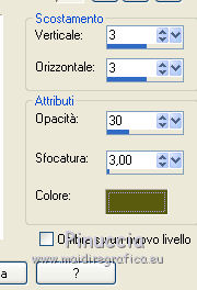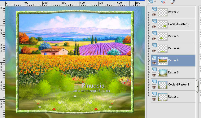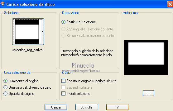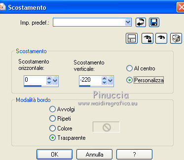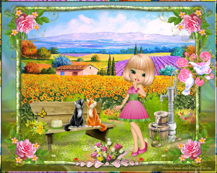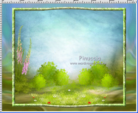 qui puoi trovare qualche risposta ai tuoi dubbi. Se l'argomento che ti interessa non è presente, ti prego di segnalarmelo. Questo tutorial è una creazione di ©Titoune e non può essere copiato su altri siti nè essere offerto per il download. Lo stesso vale per la mia traduzione. Il tutorial è stato creato con Corel17, ma può essere eseguito anche con le altre versioni di PSP. Secondo la versione utilizzata (anteriore a PSP X) potresti ottenere dei risultati differenti. Dalla versione X4, il comando Immagine>Rifletti è stato sostituito con Immagine>Capovolgi in orizzontale, e il comando Immagine>Capovolgi con Immagine>Capovolgi in verticale. Nelle versioni X5 e X6, le funzioni sono state migliorate rendendo disponibile il menu Oggetti. Con il nuovo X7 sono tornati i comandi Rifletti/Capovolgi, ma con nuove differenze. Vedi la scheda sull'argomento qui Per tradurre il tutorial ho usato PSP X. Occorrente: Un tube a scelta. Il resto del materiale qui ![]() Metti la selezione nella cartella Selezioni. 1. Apri una nuova immagine trasparente 750 x 600 pixels. Apri l'elemento "frame", e vai a Modifica>Copia. Torna al tuo lavoro e vai a Modifica>Incolla come nuovo livello. Non spostarlo. 2. Attiva lo strumento Bacchetta magica ![]() e clicca al centro della cornice per selezionarla. Selezione>Modifica>Espandi - 3 pixels. 3. Livelli>Nuovo livello raster. Livelli>Disponi>Sposta giù. 4. Apri l'immagine 1346936440_1-6, e vai a Modifica>Copia. Torna al tuo lavoro e vai a Modifica>Incolla nella selezione. Rinomina questo livello "paesaggio di partenza". Selezione>Inverti. 5. Attiva il livello inferiore. Modifica>Incolla nella selezione (l'immagine è ancora in memoria). Selezione>Deseleziona. Immagine>Rifletti. 6. Effetti>Effetti di riflesso>Specchio rotante. ![]() Livelli>Duplica. Regola>Sfocatura>Sfocatura gaussiana - raggio 25. ![]() 7. Effetti>Effetti di trama>Plastica morbida. ![]() 8. Effetti>Effetti geometrici>Prospettiva verticale. ![]() 9. Attiva il livello superiore della cornice. Apri l'elemento 0_ce28a_bbfe7767_L, e vai a Modifica>Copia. Torna al tuo lavoro e vai a Modifica>Incolla come nuovo livello. 10. Effetti>Effetti di immagine>Scostamento. ![]() Porta questo livello sotto il livello della cornice. ![]() 11. Apri l'elemento 0_ce28d_dfb47e9d_L, e vai a Modifica>Copia. Torna al tuo lavoro e vai a Modifica>Incolla come nuovo livello. Spostalo a sinistra.Livelli>Duplica. Immagine>Rifletti, e posiziona correttamente l'elemento a destra.![]() 12. Attiva il livello della cornice. Selezione>Carica/Salva selezione>Carica selezione da disco. Cerca e carica la selezione "selection_tag_estival". ![]() 13. Livelli>Nuovo livello raster. Apri l'immagine "jean-marc-art-painting-spring-mountain-wallpapers-1440x900" Modifica>Copia. Torna al tuo lavoro e vai a Modifica>Incolla nella selezione. Selezione>Deseleziona. Nella paletta dei livelli porta questo livello sopra il livello del paesaggio di partenza. ![]() 14. Attiva nuovamente il livello della cornice. Effetti>Effetti 3D>Sfalsa ombra, colore #5a5b0f. ![]() Ripeti l'Effetto Sfalsa ombra, cambiando verticale e orizzontale con -3. 15. Apri l'elemento 0_cd747_314839a3_orig (fontana), e vai a Modifica>Copia. Torna al tuo lavoro e vai a Modifica>Incolla come nuovo livello. Spostalo a destra.Vedi l'esempio finale. Effetti>Effetti 3D>Sfalsa ombra, colore #5a5b0f. ![]() 16. Apri l'elemento 0_cd7dc_2eababe_L (panchina), e vai a Modifica>Copia. Torna al tuo lavoro e vai a Modifica>Incolla come nuovo livello. Spostalo a sinistra.Vedi l'esempio finale. Effetti>Effetti 3D>Sfalsa ombra, con i settaggi precedenti. 17. Apri l'elemento 0_b7b1a_c8b3ee21_L (gatti), e vai a Modifica>Copia. Torna al tuo lavoro e vai a Modifica>Incolla come nuovo livello. Spostalo sulla panchina.Vedi l'esempio finale. Effetti>Effetti 3D>Sfalsa ombra, con i settaggi precedenti. 18. Apri l'elemento xyX0dd2287at1O (rose e colombe), e vai a Modifica>Copia. Torna al tuo lavoro e vai a Modifica>Incolla come nuovo livello. Spostalo nella parte destra della cornice.Vedi l'esempio finale. Effetti>Effetti 3D>Sfalsa ombra, con i settaggi precedenti. 19. Apri l'elemento kXHbfbUqk_azXVRkifutqQvKQE0, e vai a Modifica>Copia. Torna al tuo lavoro e vai a Modifica>Incolla come nuovo livello. Spostalo sotto la cornice.Vedi l'esempio finale. Niente Sfalsa ombra. 20. Apri l'elemento roses_corners, e vai a Modifica>Copia. Torna al tuo lavoro e vai a Modifica>Incolla come nuovo livello. Niente Sfalsa ombra. 21. Apri il tuo tube, e vai a Modifica>Copia. Torna al tuo lavoro e vai a Modifica>Incolla come nuovo livello. Immagine>Ridimensiona, se e quanto necessario, tutti i livelli non selezionato. Spostalo dove preferisci o vedi il mio esempio.Effetti>Effetti 3D>Sfalsa ombra, con i settaggi precedenti. 22. Assicurati di essere posizionato sul livello superiore. Selezione>Seleziona tutto. Selezione>Modifica>Contrai - 5 pixels. Selezione>Inverti. 23. Livelli>Nuovo livello raster. Apri nuovamente l'immagine "jean-marc-art-painting-spring-mountain-wallpapers-1440x900" Effetti>Effetti di immagine>Motivo unico, con i settaggi standard. ![]() Modifica>Copia. Torna al tuo lavoro e vai a Modifica>Incolla nella selezione. Selezione>Deseleziona. 24. Effetti>Effetti 3D>Smusso a incasso. ![]() Effetti>Effetti 3D>Sfalsa ombra, con i settaggi precedenti. 25. Firma il tuo lavoro. Livelli>Unisci>Unisci tutto e salva in formato jpg. ![]() Se hai problemi o dubbi, o trovi un link non funzionante, scrivimi. 4 Luglio 2015 |