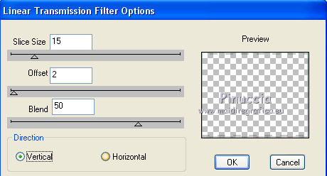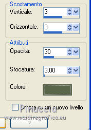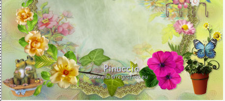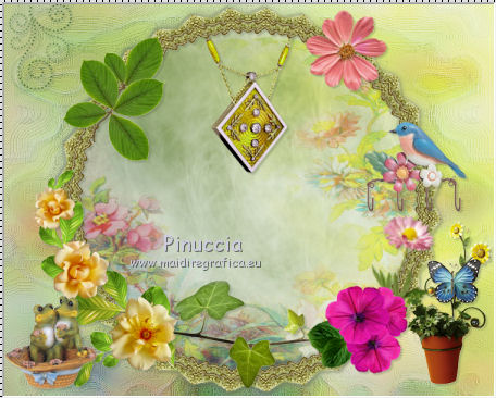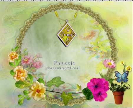 qui puoi trovare qualche risposta ai tuoi dubbi. Se l'argomento che ti interessa non è presente, ti prego di segnalarmelo. Questo tutorial è una creazione di ©Titoune e non può essere copiato su altri siti nè essere offerto per il download. Lo stesso vale per la mia traduzione. Il tutorial è stato creato con PSP X5, ma può essere eseguito anche con le altre versioni di PSP. Secondo la versione utilizzata (anteriore a PSP X) potresti ottenere dei risultati differenti. Dalla versione X4, il comando Immagine>Rifletti è stato sostituito con Immagine>Capovolgi in orizzontale, e il comando Immagine>Capovolgi con Immagine>Capovolgi in verticale. Nelle versioni X5 e X6, le funzioni sono state migliorate rendendo disponibile il menu Oggetti. Vedi la scheda sull'argomento qui Per tradure il tutorial ho usato PSP X. Occorrente: Un tube a scelta. Il resto del materiale qui Filtri in caso di dubbi, ricorda di consultare la mia sezione filtri qui Filters Unlimited 2.0 qui Penta.com - Jeans qui DSB Flux - Linear Transmission qui I filtri Penta.com si possono usare da soli o importati in Filters Unlimited (come fare vedi qui) Se un filtro fornito appare con questa icona ![]() 1. Apri una nuova immagine trasparente 750 x 600 pixels. Apri l'elemento frame e vai a Modifica>Copia. Torna al tuo lavoro e vai a Modifica>Incolla come nuovo livello. Non spostarlo. 2. Attiva lo strumento Bacchetta magica ![]() e clicca al centro della cornice per selezionarla. Selezione>modifica>Espandi - 5 pixels. 3. Livelli>Nuovo livello raster. Livelli>Disponi>Sposta giù. 4. Apri l'elemento paper 2 e vai a Modifica>Copia. Torna al tuo lavoro e vai a Modifica>Incolla nella selezione. Selezione>Deseleziona. 5. Attiva il livello della cornice. Effetti>Effetti 3D>Sfalsa ombra, colore #59664a. ![]() Ripeti l'Effetto Sfalsa ombra, cambiando verticale e orizzontale con -1. 6. Attiva il livello Raster 1. Selezione>Seleziona tutto. Modifica>Incolla nella selezione (l'elemento paper 2 è ancora in memoria). Selezione>Deseleziona. 7. Regola>Sfocatura>Sfocatura gaussiana - raggio 15. ![]() 8. Attiva nuovamente il livello della cornice. Clicca nella parte esterna con la bacchetta magica per selezionarla.![]() 9. Attiva il livello Raster 1. Selezione>Innalza selezione a livello. Selezione>Deseleziona. 10. Effetti>Effetti di trama>Plastica morbida. ![]() Cambia la modalità di miscelatura di questo livello in Luce diffusa. Selezione>Deseleziona. 11. Immagine>Rifletti. Effetti>Effetti di riflesso>Specchio rotante. ![]() Effetti>Effetti di bordo>Aumenta di più. 12. Attiva il livello della cornice. Apri l'elemento "element 15" e vai a Modifica>Copia. Torna al tuo lavoro e vai a Modifica>Incolla come nuovo livello. Spostalo nella parte superiore della cornice.Vedi l'esempio finale. Effetti>Effetti 3D>Sfalsa ombra, colore #59664a. ![]() Livelli>Disponi>Sposta giù. 13. Attiva nuovamente il livello della cornice. Apri l'elemento "element10" e vai a Modifica>Copia. Torna al tuo lavoro e vai a Modifica>Incolla come nuovo livello. Spostalo nella parte inferiore della cornice.Vedi l'esempio finale. Effetti>Effetti 3D>Sfalsa ombra, con i settaggi precedenti. 14. Apri l'elemento "element 8" e vai a Modifica>Copia. Torna al tuo lavoro e vai a Modifica>Incolla come nuovo livello. Spostalo in basso a sinistra.Vedi l'esempio finale. Effetti>Effetti 3D>Sfalsa ombra, con i settaggi precedenti. 15. Apri l'elemento "element 5" e vai a Modifica>Copia. Torna al tuo lavoro e vai a Modifica>Incolla come nuovo livello. Spostalo in basso a destra.Vedi l'esempio finale. Effetti>Effetti 3D>Sfalsa ombra, con i settaggi precedenti. 16. Apri l'elemento "element 1" e vai a Modifica>Copia. Torna al tuo lavoro e vai a Modifica>Incolla come nuovo livello. Spostalo in basso a destra.Vedi l'esempio finale. Effetti>Effetti 3D>Sfalsa ombra, con i settaggi precedenti. 17. Apri l'elemento "element 18" e vai a Modifica>Copia. Torna al tuo lavoro e vai a Modifica>Incolla come nuovo livello. Spostalo in basso a destra.![]() Effetti>Effetti 3D>Sfalsa ombra, con i settaggi precedenti. 18. Apri l'elemento "element 16" e vai a Modifica>Copia. Torna al tuo lavoro e vai a Modifica>Incolla come nuovo livello. Spostalo a destra.Vedi l'esempio finale. Effetti>Effetti 3D>Sfalsa ombra, con i settaggi precedenti. 19. Apri l'elemento "element 7" e vai a Modifica>Copia. Torna al tuo lavoro e vai a Modifica>Incolla come nuovo livello. Spostalo in alto a destra.Vedi l'esempio finale. Effetti>Effetti 3D>Sfalsa ombra, con i settaggi precedenti. 20. Apri l'elemento "element 17" e vai a Modifica>Copia. Torna al tuo lavoro e vai a Modifica>Incolla come nuovo livello. Spostalo in basso a sinistra.![]() Effetti>Effetti 3D>Sfalsa ombra, con i settaggi precedenti. 21. Apri l'elemento "element 9" e vai a Modifica>Copia. Torna al tuo lavoro e vai a Modifica>Incolla come nuovo livello. Spostalo in alto a sinistra.Vedi l'esempio finale. Effetti>Effetti 3D>Sfalsa ombra, con i settaggi precedenti. 22. Apri l'elemento "BNB-ETAO-3" e vai a Modifica>Copia. Torna al tuo lavoro e vai a Modifica>Incolla come nuovo livello. Spostalo in alto a sinistra.![]() Effetti>Effetti 3D>Sfalsa ombra, con i settaggi precedenti. Livelli>Duplica. Immagine>Rifletti. 23. Apri il tuo tube e vai a Modifica>Copia. Torna al tuo lavoro e vai a Modifica>Incolla come nuovo livello. Immagine>Ridimensiona, se e quanto necessario, tutti i livelli non selezionato. Spostalo dove preferisci,o vedi il mio esempio. Effetti>Effetti 3D>Sfalsa ombra, con i settaggi precedenti. 24. Assicurati di essere posizionato sul livello superiore. Livelli>Nuovo livello raster. Selezione>Seleziona tutto. Apri l'elemento paper 4 e vai a Modifica>Copia. Torna al tuo lavoro e vai a Modifica>Incolla nella selezione. 25. Selezione>Modifica>Contrai - 3 pixels. Premi sulla tastiera il tasto CANC ![]() Selezione>Inverti. 26. Effetti>Plugins>Penta.com - Jeans, con i settaggi standard. ![]() Effetti>Effetti di bordo>Aumenta. 27. Effetti>Plugins>DSB Flux - Linear Trans