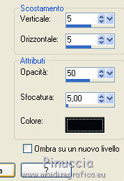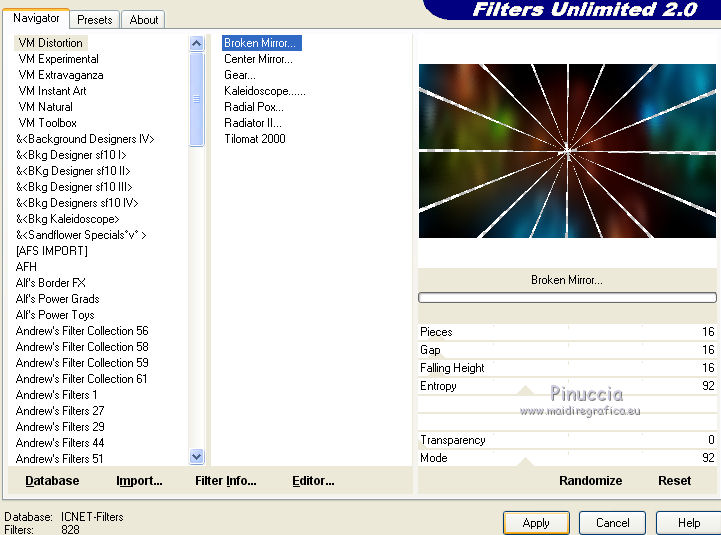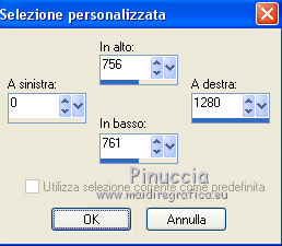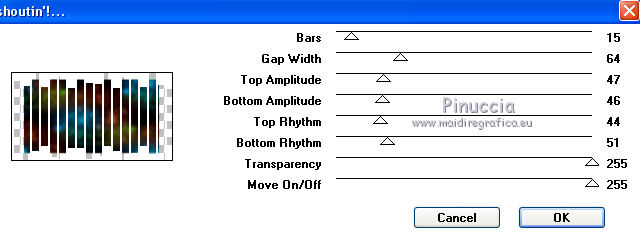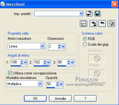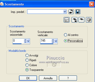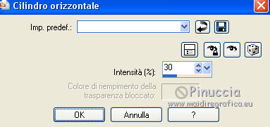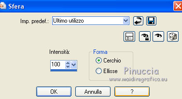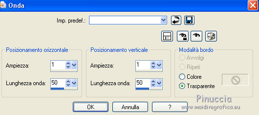 qui puoi trovare qualche risposta ai tuoi dubbi. Se l'argomento che ti interessa non è presente, ti prego di segnalarmelo. Questo tutorial è una creazione di ©Titoune e non può essere copiato su altri siti nè essere offerto per il download. Lo stesso vale per la mia traduzione. Il tutorial è stato creato con PSP X5, ma può essere eseguito anche con le altre versioni di PSP. Secondo la versione utilizzata (anteriore a PSP X) potresti ottenere dei risultati differenti. Vedi la mia scheda riguardante le funzioni Rifletti>Capovolgi in X4, X5 e X6 qui Per tradure il tutorial ho usato PSP X. Occorrente: Un tube a scelta. Il resto del materiale qui Il tube utilizzato è di Ivo. Filtri in caso di dubbi, ricorda di consultare la mia sezione filtri qui Flaming Pear - Flexify 2 qui Simple - Left Right Wrap (bonus) qui VM Extravaganza - Shoutin qui VM Distortion - Broken Mirror qui Filters Unlimited 2.0 qui I filtri VM Extravaganza, VM Distortion e Simple si possono usare da soli o importati in Filters Unlimited (come fare vedi qui) Se un filtro fornito appare con questa icona ![]() 1. Apri una nuova immagine trasparente 1280 x 700 pixels. Selezione>Seleziona tutto. 2. Apri l'immagine 205de87b e vai a Modifica>Copia. Torna al tuo lavoro e vai a Modifica>Incolla nella selezione. Selezione>Deseleziona. 3. Effetti>Effetti di immagine>Motivo unico, con i settaggi standard. ![]() Regola>Sfocatura>Sfocatura gaussiana - raggio 15. ![]() Livelli>Duplica. 4. Immagine>Ridimensiona, all'85%, tutti i livelli non selezionato. Effetti>Effetti di bordo>Aumenta. 5. Effetti>Plugins>VM Extravaganza - Shoutin, con i settaggi standard. ![]() 6. Attiva lo strumento Bacchetta magica ![]() e clicca nella parte bianca per selezionarla. ![]() Premi sulla tastiera il tasto CANC ![]() Selezione>Deseleziona. 7. Effetti>Effetti 3D>Sfalsa ombra, colore #0d5f6f. ![]() Effetti>Plugins>Simple - Left Right Wrap. 8. Effetti>Effetti geometrici>Prospettiva verticale. ![]() Modifica>Ripeti Prospettiva verticale. 9. Effetti>Effetti geometrici>Sfera. ![]() 10. Effetti>Effetti di distorsione>Coordinate polari. ![]() 11. Immagine>Ridimensiona, al 90%, tutti i livelli non selezionato. Regola>Messa a fuoco>Metti a fuoco. Rinomina questo livello "coordinate polari". 12. Attiva lo strumento Bacchetta magica ![]() e clicca nell'immagine per selezionarla. ![]() 13. Attiva il livello inferiore. Selezione>Innalza selezione a livello. Selezione>Deseleziona. 14. Effetti>Effetti geometrici>Inclina. ![]() Immagine>Capovolgi. Effetti>Effetti di bordo>Aumenta. 15. Effetti>Effetti di riflesso>Specchio rotante. ![]() Rinomina questo livello "motivo". 16. Livelli>Duplica. Attiva il livello originale "motivo". 17. Effetti>Plugins>Flaming Pear - Flexify 2. ![]() 18. Attiva il livello inferiore. Modifica>Taglia (questo comando, oltre a tagliare, tiene anche in memoria). Selezione>Seleziona tutto. Immagine>Ritaglia la selezione. 19. Immagine>Dimensioni tela - 1280 x 1500 pixels. ![]() Selezione>Seleziona tutto. Modifica>Incolla nella selezione. Selezione>Deseleziona. 20. Attiva nuovamente il livello "motivo". Immagine>Capovolgi. 21. Effetti>Effetti di immagine>Scostamento. ![]() Livelli>Duplica. Immagine>Capovolgi. 22. Effetti>Effetti di immagine>Scostamento. ![]() Livelli>Unisci>Unisci giù. 23. Effetti>Effetti 3D>Sfalsa ombra, colore #00090c. ![]() 24. Attiva il livello soprastante "copia di motivo". Modifica>Ripeti Sfalsa ombra. 25. Attiva il livello superiore "coordinate polari". Effetti>Effetti di immagine>Scostamento. ![]() 26. Effetti>Effetti geometrici>Cilindro orizzontale. ![]() Effetti>Effetti 3D>Sfalsa ombra, con i settaggi precedenti. 27. Attiva il livello inferiore. Attiva lo strumento Selezione ![]() clicca sull'icona Selezione personalizzata ![]() e imposta i seguenti settaggi. ![]() Selezione>Innalza selezione a livello. 28. Effetti>Plugins>Filters Unlimited 2.0 - VM Distortion - Broken Mirror con i settaggi standard. ![]() Selezione>Deseleziona. Effetti>Effetti di bordo>Aumenta. Effetti>Effetti 3D>Sfalsa ombra, con i settaggi precedenti. 29. Attiva nuovamente il livello inferiore. Selezione personalizzata ![]() ![]() Selezione>Innalza selezione a livello. Livelli>Disponi>Porta in alto. 30. Effetti>Effetti artistici>Mezzitoni. ![]() Effetti>Effetti di distorsione>Onda. ![]() Selezione>Deseleziona. Livelli>Duplica. Immagine>Rifletti. Livelli>Unisci>Unisci giù. 31. Effetti>Effetti 3D>Sfalsa ombra, colore #0d5f6f. ![]() 32. Apri il tuo tube e vai a Modifica>Copia. Torna al tuo lavoro e vai a Modifica>Incolla come nuovo livello. Immagine>Ridimensiona, se e quanto necessario, tutti i livelli non selezionato. Posiziona il tube al centro del top.Effetti>Effetti 3D>Sfalsa ombra, colore #00090c. ![]() Firma il tuo lavoro. Livelli>Unisci>Unisci tutto e salva in formato jpg. ![]() Se hai problemi o dubbi, o trovi un link non funzionante, scrivimi. 24 Novembre 2013 |
