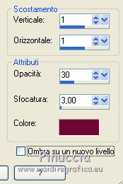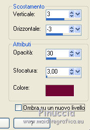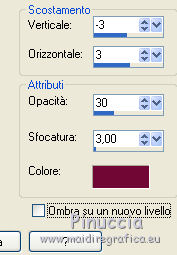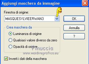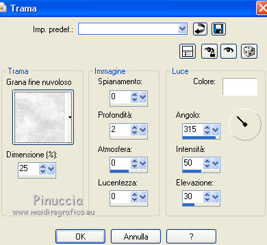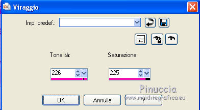 qui puoi trovare qualche risposta ai tuoi dubbi. Se l'argomento che ti interessa non è presente, ti prego di segnalarmelo. Questo tutorial è una creazione di ©Titoune e non può essere copiato su altri siti nè essere offerto per il download. Lo stesso vale per la mia traduzione. Il tutorial è stato creato con PSP X5, ma può essere eseguito anche con le altre versioni di PSP. Secondo la versione utilizzata (anteriore a PSP X) potresti ottenere dei risultati differenti. Dalla versione X4, il comando Immagine>Rifletti è stato sostituito con Immagine>Capovolgi in orizzontale, e il comando Immagine>Capovolgi con Immagine>Capovolgi in verticale. Nelle versioni X5 e X6, le funzioni sono state migliorate rendendo disponibile il menu Oggetti. Vedi la scheda sull'argomento qui Per tradure il tutorial ho usato PSP X. Occorrente: Un tube a scelta. Il resto del materiale qui Il tube utilizzato è di GranGran. Filtri Penta.com - Jeans qui ![]() La trama Feine Körnung-verschleiert corrisponde alla trama standard Grana fine nuvoloso. Se non la trovi nel tuo PSP, metti quella fornita nella cartella trame. Apri la maschera in PSP e minimizzala con il resto del materiale. 1. Imposta il colore di primo piano con #fed7f2, e il colore di sfondo con #cb0d8d. Prendi nota dei valori di tonalità (H) e saturazione (S) di uno dei due colori (per l'esempio quelli del colore di primo piano) che ti serviranno per colorizzare gli elementi. 2. Apri una nuova immagine trasparente 800 x 650 pixels, e riempila con il colore di sfondo.3. Livelli>Nuovo livello raster. Riempi con il colore di primo piano.Livelli>Nuovo livello maschera>Da immagine. Apri il menu sotto la finestra di origine e vedrai la lista dei files aperti. Seleziona la maschera MASQUESYLVIEERWAN3, con i seguenti settaggi. ![]() Livelli>Unisci>Unisci gruppo. 4. Effetti>Effetti di trama>Trama - seleziona la trama Grana fine nuvoloso, con i seguenti settaggi. ![]() 5. Apri l'elemento DS_PurpleMini_Frame Round e vai a Modifica>Copia. Torna al tuo lavoro e vai a Modifica>Incolla come nuovo livello. 6. Regola>Tonalità e saturazione>Viraggio. ![]() 7. Effetti>Effetti 3D>Sfalsa ombra, colore 710736. ![]() Ripeti l'Effetto Sfalsa ombra, cambiando verticale e orizzontale con -3/3. ![]() 8. Attiva lo strumento Bacchetta magica ![]() e clicca al centro della maschera per selezionarla. Selezione>Modifica>Espandi - 2 pixels. Livelli>Nuovo livello raster. Livelli>Disponi>Sposta giù. 9. Apri l'immagine mOmRove, e vai a Modifica>Copia. Torna al tuo lavoro e vai a Modifica>Incolla nella selezione. Selezione>Deseleziona. 10. Attiva nuovamente il livello superiore. Apri l'elemento DS_PurpleMini_Frame Round-2 e vai a Modifica>Copia. Torna al tuo lavoro e vai a Modifica>Incolla come nuovo livello. Regola>Tonalità e saturazione>Viraggio, con i settaggi precedenti. Immagine>Ridimensiona, al 95%, tutti i livelli non selezionato. Effetti>Effetti 3D>Sfalsa ombra, con i settaggi precedenti. ![]() 11. Apri l'elemento l'élément DS_PurpleMini_Calla Lilies-3 e vai a Modifica>Copia. Torna al tuo lavoro e vai a Modifica>Incolla come nuovo livello. Spostalo a destra.Vedi l'esempio finale. Effetti>Effetti 3D>Sfalsa ombra, colore #710736. ![]() 12. Apri l'elemento DS_PurpleMini_Ribbon Flower2, e vai a Modifica>Copia. Torna al tuo lavoro e vai a Modifica>Incolla come nuovo livello. Spostalo sotto i fiori.![]() Effetti>Effetti 3D>Sfalsa ombra, con i settaggi precedenti. 13. Apri il tube angeledesign_decor2 e vai a Modifica>Copia. Torna al tuo lavoro e vai a Modifica>Incolla come nuovo livello. (cancella la firma) Spostalo in basso a destra.Vedi l'esempio finale. Effetti>Effetti 3D>Sfalsa ombra, con i settaggi precedenti. 14. Apri l'elemento DS_PurpleMini_Flower2 e vai a Modifica>Copia. Torna al tuo lavoro e vai a Modifica>Incolla come nuovo livello. Spostalo in basso.![]() Effetti>Effetti 3D>Sfalsa ombra, con i settaggi precedenti. Livelli>Duplica. Sposta questo elemento sulla cornice in alto a sinistra.Vedi l'esempio finale. 15. Apri l'elemento DS_PurpleMini_Branch w Flowers e vai a Modifica>Copia. Torna al tuo lavoro e vai a Modifica>Incolla come nuovo livello. Spostalo in alto.Vedi l'esempio finale. Effetti>Effetti 3D>Sfalsa ombra, con i settaggi precedenti. 16. Apri l'elemento DS_PurpleMini_Ribbon Flower, e vai a Modifica>Copia. Torna al tuo lavoro e vai a Modifica>Incolla come nuovo livello. Spostalo in alto a destra.![]() Effetti>Effetti 3D>Sfalsa ombra, con i settaggi precedenti. 17. Apri gli elementi "wordart_bonnefeteok" e "wordart_mamanok" e vai a Modifica>Copia. Torna al tuo lavoro e vai a Modifica>Incolla come nuovo livello. Sposta questi elementi al centro del cuore.Vedi l'esempio finale. Su entrambi i livelli: Effetti>Effetti 3D>Sfalsa ombra, colore #710736. ![]() 18. Apri il tuo tube e vai a Modifica>Copia. Torna al tuo lavoro e vai a Modifica>Incolla come nuovo livello. Immagine>Ridimensiona, se e quanto necessario, tutti i livelli non selezionato. Spostalo dove preferisci,o vedi il mio esempio. 19. Effetti>Effetti 3D>Sfalsa ombra, colore 710736. ![]() 20. Attiva il livello Raster 1. Selezione>Seleziona tutto. Selezione>Modifica>Contrai - 3 pixels. Selezione>Inverti. Selezione>Innalza selezione a livello. Livelli>Disponi>Porta in alto. 21. Selezione>Deseleziona. Effetti>Plugins>Penta.com - Jeans, con i settaggi standard. ![]() 22. Effetti>Effetti 3D>Sfalsa ombra, con i settaggi precedenti. Firma il tuo lavoro. Livelli>Unisci>Unisci tutto e salva in formato jpg. ![]() Se hai problemi o dubbi, o trovi un link non funzionante, scrivimi. 16 Maggio 2014 |