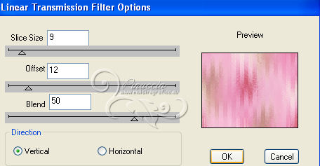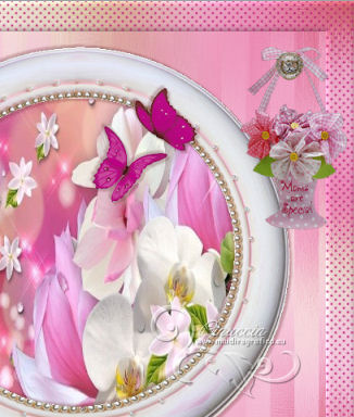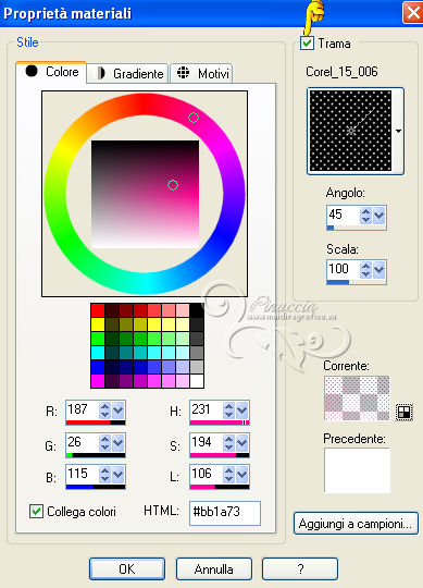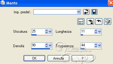 qui puoi trovare qualche risposta ai tuoi dubbi. Se l'argomento che ti interessa non è presente, ti prego di segnalarmelo. Questo tutorial è una creazione di ©Titoune e non può essere copiato su altri siti nè essere offerto per il download. Lo stesso vale per la mia traduzione. Il tutorial è stato creato con PSP X5, ma può essere eseguito anche con le altre versioni di PSP. Secondo la versione utilizzata (anteriore a PSP X) potresti ottenere dei risultati differenti. Per tradurlo, ho usato PSP X. Grazie ai creatori dei tubes che mettono a disposizione il loro lavoro in vari gruppi di condivisione. Rispetta il lavoro degli autori, non cambiare il nome del file e non cancellare il watermark. Occorrente: Un tube a scelta. Il resto del materiale qui Il tube utilizzato è di Jer. Filtri: DSB Flux - Linear Transmission qui ![]() 1. Imposta il colore di primo piano con #bb1a73, seleziona Trama, e imposta la trama Griglia (nelle versioni più recenti di PSP corrisponde a Corel_15_006), con i seguenti settaggi. ![]() 2. Apri una nuova immagine bianca 750 x 600 pixels. ![]() Selezione>Seleziona tutto. Livelli>Nuovo livello raster. 3. Apri l'elemento MDK(18) e vai a Modifica>Copia. Torna al tuo lavoro e vai a Modifica>Incolla nella selezione. Selezione>Deseleziona. 4. Effetti>Effetti di immagine>Motivo unico, con i settaggi standard. ![]() 5. Regola>Sfocatura>Sfocatura gaussiana - raggio 35. ![]() 6. Effetti>Effetti di trama>Manto. ![]() Effetti>Effetti di bordo>Aumenta. Rinomina questo livello "base". 7. Selezione>Seleziona tutto. Selezione>Modifica>Contrai - 35 pixels. Selezione>Inverti. Modifica>Taglia (questo comando oltre a tagliare tiene anche in memoria). Selezione>Deseleziona. Modifica>Incolla come nuovo livello. 8. Effetti>Effetti 3D>Smusso a incasso. ![]() 9. Di nuovo Selezione>Seleziona tutto. Selezione>Modifica>Contrai - 35 pixels. Selezione>Inverti. Livelli>Nuovo livello raster. Riempi con il colore+trama.Selezione>Deseleziona. 10. Attiva il livello "base". ![]() Livelli>Duplica. Selezione>Seleziona tutto. Selezione>Mobile. Selezione>Immobilizza. 11. Effetti>Plugins>DSB Flux - Linear Transmission. ![]() Selezione>Deseleziona. 12. Attiva il livello superiore. Apri l'elemento MDK (87) e vai a Modifica>Copia. Torna al tuo lavoro e vai a Modifica>Incolla come nuovo livello. Spostalo a destra.13. Effetti>Effetti 3D>Sfalsa ombra, con il colore #6c2d30. Ripeti l'Effetto Sfalsa ombra, cambiando verticale e orizzontale con -3. Rinomina il livello "cornice". 14. Attiva lo strumento Bacchetta magica ![]() e clicca al centro della cornice per selezionarla. Selezione>Modifica>Espandi - 10 pixels. Livelli>Nuovo livello raster. Livelli>Disponi>Sposta giù. 15. Apri l'immagine c04a5f82 e vai a Modifica>Copia. Torna al tuo lavoro e vai a Modifica>Incolla nella selezione. Selezione>Deseleziona. 16. Attiva nuovamente il livello superiore. Apri l'elemento Butterflies e vai a Modifica>Copia. Torna al tuo lavoro e vai a Modifica>Incolla come nuovo livello. Sposta anche questo elemento sopra la cornice.Vedi l'esempio finale. Effetti>Effetti 3D>Sfalsa ombra, con i settaggi precedenti. 17. Apri l'elemento MDK (44) e vai a Modifica>Copia. Torna al tuo lavoro e vai a Modifica>Incolla come nuovo livello. Spostalo in alto a destra.![]() Effetti>Effetti 3D>Sfalsa ombra, con i settaggi precedenti. 18. Apri l'elemento MDK (11) e vai a Modifica>Copia. Torna al tuo lavoro e vai a Modifica>Incolla come nuovo livello. Spostalo in basso a destra.Vedi l'esempio finale. Effetti>Effetti 3D>Sfalsa ombra, con i settaggi precedenti. 19. Apri l'elemento MDK (46) e vai a Modifica>Copia. Torna al tuo lavoro e vai a Modifica>Incolla come nuovo livello. Sposta anche questo elemento in basso a destra.![]() Effetti>Effetti 3D>Sfalsa ombra, con i settaggi precedenti. 20. Apri l'elemento MDK (1) e vai a Modifica>Copia. Torna al tuo lavoro e vai a Modifica>Incolla come nuovo livello. Sposta anche questo elemento in basso.![]() Effetti>Effetti 3D>Sfalsa ombra, con i settaggi precedenti. 21. Apri l'elemento MDK (2) e vai a Modifica>Copia. Torna al tuo lavoro e vai a Modifica>Incolla come nuovo livello. Spostalo in basso.Vedi l'esempio finale. Effetti>Effetti 3D>Sfalsa ombra, con i settaggi precedenti. 22. Apri l'elemento MDK (33) e vai a Modifica>Copia. Torna al tuo lavoro e vai a Modifica>Incolla come nuovo livello. Sposta anche questo elemento in basso.![]() Effetti>Effetti 3D>Sfalsa ombra, con i settaggi precedenti. 23. Apri l'elemento MDK (43) e vai a Modifica>Copia. Torna al tuo lavoro e vai a Modifica>Incolla come nuovo livello. Sposta l'elemento in basso.Vedi l'esempio finale. Effetti>Effetti 3D>Sfalsa ombra, con i settaggi precedenti. 24. Apri l'elemento MDK (41) e vai a Modifica>Copia. Torna al tuo lavoro e vai a Modifica>Incolla come nuovo livello. Spostalo in basso a sinistra.![]() Effetti>Effetti 3D>Sfalsa ombra, con i settaggi precedenti. 25. Apri l'elemento MDK (19) e vai a Modifica>Copia. Torna al tuo lavoro e vai a Modifica>Incolla come nuovo livello. Spostalo in alto a sinistra sulla cornice.Vedi l'esempio finale. Effetti>Effetti 3D>Sfalsa ombra, con i settaggi precedenti. Apri l'elemento MDK (62) e vai a Modifica>Copia. Torna al tuo lavoro e vai a Modifica>Incolla come nuovo livello. Spostalo in alto a sinistra.![]() Effetti>Effetti 3D>Sfalsa ombra, con i settaggi precedenti. 26. Apri l'elemento MDK (4) e vai a Modifica>Copia. Torna al tuo lavoro e vai a Modifica>Incolla come nuovo livello. Spostalo in alto a sinistra.Vedi l'esempio finale. Effetti>Effetti 3D>Sfalsa ombra, con i settaggi precedenti. Livelli>Duplica. Immagine>Rifletti. Spostalo in basso a destra.27. Attiva il livello "cornice". Apri il tuo tube e vai a Modifica>Copia. Torna al tuo lavoro e vai a Modifica>Incolla come nuovo livello. Immagine>Ridimensiona, se e quanto necessario, tutti i livelli non selezionato. Spostalo dove preferisci,o vedi il mio esempio. Effetti>Effetti 3D>Sfalsa ombra, con i settaggi precedenti. 28. Attiva il livello superiore. 