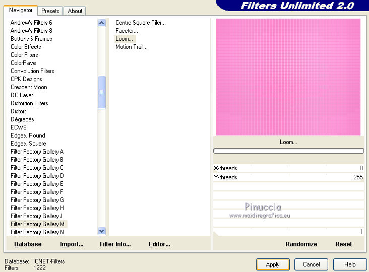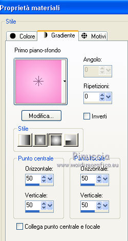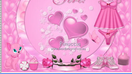 qui puoi trovare qualche risposta ai tuoi dubbi. Se l'argomento che ti interessa non è presente, ti prego di segnalarmelo. Questo tutorial è una creazione di ©Titoune e non può essere copiato su altri siti nè essere offerto per il download. Lo stesso vale per la mia traduzione. Il tutorial è stato creato con PSP X5, ma può essere eseguito anche con le altre versioni di PSP. Secondo la versione utilizzata (anteriore a PSP X) potresti ottenere dei risultati differenti. Dalla versione X4, il comando Immagine>Rifletti è stato sostituito con Immagine>Capovolgi in orizzontale, e il comando Immagine>Capovolgi con Immagine>Capovolgi in verticale. Nelle versioni X5 e X6, le funzioni sono state migliorate rendendo disponibile il menu Oggetti. Con il nuovo X7 sono tornati i comandi Rifletti/Capovolgi, ma con nuove differenze. Vedi la scheda sull'argomento qui Per tradurre il tutorial ho usato PSP X. Occorrente: Un tube a scelta. Il resto del materiale qui Filtri in caso di dubbi, ricorda di consultare la mia sezione filtri qui Filter Factory Gallery M - Loom qui Filters Unlimited 2.0 qui I filtri Factory Gallery si possono usare da soli o importati in Filters Unlimited (come fare vedi qui) Se un filtro fornito appare con questa icona ![]() 1. Imposta il colore di primo piano con #ffcef3, e il colore di sfondo con #f887cc. Passa il colore di primo piano a Gradiente di primo piano/sfondo, stile Sprazzo di luce. ![]() 2. Apri una nuova immagine trasparente 750 x 600 pixels, e riempila con il gradiente.3. Apri l'elemento heart_textures, e vai a Modifica>Copia. Torna al tuo lavoro e vai a Modifica>Incolla come nuovo livello. Lascialo come sta. Non spostarlo. Rinomina questo livello "cuori". 4. Apri l'elemento frame, e vai a Modifica>Copia. Torna al tuo lavoro e vai a Modifica>Incolla come nuovo livello. Non spostarlo. Effetti>Effetti 3D>Sfalsa ombra, colore #552742. ![]() Ripeti l'Effetto Sfalsa ombra, cambiando verticale e orizzontale con -3. 6. Apri l'elemento Valentines_Day_Hearts_Decoration_PNG_Clipartt, e vai a Modifica>Copia. Torna al tuo lavoro e vai a Modifica>Incolla come nuovo livello. Spostalo un po' più in basso.Vedi l'esempio finale. Effetti>Effetti 3D>Sfalsa ombra, colore #552742. ![]() Porta questo livello sotto il livello della cornice. 7. Apri l'elemento Raster 23, e vai a Modifica>Copia. Torna al tuo lavoro e vai a Modifica>Incolla come nuovo livello. Spostalo nella parte superiore della cornice.Vedi l'esempio finale. Effetti>Effetti 3D>Sfalsa ombra, con i settaggi precedenti. 8. Apri l'elemento Raster 11, e vai a Modifica>Copia. Torna al tuo lavoro e vai a Modifica>Incolla come nuovo livello. Spostalo nella parte destra interna della cornice.Vedi l'esempio finale. Effetti>Effetti 3D>Sfalsa ombra, con i settaggi precedenti. 9. Attiva nuovamente il livello superiore della cornice. Apri l'elemento Raster 3, e vai a Modifica>Copia. Torna al tuo lavoro e vai a Modifica>Incolla come nuovo livello. Spostalo nella parte superiore della cornice.Vedi l'esempio finale. Effetti>Effetti 3D>Sfalsa ombra, con i settaggi precedenti. 10. Apri l'elemento Raster17, e vai a Modifica>Copia. Torna al tuo lavoro e vai a Modifica>Incolla come nuovo livello. Spostalo nella parte inferiore della cornice.![]() Effetti>Effetti 3D>Sfalsa ombra, con i settaggi precedenti. Livelli>Duplica Immagine>Rifletti. 11. Apri l'elemento Raster13, e vai a Modifica>Copia. Torna al tuo lavoro e vai a Modifica>Incolla come nuovo livello. Spostalo nella parte destra della cornice.Vedi l'esempio finale. Effetti>Effetti 3D>Sfalsa ombra, con i settaggi precedenti. 12. Apri l'elemento Raster16, e vai a Modifica>Copia. Torna al tuo lavoro e vai a Modifica>Incolla come nuovo livello. Spostalo nella parte destra della cornice.Vedi l'esempio finale. Effetti>Effetti 3D>Sfalsa ombra, con i settaggi precedenti. 13. Apri l'elemento Raster10, e vai a Modifica>Copia. Torna al tuo lavoro e vai a Modifica>Incolla come nuovo livello. Spostalo nella parte inferiore destra della cornice.![]() Effetti>Effetti 3D>Sfalsa ombra, con i settaggi precedenti. 14. Apri l'elemento Raster7, e vai a Modifica>Copia. Torna al tuo lavoro e vai a Modifica>Incolla come nuovo livello. Spostalo nella parte inferiore destra della cornice.Vedi l'esempio finale. Effetti>Effetti 3D>Sfalsa ombra, con i settaggi precedenti. 15. Apri l'elemento Raster1, e vai a Modifica>Copia. Torna al tuo lavoro e vai a Modifica>Incolla come nuovo livello. Spostalo nella parte inferiore della cornice.Vedi l'esempio finale. Effetti>Effetti 3D>Sfalsa ombra, con i settaggi precedenti. 16. Apri l'elemento Raster15, e vai a Modifica>Copia. Torna al tuo lavoro e vai a Modifica>Incolla come nuovo livello. Spostalo nella parte inferiore della cornice.Vedi l'esempio finale. Effetti>Effetti 3D>Sfalsa ombra, con i settaggi precedenti. 17. Apri l'elemento Raster2, e vai a Modifica>Copia. Torna al tuo lavoro e vai a Modifica>Incolla come nuovo livello. Spostalo nella parte inferiore sinistra della cornice.![]() Effetti>Effetti 3D>Sfalsa ombra, con i settaggi precedenti. 18. Apri l'elemento Raster18, e vai a Modifica>Copia. Torna al tuo lavoro e vai a Modifica>Incolla come nuovo livello. Spostalo nella parte sinistra della cornice.Vedi l'esempio finale. Effetti>Effetti 3D>Sfalsa ombra, con i settaggi precedenti. Livelli>Duplica. Immagine>Rifletti. Posiziona correttamente il duplicato.19. Apri l'elemento bow3, e vai a Modifica>Copia. Torna al tuo lavoro e vai a Modifica>Incolla come nuovo livello. Spostalo sopra le rose.![]() Effetti>Effetti 3D>Sfalsa ombra, con i settaggi precedenti. 20. Apri l'elemento Raster6, e vai a Modifica>Copia. Torna al tuo lavoro e vai a Modifica>Incolla come nuovo livello. Spostalo nella parte superiore sinistra della cornice.Vedi l'esempio finale. Effetti>Effetti 3D>Sfalsa ombra, con i settaggi precedenti. 21. Apri l'elemento Raster19, e vai a Modifica>Copia. Torna al tuo lavoro e vai a Modifica>Incolla come nuovo livello. Spostalo nell'angolo in alto a sinistra.Vedi