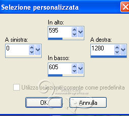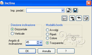 qui puoi trovare qualche risposta ai tuoi dubbi. Se l'argomento che ti interessa non è presente, ti prego di segnalarmelo. Questo tutorial è una creazione di ©Titoune e non può essere copiato su altri siti nè essere offerto per il download. Lo stesso vale per la mia traduzione. Il tutorial è stato creato con PSP X5, ma può essere eseguito anche con le altre versioni di PSP. Secondo la versione utilizzata (anteriore a PSP X) potresti ottenere dei risultati differenti. Per tradurlo, ho usato PSP X. Grazie ai creatori dei tubes che mettono a disposizione il loro lavoro in vari gruppi di condivisione. Rispetta il lavoro degli autori, non cambiare il nome del file e non cancellare il watermark. Occorrente: Un tube a scelta. Il resto del materiale qui Gli elementi utilizzati sono di Zezette2 . Filtri: VM Distortion - Smallpox qui Mehdi - Kaleidoscope 2.1 qui ![]() 1. Apri una nuova immagine trasparente 1280 x 600 pixels. Selezione>Seleziona tutto. 2. Apri l'immagine 1442319_fc0adb421335f4d760 e vai a Modifica>Copia. Torna al tuo lavoro e vai a Modifica>Incolla nella selezione. Selezione>Deseleziona. 3. Regola>Sfocatura>Sfocatura gaussiana - raggio 15. ![]() 4. Attiva lo strumento Selezione ,clicca sull'icona Selezione personalizzata ![]() e imposta i seguenti settaggi: ![]() Selezione>Inverti. Selezione>Innalza selezione a livello. Selezione>Deseleziona. Effetti>Effetti di bordo>Aumenta. 5. Effetti>Plugins>VM Distortion - Smallpox, con i settaggi standard. ![]() Livelli>Duplica. Attiva il livello sottostante dell'originale. 6. Effetti>Plugins>Mehdi - Kaleidoscope 2.1. ![]() 7. Effetti>Effetti geometrici>Cilindro orizzontale. ![]() Effetti>Effetti geometrici>Sfera. ![]() 8. Attiva nuovamente il livello superiore. Livelli>Duplica. Attiva il livello sottostante dell'originale. 9. Effetti>Effetti geometrici>Inclina. ![]() 10. Effetti>Effetti di riflesso>Specchio rotante. ![]() Effetti>Effetti geometrici>Sfera, con i settaggi precedenti. 11. Attiva nuovamente il livello superiore. Effetti>Effetti geometrici>Sfera, con i settaggi precedenti. 12. Sui tre livelli superiori: Effetti>Effetti 3D>Sfalsa ombra, con il colore #365919. ![]() Ripeti l'Effetto Sfalsa ombra, cambiando verticale e orizzontale con -3. 13. Attiva il secondo livello dal basso. Attiva lo strumento Bacchetta magica ![]() e clicca al centro dell'immagine per selezionarlo. ![]() Selezione>Modifica>Contrai - 15 pixels. Selezione>Modifica>Sfuma - 10 pixels. 14. Livelli>Nuovo livello raster. Livelli>Disponi>Sposta giù. 15. Attiva nuovamente l'immagine 1442319_fc0adb421335f4d760 e vai a Modifica>Copia. Torna al tuo lavoro e vai a Modifica>Incolla nella selezione. Selezione>Deseleziona. Livelli>Duplica. Cambia la modalità di miscelatura di questo livello in Moltiplica. 16. Attiva il livello superiore. Apri l'elemento "arbres" e vai a Modifica>Copia. Torna al tuo lavoro e vai a Modifica>Incolla come nuovo livello. Spostalo a sinistra.![]() Effetti>Effetti 3D>Sfalsa ombra, con i settaggi precedenti. 17. Apri l'elemento f6b50309 (tulipani e farfalle) e vai a Modifica>Copia. Torna al tuo lavoro e vai a Modifica>Incolla come nuovo livello. Spostalo in basso a sinistra.![]() Effetti>Effetti 3D>Sfalsa ombra, con i settaggi precedenti. 18. Apri l'elemento e77cbf31 (fiori e farfalle) e vai a Modifica>Copia. Torna al tuo lavoro e vai a Modifica>Incolla come nuovo livello. Spostalo in basso a sinistra.![]() Effetti>Effetti 3D>Sfalsa ombra, con i settaggi precedenti. 19. Effetti>Effetti di riflesso>Specchio rotante, con i settaggi precedenti. 20. Apri l'elemento 57d82f58 (fiori) e vai a Modifica>Copia. Torna al tuo lavoro e vai a Modifica>Incolla come nuovo livello. Spostalo in basso a destra.![]() Effetti>Effetti 3D>Sfalsa ombra, con i settaggi precedenti. 21. Apri l'elemento ac9a2b52 (angolo di fiori) e vai a Modifica>Copia. Torna al tuo lavoro e vai a Modifica>Incolla come nuovo livello. Spostalo in alto a destra.![]() Effetti>Effetti 3D>Sfalsa ombra, con i settaggi precedenti. Firma il tuo lavoro. Livelli>Unisci>Unisci visibile. 22. Selezione>Seleziona tutto. Selezione>Modifica>Contrai - 5 pixels. Selezione>Modifica>Sfuma - 10 pixels. Selezione>Inverti. Premi due volte sulla tastiera il tasto CANC ![]() 23. Di nuovo Selezione>Seleziona tutto. Immagine>Ritaglia la selezione. 24. Immagine>Dimensioni tela - 1280 x 1500 pixels. ![]() 25. Livelli>Nuovo livello raster. Livelli>Disponi>Sposta giù. Selezione>Seleziona tutto. 26. Apri la trama fornita "tuile" e vai a Modifica>Copia. Torna al tuo lavoro e vai a Modifica>Incolla nella selezione. Selezione>Deseleziona. 27. Regola>Sfocatura>Sfocatura gaussiana - raggio 45. ![]() Modifica>Copia. 28. Apri una nuova immagine trasparente 1280 x 450 pixels. Selezione>Seleziona tutto. Modifica>Incolla nella selezione. Immagine>Capovolgi. Selezione>Deseleziona. 29. Livelli>Nuovo livello maschera>Da immagine. Apri il menu sotto la finestra di origine e vedrai la lista dei files aperti. Seleziona la maschera "beccanae1", con i seguenti settaggi: ![]() Livelli>Unisci>Unisci gruppo. Modifica>Copia. Torna al tuo top e vai a Modifica>Incolla come nuovo livello. 30. Effetti>Effetti di immagine>Scostamento. ![]() Effetti>Effetti 3D>Sfalsa ombra, con i settaggi precedenti. 31. Rimani posizionato sul livello della maschera. Selezione personalizzata ![]() ![]() Selezione>Innalza selezione a livello. Selezione>Deseleziona. Livelli>Disponi>Porta in alto. 32. Effetti>Effetti 3D>Smusso a incasso. ![]() 33. Effetti>Effetti di distorsione>Increspa. ![]() 34. Effetti>Effetti geometrici>Cilindro verticale. ![]() Effetti>Effetti 3D>Sfalsa ombra, con i settaggi precedenti. 35. Apri il tube Grace's_TLC_Bunny-Jr e vai a Modifica>Copia. Torna al tuo lavoro e vai a Modifica>Incolla come nuovo livello. Spostalo sul bordo inferiore.Vedi l'esempio finale. Effetti>Effetti 3D>Sfalsa ombra, con i settaggi precedenti. 36. Apri il tuo tube e vai a Modifica>Copia. Torna al tuo lavoro e vai a Modifica>Incolla come nuovo livello. Immagine>Ridi