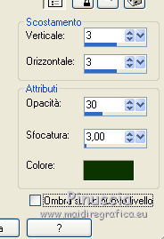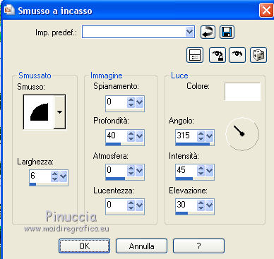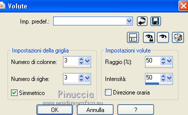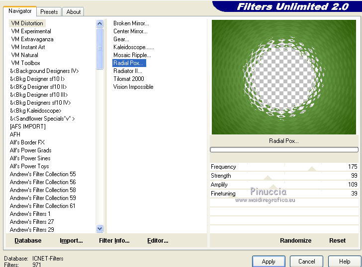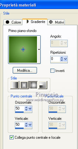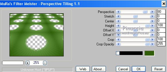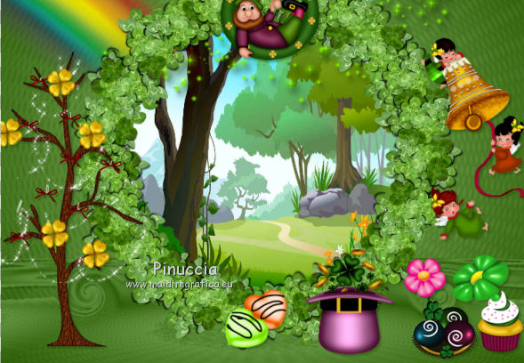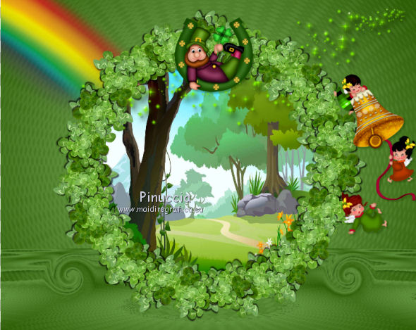 qui puoi trovare qualche risposta ai tuoi dubbi. Se l'argomento che ti interessa non è presente, ti prego di segnalarmelo. Questo tutorial è una creazione di ©Titoune e non può essere copiato su altri siti nè essere offerto per il download. Lo stesso vale per la mia traduzione. Il tutorial è stato creato con PSP X5, ma può essere eseguito anche con le altre versioni di PSP. Secondo la versione utilizzata (anteriore a PSP X) potresti ottenere dei risultati differenti. Vedi la mia scheda riguardante le funzioni Rifletti>Capovolgi in X4 e X5 qui Per tradure il tutorial ho usato PSP X. Occorrente: Un tube a scelta. Il resto del materiale qui Il tube utilizzato è di Ming Hue Filtri in caso di dubbi, ricorda di consultare la mia sezione filtri qui Filters Unlimited 2.0 qui VM Distortion - Radial Pox qui I filtri VM Distortion si possono usare da soli o importati in Filters Unlimited (come fare vedi qui) Se un filtro fornito appare con questa icona ![]() 1. Imposta il colore di primo piano con #89bd6a, e il colore di sfondo con #2f5d08. Passa il colore di primo piano a Gradiente di primo piano/sfondo, stile Sprazzo di luce. ![]() 2. Apri una nuova immagine trasparente 750 x 600 pixels, e riempila con il gradiente.3. Apri l'elemento Shamrock Circle Frame by Donna (1) e vai a Modifica>Copia. Torna al tuo lavoro e vai a Modifica>Incolla come nuovo livello. 4. Immagine>Ridimensiona, al 43%, tutti i livelli non selezionato. Rinomina questo livello "cornice". 5. Attiva lo strumento Bacchetta magica ![]() e clicca al centro della cornice per selezionarla. Selezione>Modifica>Espandi - 5 pixels. Selezione>Inverti. 6. Attiva il livello inferiore. Selezione>Innalza selezione a livello. Effetti>Plugins>Filters Unlimited 2.0 - VM Distortion - Radial Pox, con i settaggi standard. ![]() Selezione>Inverti. 7. Livelli>Nuovo livello raster. Apri l'immagine del paesaggio e vai a Modifica>Copia. Torna al tuo lavoro e vai a Modifica>Incolla nella selezione. Selezione>Deseleziona. 8. Attiva il livello con l'effetto Radial Pox. Livelli>Duplica. Effetti>Plugins>Mura's Meister - Perspective Tiling, con i settaggi standard. ![]() Premi il tasto K per attivare lo strumento Puntatore ![]() se stai usando PSP 9 il tasto D per attivare lo strumento Deformazione ![]() in modalità Scala, spingi il nodo superiore centrale verso il basso fino a 450 pixels (se non visualizzi i Righelli, vai a Visualizza>Righelli) ![]() 9. Effetti>Effetti di distorsione>Volute. ![]() Effetti>Effetti 3D>Sfalsa ombra, colore #0e3400. ![]() 10. Apri l'elemento SWEETIRISHLAND ELEMENTS (44) e vai a Modifica>Copia. Torna al tuo lavoro e vai a Modifica>Incolla come nuovo livello. Spostalo in basso a sinistra.Vedi l'esempio finale. Porta questo livello sotto il livello della cornice. 11. Effetti>Effetti 3D>Sfalsa ombram con i settaggi precedenti. 12. Rimani su questo livello (sotto il livello della cornice). Apri l'elemento SWEETIRISHLAND ELEMENTS (16) e vai a Modifica>Copia. Torna al tuo lavoro e vai a Modifica>Incolla come nuovo livello. Spostalo in alto a destra.Vedi l'esempio finale. 13. Attiva nuovamente il livello superiore. Apri l'elemento SWEETIRISHLAND ELEMENTS (45) e vai a Modifica>Copia. Torna al tuo lavoro e vai a Modifica>Incolla come nuovo livello. Spostalo nella parte superiore della cornice.Vedi l'esempio finale. Effetti>Effetti 3D>Sfalsa ombra, con i settaggi precedenti. 14. Apri l'elemento SWEETIRISHLAND ELEMENTS (39) e vai a Modifica>Copia. Torna al tuo lavoro e vai a Modifica>Incolla come nuovo livello. Spostalo a destra.![]() Effetti>Effetti 3D>Sfalsa ombra, con i settaggi precedenti. 15. Apri l'elemento SWEETIRISHLAND ELEMENTS (49) e vai a Modifica>Copia. Torna al tuo lavoro e vai a Modifica>Incolla come nuovo livello. Spostalo in basso a destra.Vedi l'esempio finale. Effetti>Effetti 3D>Sfalsa ombra, con i settaggi precedenti. 16. Apri l'elemento SWEETIRISHLAND ELEMENTS (50) e vai a Modifica>Copia. Torna al tuo lavoro e vai a Modifica>Incolla come nuovo livello. Spostalo in basso a destra.Vedi l'esempio finale. Effetti>Effetti 3D>Sfalsa ombra, con i settaggi precedenti. 17. Apri l'elemento SWEETIRISHLAND ELEMENTS (19) e vai a Modifica>Copia. Torna al tuo lavoro e vai a Modifica>Incolla come nuovo livello. Sposta anche questo elemento in basso a destra.Vedi l'esempio finale. Effetti>Effetti 3D>Sfalsa ombra, con i settaggi precedenti. 18. Apri l'elemento SWEETIRISHLAND ELEMENTS (15) e vai a Modifica>Copia. Torna al tuo lavoro e vai a Modifica>Incolla come nuovo livello. Sposta anche questo elemento in basso a destra.![]() Effetti>Effetti 3D>Sfalsa ombra, con i settaggi precedenti. 19. Apri l'elemento SWEETIRISHLAND ELEMENTS (29) e vai a Modifica>Copia. Torna al tuo lavoro e vai a Modifica>Incolla come nuovo livello. Spostalo in basso.Vedi l'esempio finale. Effetti>Effetti 3D>Sfalsa ombra, con i settaggi precedenti. 20. Apri l'elemento SWEETIRISHLAND ELEMENTS (35) e vai a Modifica>Copia. Torna al tuo lavoro e vai a Modifica>Incolla come nuovo livello. Spostalo nella parte inferiore della cornice.Vedi l'esempio finale. Effetti>Effetti 3D>Sfalsa ombra, con i settaggi precedenti. 21. Apri l'elemento SWEETIRISHLAND ELEMENTS (38) e vai a Modifica>Copia. Torna al tuo lavoro e vai a Modifica>Incolla come nuovo livello. Spostalo a sinistra.![]() Effetti>Effetti 3D>Sfalsa ombra, con i settaggi precedenti. 22. Apri l'elemento SWEETIRISHLAND ELEMENTS (11) e vai a Modifica>Copia. Torna al tuo lavoro e vai a Modifica>Incolla come nuovo livello. Spostalo in basso.Vedi l'esempio finale. Effetti>Effetti 3D>Sfalsa ombra, con i settaggi precedenti. Duplica l'elemento a tuo piacimento e disponi i duplicati in basso.![]() 23. Apri l'elemento SWEETIRISHLAND ELEMENTS (51) e vai a Modifica>Copia. Torna al tuo lavoro e vai a Modifica>Incolla come nuovo livello. Spostalo in basso a destra.Vedi l'esempio finale. Effetti>Effetti 3D>Sfalsa ombra, con i settaggi precedenti. 24. Apri l'elemento SWEETIRISHLAND ELEMENTS (54) e vai a Modifica>Copia. Torna al 