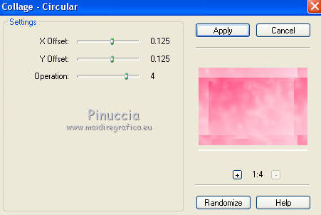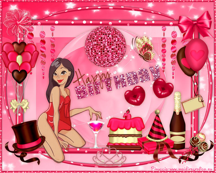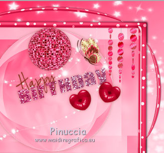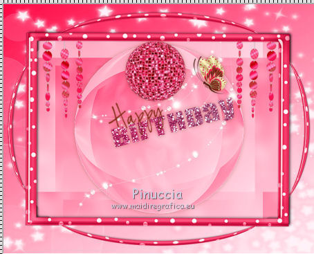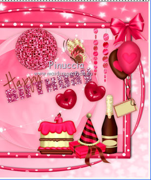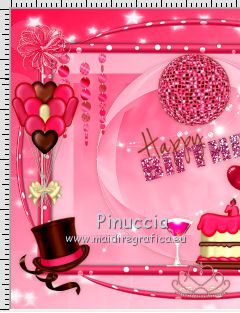 qui puoi trovare qualche risposta ai tuoi dubbi. Se l'argomento che ti interessa non è presente, ti prego di segnalarmelo. Questo tutorial è una creazione di ©Titoune e non può essere copiato su altri siti nè essere offerto per il download. Lo stesso vale per la mia traduzione. Il tutorial è stato creato con PSP X5, ma può essere eseguito anche con le altre versioni di PSP. Secondo la versione utilizzata (anteriore a PSP X) potresti ottenere dei risultati differenti. Dalla versione X4, il comando Immagine>Rifletti è stato sostituito con Immagine>Capovolgi in orizzontale, e il comando Immagine>Capovolgi con Immagine>Capovolgi in verticale. Nelle versioni X5 e X6, le funzioni sono state migliorate rendendo disponibile il menu Oggetti. Con il nuovo X7 sono tornati i comandi Rifletti/Capovolgi, ma con nuove differenze. Vedi la scheda sull'argomento qui Per tradurre il tutorial ho usato PSP X. Occorrente: Un tube a scelta. Il resto del materiale qui Filtri in caso di dubbi, ricorda di consultare la mia sezione filtri qui FM Tile Tools - Collage-Circular qui ![]() 1. Apri una nuova immagine trasparente 750 x 600 pixels. Selezione>Seleziona tutto. 2. Apri l'elemento IPD_MB_Paper8 e vai a Modifica>Copia. Torna al tuo lavoro e vai a Modifica>Incolla nella selezione. Selezione>Deseleziona. 3. Apri l'elemento IPD_MB_Frame1 e vai a Modifica>Copia. Torna al tuo lavoro e vai a Modifica>Incolla come nuovo livello. Rinomina questo livello "cornice". 4. Livelli>Duplica. Attiva il livello sottostante dell'originale. Effetti>Effetti geometrici>Sfera. ![]() 5. Attiva nuovamente il livello della copia. Attiva lo strumento Selezione , rettangolo,e traccia una selezione come nell'esempio. ![]() Selezione>Modifica>Espandi - 3 pixels. 6. Attiva il livello inferiore. Regola>Sfocatura>Sfocatura gaussiana - raggio 15. ![]() Selezione>Innalza selezione a livello. Effetti>Plugins>FM Tile Tools - Collage-Circular, con i settaggi standard. ![]() 7. Effetti>Effetti geometrici>Cerchio. ![]() Selezione>Innalza selezione a livello. Selezione>Deseleziona. 8. Immagine>Ridimensiona, al 90%, tutti i livelli non selezionato. Regola>Messa a fuoco>Metti a fuoco. 9. Effetti>Effetti 3D>Sfalsa ombra, colore #72001a. ![]() Rinomina questo livello Cerchio. 10. Apri l'elemento IPD_MB_Sparkles, e vai a Modifica>Copia. Torna al tuo lavoro e vai a Modifica>Incolla come nuovo livello. Non spostarlo. Niente Sfalsa ombra. Lascia questo livello sopra il livello cerchio. 11. Attiva il livello superiore. 12. Apri l'elemento IPD_MB_Garland, e vai a Modifica>Copia. Torna al tuo lavoro e vai a Modifica>Incolla come nuovo livello. Spostalo nella parte superiore.Effetti>Effetti 3D>Sfalsa ombra, con i settaggi precedenti. Porta questo livello sotto il livello della cornice. ![]() Attiva nuovamente il livello superiore. 13. Apri l'elemento IPD_MB_DiscoBall, e vai a Modifica>Copia. Torna al tuo lavoro e vai a Modifica>Incolla come nuovo livello. Spostalo nella parte superiore.Vedi l'esempio finale. Effetti>Effetti 3D>Sfalsa ombra, con i settaggi precedenti. 14. Apri l'elemento IPD_MB_Butterfly, e vai a Modifica>Copia. Torna al tuo lavoro e vai a Modifica>Incolla come nuovo livello. Spostalo in alto a destra.Vedi l'esempio finale. Effetti>Effetti 3D>Sfalsa ombra, con i settaggi precedenti. 15. Apri l'elemento IPD_MB_WordArt, e vai a Modifica>Copia. Torna al tuo lavoro e vai a Modifica>Incolla come nuovo livello. Spostalo come nell'esempio.![]() Effetti>Effetti 3D>Sfalsa ombra, con i settaggi precedenti. 16. Apri l'elemento IPD_MB_Pucker, e vai a Modifica>Copia. Torna al tuo lavoro e vai a Modifica>Incolla come nuovo livello. Spostalo dove preferisci o vedi il mio esempio.Vedi l'esempio finale. Effetti>Effetti 3D>Sfalsa ombra, con i settaggi precedenti. Livelli>Duplica. Immagine>Rifletti. ![]() 17. Apri l'elemento IPD_MB_Bow, e vai a Modifica>Copia. Torna al tuo lavoro e vai a Modifica>Incolla come nuovo livello. Spostalo in alto a destra.Vedi l'esempio finale. Effetti>Effetti 3D>Sfalsa ombra, con i settaggi precedenti. 18. Apri l'elemento IPD_MB_FloatingInvite, e vai a Modifica>Copia. Torna al tuo lavoro e vai a Modifica>Incolla come nuovo livello. Spostalo a destra.Vedi l'esempio finale. Effetti>Effetti 3D>Sfalsa ombra, con i settaggi precedenti. 19. Apri l'elemento IPD_MB_Champaign, e vai a Modifica>Copia. Torna al tuo lavoro e vai a Modifica>Incolla come nuovo livello. Spostalo in basso a destra.Vedi l'esempio finale. Effetti>Effetti 3D>Sfalsa ombra, con i settaggi precedenti. 20. Apri l'elemento IPD_MB_Cake, e vai a Modifica>Copia. Torna al tuo lavoro e vai a Modifica>Incolla come nuovo livello. Spostalo nella parte inferiore.Vedi l'esempio finale. Effetti>Effetti 3D>Sfalsa ombra, con i settaggi precedenti. 21. Apri l'elemento IPD_MB_Present, e vai a Modifica>Copia. Torna al tuo lavoro e vai a Modifica>Incolla come nuovo livello. Spostalo nella parte inferiore.![]() Effetti>Effetti 3D>Sfalsa ombra, con i settaggi precedenti. 22. Apri l'elemento IPD_MB_CakePops, e vai a Modifica>Copia. Torna al tuo lavoro e vai a Modifica>Incolla come nuovo livello. Spostalo nella parte inferiore destra.Vedi l'esempio finale. Effetti>Effetti 3D>Sfalsa ombra, con i settaggi precedenti. 23. Apri l'elemento IPD_MB_Drink, e vai a Modifica>Copia. Torna al tuo lavoro e vai a Modifica>Incolla come nuovo livello. Spostalo nella parte inferiore.Vedi l'esempio finale. Effetti>Effetti 3D>Sfalsa ombra, con i settaggi precedenti. 24. Apri l'elemento IPD_MB_Tiara, e vai a Modifica>Copia. Torna al tuo lavoro e vai a Modifica>Incolla come nuovo livello. Spostalo nella parte inferiore.Vedi l'esempio finale. Effetti>Effetti 3D>Sfalsa ombra, con i settaggi precedenti. 25. Apri l'elemento IPD_MB_Ribbon1, e vai a Modifica>Copia. Torna al tuo lavoro e vai a Modifica>Incolla come nuovo livello. Spostalo in basso a sinistra.Vedi l'esempio finale. Effetti>Effetti 3D>Sfalsa ombra, con i settaggi precedenti. Livelli>Duplica. Immagine>Rifletti. Nella paletta dei livelli porta questo liv