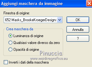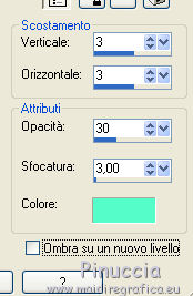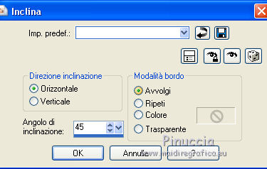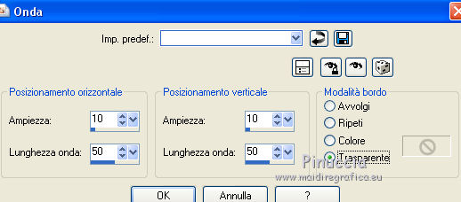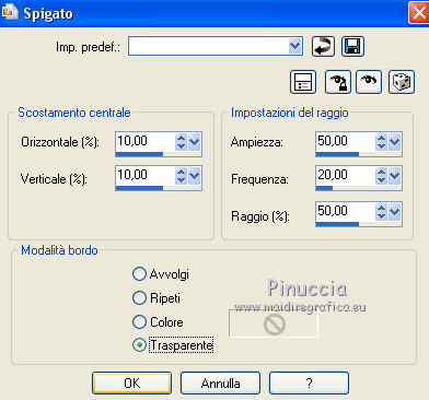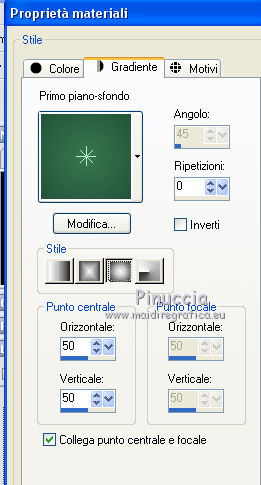 qui puoi trovare qualche risposta ai tuoi dubbi. Se l'argomento che ti interessa non è presente, ti prego di segnalarmelo. Questo tutorial è una creazione di ©Titoune e non può essere copiato su altri siti nè essere offerto per il download. Lo stesso vale per la mia traduzione. Il tutorial è stato creato con PSP X5, ma può essere eseguito anche con le altre versioni di PSP. Secondo la versione utilizzata (anteriore a PSP X) potresti ottenere dei risultati differenti. Vedi la mia scheda riguardante le funzioni Rifletti>Capovolgi in X4 e X5 qui Per tradure il tutorial ho usato PSP X. Occorrente: Un tube a scelta. Il resto del materiale qui Il tube utilizzato è di Gabry Il tube del fiore è di Silvie. Filtri in caso di dubbi, ricorda di consultare la mia sezione filtri qui Filters Unlimited 2.0 qui Filter Factory Gallery M - Loom qui Penta.com - Color dot qui I filtri Factory Gallery si possono usare da soli o importati in Filters Unlimited (come fare vedi qui) Se un filtro fornito appare con questa icona ![]() Apri la maschera in PSP e minimizzala con il resto del materiale. 1. Imposta il colore di primo piano con #397750, e il colore di sfondo con #235339. Passa il colore di primo piano a Gradiente di primo piano/sfondo, stile Sprazzo di luce. ![]() 2. Apri una nuova immagine trasparente 1280 x 650 pixels, e riempila con il gradiente.Livelli>Duplica. 3. Immagine>Ridimensiona, all'85%, tutti i livelli non selezionato. Effetti>Effetti di bordo>Aumenta. 4. Effetti>Effetti geometrici>Inclina. ![]() 5. Effetti>Effetti di riflesso>Specchio rotante. ![]() 6. Effetti>Effetti geometrici>Prospettiva verticale. ![]() 7. Effetti>Effetti geometrici>Sfera. ![]() 8. Effetti>Effetti di distorsione>Coordinate polari. ![]() 9. Effetti>Effetti 3D>Sfalsa ombra, colore #130502. ![]() Ripeti l'Effetto Sfalsa ombra, cambiando verticale e orizzontale con -3. Rinomina questo livello "coordinate polari". 10. Attiva il livello inferiore. Selezione>Seleziona tutto. Selezione>Modifica>Contrai - 45 pixels. Selezione>Innalza selezione a livello. 11. Effetti>Plugins>Filters Unlimited 2.0 - Filter Factory Gallery M - Loom, con i settaggi standard. ![]() Selezione>Deseleziona. Effetti>Effetti di bordo>Aumenta. 12. Effetti>Effetti di distorsione>Onda. ![]() Effetti>Effetti di riflesso>Specchio rotante, con i settaggi precedenti. 13. Attiva il livello "coordinate polari". Attiva lo strumento Bacchetta magica , tolleranza 20,e clicca al centro come nell'esempio. ![]() Selezione>Modifica>Contrai - 15 pixels. Selezione>Inverti. 14. Effetti>Effetti 3D>Sfalsa ombra, colore #130502. ![]() Selezione>Deseleziona. 15. Attiva il secondo livello dal basso (selezione innalzata). Effetti>Effetti 3D>Sfalsa ombra, colore #130502. ![]() Ripeti l'Effetto Sfalsa ombra, cambiando verticale e orizzontale con -3. Livelli>Duplica. Cambia la modalità di miscelatura di questo livello in Sovrapponi. 16. Attiva nuovamente il livello "coordinate polari". Effetti>Effetti 3D>Sfalsa ombra, con i settaggi precedenti. Livelli>Duplica. Cambia la modalità di miscelatura di questo livello in Sovrapponi. 17. Apri il tube Fractal_with_Water_11.05.2013 e vai a Modifica>Copia. Torna al tuo lavoro e vai a Modifica>Incolla come nuovo livello. Immagine>Ridimensiona, una volta al 145% e una volta al 125%, tutti i livelli non selezionato. Sposta il tube un po' più in alto.Regola>Messa a fuoco>Metti a fuoco. 18. Livelli>Duplica. Cambia la modalità di miscelatura di questo livello in Luce diffusa. 19. Apri il tube Butterfly Trail 1 e vai a Modifica>Copia. Torna al tuo lavoro e vai a Modifica>Incolla come nuovo livello. Spostalo a destra.![]() Livelli>Duplica. Cambia la modalità di miscelatura di questo livello in Moltiplica. 20. Apri il tube flowers e vai a Modifica>Copia. Torna al tuo lavoro e vai a Modifica>Incolla come nuovo livello. Spostalo in basso a destra.![]() Effetti>Effetti 3D>Sfalsa ombra, con i settaggi precedenti. 21. Apri il tuo tube e vai a Modifica>Copia. Torna al tuo lavoro e vai a Modifica>Incolla come nuovo livello. Immagine>Ridimensiona, se e quanto necessario, tutti i livelli non selezionato. Spostalo dove preferisci,o vedi il mio esempio. Effetti>Effetti 3D>Sfalsa ombra, con i settaggi precedenti. 22. Attiva il livello inferiore e vai a Modifica>Copia. Selezione>Seleziona tutto. Immagine>Ritaglia la selezione. 23. Immagine>Dimensioni tela - 1280 x 1500 pixels. ![]() 24. Livelli>Nuovo livello raster. Livelli>Disponi>Sposta giù. Selezione>Seleziona tutto. Modifica>Incolla nella selezione. Selezione>Deseleziona. 25. Apri una nuova immagine trasparente 1280 x 350 pixels, e riempila con il gradiente.Effetti>Plugins>Filters Unlimited 2.0 - Filter Factory Gallery M - Loom, con i settaggi standard. Livelli>Duplica. Cambia la modalità di miscelatura di questo livello in Sovrapponi. Livelli>Unisci>Unisci giù. 26. Livelli>Nuovo livello maschera>Da immagine apri il menu sotto la finestra di origine e vedrai la lista dei files aperti. Seleziona la maschera "652 Masks_BrookeKroegerDesigns", con i seguenti settaggi. ![]() Livelli>Unisci>Unisci gruppo. Modifica>Copia. Torna al tuo top e vai a Modifica>Incolla come nuovo livello. 27. Effetti>Effetti di immagine>Scostamento. ![]() 28. Effetti>Effetti 3D>Sfalsa ombra, colore #55fdc8. ![]() 29. Attiva il livello superiore. Attiva lo strumento Selezione ![]() clicca sull'icona Selezione personalizzata ![]() e imposta i seguenti settaggi. ![]() 30. Livelli>Nuovo livello raster. Imposta il colore di primo piano con #55fdc8, e riempi la selezione con questo colore.Selezione>Deseleziona. Effetti>Plugins>Penta.com - Color dot, con i settaggi standard. ![]() Effetti>Effetti di bordo>Aumenta. 31. Effetti>Effetti 3D>Smusso a incasso. ![]() Effetti>Effetti 3D>Sfalsa ombra, colore #130502. ![]() 32. Livelli>Duplica. Immagine>Ridimensiona, all'85%, tutti i livelli non selezionato. Di nuovo Livelli>Duplica. Immagine>Ridimensiona, all'85%, tutti i livelli non selezionato. 33. Attiva il livello centrale della secon