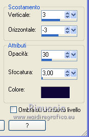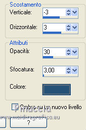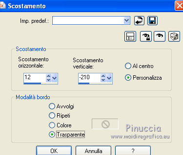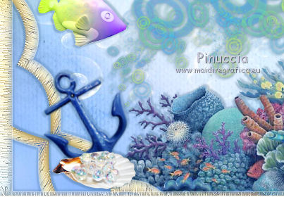 qui puoi trovare qualche risposta ai tuoi dubbi. Se l'argomento che ti interessa non è presente, ti prego di segnalarmelo. Questo tutorial è una creazione di ©Titoune e non può essere copiato su altri siti nè essere offerto per il download. Lo stesso vale per la mia traduzione. Il tutorial è stato creato con PSP X5, ma può essere eseguito anche con le altre versioni di PSP. Secondo la versione utilizzata (anteriore a PSP X) potresti ottenere dei risultati differenti. Vedi la mia scheda riguardante le funzioni Rifletti>Capovolgi in X4 e X5 qui Per tradure il tutorial ho usato PSP X. Occorrente: Un tube a scelta. Il resto del materiale qui ![]() 1. Apri una nuova immagine trasparente 750 x 600 pixels. Selezione>Seleziona tutto. 2. Apri l'immagine FunnyBath_YalanaDesign_addon (2) e vai a Modifica>Copia. Torna al tuo lavoro e vai a Modifica>Incolla nella selezione. Selezione>Deseleziona. 3. Apri l'elemento FunnyBath_YalanaDesign_addon (16) e vai a Modifica>Copia. Torna al tuo lavoro e vai a Modifica>Incolla come nuovo livello. Non spostarlo. 4. Effetti>Effetti 3D>Sfalsa ombra, colore #265276. ![]() Ripeti l'Effetto Sfalsa ombra, cambiando verticale e orizzontale con -3/3. ![]() 5. Apri l'elemento Coral_molly bleu e vai a Modifica>Copia. Torna al tuo lavoro e vai a Modifica>Incolla come nuovo livello. 6. Effetti>Effetti di immagine>Scostamento. ![]() Effetti>Effetti 3D>Sfalsa ombra, con i settaggi precedenti. Rinomina questo livello "corallo". 7. Apri l'elemento titoune_bordure_Funny_Bath e vai a Modifica>Copia. Torna al tuo lavoro e vai a Modifica>Incolla come nuovo livello. Effetti>Effetti 3D>Sfalsa ombra, con i settaggi precedenti. 8. Apri l'elemento FunnyBath_YalanaDesign_addon (14) e vai a Modifica>Copia. Torna al tuo lavoro e vai a Modifica>Incolla come nuovo livello. Spostalo nella parte superiore.Vedi l'esempio finale. Effetti>Effetti 3D>Sfalsa ombra, con i settaggi precedenti. 9. Apri l'elemento FunnyBath_YalanaDesign_addon (11) e vai a Modifica>Copia. Torna al tuo lavoro e vai a Modifica>Incolla come nuovo livello. Spostalo a sinistra.Vedi l'esempio finale. Effetti>Effetti 3D>Sfalsa ombra, con i settaggi precedenti. 10. Apri l'elemento FunnyBath_YalanaDesign_addon (12) e vai a Modifica>Copia. Torna al tuo lavoro e vai a Modifica>Incolla come nuovo livello. Spostalo a destra.![]() Effetti>Effetti 3D>Sfalsa ombra, con i settaggi precedenti. 11. Apri l'elemento FunnyBath_YalanaDesign_addon (15) e vai a Modifica>Copia. Torna al tuo lavoro e vai a Modifica>Incolla come nuovo livello. Spostalo in alto a destra.![]() Effetti>Effetti 3D>Sfalsa ombra, con i settaggi precedenti. 12. Apri l'elemento blue_aster e vai a Modifica>Copia. Torna al tuo lavoro e vai a Modifica>Incolla come nuovo livello. Spostalo in basso a destra.Vedi l'esempio finale. Nella paletta dei livelli porta questo livello sotto il livello "corallo". ![]() 13. Attiva nuovamente il livello superiore. Apri l'elemento algue1 e vai a Modifica>Copia. Torna al tuo lavoro e vai a Modifica>Incolla come nuovo livello. Spostalo nell'angolo in basso a destra.Effetti>Effetti 3D>Sfalsa ombra, con i settaggi precedenti. 14. Apri l'elemento bottle e vai a Modifica>Copia. Torna al tuo lavoro e vai a Modifica>Incolla come nuovo livello. Sposta anche questo elemento in basso a destra.![]() Effetti>Effetti 3D>Sfalsa ombra, con i settaggi precedenti. 15. Apri l'elemento ancor e vai a Modifica>Copia. Torna al tuo lavoro e vai a Modifica>Incolla come nuovo livello. Spostalo in basso a sinistra.Effetti>Effetti 3D>Sfalsa ombra, con i settaggi precedenti. 16. Apri l'elemento pearls_shell e vai a Modifica>Copia. Torna al tuo lavoro e vai a Modifica>Incolla come nuovo livello. Sposta anche questo elemento in basso a sinistra.![]() Effetti>Effetti 3D>Sfalsa ombra, con i settaggi precedenti. 17. Apri l'elemento algue2 e vai a Modifica>Copia. Torna al tuo lavoro e vai a Modifica>Incolla come nuovo livello. Spostalo nell'angolo in basso a sinistra.Vedi l'esempio finale. Effetti>Effetti 3D>Sfalsa ombra, con i settaggi precedenti. 18. Apri l'elemento blue_fishes e vai a Modifica>Copia. Torna al tuo lavoro e vai a Modifica>Incolla come nuovo livello. Spostalo sopra l'ancora.![]() Effetti>Effetti 3D>Sfalsa ombra, con i settaggi precedenti. 19. Apri l'elemento wordart_sea e vai a Modifica>Copia. Torna al tuo lavoro e vai a Modifica>Incolla come nuovo livello. Spostalo in alto a sinistra.Nessun Effetto Sfalsa ombra. 20. Apri l'elemento SeaHorseDragons2~DVDM e vai a Modifica>Copia. Torna al tuo lavoro e vai a Modifica>Incolla come nuovo livello. Spostalo nell'angolo in alto a sinistra.Vedi l'esempio finale. Effetti>Effetti 3D>Sfalsa ombra, con i settaggi precedenti. 21. Apri il tuo tube e vai a Modifica>Copia. Torna al tuo lavoro e vai a Modifica>Incolla come nuovo livello. Immagine>Ridimensiona, se e quanto necessario, tutti i livelli non selezionato. Spostalo dove preferisci,o vedi il mio esempio. Effetti>Effetti 3D>Sfalsa ombra, con i settaggi precedenti. Firma il tuo lavoro. Livelli>Unisci>Unisci tutto e salva in formato jpg. ![]() Se hai problemi o dubbi, o trovi un link non funzionante, scrivimi. 9 Luglio 2013 |