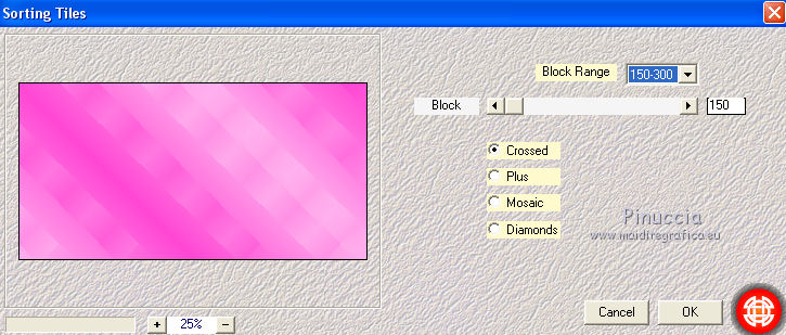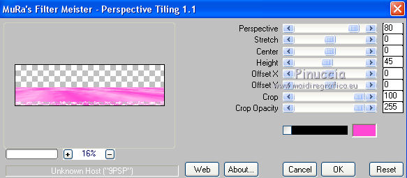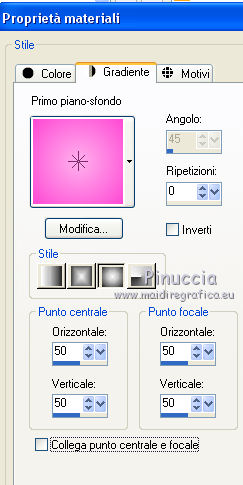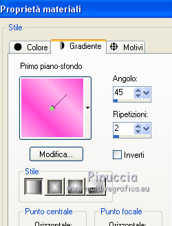 qui puoi trovare qualche risposta ai tuoi dubbi. Se l'argomento che ti interessa non è presente, ti prego di segnalarmelo. Questo tutorial è una creazione di ©Titoune e non può essere copiato su altri siti nè essere offerto per il download. Lo stesso vale per la mia traduzione. Il tutorial è stato creato con PSP X5, ma può essere eseguito anche con le altre versioni di PSP. Secondo la versione utilizzata (anteriore a PSP X) potresti ottenere dei risultati differenti. Dalla versione X4, il comando Immagine>Rifletti è stato sostituito con Immagine>Capovolgi in orizzontale, e il comando Immagine>Capovolgi con Immagine>Capovolgi in verticale. Nelle versioni X5 e X6, le funzioni sono state migliorate rendendo disponibile il menu Oggetti. Con il nuovo X7 sono tornati i comandi Rifletti/Capovolgi, ma con nuove differenze. Vedi la scheda sull'argomento qui Per tradurre il tutorial ho usato PSP X. Occorrente: Un tube a scelta. Il resto del materiale qui Il tube utilizzato è di TReagan. Filtri in caso di dubbi, ricorda di consultare la mia sezione filtri qui Filters Unlimited 2.0 qui Mura's Meister - Perspective Tiling qui Filter Factory Gallery M - Loom qui Mehdi - Sorting Tiles qui Mehdi - Kaleidoscope 2.1 qui Simple - Left Right Wrap (bonus) qui I filtri Simple e Factory Gallery si possono usare da soli o importati in Filters Unlimited (come fare vedi qui) Se un filtro fornito appare con questa icona ![]() Apri la maschera in PSP e minimizzala con il resto del materiale. 1. Imposta il colore di primo piano con #ffb1ed, e il colore di sfondo con #ff48d4. 2. Passa il colore di primo piano a Gradiente di primo piano/sfondo, stile Lineare. ![]() 3. Apri una nuova immagine trasparente 1280 x 650 pixels, e riempila con il gradiente.4. Livelli>nuovo livello raster. Apri il tube Lillies_LR-08-04-09, e vai a Modifica>Copia. Torna al tuo lavoro e vai a Modifica>Incolla nella selezione. Selezione>Deseleziona. 5. Effetti>Effetti di immagine>Motivo unico, con i settaggi standard. ![]() Regola>Sfocatura>Sfocatura gaussiana - raggio 45. ![]() Immagine>Ridimensiona, all'85%, tutti i livelli non selezionato. Effetti>Effetti di bordo>Aumenta. 6. Effetti>Effetti 3D>Sfalsa ombra, colore #63197d. ![]() 7. Effetti>Plugins>Filter Factory Gallery M - Loom, con i settaggi standard. ![]() Immagine>Rifletti. 8. Effetti>Plugins>Simple - Left Right Wrap. Livelli>Duplica. 9. Effetti>Plugins>Mehdi - Kaleidoscope 2.1. ![]() 10. Effetti>Effetti geometrici>Prospettiva verticale. ![]() Abbassa l'opacità di questo livello al 75%. 11. Attiva il livello sottostante dell'originale. Effetti>Effetti di distorsione>Coordinate polari. ![]() Abbassa l'opacità di questo livello al 75%. 12. Attiva il livello inferiore. Effetti>Plugins>Mehdi - Sorting Tiles. ![]() 13. Modifica>Incolla come nuovo livello (il tube Lillies_LR-08-04-09 è ancora in memoria). Spostalo a destra.Livelli>Duplica. Cambia la modalità di miscelatura di questo livello in Sovrapponi. Attiva il livello originale. Effetti>Effetti 3D>Sfalsa ombra, con i settaggi precedenti. 14. Attiva il livello superiore. Apri il tuo tube e vai a Modifica>Copia. Torna al tuo lavoro e vai a Modifica>Incolla come nuovo livello. Posiziona il tube dove preferisci,o vedi il mio esempio. Effetti>Effetti 3D>Sfalsa ombra, con i settaggi precedenti. 15. Attiva il livello inferiore. Modifica>Copia. 16. Apri una nuova immagine trasparente 1280 x 350 pixels. Selezione>Seleziona tutto. Modifica>Incolla nella selezione. Selezione>Deseleziona. 17. Livelli>Nuovo livello maschera>Da immagine. Apri il menu sotto la finestra di origine e vedrai la lista dei files aperti. Carica la maschera Mask 156 Brooke Kroeger, con i seguenti settaggi. ![]() Livelli>Unisci>Unisci gruppo. 18. Effetti>Plugins>Mura's Meister - Perspective tiling. ![]() Modifica>Copia. 19. Torna al tuo top. Rimani posizionato sul livello inferiore. Selezione>Seleziona tutto. Immagine>Ritaglia la selezione. 20. Immagine>Dimensioni tela - 1280 x 1500 pixels. ![]() 21. Livelli>Nuovo livello raster. Livelli>Disponi>Sposta giù. Cambia i settaggi del gradiente, in stile Sprazzo di luce. ![]() Riempi il livello con il gradiente.22. Modifica>Incolla come nuovo livello. Effetti>Effetti di immagine>Scostamento. ![]() Effetti>Effetti 3D>Sfalsa ombra, con i settaggi precedenti. Attiva il livello inferiore. 24. Attiva lo strumento Selezione ![]() (non importa il tipo di selezione impostato, perchè con la selezione personalizzata si ottiene sempre un rettangolo) clicca sull'icona Selezione personalizzata ![]() e imposta i seguenti settaggi. ![]() Selezione>Innalza selezione a livello. Livelli>Disponi>Porta in alto. 25. Effetti>Effetti di trama>Intessitura: colore intessitura #ff51d6 colore spazio #bd3fb3. ![]() 26. Effetti>Effetti 3D>Smusso a incasso. ![]() Selezione>Deseleziona. Effetti>Effetti 3D>Sfalsa ombra, con i settaggi precedenti. 27. Firma il tuo lavoro. Livelli>Unisci>Unisci tutto e salva in formato jpg. ![]() Se hai problemi o dubbi, o trovi un link non funzionante, scrivimi. 8 Novembre 2014 |