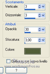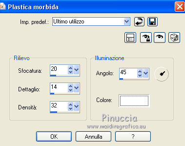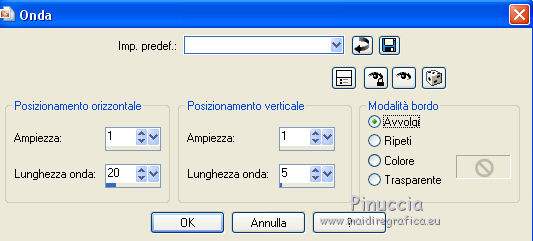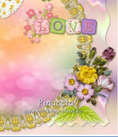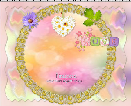 qui puoi trovare qualche risposta ai tuoi dubbi. Se l'argomento che ti interessa non è presente, ti prego di segnalarmelo. Questo tutorial è una creazione di ©Titoune e non può essere copiato su altri siti nè essere offerto per il download. Lo stesso vale per la mia traduzione. Il tutorial è stato creato con PSP X5, ma può essere eseguito anche con le altre versioni di PSP. Secondo la versione utilizzata (anteriore a PSP X) potresti ottenere dei risultati differenti. Dalla versione X4, il comando Immagine>Rifletti è stato sostituito con Immagine>Capovolgi in orizzontale, e il comando Immagine>Capovolgi con Immagine>Capovolgi in verticale. Nelle versioni X5 e X6, le funzioni sono state migliorate rendendo disponibile il menu Oggetti. Vedi la scheda sull'argomento qui Per tradure il tutorial ho usato PSP X. Occorrente: Un tube a scelta. Il resto del materiale qui Il tube utilizzato è di Leilana. Filtri in caso di dubbi, ricorda di consultare la mia sezione filtri qui Penta.com - Jeans qui ![]() 1. Apri una nuova immagine trasparente 750 x 600 pixels. Selezione>Seleziona tutto. 2. Apri l'elemento paper 1 e vai a Modifica>Copia. Torna al tuo lavoro e vai a Modifica>Incolla nella selezione. Selezione>Deseleziona. 3. Regola>Sfocatura>Sfocatura gaussiana - raggio 30. ![]() 4. Selezione>Seleziona tutto. Selezione>Modifica>Contrai - 35 pixels. Selezione>Innalza selezione a livello. 5. Effetti>Effetti di trama>Plastica morbida. ![]() Selezione>Deseleziona. 6. Effetti>Effetti di distorsione>Onda. ![]() 7. Effetti>Effetti 3D>Sfalsa ombra, colore 515e37. ![]() Ripeti l'Effetto Sfalsa ombra, cambiando verticale e orizzontale con -3. 8. Apri l'elemento frame, e vai a Modifica>Copia. Torna al tuo lavoro e vai a Modifica>Incolla come nuovo livello. Non spostarlo. 9. Attiva lo strumento Bacchetta magica ![]() e clicca al centro della cornice per selezionarla. Livelli>Nuovo livello raster. Livelli>Disponi>Sposta giù. 10. Apri l'immagine stock-photo-33316584-abstract-colorful-spring-background e vai a Modifica>Copia. Torna al tuo lavoro e vai a Modifica>Incolla nella selezione. Selezione>Deseleziona. 11. Attiva il livello della cornice. Effetti>Effetti 3D>Sfalsa ombra, con i settaggi precedenti. 12. Apri l'elemento U8Mczc3Pz48QojcoA4cNKc9B5AY, e vai a Modifica>Copia. Torna al tuo lavoro e vai a Modifica>Incolla come nuovo livello. Spostalo nella parte superiore della cornice.Vedi l'esempio finale. Porta il livello sotto il livello della cornice. 13. Effetti>Effetti 3D>Sfalsa ombra, colore #515e37. ![]() Attiva nuovamente il livello della cornice. 14. Apri l'elemento element 6, e vai a Modifica>Copia. Torna al tuo lavoro e vai a Modifica>Incolla come nuovo livello. Spostalo nella parte superiore della cornice.Vedi l'esempio finale. Effetti>Effetti 3D>Sfalsa ombra, con i settaggi precedenti. 15. Apri l'elemento element 11, e vai a Modifica>Copia. Torna al tuo lavoro e vai a Modifica>Incolla come nuovo livello. Sposta anche questo elemento nella parte superiore della cornice.Effetti>Effetti 3D>Sfalsa ombra, con i settaggi precedenti. 16. Apri l'elemento KMILL_SWD_T-4, e vai a Modifica>Copia. Torna al tuo lavoro e vai a Modifica>Incolla come nuovo livello. Spostalo nella parte destra della cornice.![]() Vedi l'esempio finale. Effetti>Effetti 3D>Sfalsa ombra, con i settaggi precedenti. 17. Apri l'elemento element 5, e vai a Modifica>Copia. Torna al tuo lavoro e vai a Modifica>Incolla come nuovo livello. Spostalo nella parte inferiore della cornice.Vedi l'esempio finale. Effetti>Effetti 3D>Sfalsa ombra, con i settaggi precedenti. 18. Apri l'elemento element 10, e vai a Modifica>Copia. Torna al tuo lavoro e vai a Modifica>Incolla come nuovo livello. Spostalo in basso a destra.Vedi l'esempio finale. Effetti>Effetti 3D>Sfalsa ombra, con i settaggi precedenti. 19. Apri l'elemento element 10_2, e vai a Modifica>Copia. Torna al tuo lavoro e vai a Modifica>Incolla come nuovo livello. Spostalo contro l'elemento precedente.![]() Effetti>Effetti 3D>Sfalsa ombra, con i settaggi precedenti. 20. Apri l'elemento element 14, e vai a Modifica>Copia. Torna al tuo lavoro e vai a Modifica>Incolla come nuovo livello. Spostalo nella parte inferiore destra della cornice.Vedi l'esempio finale. Effetti>Effetti 3D>Sfalsa ombra, con i settaggi precedenti. 21. Apri l'elemento element 15, e vai a Modifica>Copia. Torna al tuo lavoro e vai a Modifica>Incolla come nuovo livello. Spostalo nella parte inferiore destra della cornice.Vedi l'esempio finale. Effetti>Effetti 3D>Sfalsa ombra, con i settaggi precedenti. 22. Apri l'elemento element 16, e vai a Modifica>Copia. Torna al tuo lavoro e vai a Modifica>Incolla come nuovo livello. Spostalo nella parte inferiore destra della cornice.![]() Effetti>Effetti 3D>Sfalsa ombra, con i settaggi precedenti. 23. Apri l'elemento element 9, e vai a Modifica>Copia. Torna al tuo lavoro e vai a Modifica>Incolla come nuovo livello. Spostalo sotto la cornice.Vedi l'esempio finale. Effetti>Effetti 3D>Sfalsa ombra, con i settaggi precedenti. 24. Apri l'elemento element 17, e vai a Modifica>Copia. Torna al tuo lavoro e vai a Modifica>Incolla come nuovo livello. Spostalo nella parte inferiore sinistra della cornice.Vedi l'esempio finale. Effetti>Effetti 3D>Sfalsa ombra, con i settaggi precedenti. Porta questo livello sotto il livello della cornice. ![]() 25. Attiva il livello della cornice. Apri l'elemento element 3, e vai a Modifica>Copia. Torna al tuo lavoro e vai a Modifica>Incolla come nuovo livello. Spostalo nella parte inferiore sinistra della cornice.Vedi l'esempio finale. Effetti>Effetti 3D>Sfalsa ombra, con i settaggi precedenti. 26. Apri l'elemento element 12, e vai a Modifica>Copia. Torna al tuo lavoro e vai a Modifica>Incolla come nuovo livello. Spostalo nella parte inferiore sinistra della cornice.![]() Effetti>Effetti 3D>Sfalsa ombra, con i settaggi precedenti. 27. Apri l'elemento element 19, e vai a Modifica>Copia. Torna al tuo lavoro e vai a Modifica>Incolla come nuovo livello. Spostalo nell