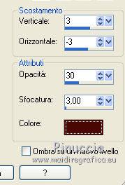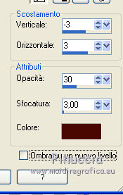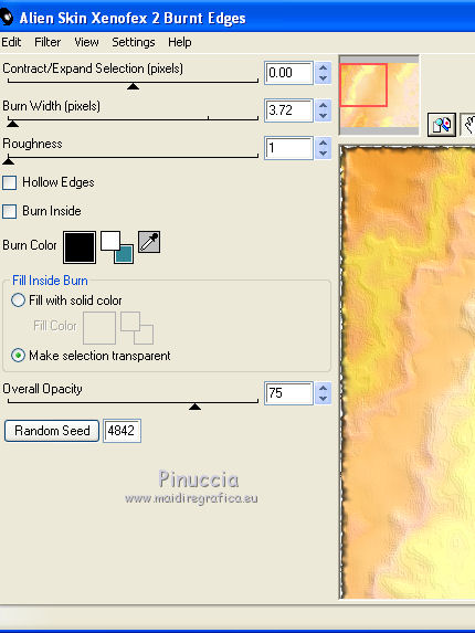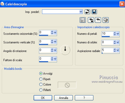 qui puoi trovare qualche risposta ai tuoi dubbi. Se l'argomento che ti interessa non è presente, ti prego di segnalarmelo. Questo tutorial è una creazione di ©Titoune e non può essere copiato su altri siti nè essere offerto per il download. Lo stesso vale per la mia traduzione. Il tutorial è stato creato con PSP X5, ma può essere eseguito anche con le altre versioni di PSP. Secondo la versione utilizzata (anteriore a PSP X) potresti ottenere dei risultati differenti. Vedi la mia scheda riguardante le funzioni Rifletti>Capovolgi in X4 e X5 qui Per tradure il tutorial ho usato PSP X. Un tube a scelta. Il resto del materiale qui Filtri: Alien Skin Xenofex 2.0 - Burnt Edges qui ![]() 1. Apri una nuova immagine trasparente 750 x 600 pixels. Selezione>Seleziona tutto. 2. Apri l'elemento "paper 3" e vai a Modifica>Copia. Torna al tuo lavoro e vai a Modifica>Incolla nella selezione. Selezione>Deseleziona. 3. Apri l'elemento "frame" e vai a Modifica>Copia. Torna al tuo lavoro e vai a Modifica>Incolla come nuovo livello. 4. Effetti>Effetti di riflesso>Caleidoscopio. ![]() 5. Attiva lo strumento Bacchetta magica ![]() e clicca al centro della cornice per selezionarla. ![]() Selezione>Modifica>Espandi - 3 pixels. ![]() Selezione>Inverti. 6. Attiva il livello inferiore. Effetti>Effetti di trama>Plastica morbida. ![]() Di nuovo Selezione>Inverti. Livelli>Nuovo livello raster. 7. Apri l'immagine 0_e7211_bc8e4a75_XL e vai a Modifica>Copia. Torna al tuo lavoro e vai a Modifica>Incolla nella selezione. Selezione>Deseleziona. Attiva nuovamente il livello della cornice. 8. Effetti>Effetti 3D>Sfalsa ombra, con il colore #4a0800. ![]() Ripeti l'Effetto Sfalsa ombra, cambiando verticale e orizzontale con -3/3. ![]() 9. Apri l'elemento "element 6" e vai a Modifica>Copia. Torna al tuo lavoro e vai a Modifica>Incolla come nuovo livello. Spostalo in alto a destra.![]() Effetti>Effetti 3D>Sfalsa ombra, con i settaggi precedenti. 10. Apri l'elemento "element 9" e vai a Modifica>Copia. Torna al tuo lavoro e vai a Modifica>Incolla come nuovo livello. Spostalo in alto, sulla cornice.Vedi l'esempio finale. Effetti>Effetti 3D>Sfalsa ombra, con i settaggi precedenti. 11. Apri l'elemento "element 16" e vai a Modifica>Copia. Torna al tuo lavoro e vai a Modifica>Incolla come nuovo livello. Sposta anche questo elemento in alto a destra.![]() Effetti>Effetti 3D>Sfalsa ombra, con i settaggi precedenti. 12. Apri l'elemento "element 3" e vai a Modifica>Copia. Torna al tuo lavoro e vai a Modifica>Incolla come nuovo livello. Spostalo a destra.Vedi l'esempio finale. Effetti>Effetti 3D>Sfalsa ombra, con i settaggi precedenti. 13. Apri l'elemento "element 1" e vai a Modifica>Copia. Torna al tuo lavoro e vai a Modifica>Incolla come nuovo livello. Spostalo sopra l'elemento precedente.![]() Effetti>Effetti 3D>Sfalsa ombra, con i settaggi precedenti. 14. Apri l'elemento "element 18" e vai a Modifica>Copia. Torna al tuo lavoro e vai a Modifica>Incolla come nuovo livello. Spostalo in basso a destra.Vedi l'esempio finale. Effetti>Effetti 3D>Sfalsa ombra, con i settaggi precedenti. 15. Apri l'elemento "element 17" e vai a Modifica>Copia. Torna al tuo lavoro e vai a Modifica>Incolla come nuovo livello. Spostalo anche questo elemento a destra.Vedi l'esempio finale. Effetti>Effetti 3D>Sfalsa ombra, con i settaggi precedenti. 16. Apri l'elemento "element 7" e vai a Modifica>Copia. Torna al tuo lavoro e vai a Modifica>Incolla come nuovo livello. Spostalo sotto la cornice.![]() Effetti>Effetti 3D>Sfalsa ombra, con i settaggi precedenti. 17. Apri l'elemento "element 11" e vai a Modifica>Copia. Torna al tuo lavoro e vai a Modifica>Incolla come nuovo livello. Spostalo in basso a destra.Vedi l'esempio finale. Effetti>Effetti 3D>Sfalsa ombra, con i settaggi precedenti. 18. Apri l'elemento "element 2" e vai a Modifica>Copia. Torna al tuo lavoro e vai a Modifica>Incolla come nuovo livello. Spostalo in basso a sinistra.![]() Effetti>Effetti 3D>Sfalsa ombra, con i settaggi precedenti. 19. Apri l'elemento "element 12" e vai a Modifica>Copia. Torna al tuo lavoro e vai a Modifica>Incolla come nuovo livello. Sposta anche questo elemento in basso a sinistra.Vedi l'esempio finale. Effetti>Effetti 3D>Sfalsa ombra, con i settaggi precedenti. 20. Apri l'elemento "element 14" e vai a Modifica>Copia. Torna al tuo lavoro e vai a Modifica>Incolla come nuovo livello. Spostalo a sinistra.Vedi l'esempio finale. Effetti>Effetti 3D>Sfalsa ombra, con i settaggi precedenti. 21. Apri l'elemento "element 5" e vai a Modifica>Copia. Torna al tuo lavoro e vai a Modifica>Incolla come nuovo livello. Spostalo in alto a sinistra.Vedi l'esempio finale. Effetti>Effetti 3D>Sfalsa ombra, con i settaggi precedenti. 22. Apri l'elemento "bluebird" e vai a Modifica>Copia. Torna al tuo lavoro e vai a Modifica>Incolla come nuovo livello. Sposta anche questo elemento in alto a sinistra.Vedi l'esempio finale. Effetti>Effetti 3D>Sfalsa ombra, con i settaggi precedenti. 23. Apri l'elemento "element 13" e vai a Modifica>Copia. Torna al tuo lavoro e vai a Modifica>Incolla come nuovo livello. Spostalo nella cornice.![]() Effetti>Effetti 3D>Sfalsa ombra, con i settaggi precedenti. 24. Attiva il livello inferiore. Effetti>Plugins>Alien Skin Xenofex 2.0 - Burnt Edges - colore #472f1b. ![]() 25. Apri l'elemento "frame_border" e vai a Modifica>Copia. Torna al tuo lavoro e vai a Modifica>Incolla come nuovo livello. Effetti>Effetti 3D>Sfalsa ombra, con i settaggi precedenti. 26. Controlla che tutti gli elementi siano correttamente posizionati. Attiva nuovamente il livello superiore. Apri il tuo tube e vai a Modifica>Copia. Torna al tuo lavoro e vai a Modifica>Incolla come nuovo livello. Immagine>Ridimensiona, se e quanto necessario, tutti i livelli non selezionato. Spostalo dove preferisci o vedi il mio esempio.Effetti>Effetti 3D>Sfalsa ombra, con i settaggi precedenti. 27. Firma il tuo lavoro. Livelli>Unisci>Unisci tutto e salva in formato jpg. ![]() Se hai problemi o dubbi, o trovi un link non funzio