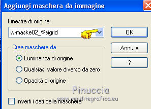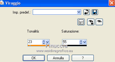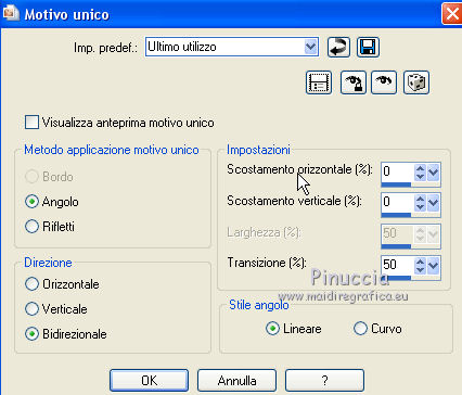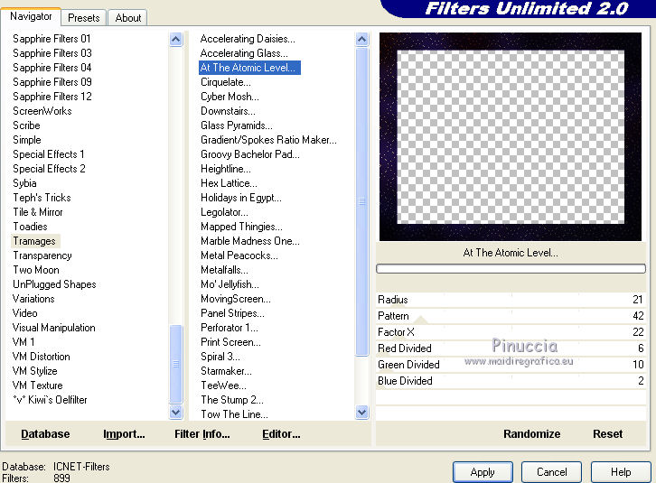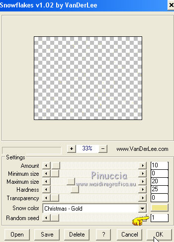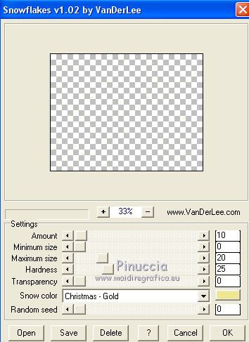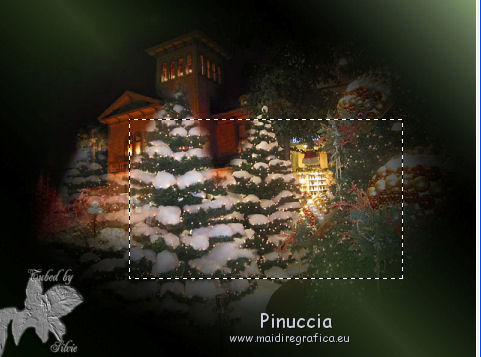 qui puoi trovare qualche risposta ai tuoi dubbi. Se l'argomento che ti interessa non è presente, ti prego di segnalarmelo. Per tradurre questo tutorial ho usato PSP X. Questo tutorial è una creazione di ©Titoune e non può essere copiato su altri siti nè essere offerto per il download. Lo stesso vale per la mia traduzione. Per tradurlo, ho usato PSP X, ma può essere eseguito anche con le altre versioni di PSP. Grazie ai creatori dei tubes che mettono a disposizione il loro lavoro in vari gruppi di condivisione. Rispetta il lavoro degli autori, non cambiare il nome del file e non cancellare il watermark. Occorrente: Un tube a scelta. Il resto del materiale qui Il tube utilizzato è "TubeNP-829" di Nara Pamplona la maschera è di Sigrid. Filtri: Filters Unlimited 2.0 qui VDL Adrenaline - Snowflakes qui Tramages - At the Atomic Level qui I filtri Tramages si possono usare da soli o importati in Filters Unlimited (come fare vedi qui) Se un filtro fornito appare con questa icona Animation Shop qui ![]() Se stai usando le nuove versioni X14 X15 e X16 le funzioni Immagine>Rifletti/Capovolgi hanno cambiato denominazione e comportamento. Vedi la mia scheda sull'argomento qui Apri la maschera in PSP e minimizzala con il resto del materiale. 1. Apri una nuova immagine trasparente 750 x 600 pixels. Selezione>Seleziona tutto. Per il mio sfondo ho usato l'anteprima del tube Xmas_Outdoor, incluso nel materiale. 2. Apri lo sfondo. Attiva lo strumento Selezione , rettangolo,e traccia una selezione al centro come nell'esempio. ![]() Modifica>Copia. Torna al tuo lavoro e vai a Modifica>Incolla nella selezione. 3. Effetti>Effetti di immagine>Motivo unico. ![]() 4. Regola>Sfocatura>Sfocatura gaussiana - raggio 20. ![]() 5. Selezione>Modifica>Contrai - 50 pixels. Selezione>Inverti. Selezione>Innalza selezione a livello. 6. Effetti>Plugins>Filters Unlimited 2.0 - Tramages - At the Atomic Level, con i settaggi standard. ![]() 7. Regola>Tonalità e saturazione>Viraggio. ![]() 8. Effetti>Effetti 3D>Smusso a incasso. ![]() Selezione>Deseleziona. 9. Apri il tube titoune_bordures_tag_Golden_snow e vai a Modifica>Copia. Torna al tuo lavoro e vai a Modifica>Incolla come nuovo livello. 10. Effetti>Effetti 3D>Sfalsa ombra, colore nero. ![]() Ripeti l'Effetto Sfalsa ombra, cambiando verticale e orizzonale con -3. 11. Di nuovo Selezione>Seleziona tutto. Selezione>Modifica>Contrai - 50 pixels. Attiva il livello inferiore. Livelli>Nuovo livello raster. Apri il tube Xmas_Outdoor e vai a Modifica>Copia. Torna al tuo lavoro e vai a Modifica>Incolla nella selezione. 12. Livelli>Duplica. Cambia la modalità di miscelatura di questo livello in Luce diffusa. Rinomina questo livello "paesaggio". 13. Livelli>Nuovo livello raster. Imposta il colore di primo piano con un colore chiaro scelto dal tuo tube. Per l'esempio #fce099. Riempi il livello con il colore di primo piano.14. Livelli>Nuovo livello maschera>Da immagine. Apri il menu sotto la finestra di origine e vedrai la lista dei files aperti. Seleziona la maschera w-maske02_©sigrid, con i seguenti settaggi. ![]() Livelli>Unisci>Unisci gruppo. Effetti>Effetti 3D>Sfalsa ombra, con i settaggi precedenti. Selezione>Deseleziona. 15. Apri il tube coerner01_©SGS e vai a Modifica>Copia. Torna al tuo lavoro e vai a Modifica>Incolla come nuovo livello. Spostalo in alto a sinistra.Livelli>Duplica. Immagine>Rifletti. Immagine>Capovolgi. Livelli>Unisci>Unisci giù. Effetti>Effetti 3D>Sfalsa ombra, con i settaggi precedenti. 16. Apri il tube w-dekor_set5_4_©sigrid vai a Modifica>Copia. Torna al tuo lavoro e vai a Modifica>Incolla come nuovo livello. Immagine>Rifletti. Spostalo in alto a destra.Livelli>Duplica. Cambia la modalità di miscelatura di questo livello in Luce diffusa. Attiva il livello originale. Effetti>Effetti 3D>Sfalsa ombra, con i settaggi precedenti. Attiva il livello superiore. 17. Apri il tube w-glocke10_sigrid vai a Modifica>Copia. Torna al tuo lavoro e vai a Modifica>Incolla come nuovo livello. Spostalo in alto al centro.Vedi l'esempio finale. Livelli>Duplica. Cambia la modalità di miscelatura di questo livello in Luce diffusa. Attiva il livello originale. Effetti>Effetti 3D>Sfalsa ombra, con i settaggi precedenti. Attiva il livello superiore. 18. Apri il tube Tocha23713 vai a Modifica>Copia. Torna al tuo lavoro e vai a Modifica>Incolla come nuovo livello. 19. Immagine>Ridimensiona, al 25%, tutti i livelli non selezionato. Spostalo in basso a destra.![]() Livelli>Duplica. Cambia la modalità di miscelatura di questo livello in Luce diffusa. Attiva il livello originale. Effetti>Effetti 3D>Sfalsa ombra, con i settaggi precedenti. Attiva il livello superiore. 20. Apri il tuo tube (per l'esempio TubeNP-829) vai a Modifica>Copia. Torna al tuo lavoro e vai a Modifica>Incolla come nuovo livello. Immagine>Ridimensiona, se e quanto necessario, (per l'esempio all'80%), tutti i livelli non selezionato. Spostalo in basso a sinistra.Livelli>Duplica. Cambia la modalità di miscelatura di questo livello in Luce diffusa. Attiva il livello originale. Effetti>Effetti 3D>Sfalsa ombra, con i settaggi precedenti. Attiva il livello superiore. Firma il tuo lavoro. Animazione. 22. Attiva il livello "paesaggio". Selezione>Seleziona tutto. Selezione>Modifica>Contrai - 50 pixels. 23. Livelli>Nuovo livello raster. Effetti>Plugins>VanDerLee - Snowflakes. se stai usando la versione precedente del filtro (il risultato non cambia): Effetti>Plugins>VDL Adrenaline - Snowflakes ![]() Selezione>Deseleziona. 24. Modifica>Copia Unione. Apri Animation Shop e vai a Modifica>Incolla>Incolla come nuova animazione. 25. Torna in PSP. Modifica>Annulla azione Deseleziona. Modifica>Annulla azione Snowflakes. Effetti>Plugins>VanDerLee - Snowflakes, cambia Random Seed con 1 e ok. ![]() Selezione>Deseleziona. Modifica>Copia Unione. Torna in Animation Shop e vai a Modifica>Incolla>Incolla dopo il fotogramma corrente. 26. Di nuovo in PSP. Modifica>Annulla azione Deseleziona. Modifica>Annulla azione Snowflakes. Effet