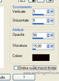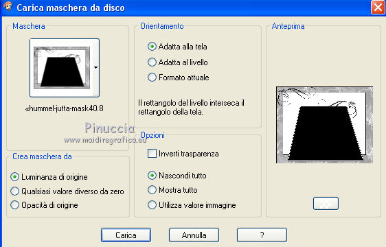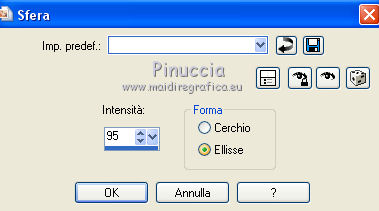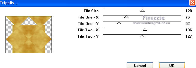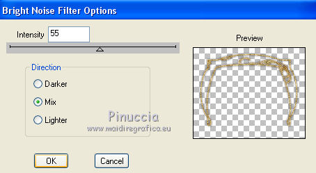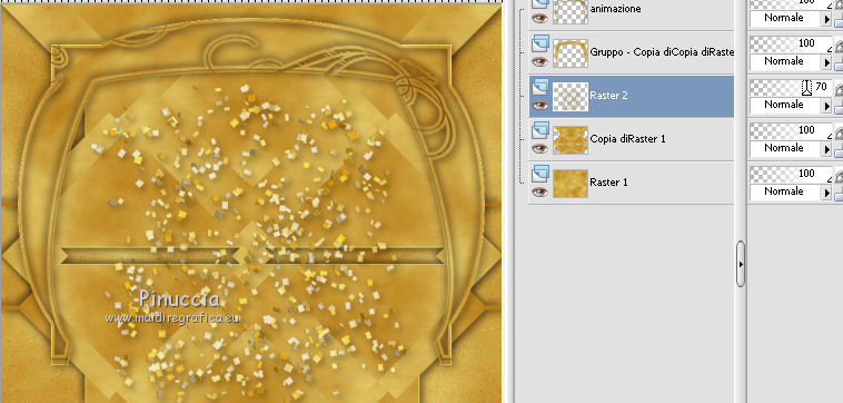 qui puoi trovare qualche risposta ai tuoi dubbi. Se l'argomento che ti interessa non è presente, ti prego di segnalarmelo. Questo tutorial è una creazione di ©Titoune e non può essere copiato su altri siti nè essere offerto per il download. Lo stesso vale per la mia traduzione. Il tutorial è stato creato con PSP X5, ma può essere eseguito anche con le altre versioni di PSP. Secondo la versione utilizzata (anteriore a PSP X) potresti ottenere dei risultati differenti. Vedi la mia scheda riguardante le funzioni Rifletti>Capovolgi in X4 e X5 qui Per tradure il tutorial ho usato PSP X. Occorrente: Un tube a scelta. Il resto del materiale qui Il tube utilizzato è di Candice B Filtri in caso di dubbi, ricorda di consultare la mia sezione filtri qui Filters Unlimited 2.0 qui VM Instant Art - Tripolis qui DSB Flux - Bright Noise qui I filtri VM Instant Art si possono usare da soli o importati in Filters Unlimited (come fare vedi qui) Se un filtro fornito appare con questa icona Animation Shop qui ![]() Metti la maschera nella cartella Maschere. 1. Apri una nuova immagine trasparente 750 x 600 pixels. Selezione>Seleziona tutto. 2. Apri l'elemento 05 e vai a Modifica>Copia. Torna al tuo lavoro e vai a Modifica>Incolla nella selezione. Selezione>Deseleziona. 3. Livelli>Duplica. Attiva il livello sottostante dell'originale. 4. Regola>Aggiungi/Rimuovi disturbo>Aggiungi disturbo. ![]() 5. Attiva il livello superiore. Immagine>Ridimensiona, all'80%, tutti i livelli non selezionato. Effetti>Effetti di bordo>Aumenta Di nuovo Livelli>Duplica. 6. Livelli>Carica/Salva maschera>Carica maschera da disco. Cerca e carica la maschera ©hummel-jutta-mask40.8, con i seguenti settaggi. ![]() Livelli>Unisci>Unisci gruppo. 7. Effetti>Effetti geometrici>Sfera. ![]() 8. Selezione>Seleziona tutto. Selezione>Mobile. Selezione>Immobilizza. Selezione>Modifica>Seleziona bordature selezione. ![]() Selezione>Innalza selezione a livello. Selezione>Deseleziona. 9. Effetti>Effetti 3D>Sfalsa ombra, colore #120000. ![]() Ripeti l'Effetto Sfalsa ombra, cambiando verticale e orizzontale con -5. Rinomina questo livello "animazione". 10. Attiva il livello originale (il secondo dal basso). ![]() Effetti>Plugins>VM Instant Art - Tripolis - 2 volte con i settaggi standard. ![]() Effetti>Effetti 3D>Sfalsa ombra, con i settaggi precedenti. 11. Apri l'elemento confetti1 e vai a Modifica>Copia. Torna al tuo lavoro e vai a Modifica>Incolla come nuovo livello. Spostalo un po' più in basso.Effetti>Effetti 3D>Sfalsa ombra, colore #120000. ![]() Porta questo livello sotto il livello della maschera. Abbassa l'opacità al 70%. ![]() 12. Apri l'elemento 09 e vai a Modifica>Copia. Torna al tuo lavoro e vai a Modifica>Incolla come nuovo livello. 13. Effetti>Effetti di immagine>Scostamento. ![]() Effetti>Effetti 3D>Sfalsa ombra, con i settaggi precedenti. 14. Apri l'elemento 04 e vai a Modifica>Copia. Torna al tuo lavoro e vai a Modifica>Incolla come nuovo livello. Effetti>Effetti di immagine>Scostamento, con i settaggi precedenti. ![]() Effetti>Effetti 3D>Sfalsa ombra, con i settaggi precedenti. 15. Attiva il livello superiore. Apri l'elemento 11 e vai a Modifica>Copia. Torna al tuo lavoro e vai a Modifica>Incolla come nuovo livello. 16. Effetti>Effetti di immagine>Scostamento. ![]() Effetti>Effetti 3D>Sfalsa ombra, con i settaggi precedenti. Rinomina questo livello "animazione 2". 17. Apri l'elemento 03 Balon Happy e vai a Modifica>Copia. Torna al tuo lavoro e vai a Modifica>Incolla come nuovo livello. Spostalo in alto a destra.vedi l'esempio finale. Effetti>Effetti 3D>Sfalsa ombra, con i settaggi precedenti. 18. Apri l'elemento 07 e vai a Modifica>Copia. Torna al tuo lavoro e vai a Modifica>Incolla come nuovo livello. Spostalo in alto a sinistra.vedi l'esempio finale. Effetti>Effetti 3D>Sfalsa ombra, con i settaggi precedenti. 19. Apri l'elemento 10 Champagne e vai a Modifica>Copia. Torna al tuo lavoro e vai a Modifica>Incolla come nuovo livello. Spostalo in basso a sinistra.vedi l'esempio finale. Effetti>Effetti 3D>Sfalsa ombra, con i settaggi precedenti. 20. Apri l'elemento 09 Verre e vai a Modifica>Copia. Torna al tuo lavoro e vai a Modifica>Incolla come nuovo livello. Spostalo in basso a sinistra.vedi l'esempio finale. Effetti>Effetti 3D>Sfalsa ombra, con i settaggi precedenti. 21. Apri l'elemento cotillons e vai a Modifica>Copia. Torna al tuo lavoro e vai a Modifica>Incolla come nuovo livello. Spostalo a sinistra.![]() Effetti>Effetti 3D>Sfalsa ombra, con i settaggi precedenti. 22. Apri l'elemento "titoune_wordart_2014" e vai a Modifica>Copia. Torna al tuo lavoro e vai a Modifica>Incolla come nuovo livello. Spostalo in alto.vedi l'esempio finale. Effetti>Effetti 3D>Sfalsa ombra, con i settaggi precedenti. 23. Apri il tuo tube e vai a Modifica>Copia. Torna al tuo lavoro e vai a Modifica>Incolla come nuovo livello. Immagine>Ridimensiona, se e quanto necessario, tutti i livelli non selezoinato. Spostalo dove preferisci,o vedi il mio esempio. Effetti>Effetti 3D>Sfalsa ombra, con i settaggi precedenti. 24. Attiva il livello Raster 1. Modifica>Copia. Selezione>Seleziona tutto. Immagine>Ritaglia la selezione. Immagine>Dimensioni tela - 800 x 650 pixels. ![]() Livelli>Nuovo livello raster. Livelli>Disponi>Sposta giù. Selezione>Seleziona tutto. Modifica>Incolla nella selezione. 25. Selezione>Modifica>Contrai - 25 pixels. Selezione>Inverti. Selezione>Innalza selezione a livello. Livelli>Disponi>Porta in alto. 26. Effetti>Effetti 3D>Smusso a incasso. ![]() Selezione>Deseleziona. Effetti>Effetti 3D>Sfalsa ombra, colore #120000. ![]() Ripeti l'Effetto Sfalsa ombra, cambiando verticale e orizzontale con -5. 27. Apri il tube guirlandes_corner e vai a Modifica>Copia. Torna al tuo lavoro e vai a Modifica>Incolla come nuovo livello. Effetti>Effetti 3D>Sfalsa ombra, colore #120000. ![]() Firma il tuo lavoro. 28. Animazione. Attiva il livello "animazione". Livelli>Duplica - 2 volte. Rimani posizionato sul livello della seconda copia. 29. Effetti>Plugins>